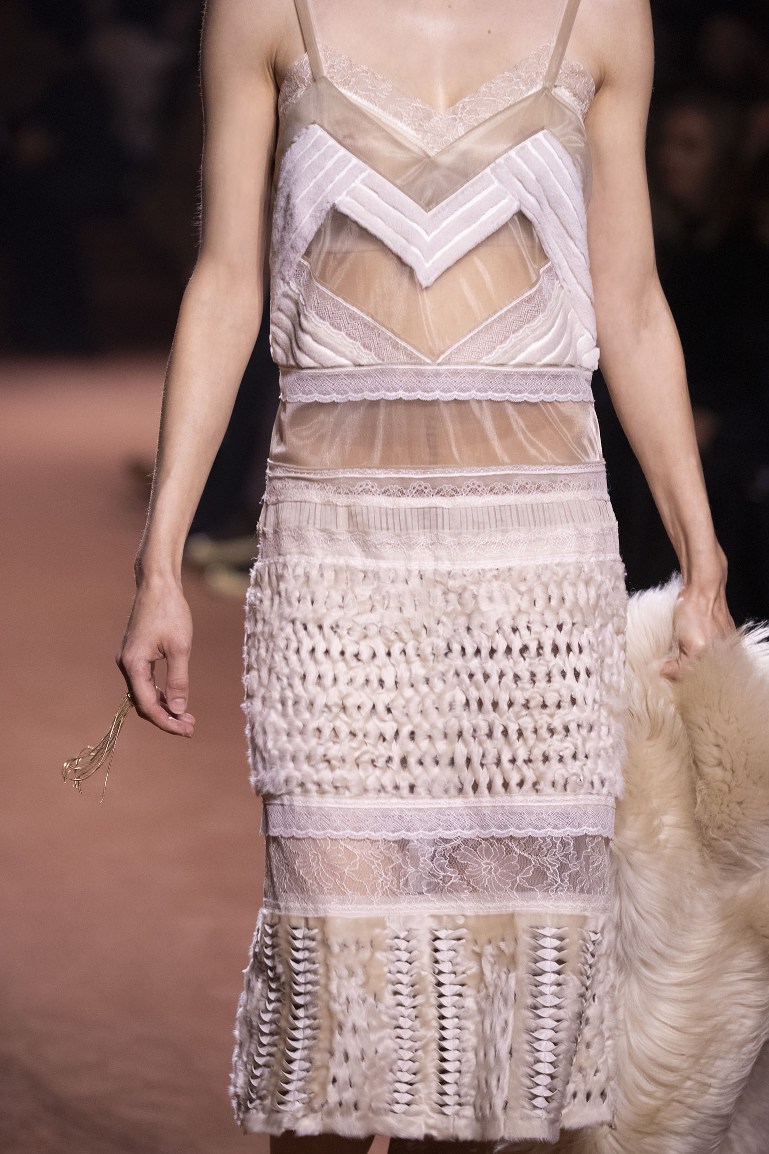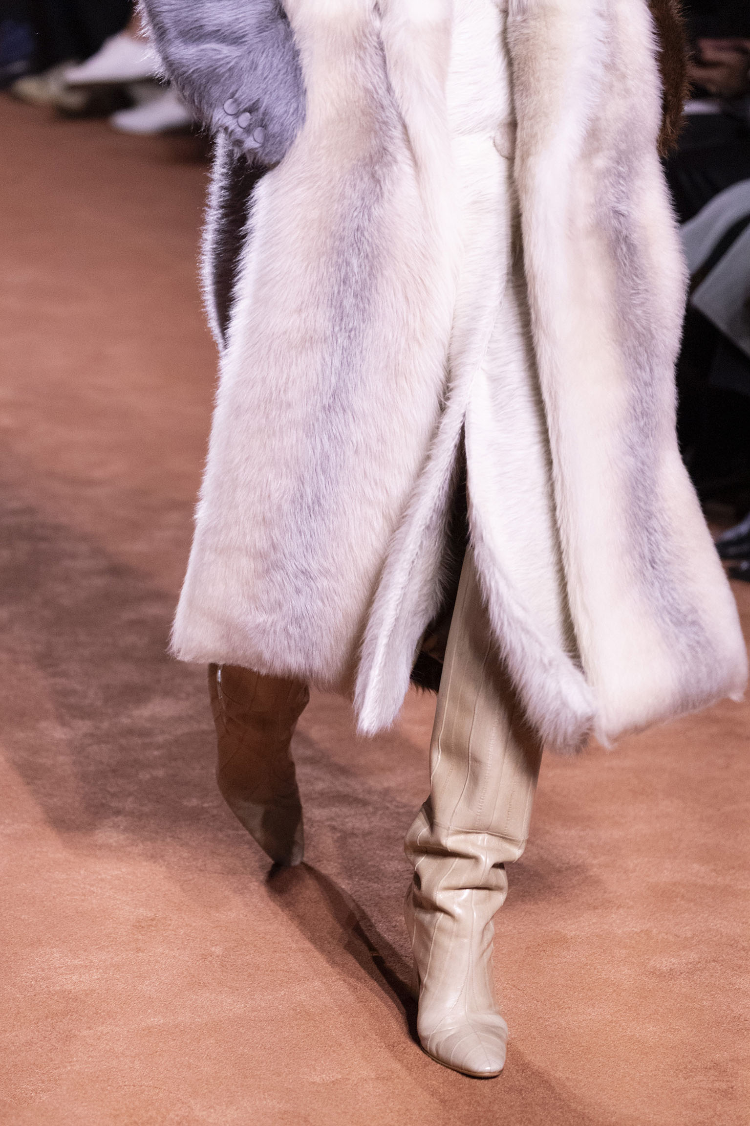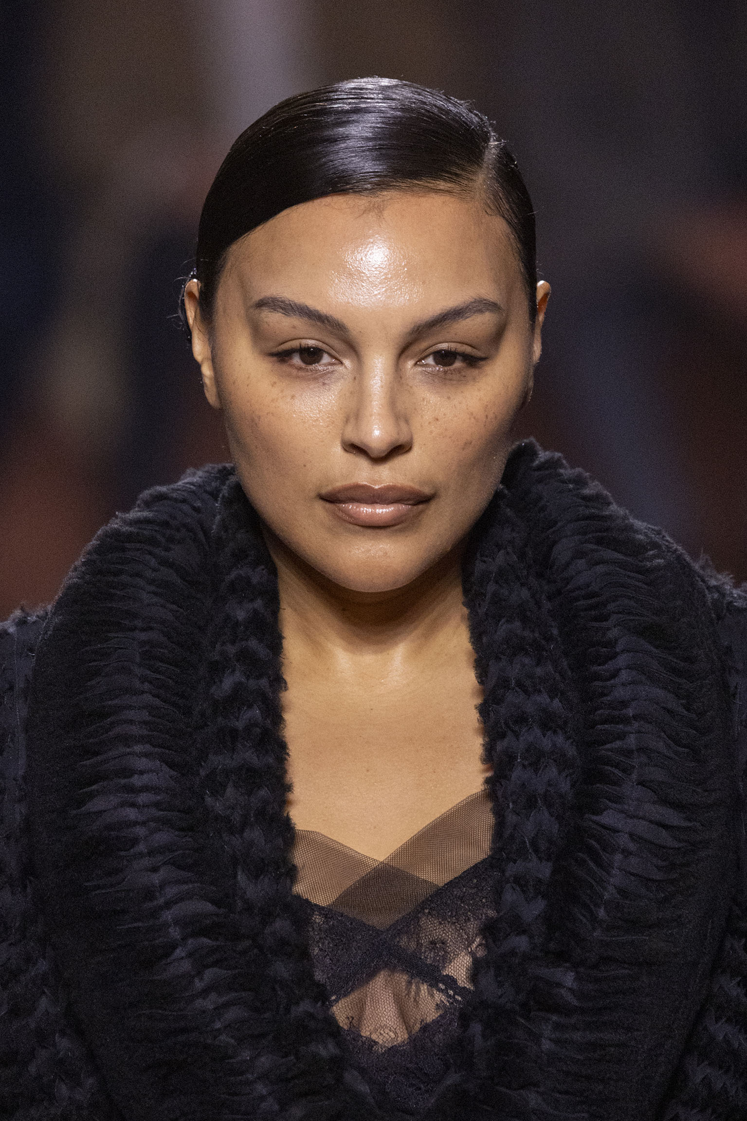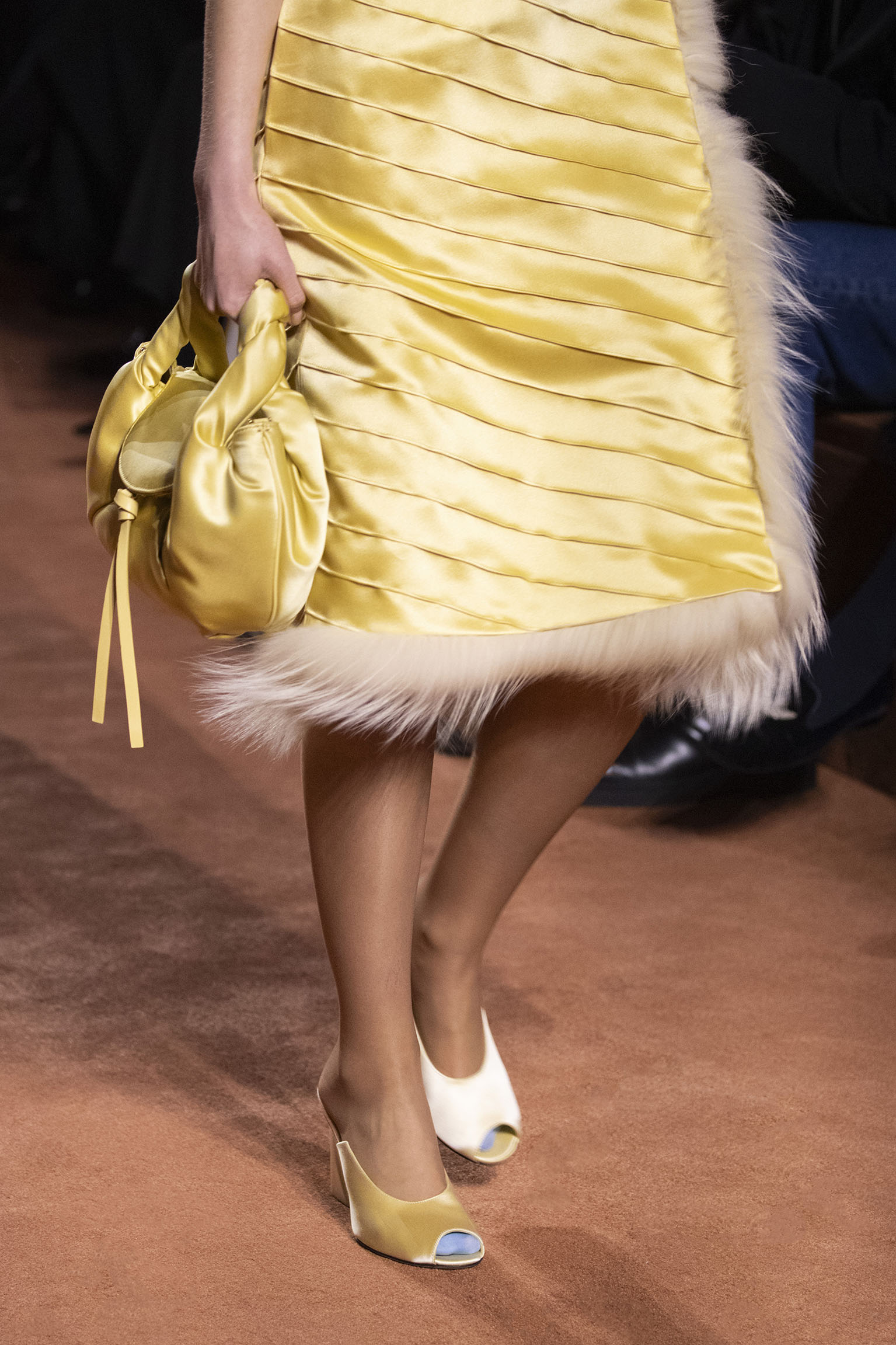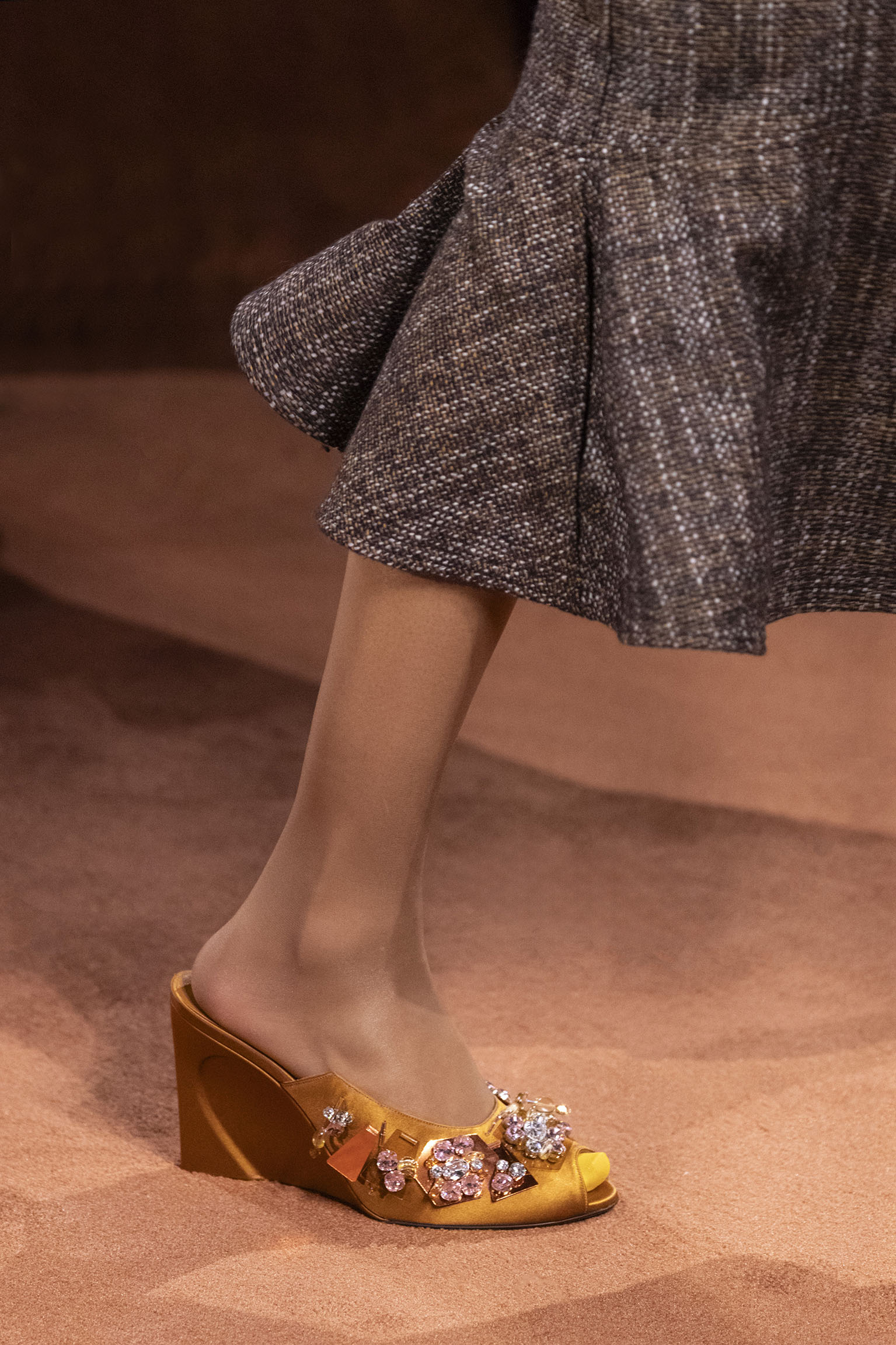 La collection Women’s and Men’s Fall/Winter 2025-26, véritable célébration du centenaire, se révèle être une fresque audacieuse où se mêlent textures, couleurs et techniques ancestrales. Dès le premier regard, les silhouettes dévoilent une symphonie de matières qui évoquent les métamorphoses du temps. Une attention particulière est portée aux textures primordiales qui, à travers des effets tels que le marbre plissé, le rib knit ou encore l’intarsia appliquée sur la shearling, font revivre l’allure des grandes heures de la Maison. Le flacon d’un manteau ample, par exemple, se mue en une robe contemporaine grâce à un col relevé et une taille cintrée par une ceinture en or fin, rappelant ainsi la dualité entre force et délicatesse. Cette dualité, chère à l’ADN de Fendi, se retrouve également dans l’utilisation de techniques ancestrales comme le Gheronato patchwork, appliquées sur des matériaux qui évoquent tour à tour le renard, la vison ou le zibellino, sans pour autant se limiter aux contraintes du réel.