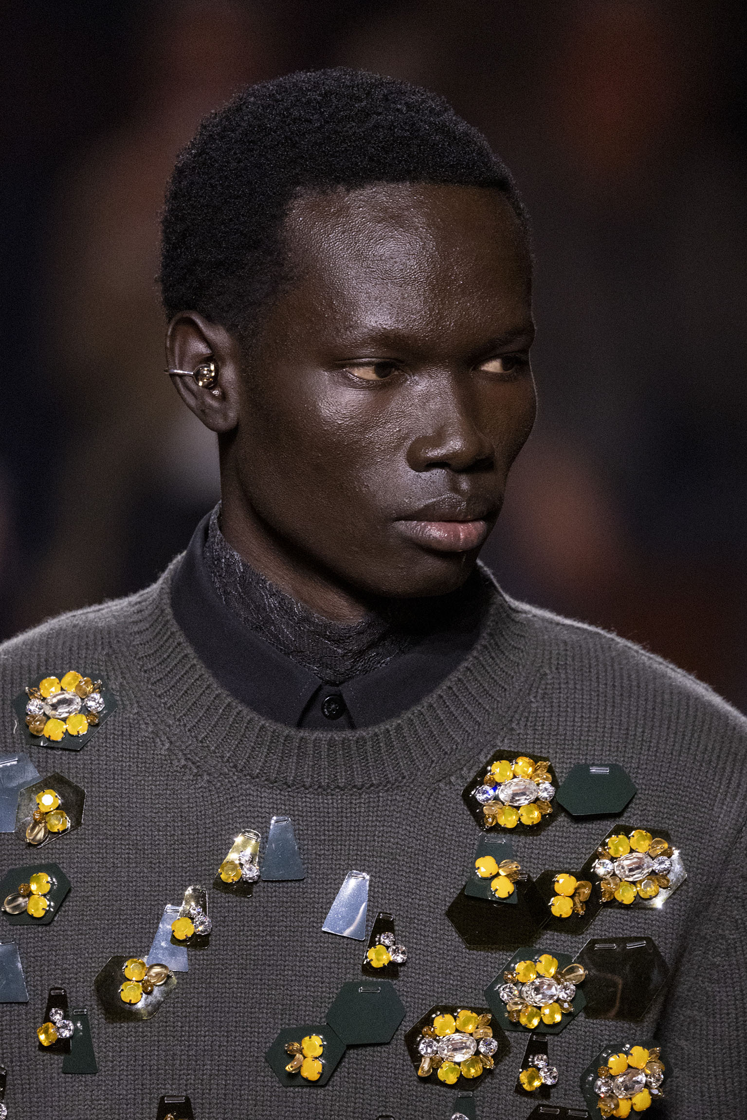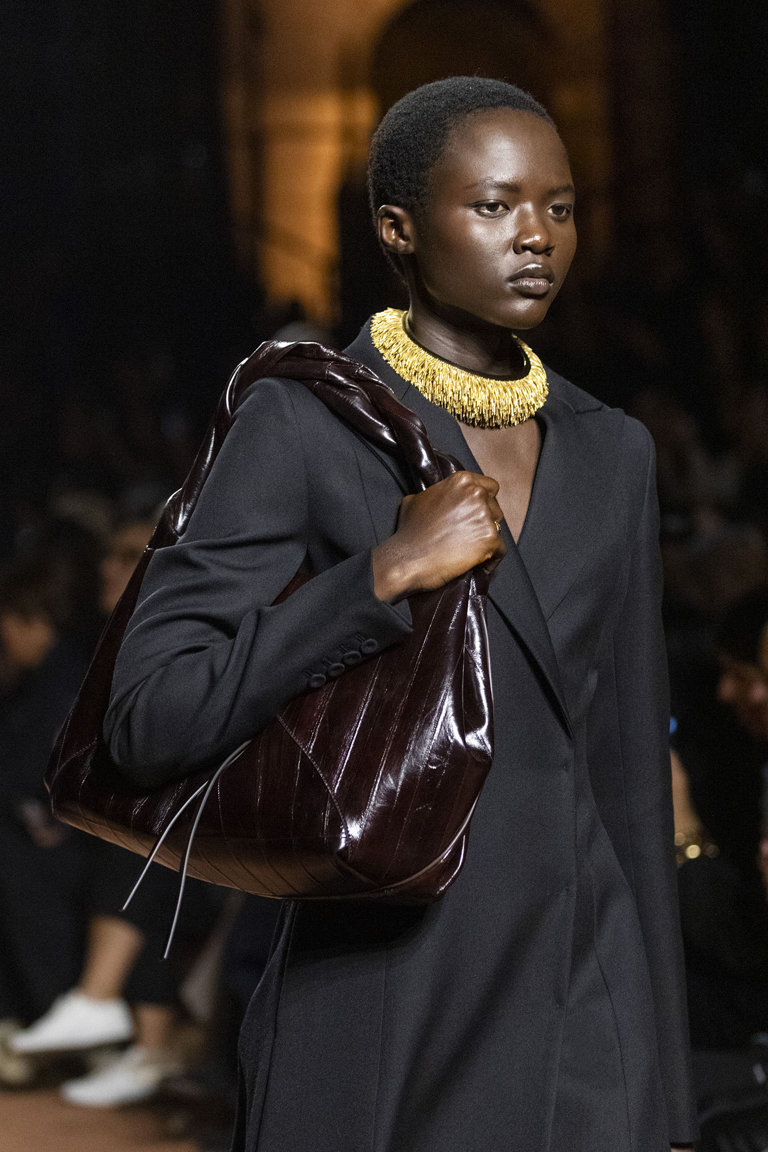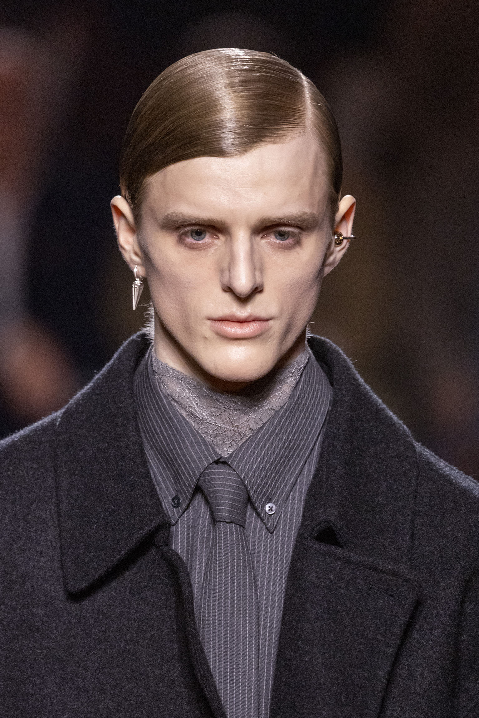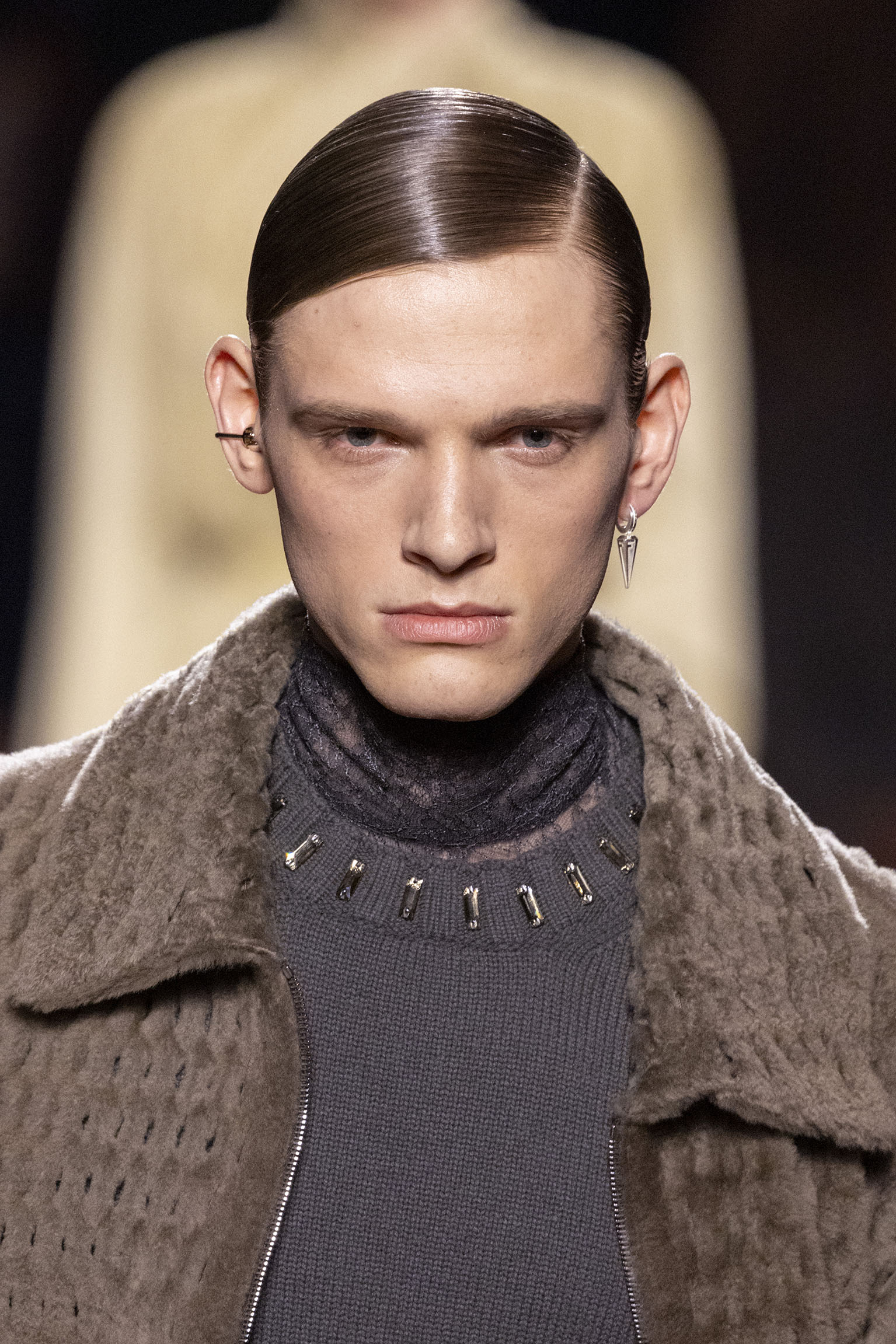La bande-son du défilé, orchestrée par Michel Gaubert, vient parfaire cette immersion multisensorielle. Les notes de Barry White s’entrelacent aux voix d’Ornella Vanoni, Mina, Patty Pravo et Franco Battiato, évoquant une époque où la musique italienne était synonyme d’émotion et de révolte, et où chaque chanson résonnait comme un hymne à la liberté et à l’élégance. Ce choix musical, à la fois éclectique et profondément enraciné dans la culture italienne, sert de fil conducteur à une mise en scène qui célèbre la dualité entre nostalgie et modernité, entre souvenir et innovation.