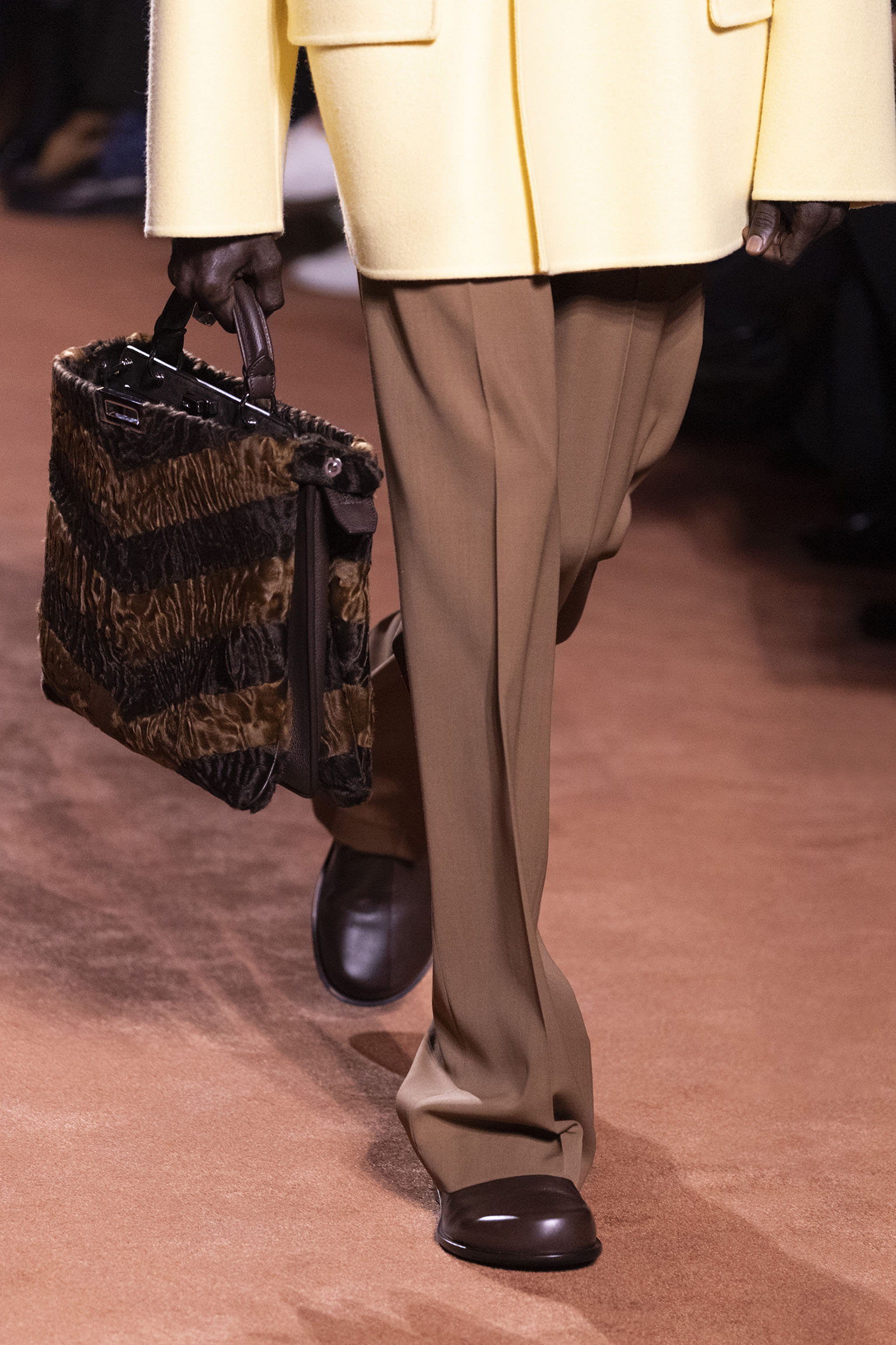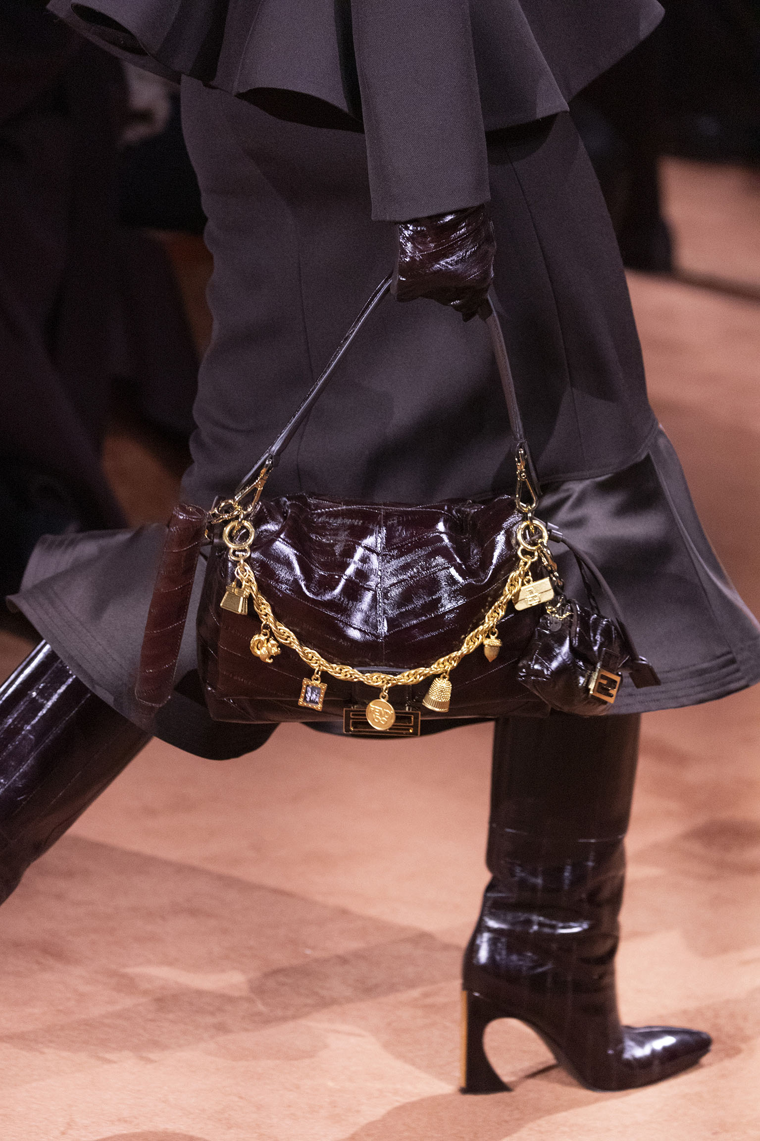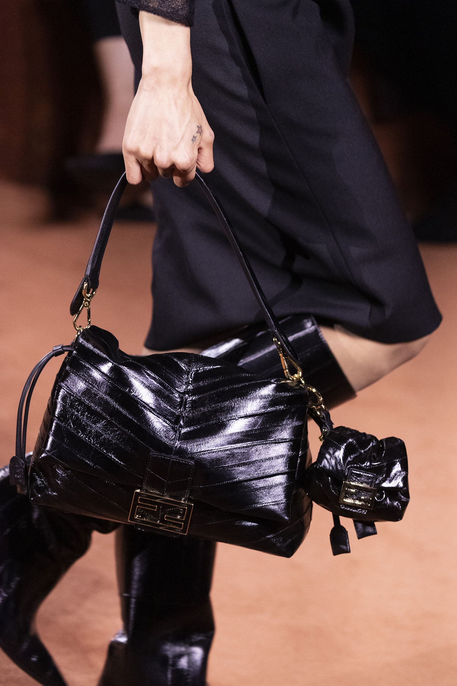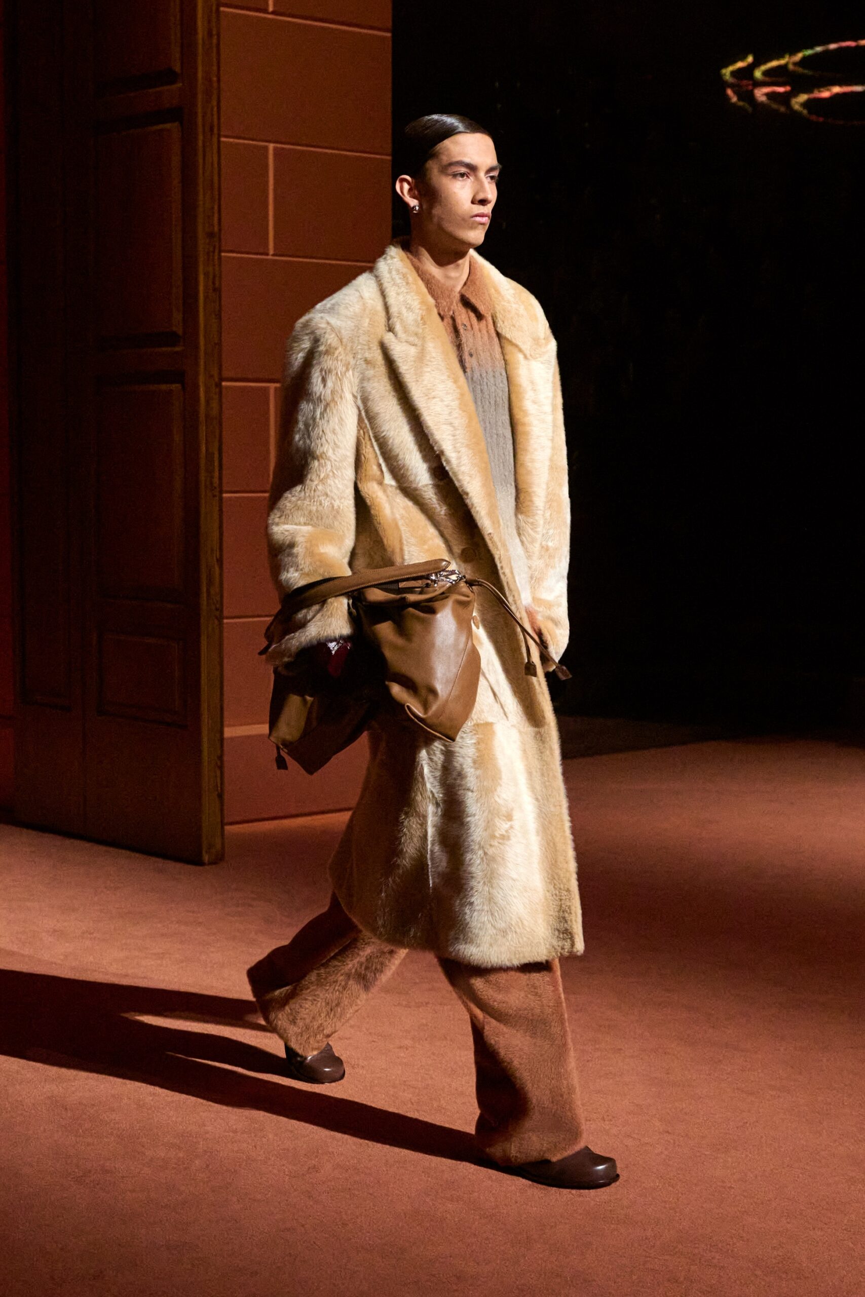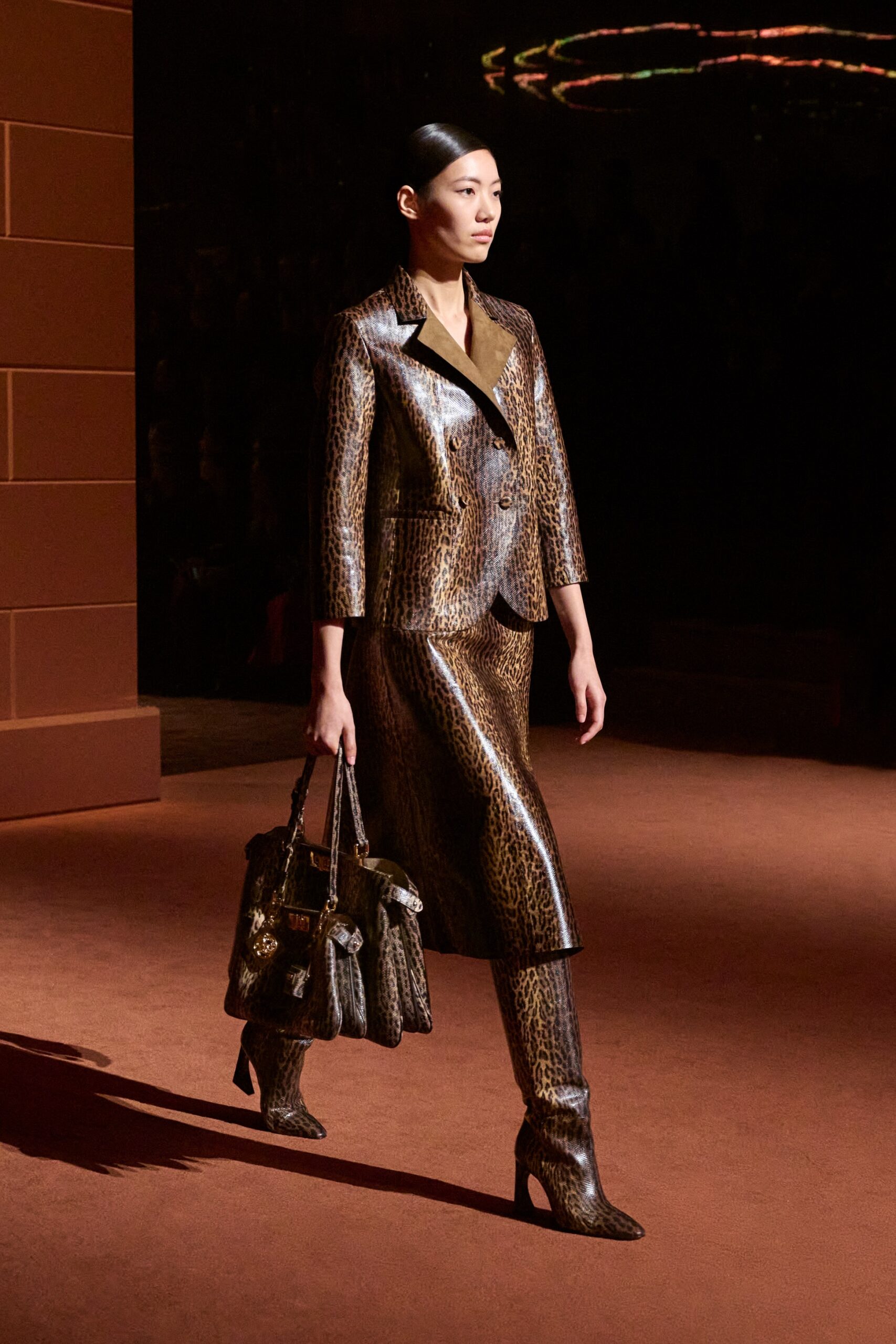 La richesse de la collection Fall/Winter 2025-26 se révèle également à travers l’horizon des accessoires, véritables prolongements du savoir-faire Fendi. Chaque pièce – qu’il s’agisse du Fendi Giano, du Spy Bag ou des modèles iconiques tels que le Peekaboo Soft et le Mamma Baguette – est conçue pour être à la fois fonctionnelle et esthétiquement irrésistible. La diversité des matériaux, allant du cuir travaillé en Selleria à la shearling aux touches métalliques, offre un éventail de possibilités stylistiques qui s’adaptent aux besoins d’un quotidien raffiné et d’occasions exceptionnelles. Ce mariage réussi entre tradition et innovation confère à la Maison une identité forte et singulière, faisant de chaque accessoire un symbole du luxe intemporel.
