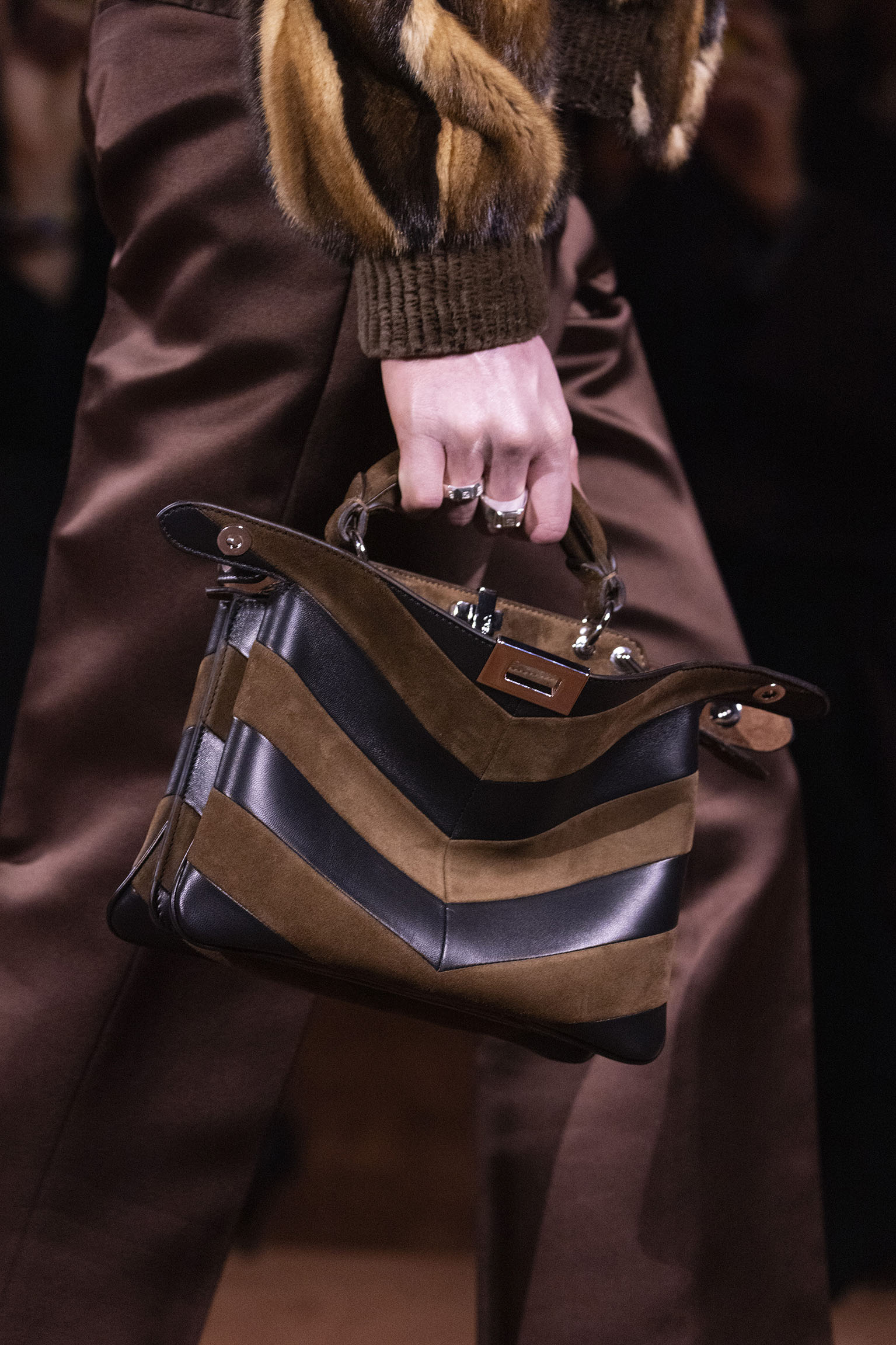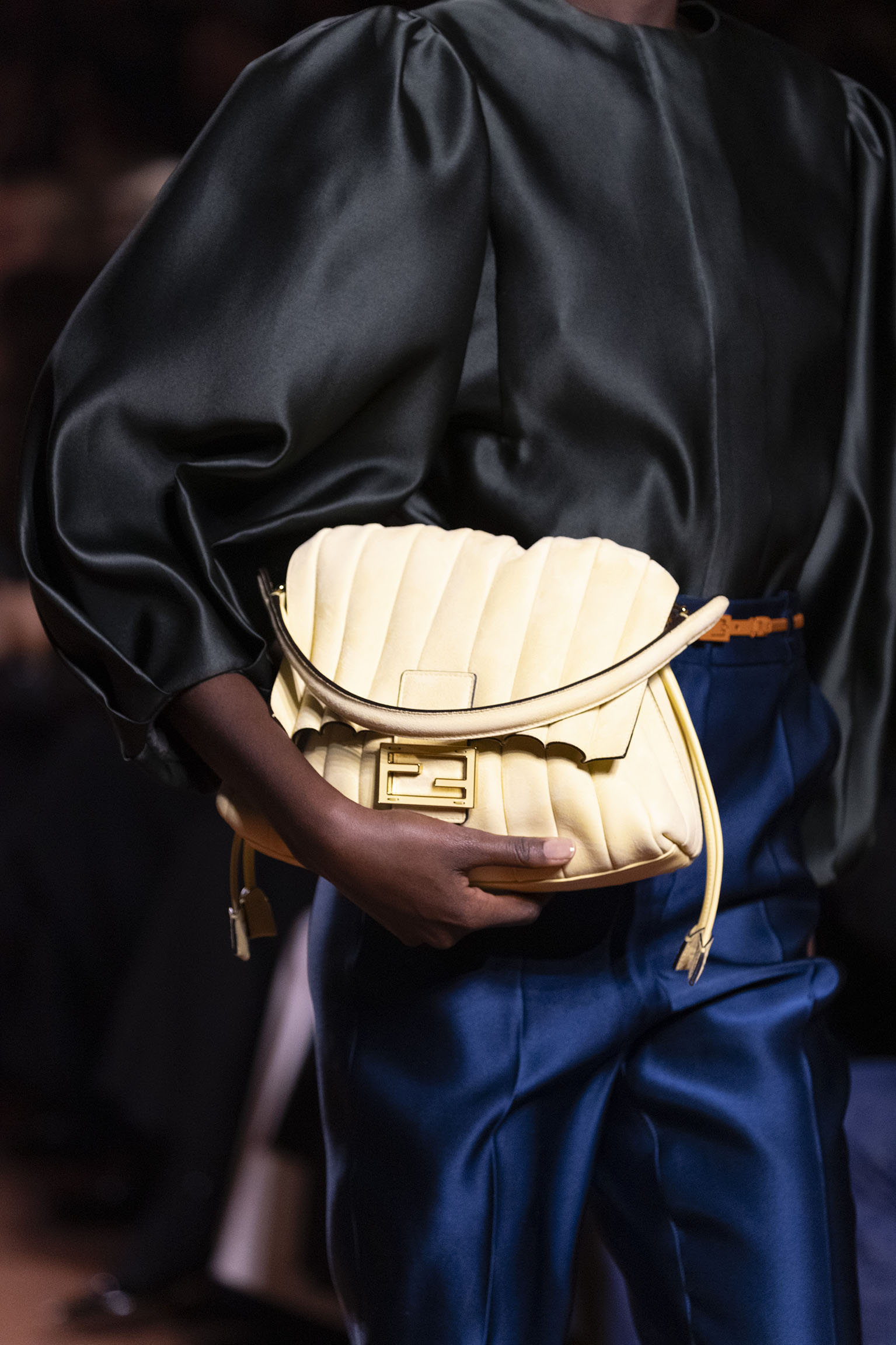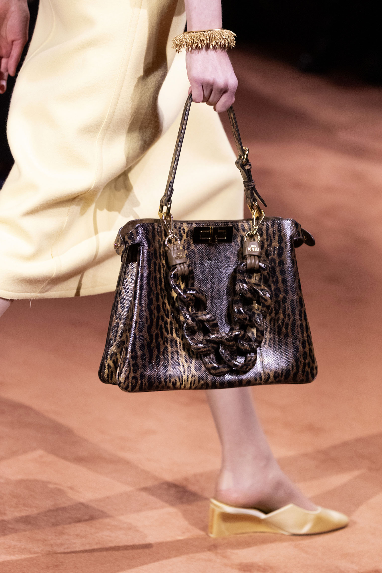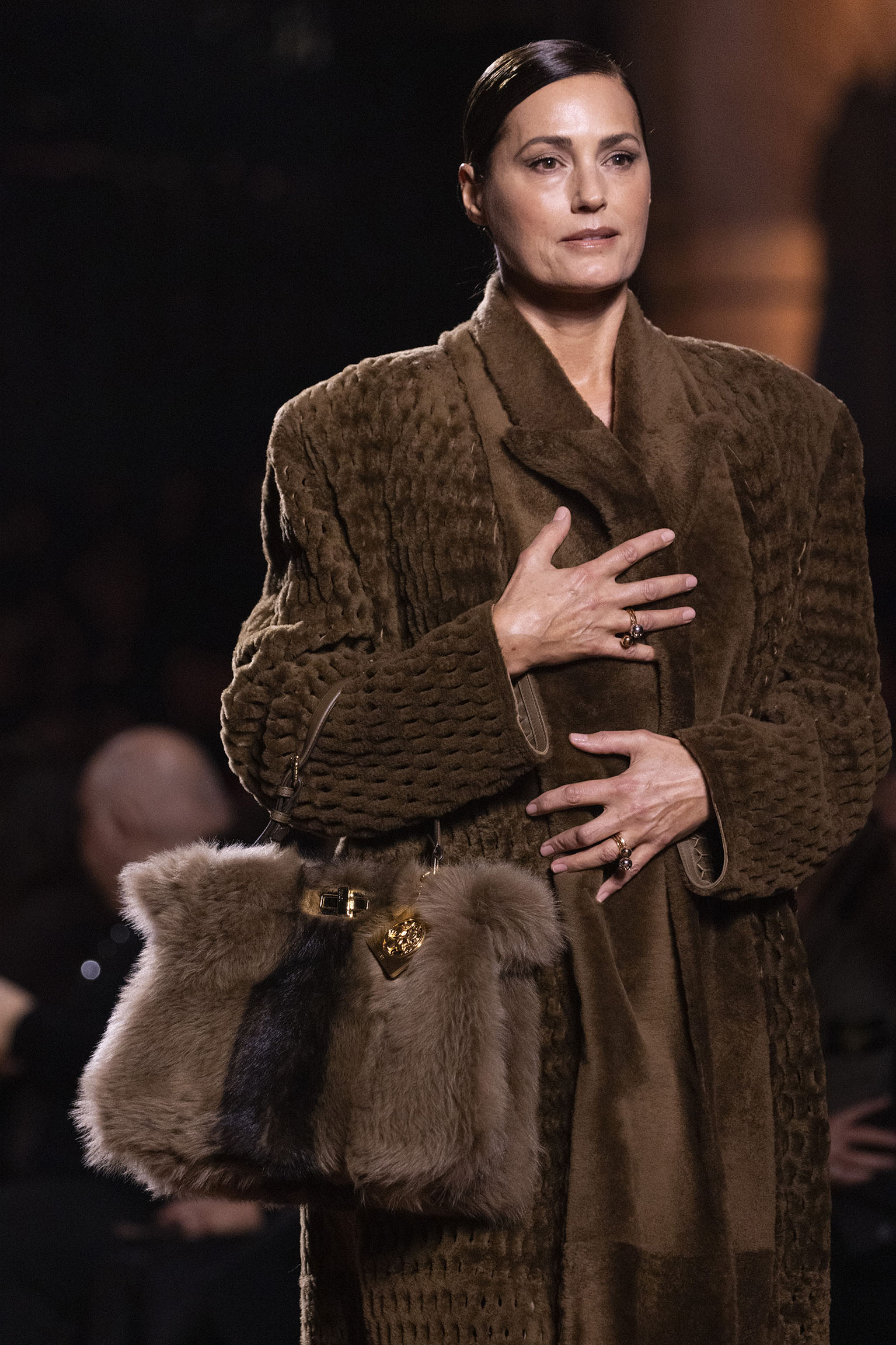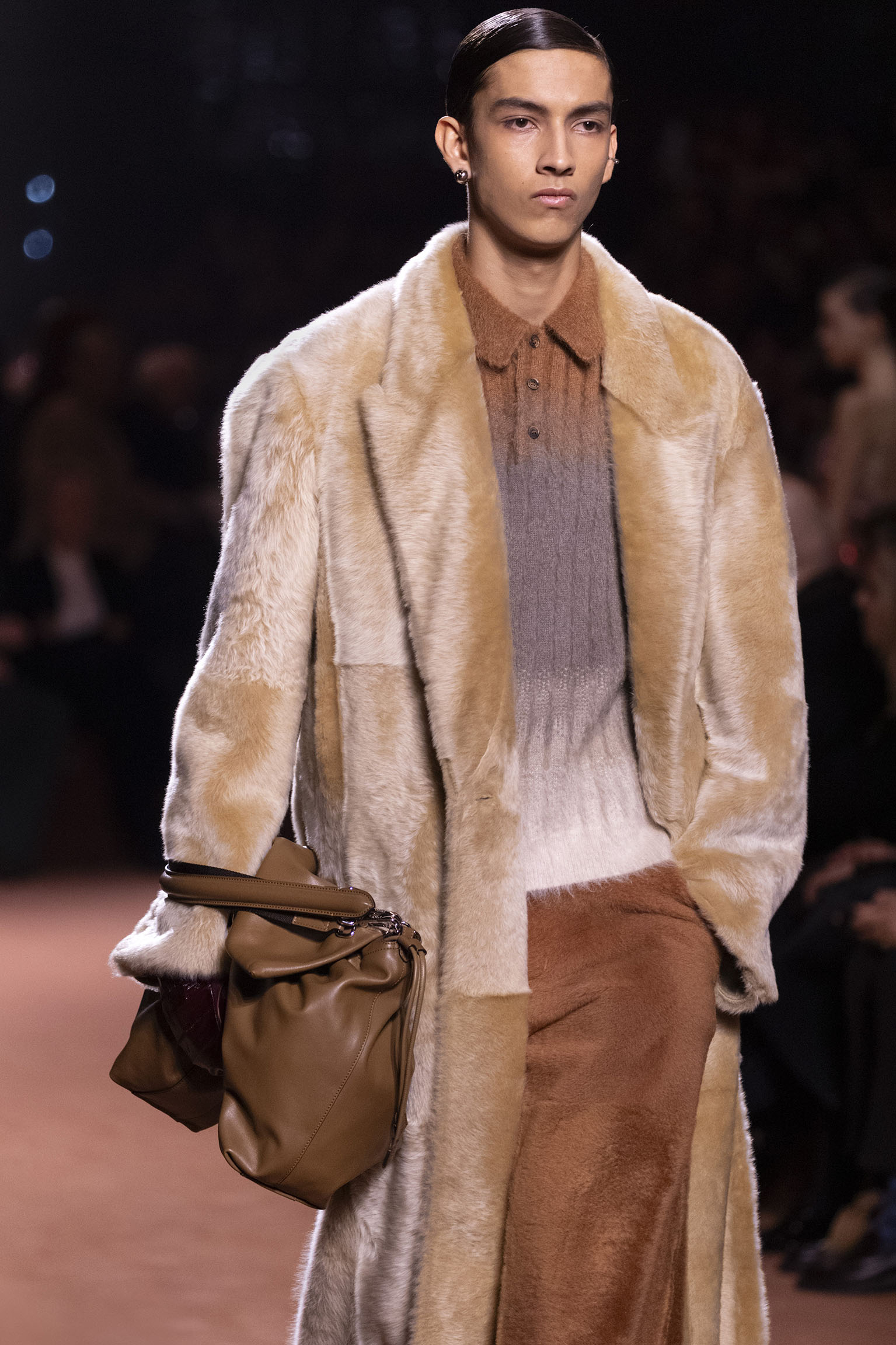 La richesse de la collection Fall/Winter 2025-26 se révèle également à travers l’horizon des accessoires, véritables prolongements du savoir-faire Fendi. Chaque pièce – qu’il s’agisse du Fendi Giano, du Spy Bag ou des modèles iconiques tels que le Peekaboo Soft et le Mamma Baguette – est conçue pour être à la fois fonctionnelle et esthétiquement irrésistible. La diversité des matériaux, allant du cuir travaillé en Selleria à la shearling aux touches métalliques, offre un éventail de possibilités stylistiques qui s’adaptent aux besoins d’un quotidien raffiné et d’occasions exceptionnelles. Ce mariage réussi entre tradition et innovation confère à la Maison une identité forte et singulière, faisant de chaque accessoire un symbole du luxe intemporel.