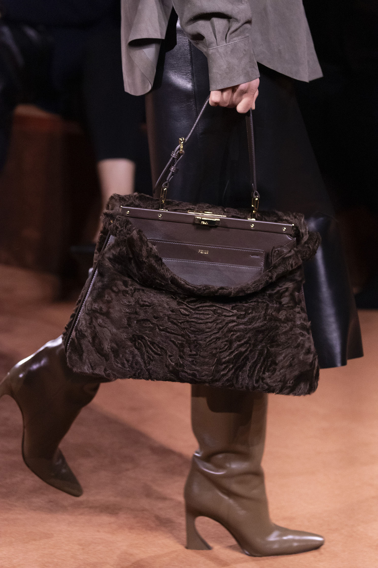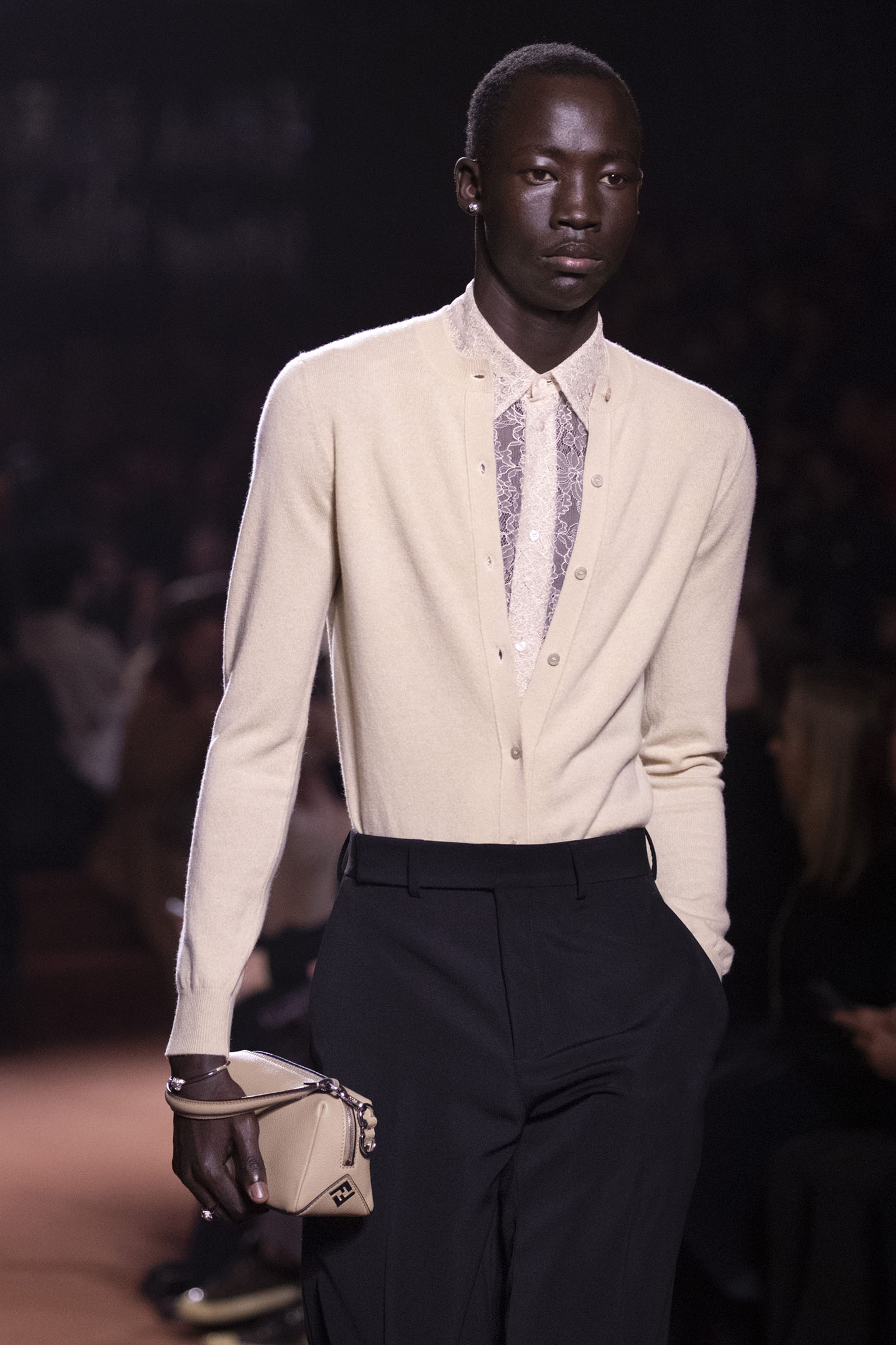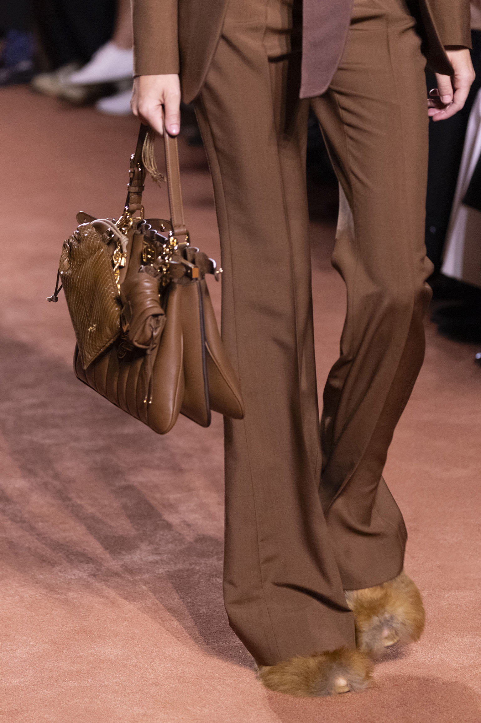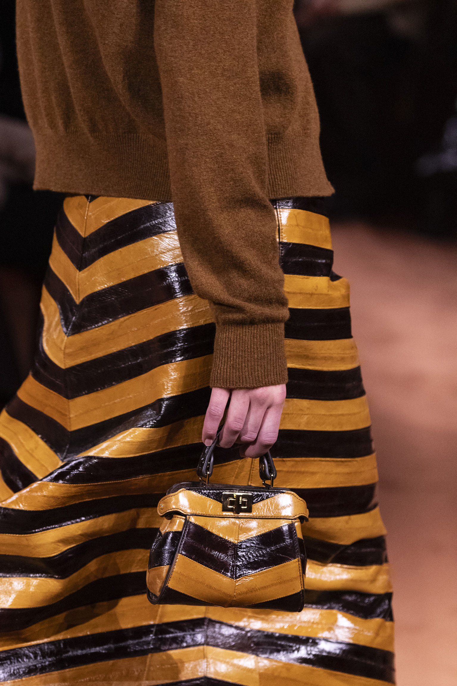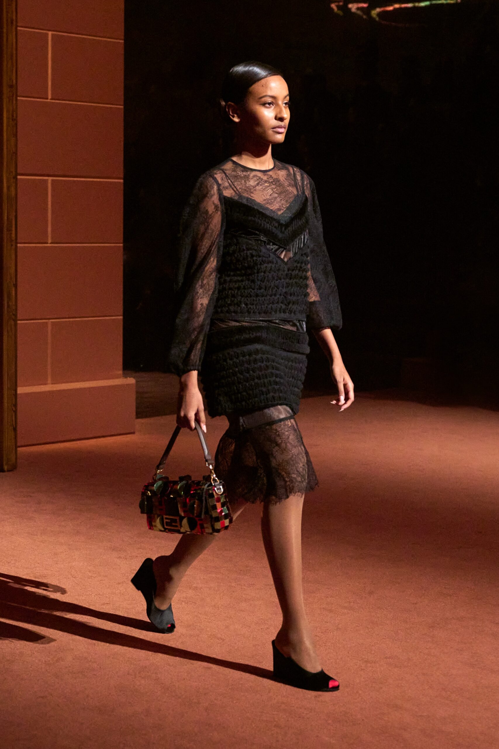La richesse de la collection Fall/Winter 2025-26 se révèle également à travers l’horizon des accessoires, véritables prolongements du savoir-faire Fendi. Chaque pièce – qu’il s’agisse du Fendi Giano, du Spy Bag ou des modèles iconiques tels que le Peekaboo Soft et le Mamma Baguette – est conçue pour être à la fois fonctionnelle et esthétiquement irrésistible. La diversité des matériaux, allant du cuir travaillé en Selleria à la shearling aux touches métalliques, offre un éventail de possibilités stylistiques qui s’adaptent aux besoins d’un quotidien raffiné et d’occasions exceptionnelles. Ce mariage réussi entre tradition et innovation confère à la Maison une identité forte et singulière, faisant de chaque accessoire un symbole du luxe intemporel.