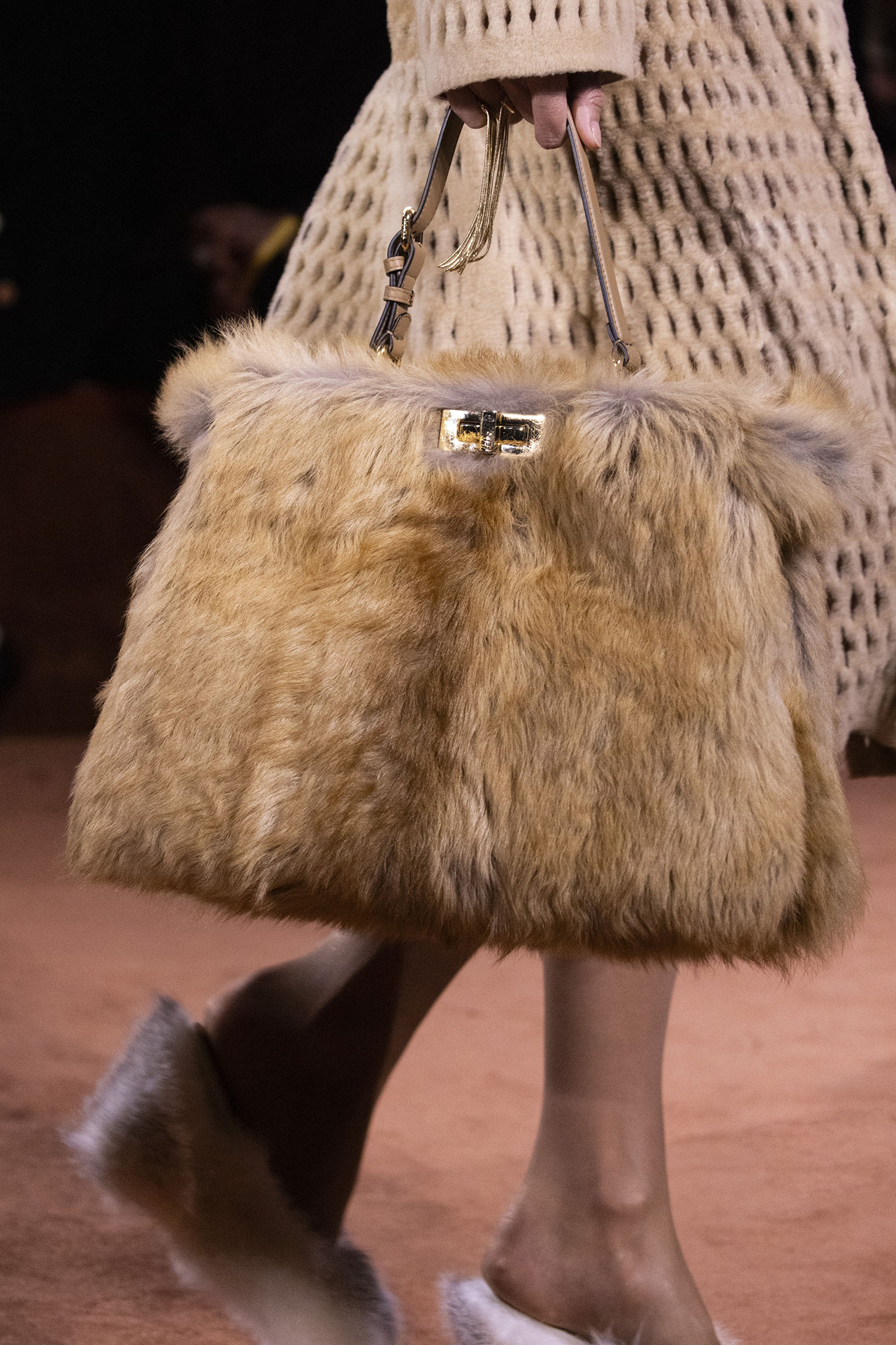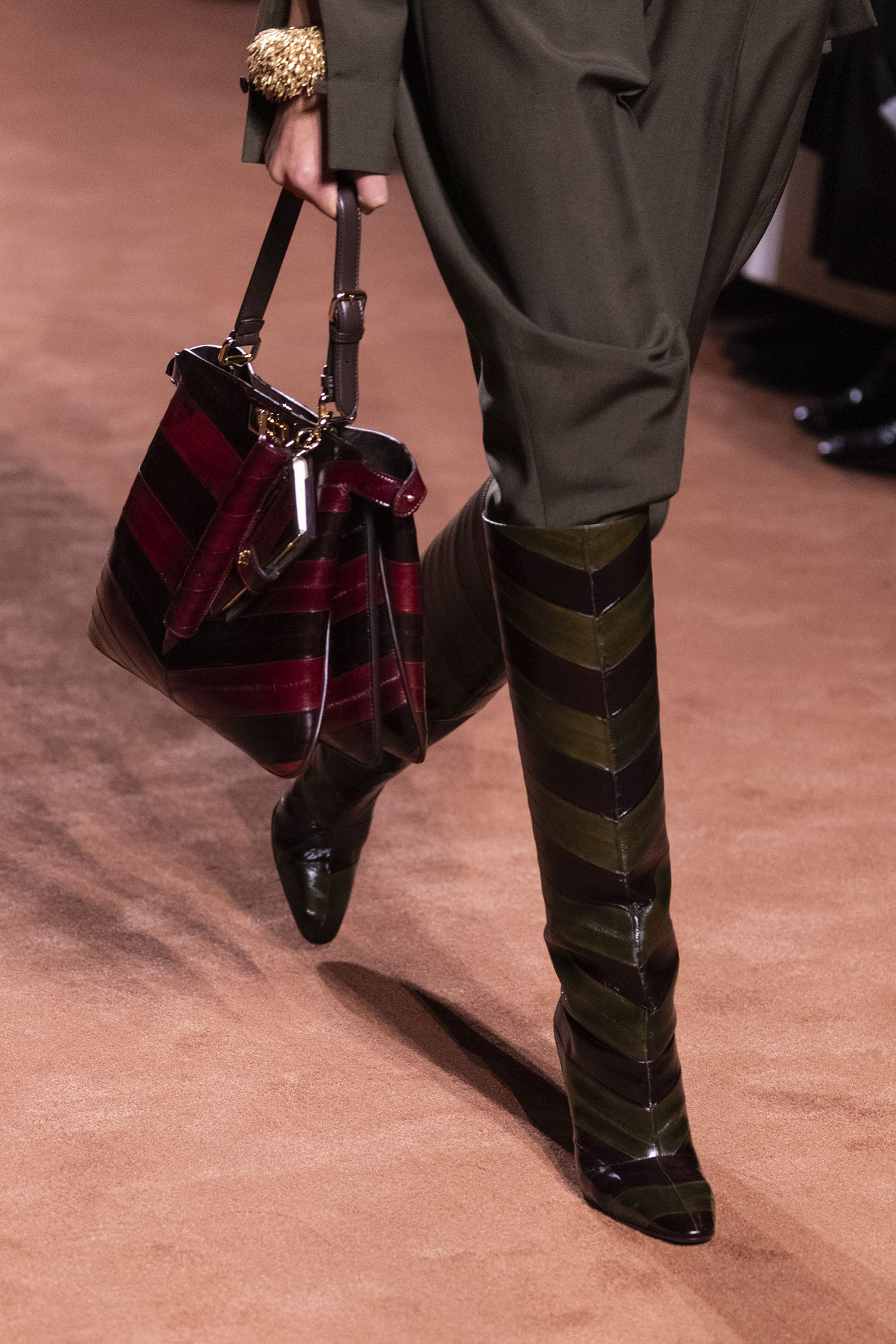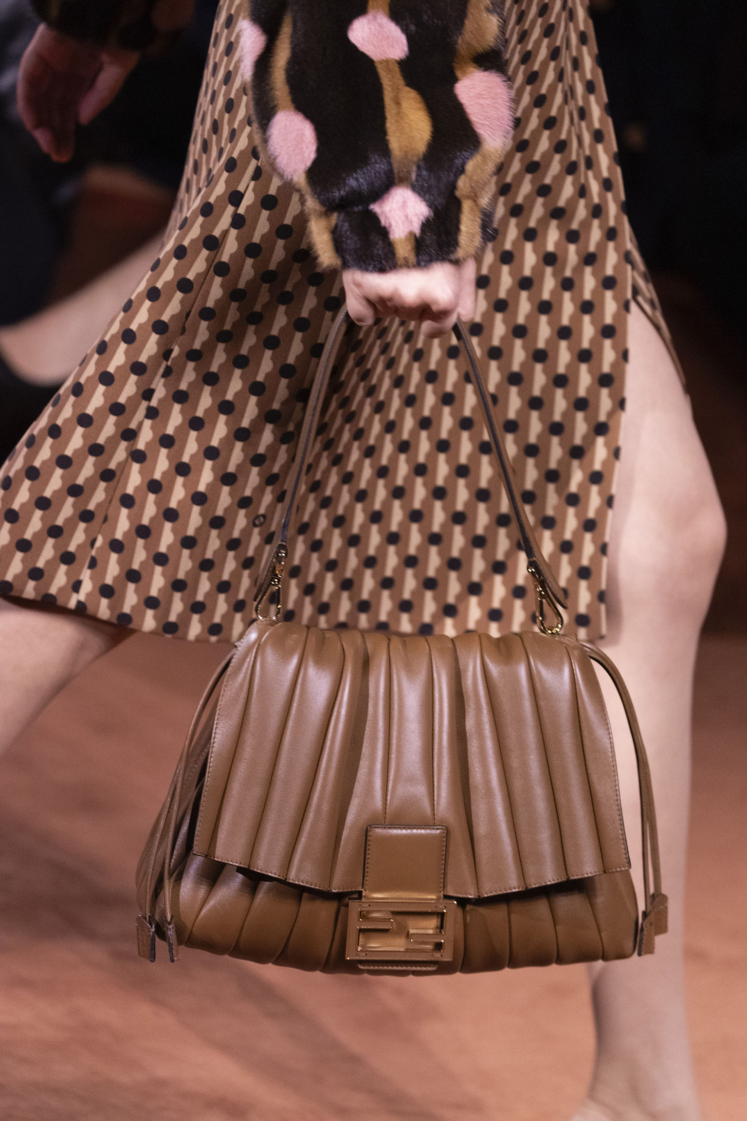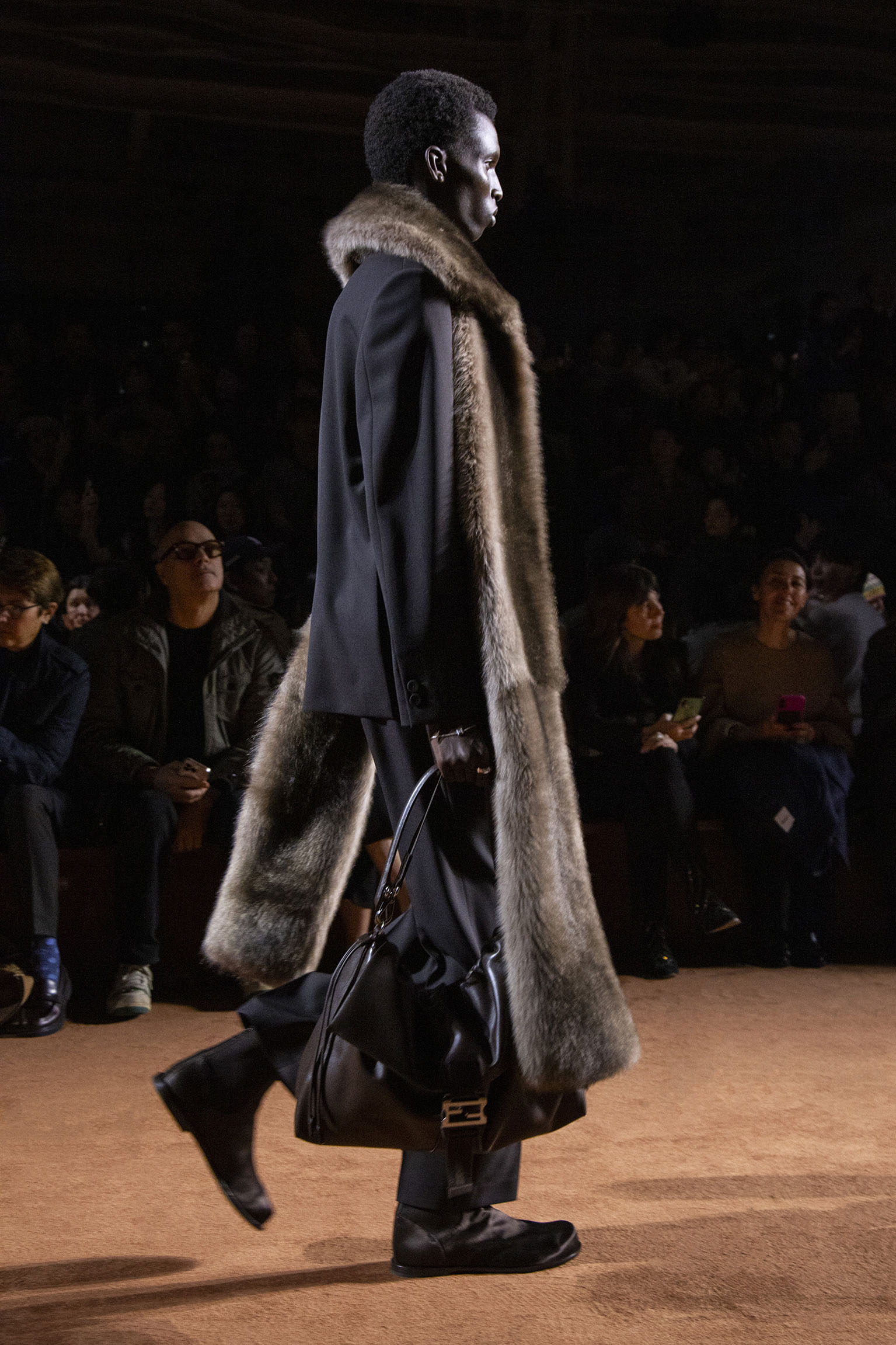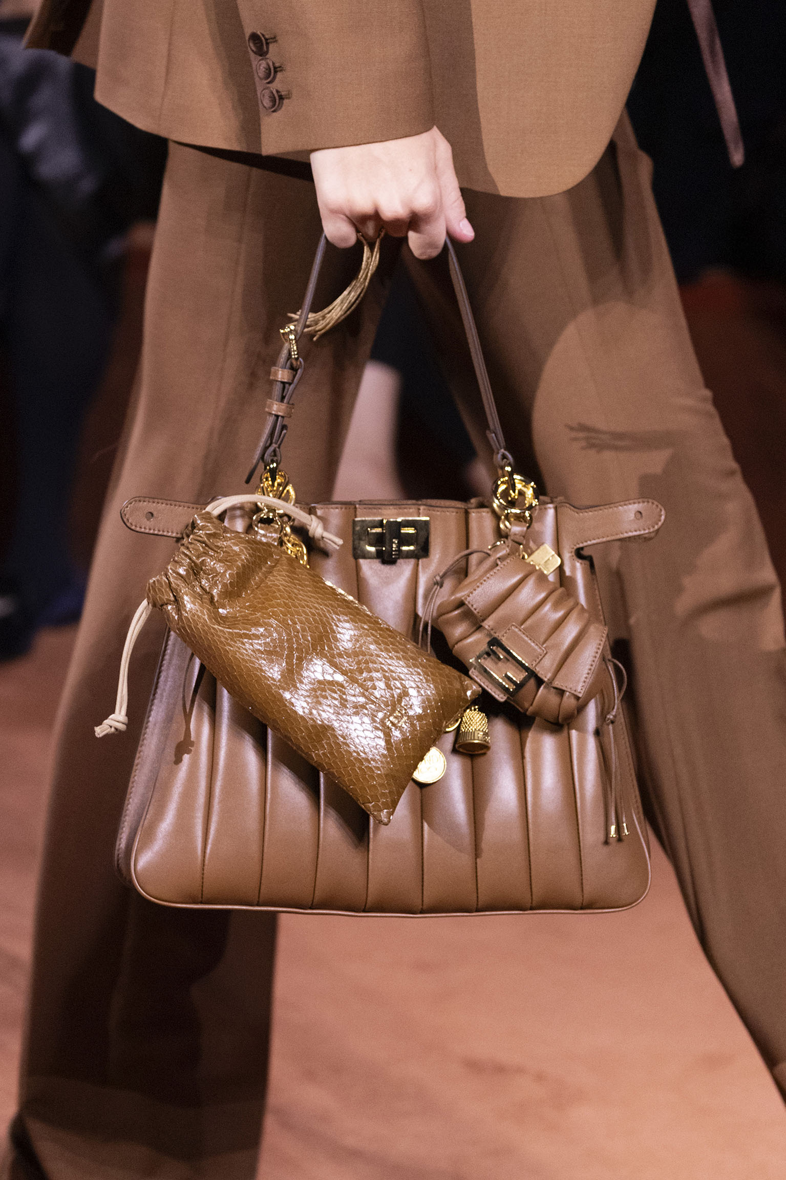 La richesse de la collection Fall/Winter 2025-26 se révèle également à travers l’horizon des accessoires, véritables prolongements du savoir-faire Fendi. Chaque pièce – qu’il s’agisse du Fendi Giano, du Spy Bag ou des modèles iconiques tels que le Peekaboo Soft et le Mamma Baguette – est conçue pour être à la fois fonctionnelle et esthétiquement irrésistible. La diversité des matériaux, allant du cuir travaillé en Selleria à la shearling aux touches métalliques, offre un éventail de possibilités stylistiques qui s’adaptent aux besoins d’un quotidien raffiné et d’occasions exceptionnelles. Ce mariage réussi entre tradition et innovation confère à la Maison une identité forte et singulière, faisant de chaque accessoire un symbole du luxe intemporel.