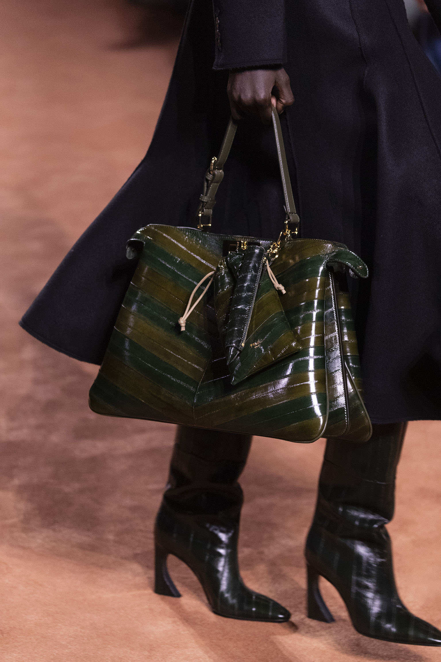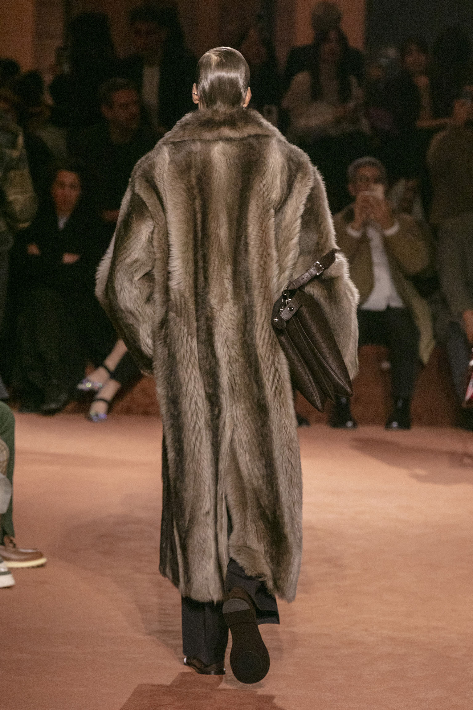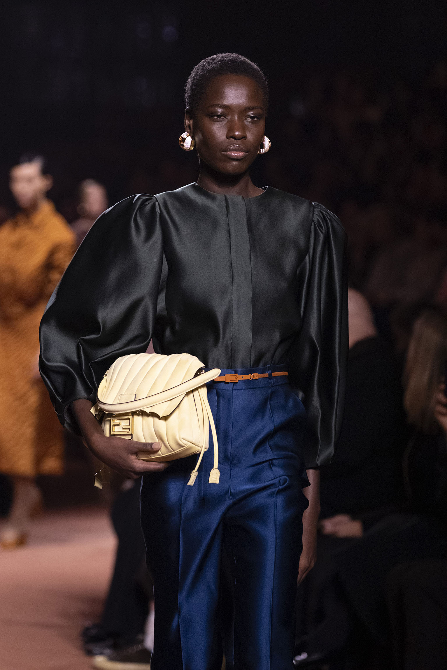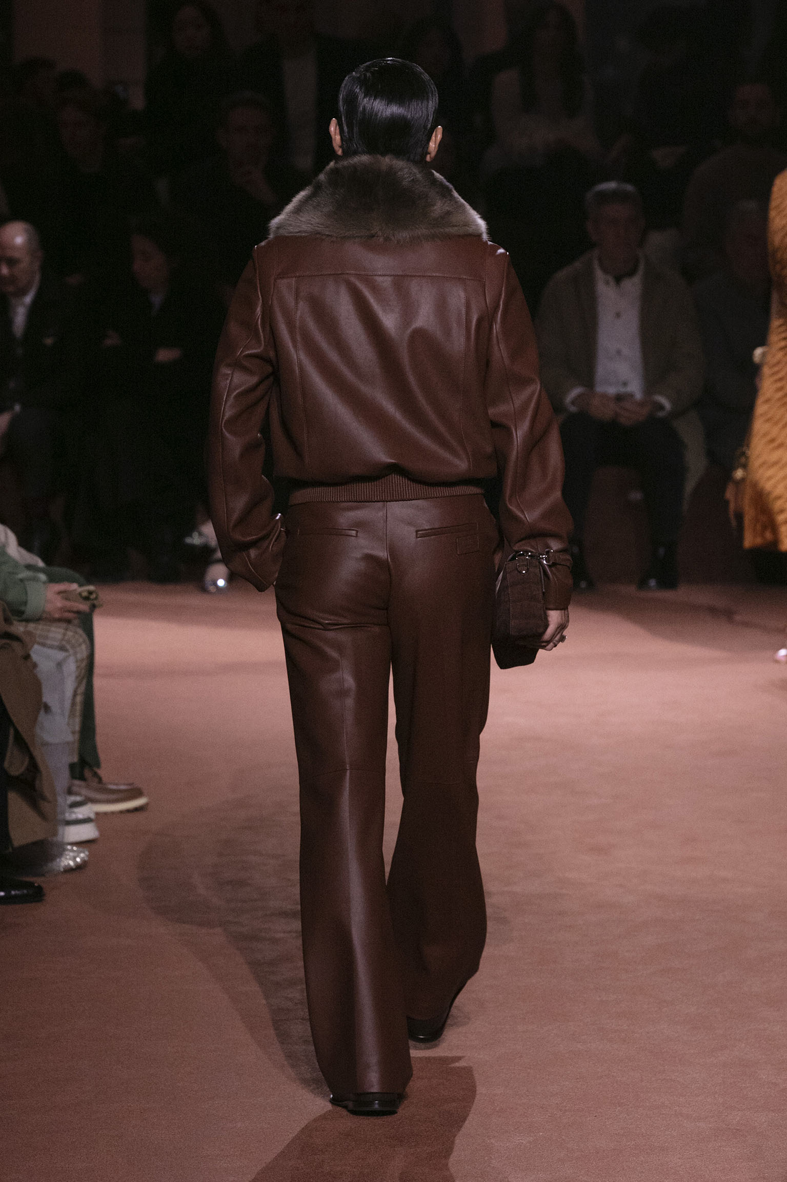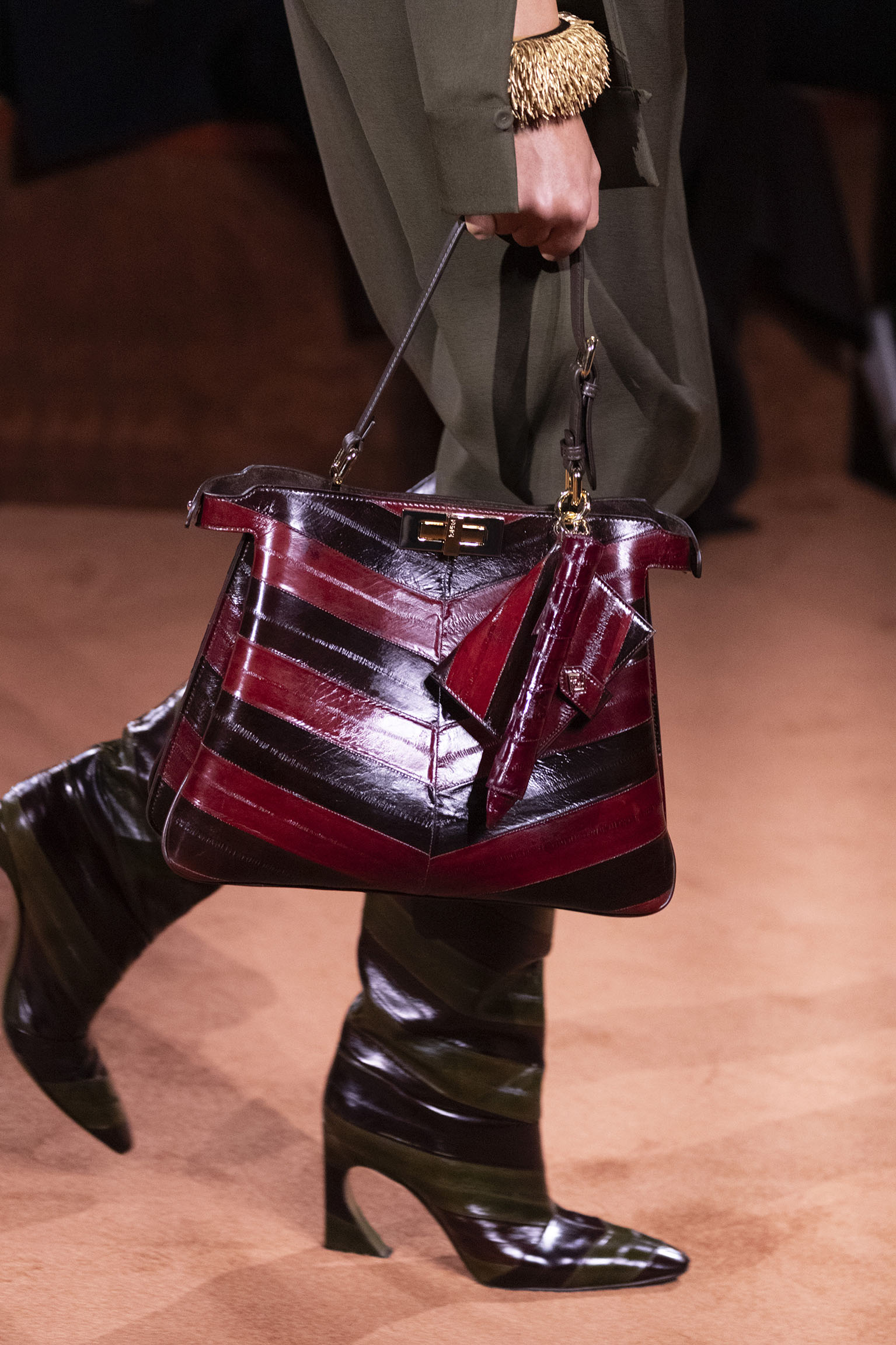 La richesse de la collection Fall/Winter 2025-26 se révèle également à travers l’horizon des accessoires, véritables prolongements du savoir-faire Fendi. Chaque pièce – qu’il s’agisse du Fendi Giano, du Spy Bag ou des modèles iconiques tels que le Peekaboo Soft et le Mamma Baguette – est conçue pour être à la fois fonctionnelle et esthétiquement irrésistible. La diversité des matériaux, allant du cuir travaillé en Selleria à la shearling aux touches métalliques, offre un éventail de possibilités stylistiques qui s’adaptent aux besoins d’un quotidien raffiné et d’occasions exceptionnelles. Ce mariage réussi entre tradition et innovation confère à la Maison une identité forte et singulière, faisant de chaque accessoire un symbole du luxe intemporel.