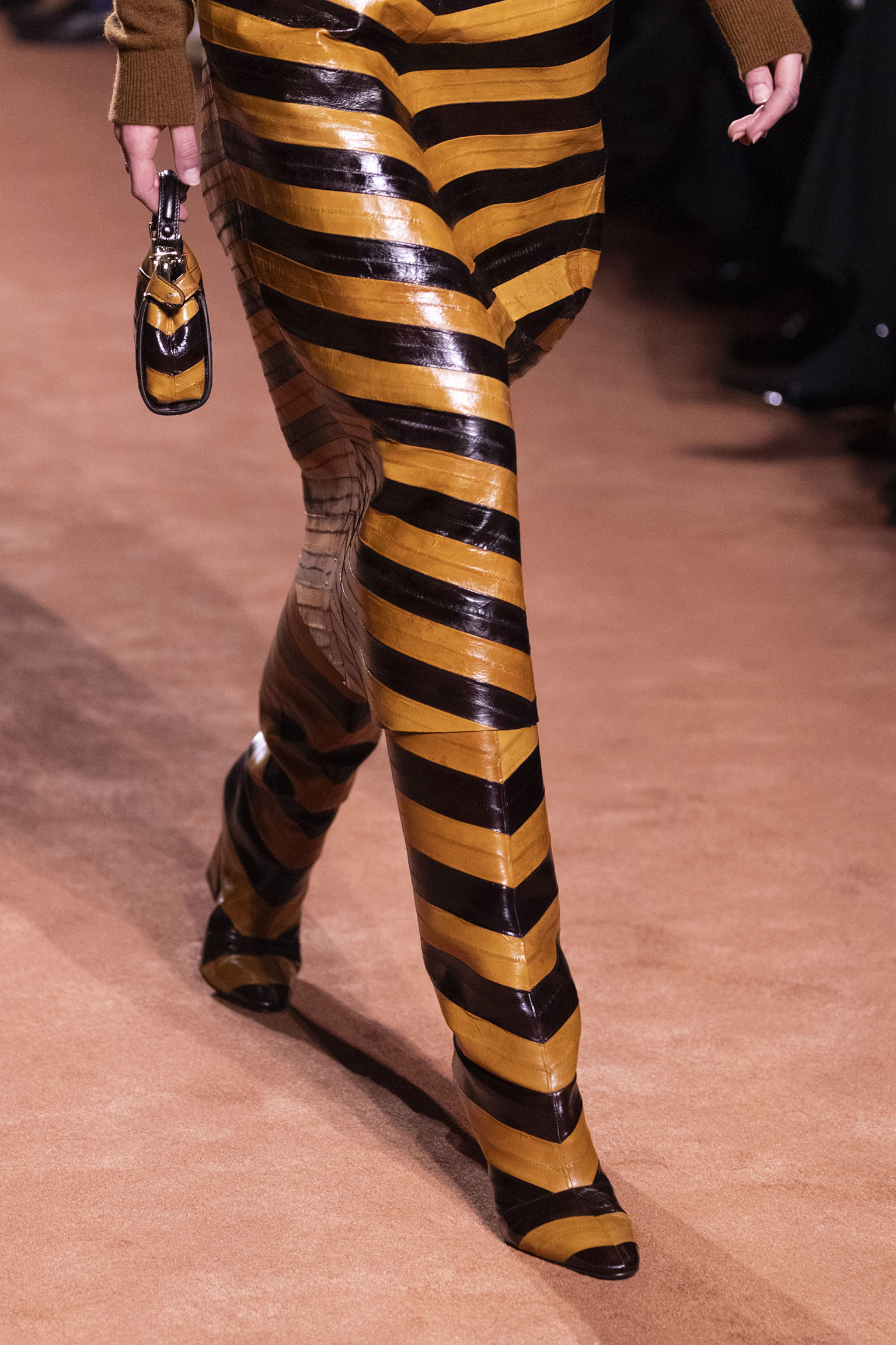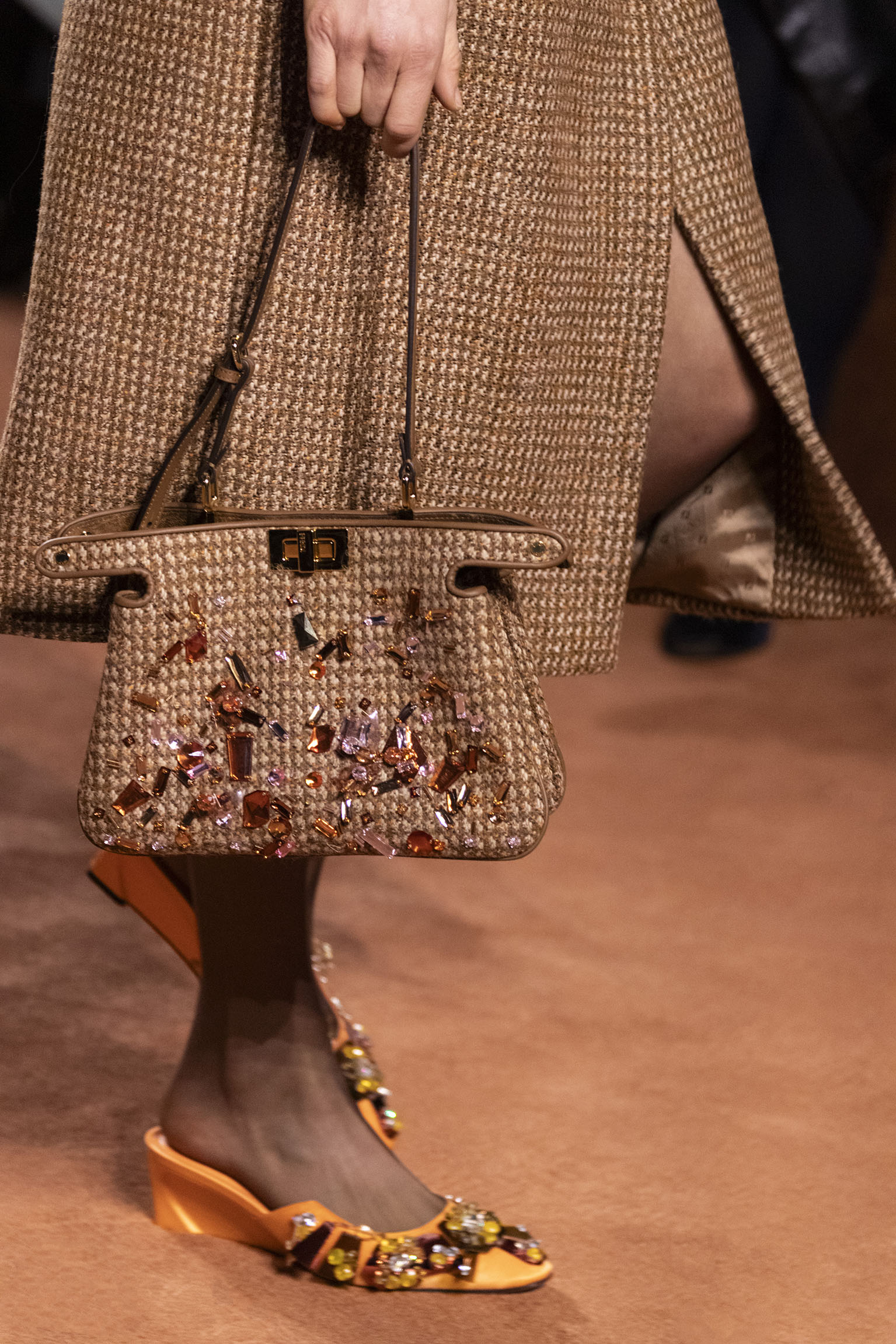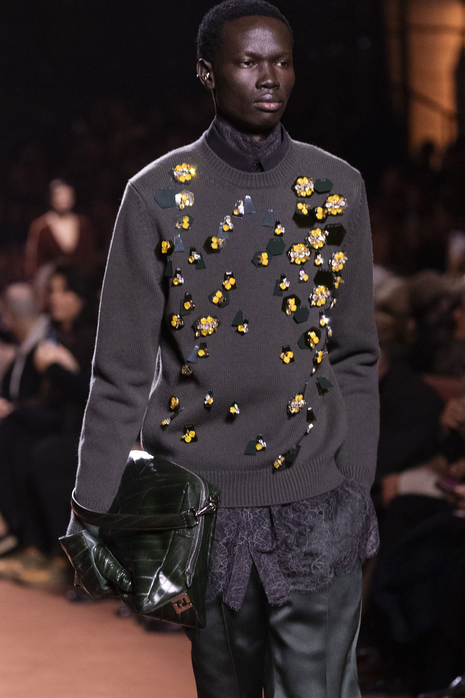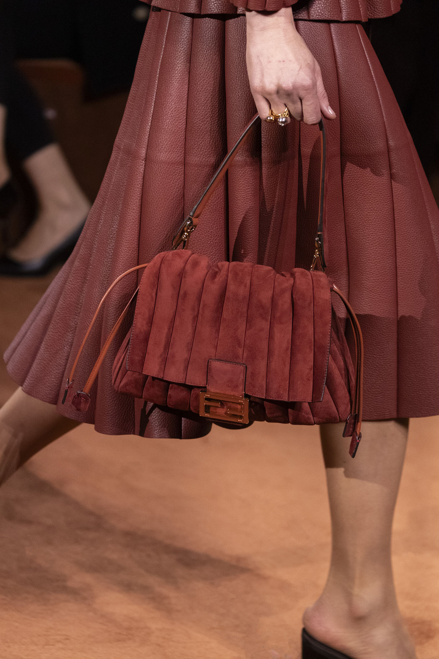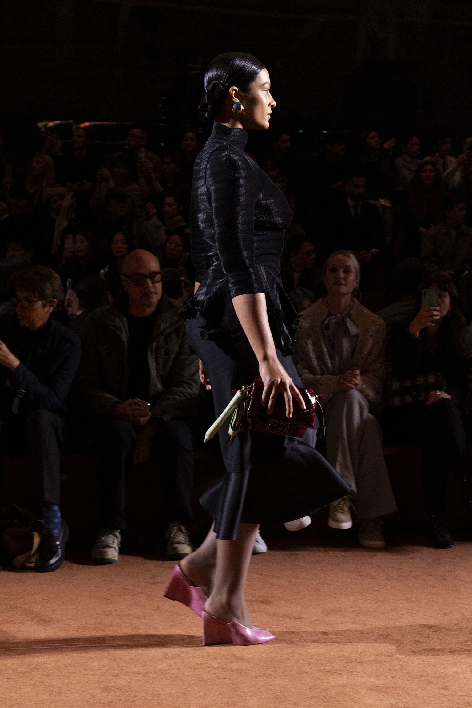 La richesse de la collection Fall/Winter 2025-26 se révèle également à travers l’horizon des accessoires, véritables prolongements du savoir-faire Fendi. Chaque pièce – qu’il s’agisse du Fendi Giano, du Spy Bag ou des modèles iconiques tels que le Peekaboo Soft et le Mamma Baguette – est conçue pour être à la fois fonctionnelle et esthétiquement irrésistible. La diversité des matériaux, allant du cuir travaillé en Selleria à la shearling aux touches métalliques, offre un éventail de possibilités stylistiques qui s’adaptent aux besoins d’un quotidien raffiné et d’occasions exceptionnelles. Ce mariage réussi entre tradition et innovation confère à la Maison une identité forte et singulière, faisant de chaque accessoire un symbole du luxe intemporel.