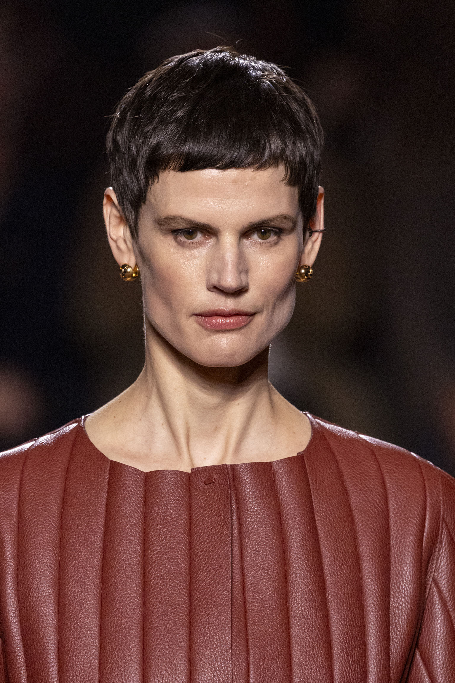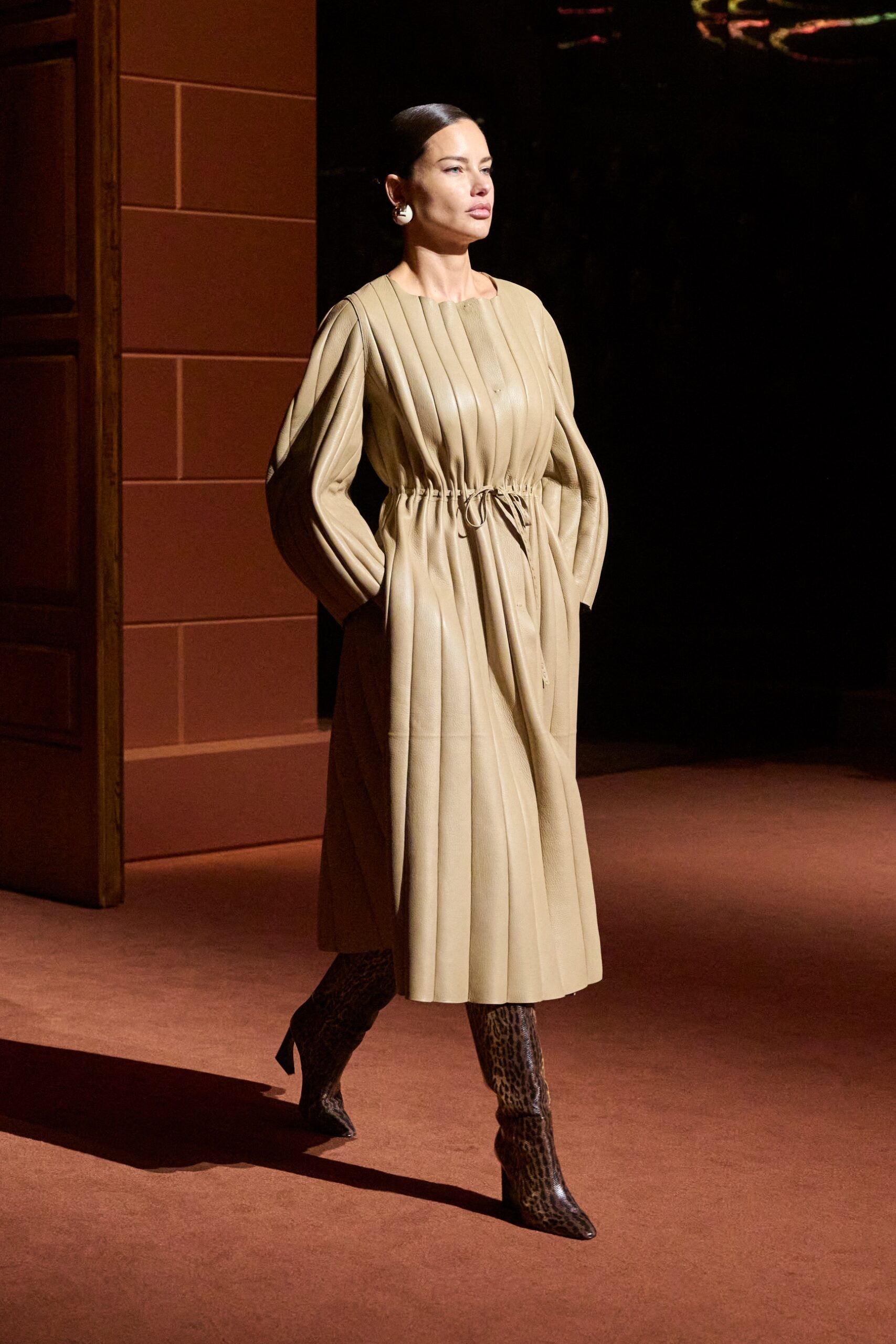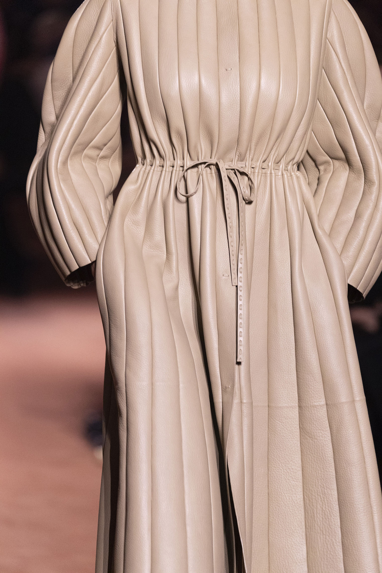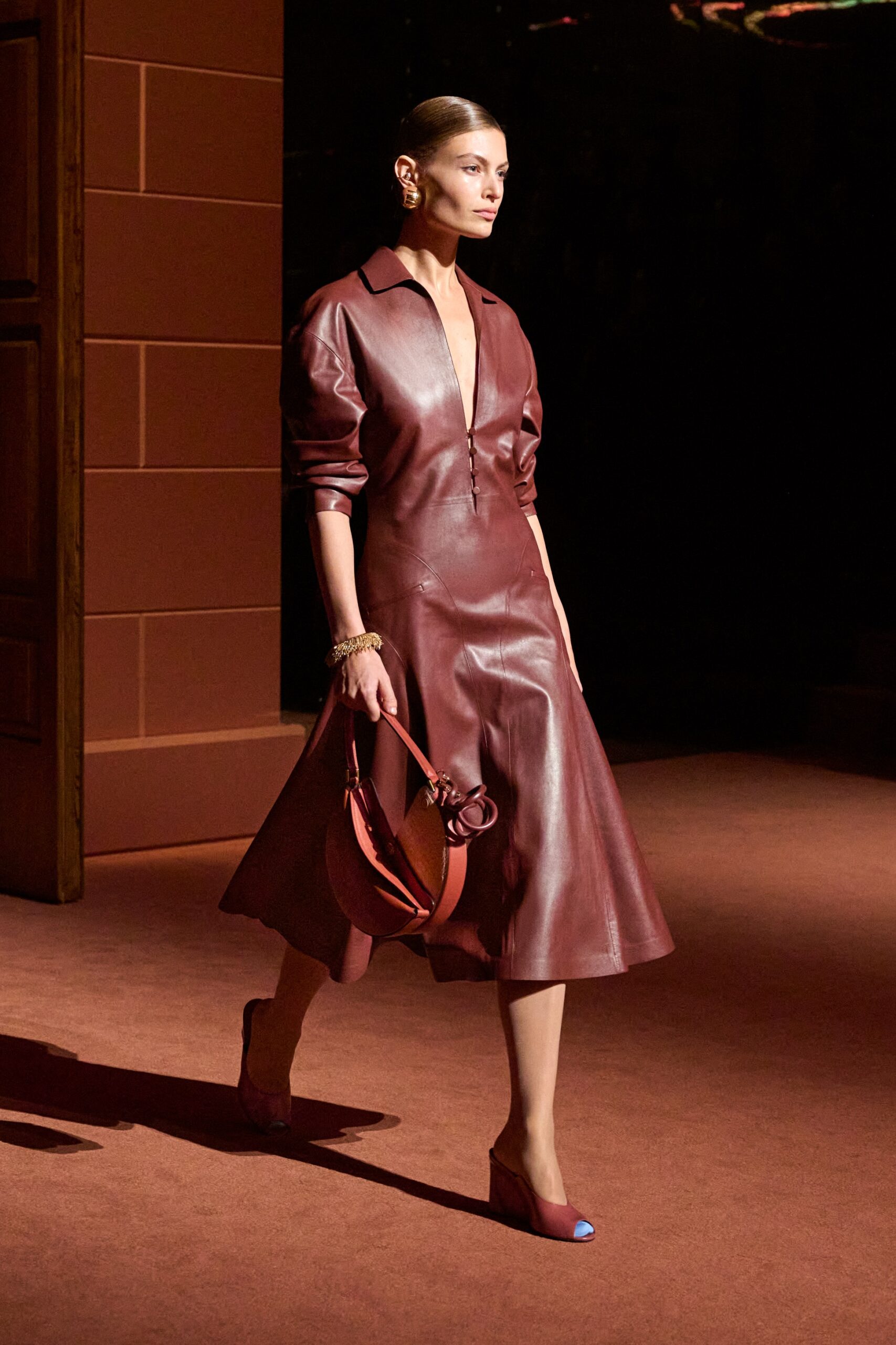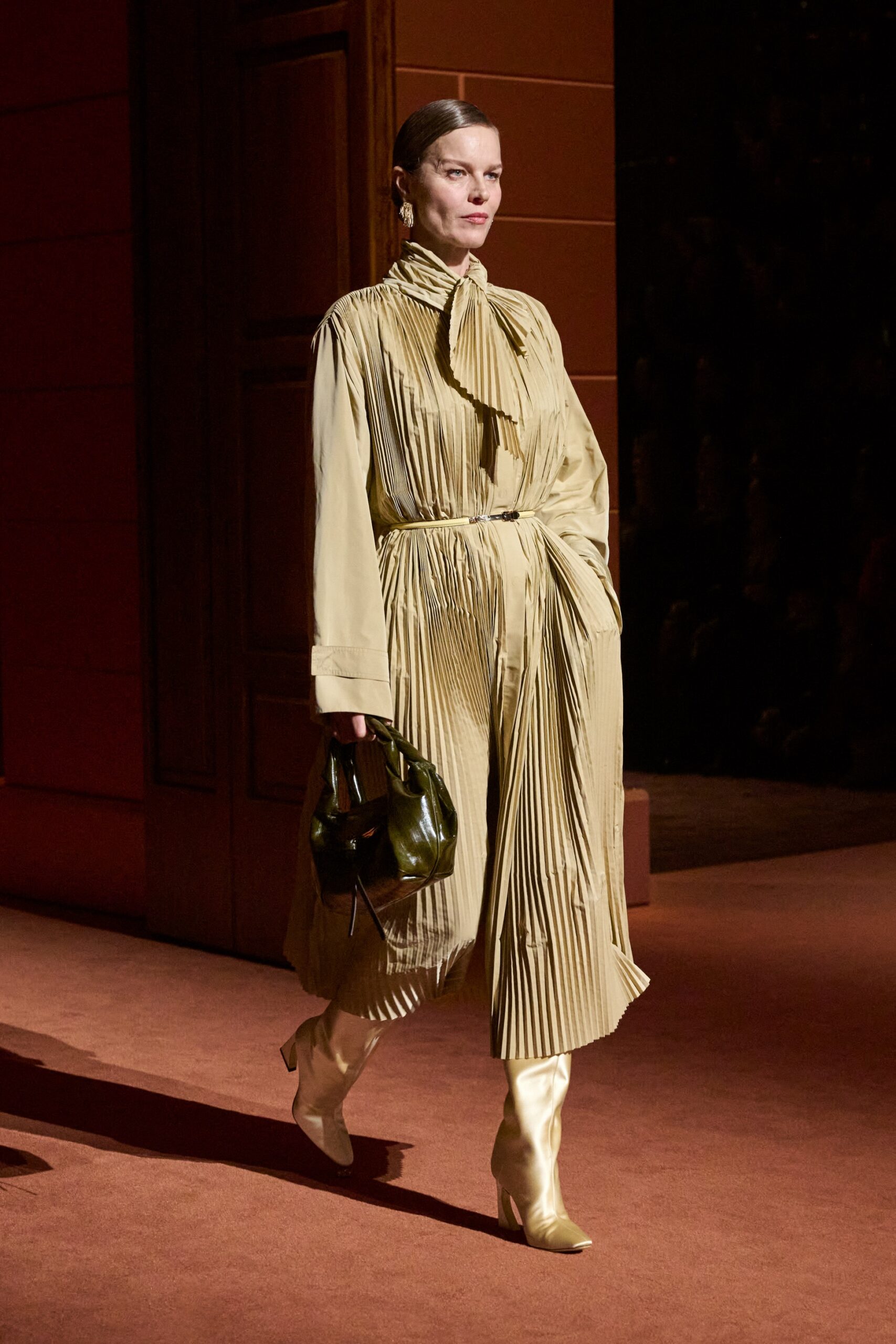 La dimension sensorielle de la collection s’exprime aussi à travers l’harmonie des contrastes – le jeu subtil entre mat et brillant, entre textures rugueuses et soyeuses, qui confère à chaque pièce une profondeur presque théâtrale. Ainsi, des robes en plissé marbré se dissolvent dans des volants de corolle, tandis que des vestes en cuir se parent d’intarsias géométriques qui évoquent l’Op-Art, transformant le vêtement en œuvre d’art. L’ambition est de proposer une mode qui ne se contente pas de vêtir, mais qui raconte une histoire, celle d’une Maison qui a su traverser les époques sans jamais perdre son âme, tout en se réinventant sans cesse au gré des influences contemporaines.