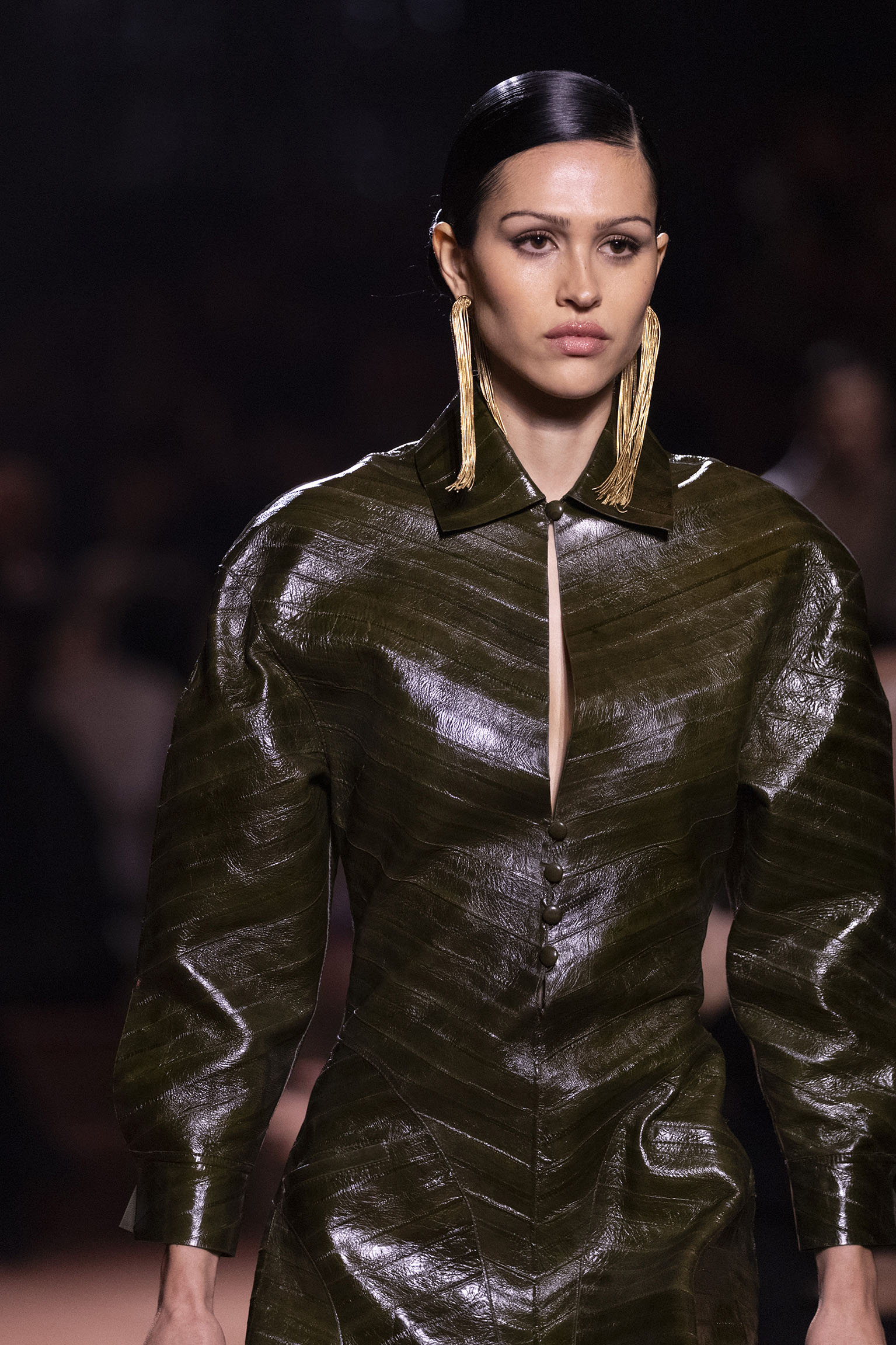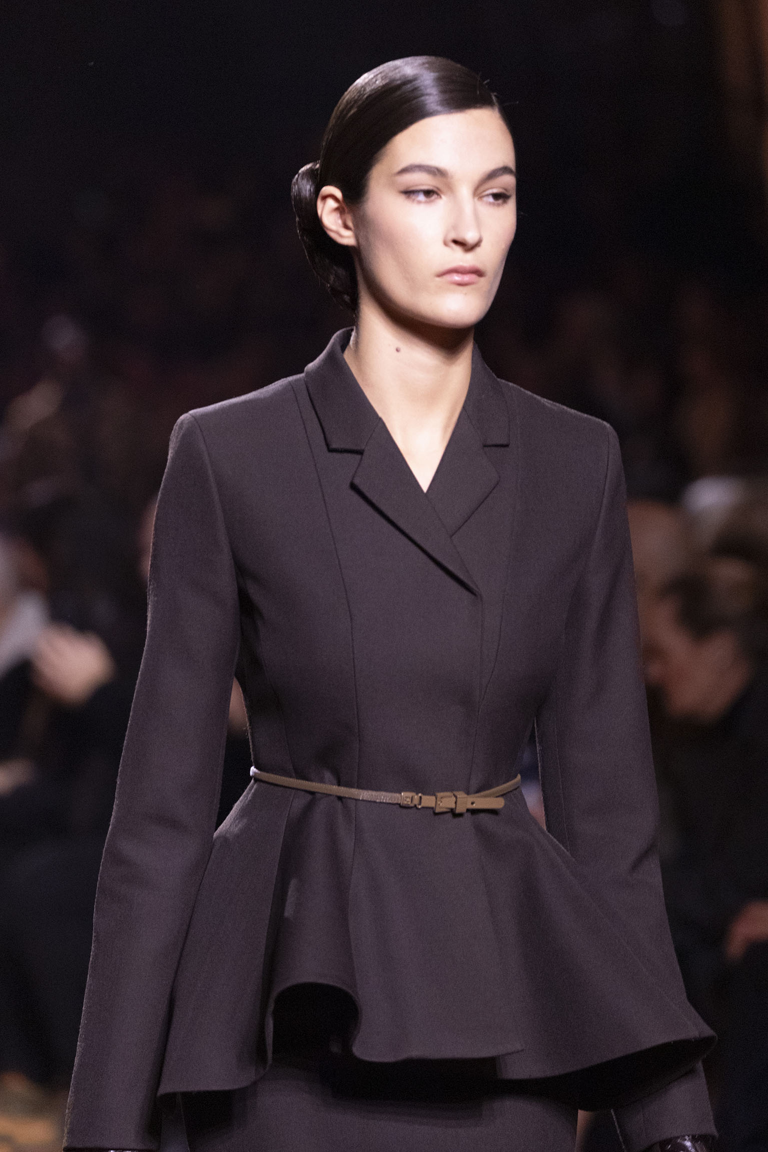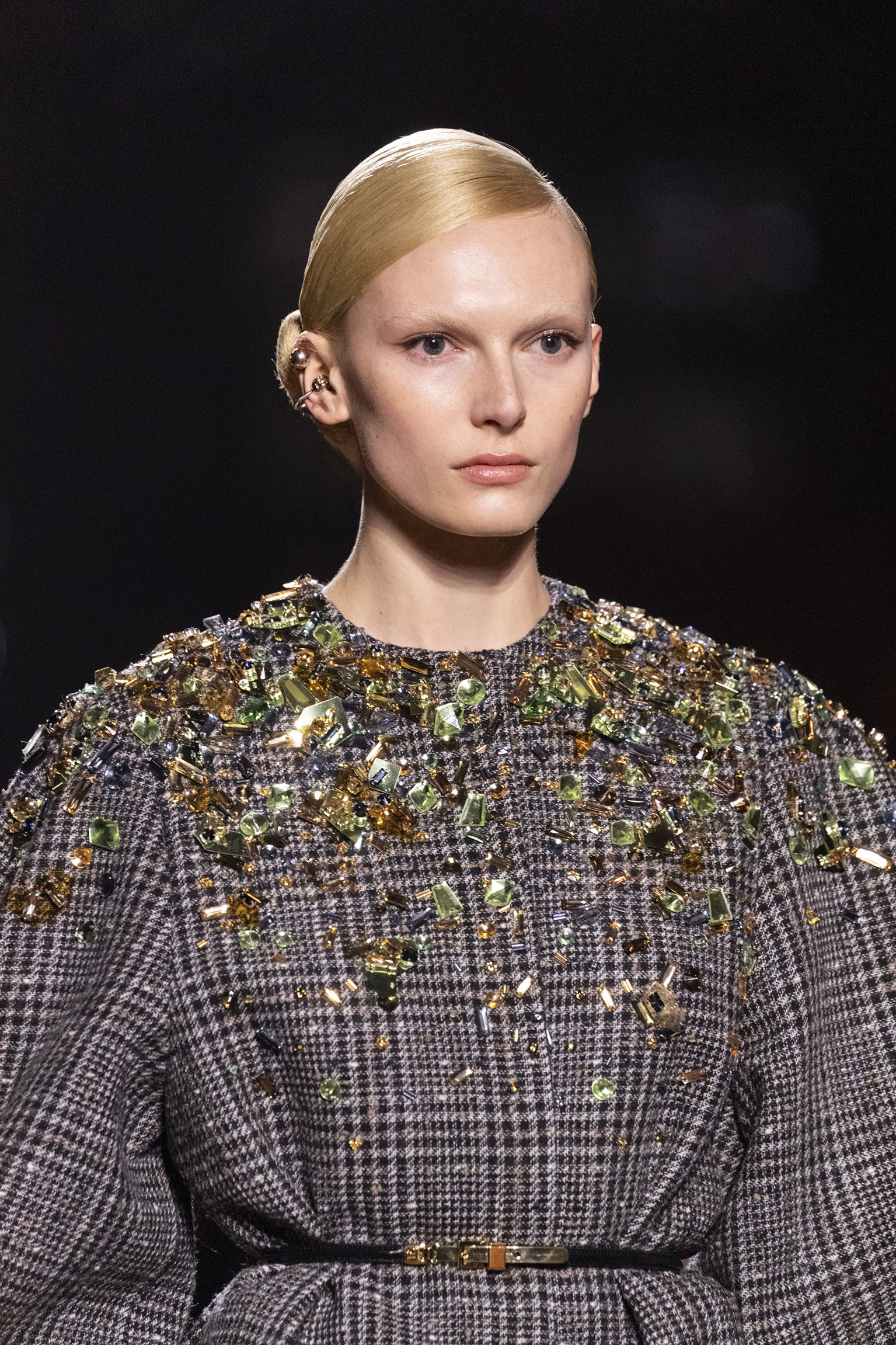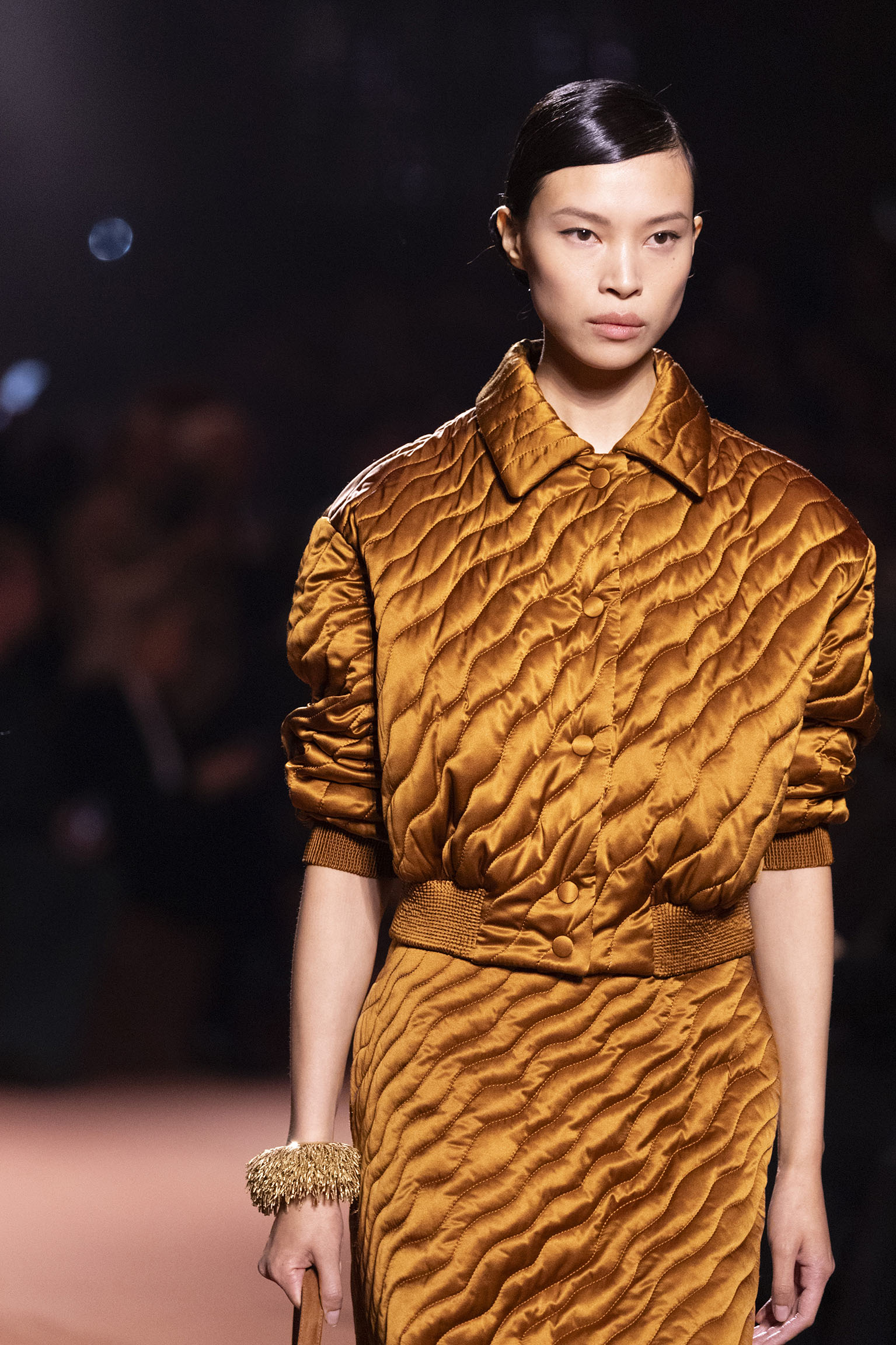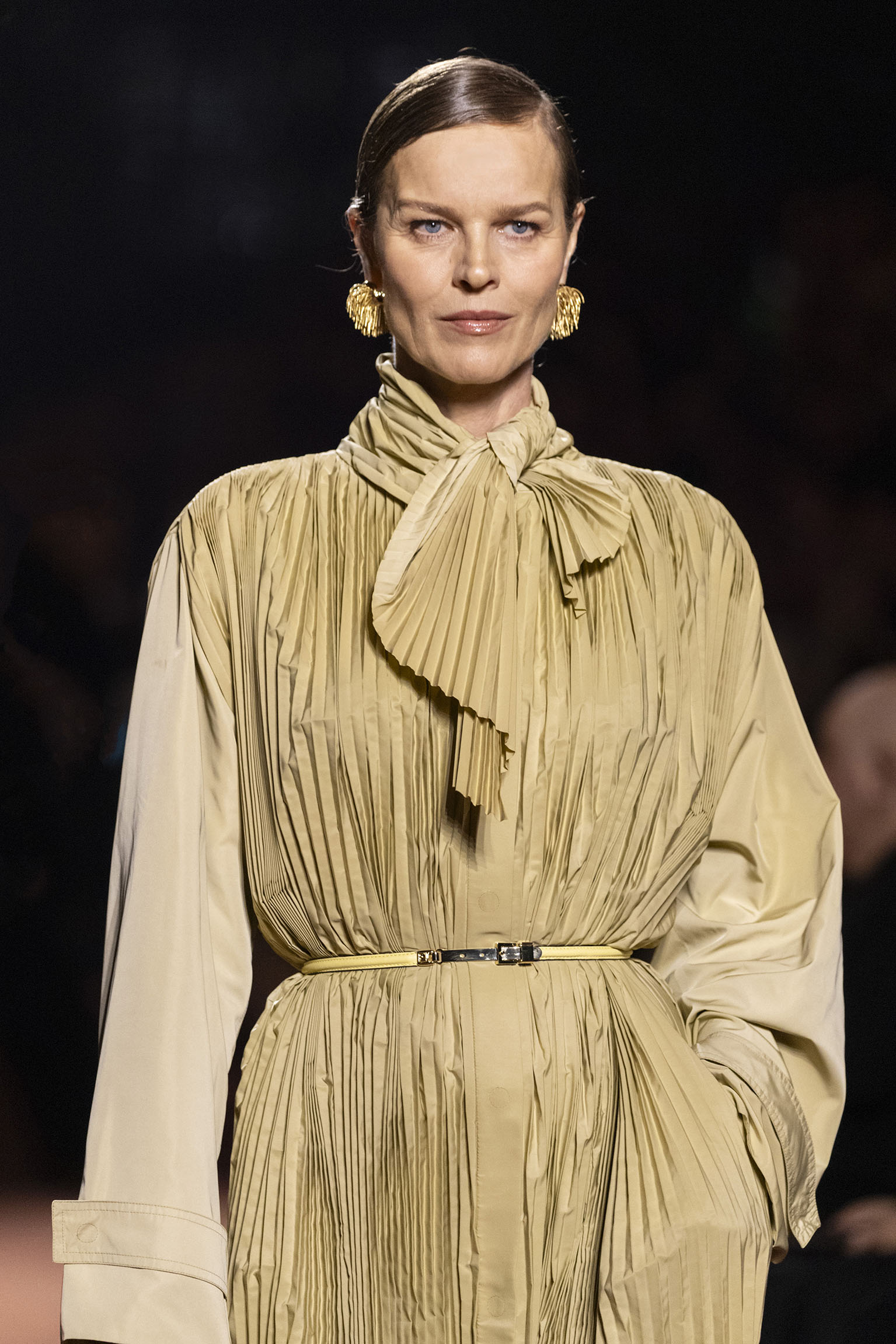 La dimension sensorielle de la collection s’exprime aussi à travers l’harmonie des contrastes – le jeu subtil entre mat et brillant, entre textures rugueuses et soyeuses, qui confère à chaque pièce une profondeur presque théâtrale. Ainsi, des robes en plissé marbré se dissolvent dans des volants de corolle, tandis que des vestes en cuir se parent d’intarsias géométriques qui évoquent l’Op-Art, transformant le vêtement en œuvre d’art. L’ambition est de proposer une mode qui ne se contente pas de vêtir, mais qui raconte une histoire, celle d’une Maison qui a su traverser les époques sans jamais perdre son âme, tout en se réinventant sans cesse au gré des influences contemporaines.