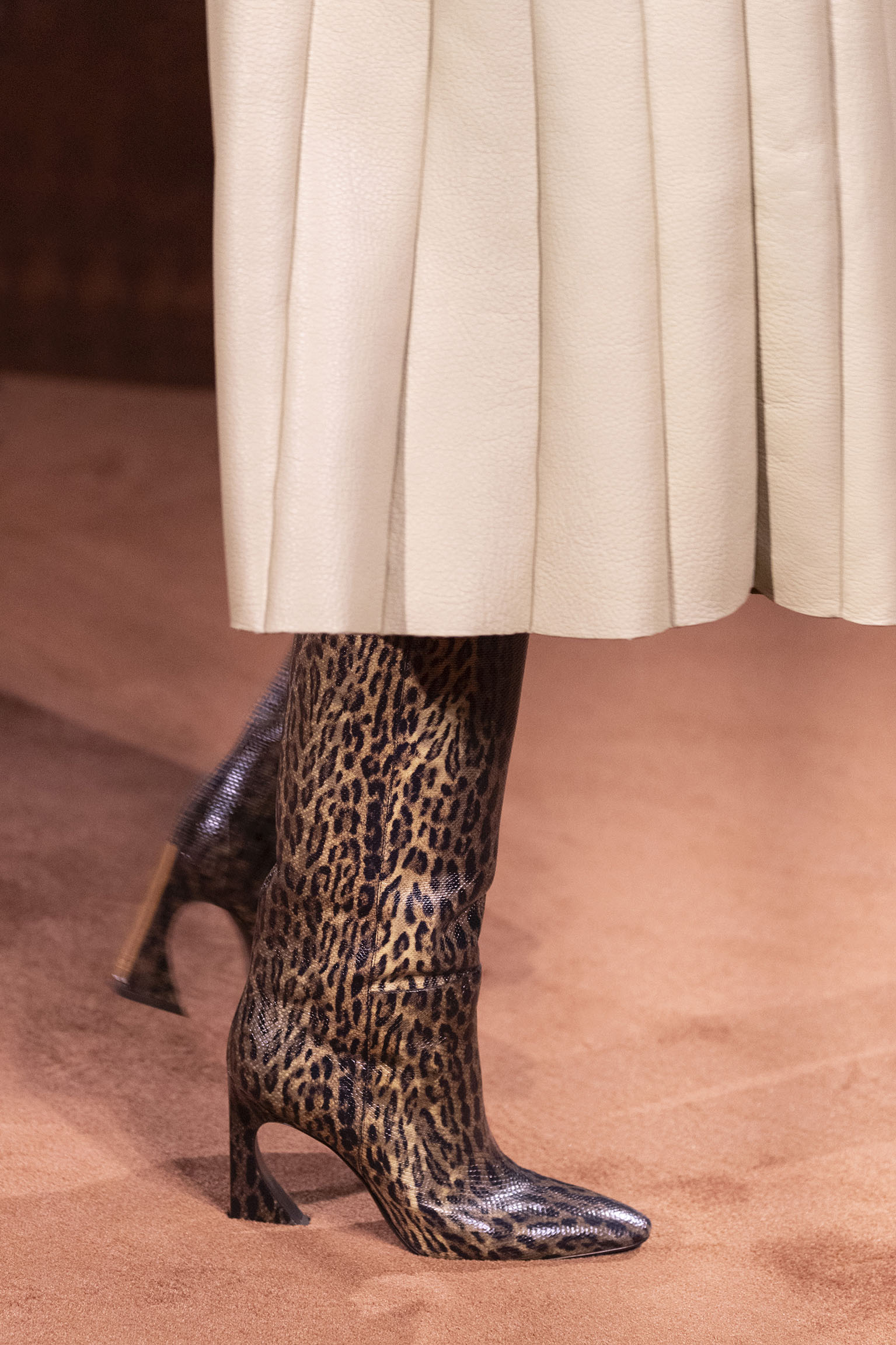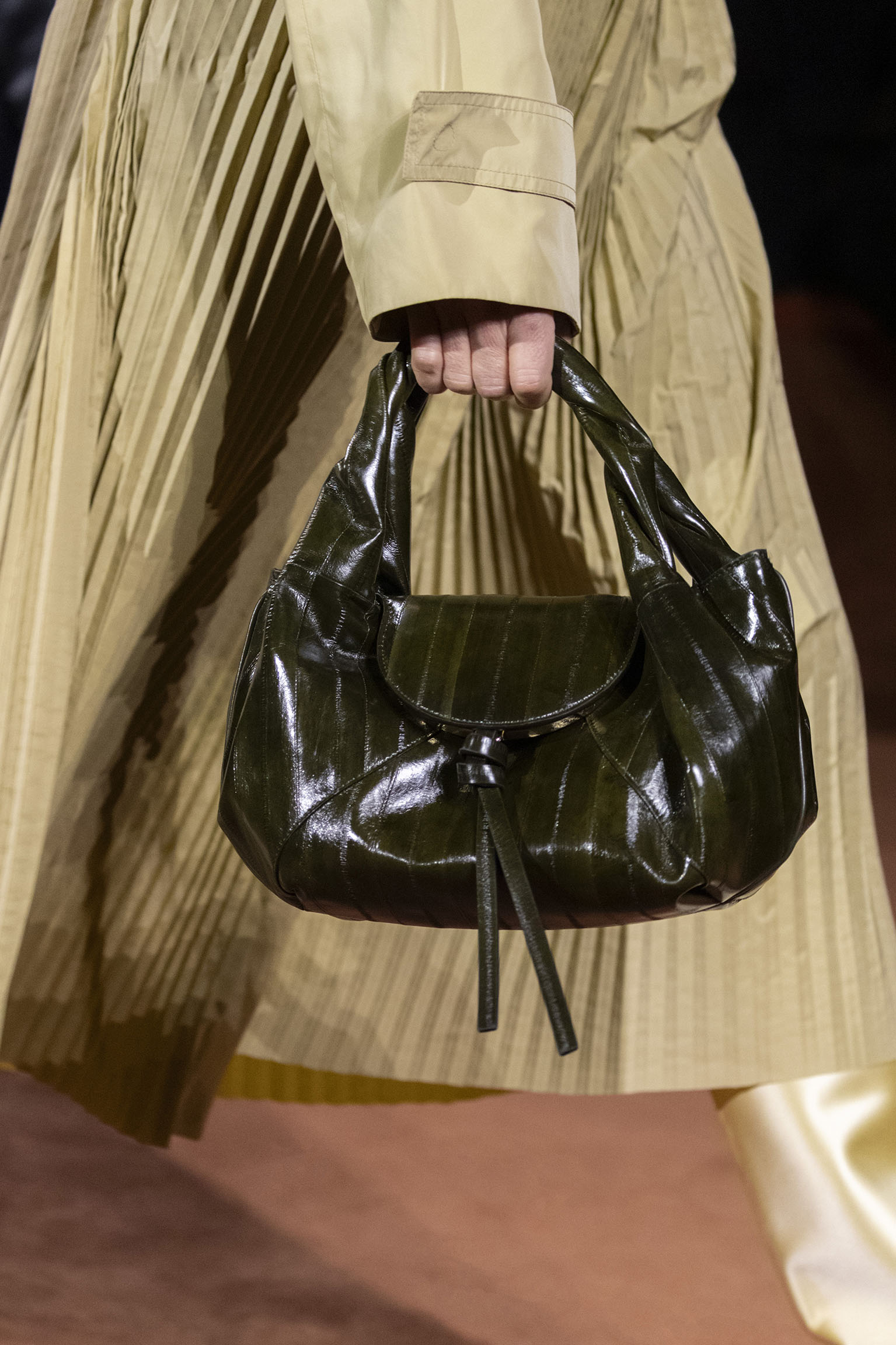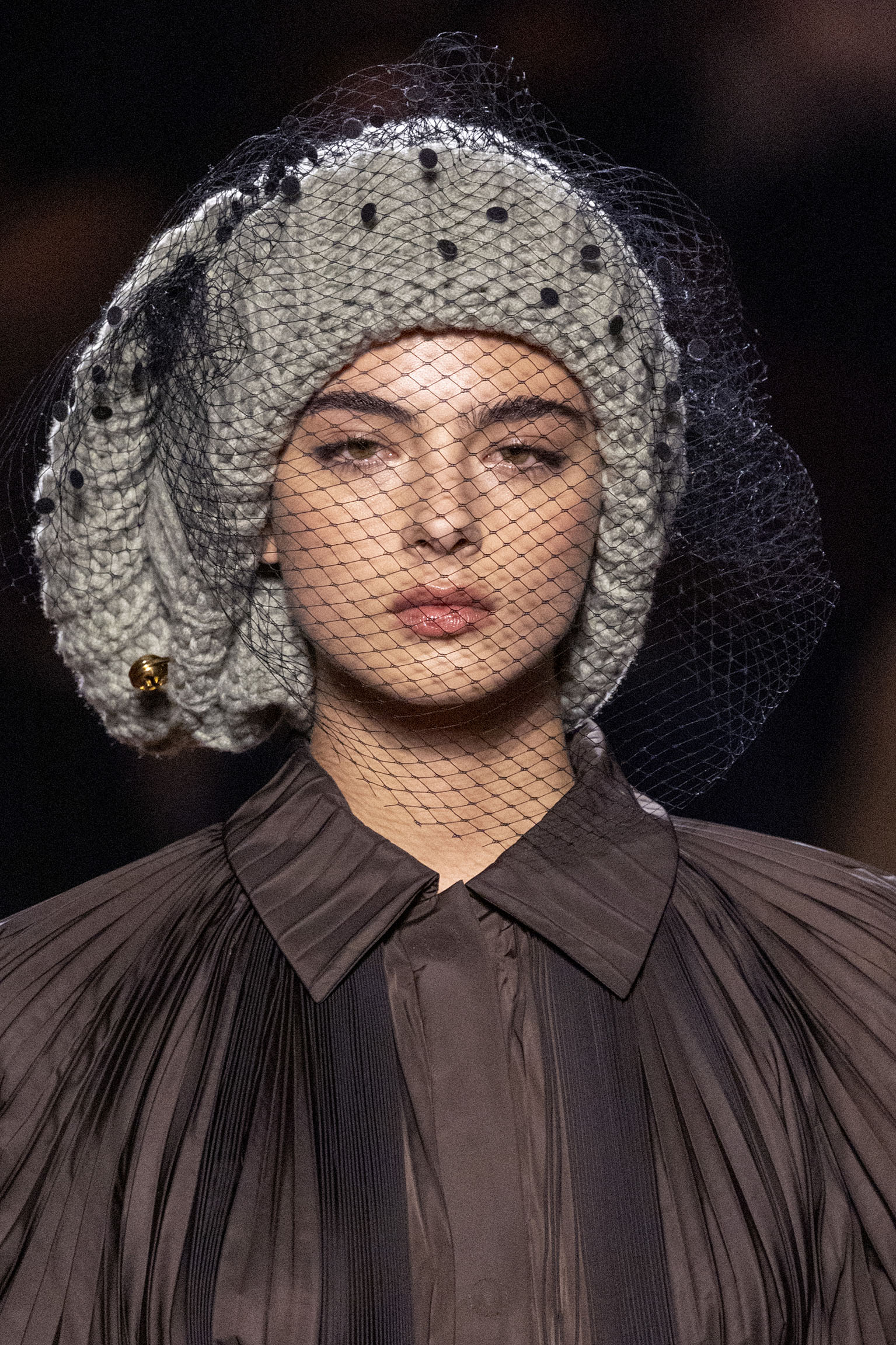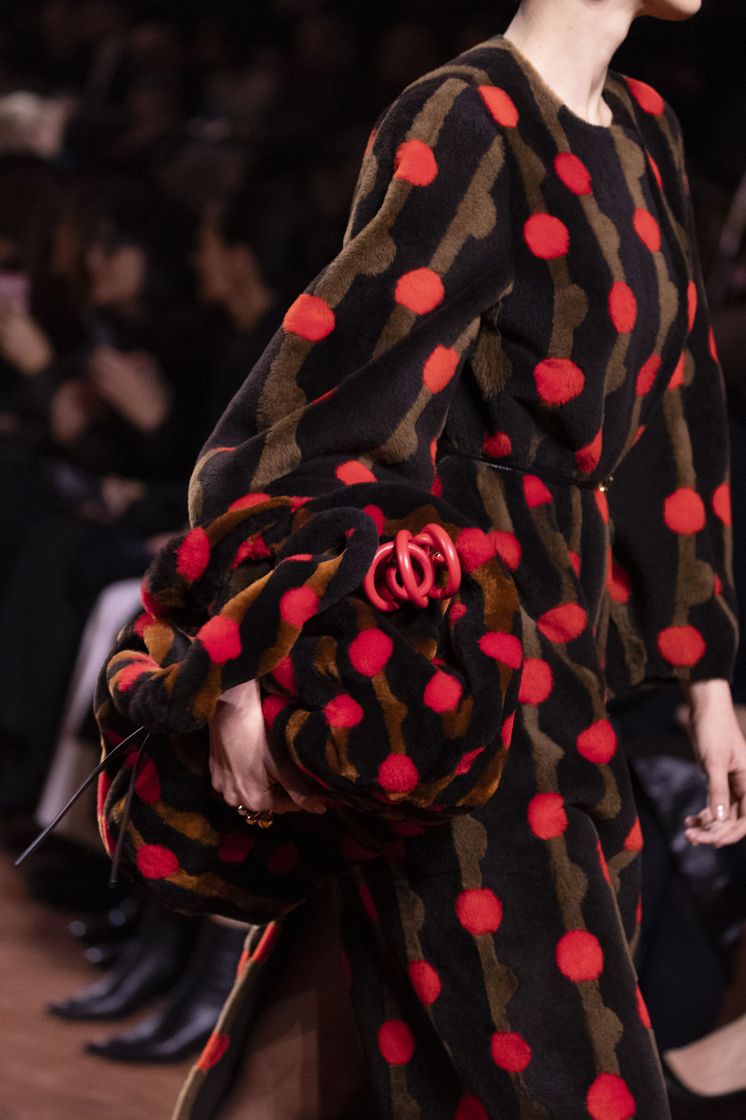 La dimension sensorielle de la collection s’exprime aussi à travers l’harmonie des contrastes – le jeu subtil entre mat et brillant, entre textures rugueuses et soyeuses, qui confère à chaque pièce une profondeur presque théâtrale. Ainsi, des robes en plissé marbré se dissolvent dans des volants de corolle, tandis que des vestes en cuir se parent d’intarsias géométriques qui évoquent l’Op-Art, transformant le vêtement en œuvre d’art. L’ambition est de proposer une mode qui ne se contente pas de vêtir, mais qui raconte une histoire, celle d’une Maison qui a su traverser les époques sans jamais perdre son âme, tout en se réinventant sans cesse au gré des influences contemporaines.