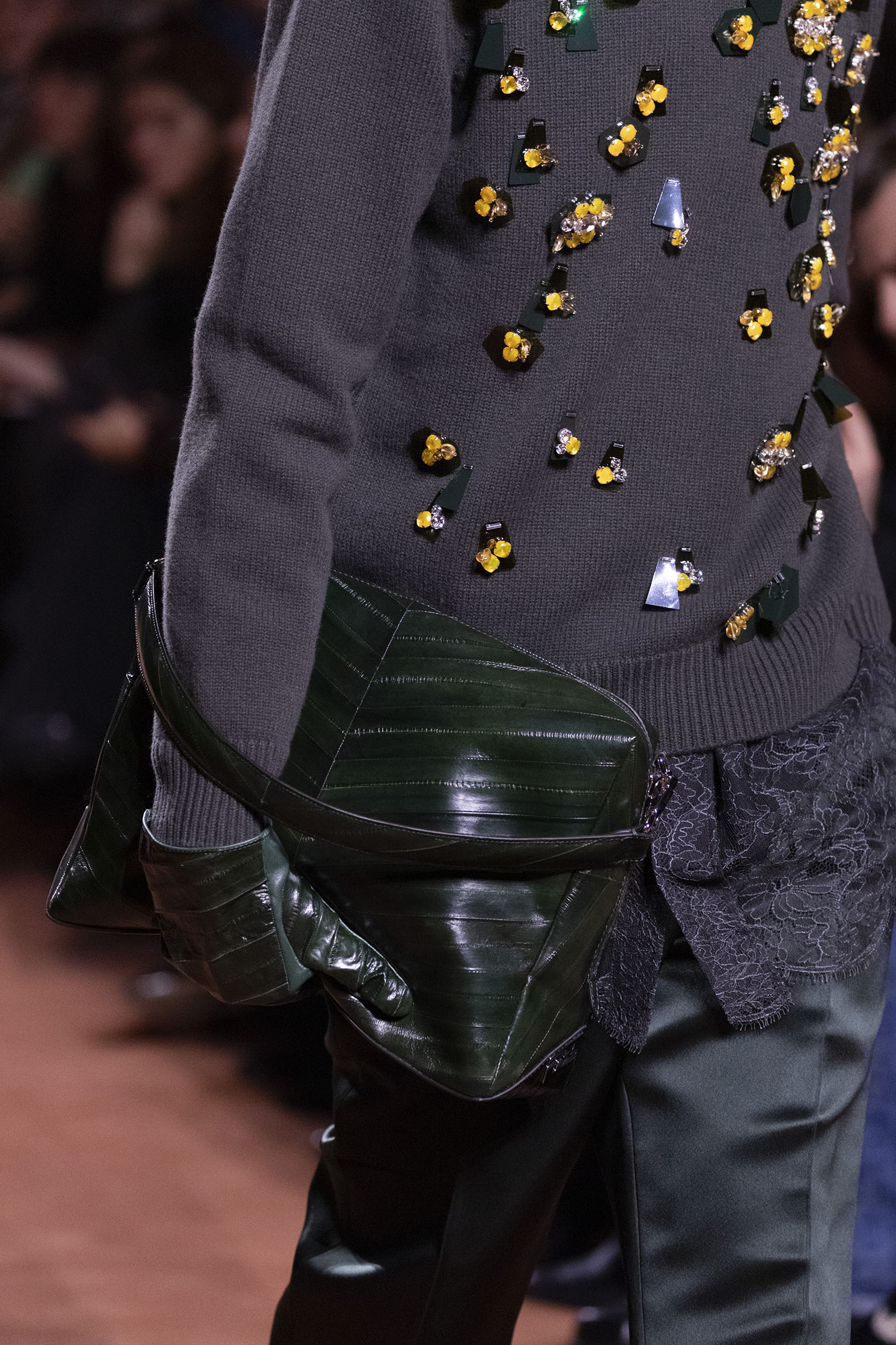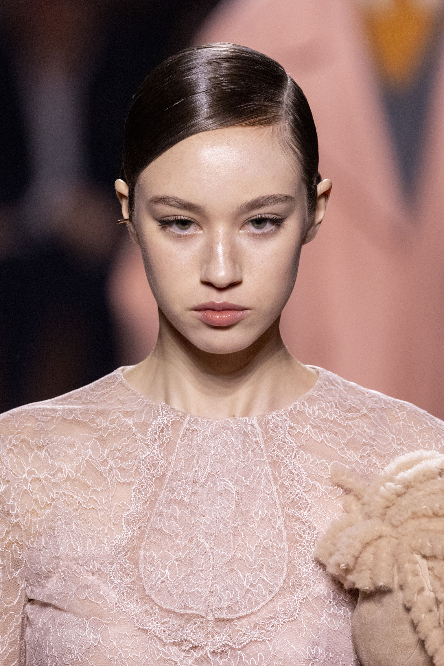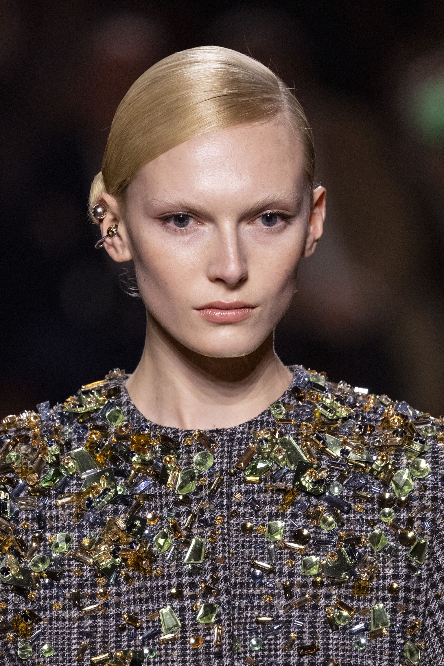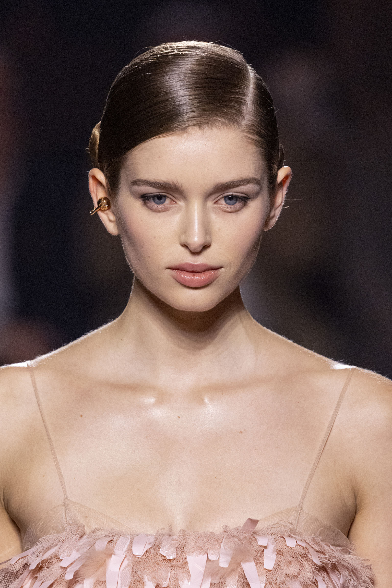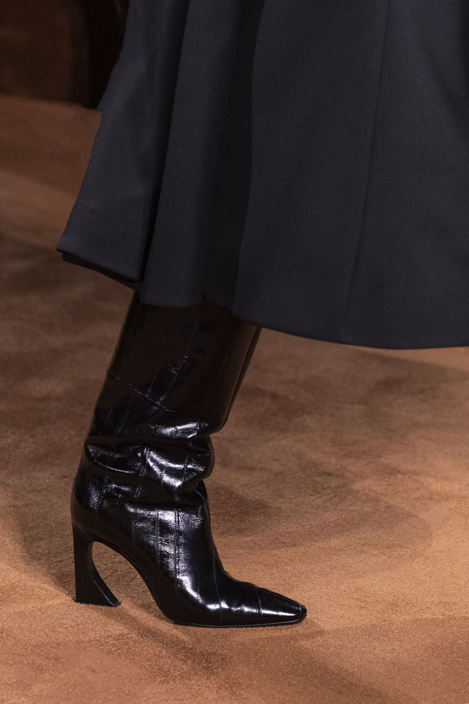 La dimension sensorielle de la collection s’exprime aussi à travers l’harmonie des contrastes – le jeu subtil entre mat et brillant, entre textures rugueuses et soyeuses, qui confère à chaque pièce une profondeur presque théâtrale. Ainsi, des robes en plissé marbré se dissolvent dans des volants de corolle, tandis que des vestes en cuir se parent d’intarsias géométriques qui évoquent l’Op-Art, transformant le vêtement en œuvre d’art. L’ambition est de proposer une mode qui ne se contente pas de vêtir, mais qui raconte une histoire, celle d’une Maison qui a su traverser les époques sans jamais perdre son âme, tout en se réinventant sans cesse au gré des influences contemporaines.