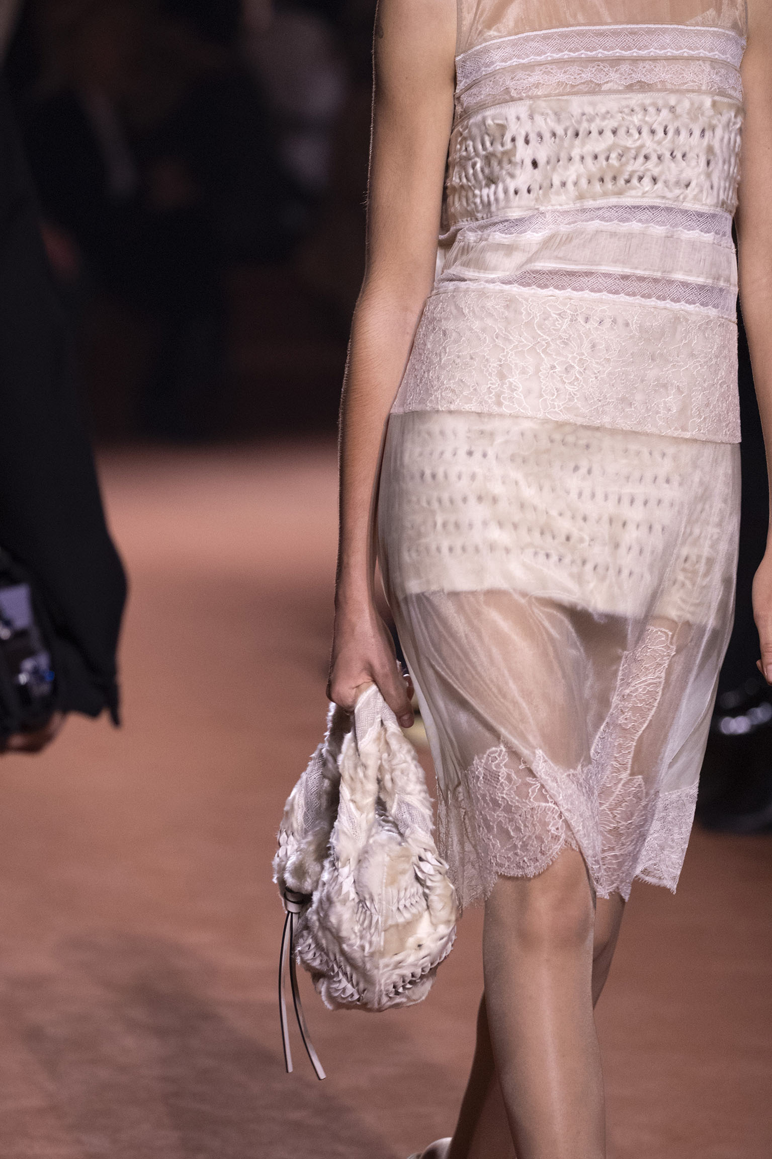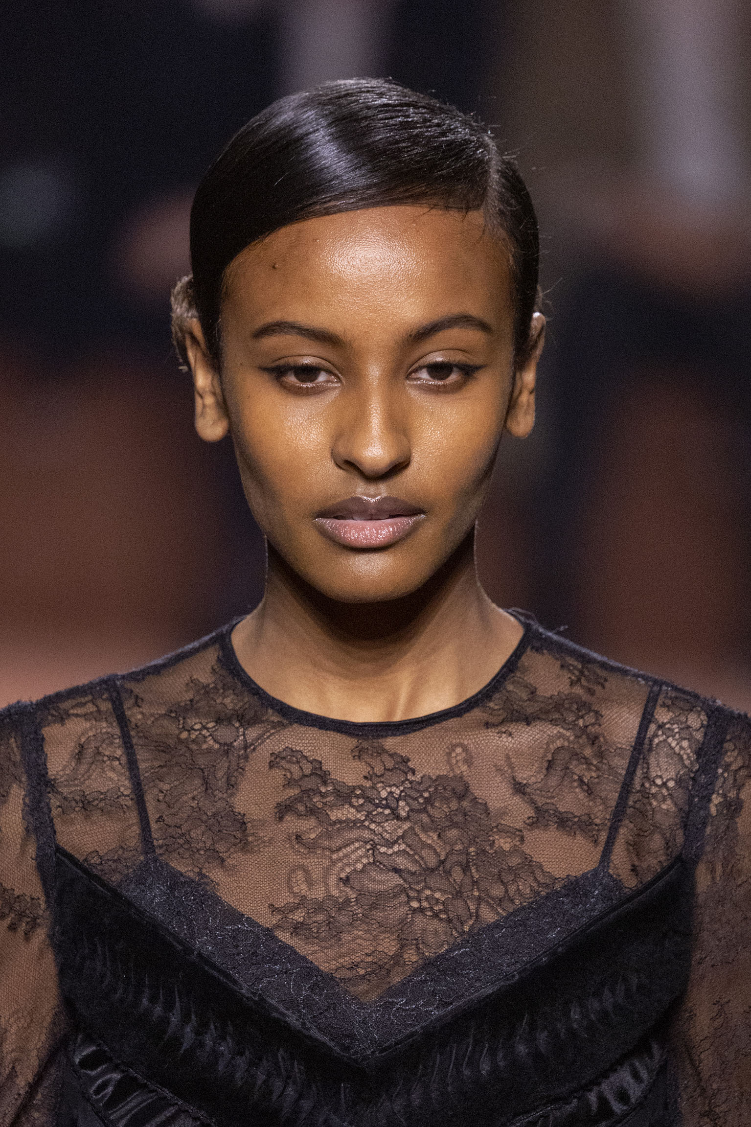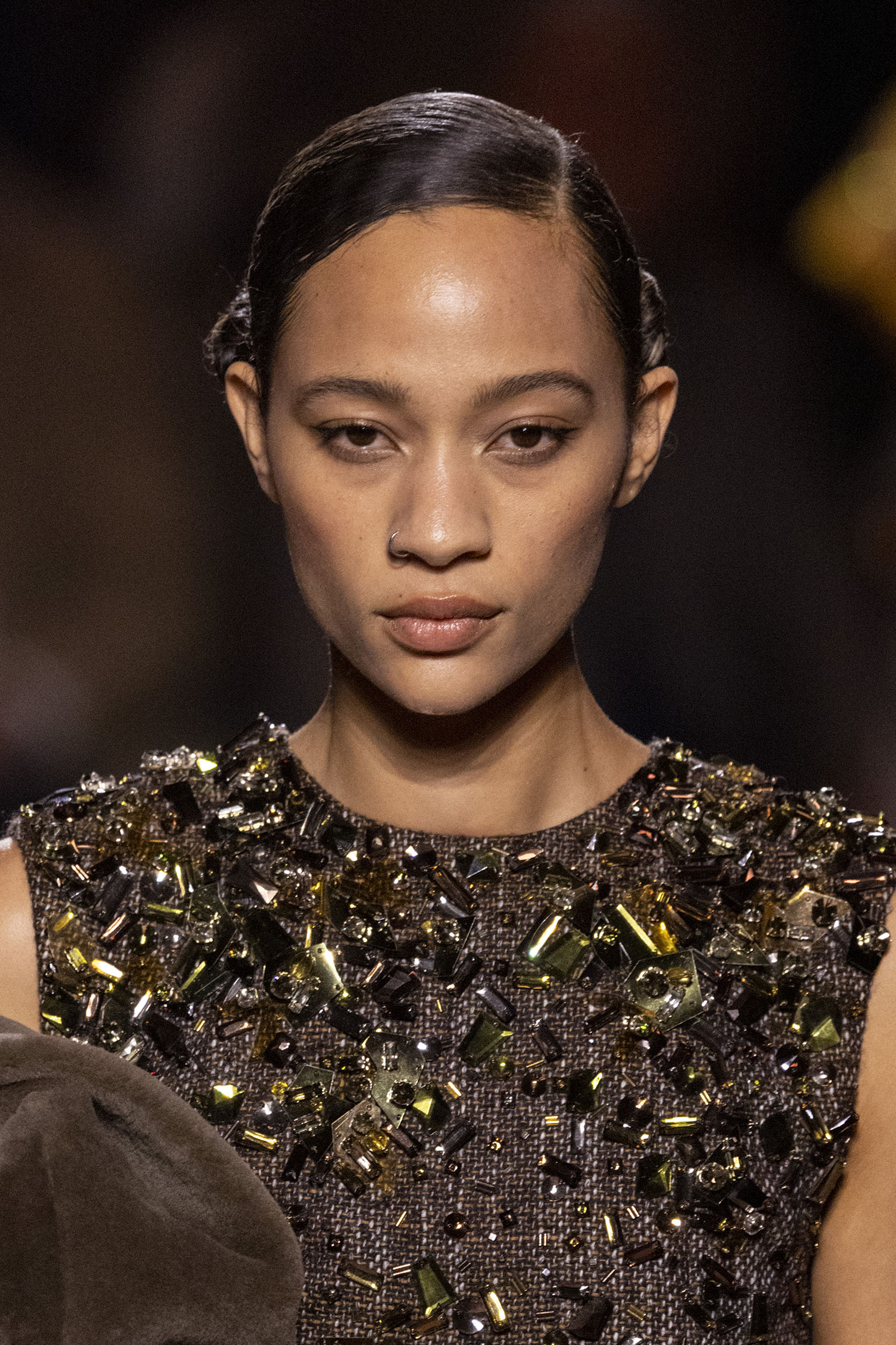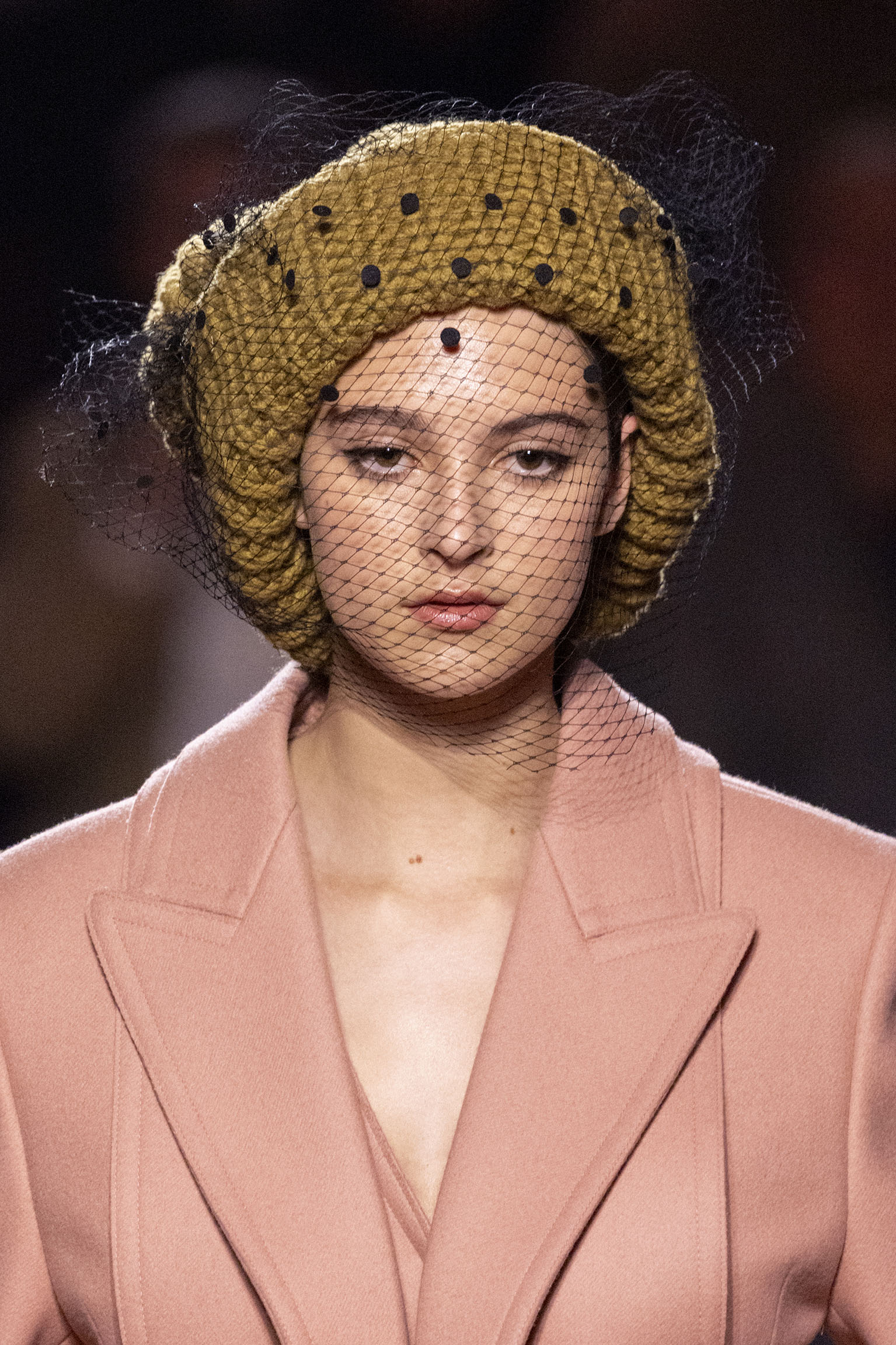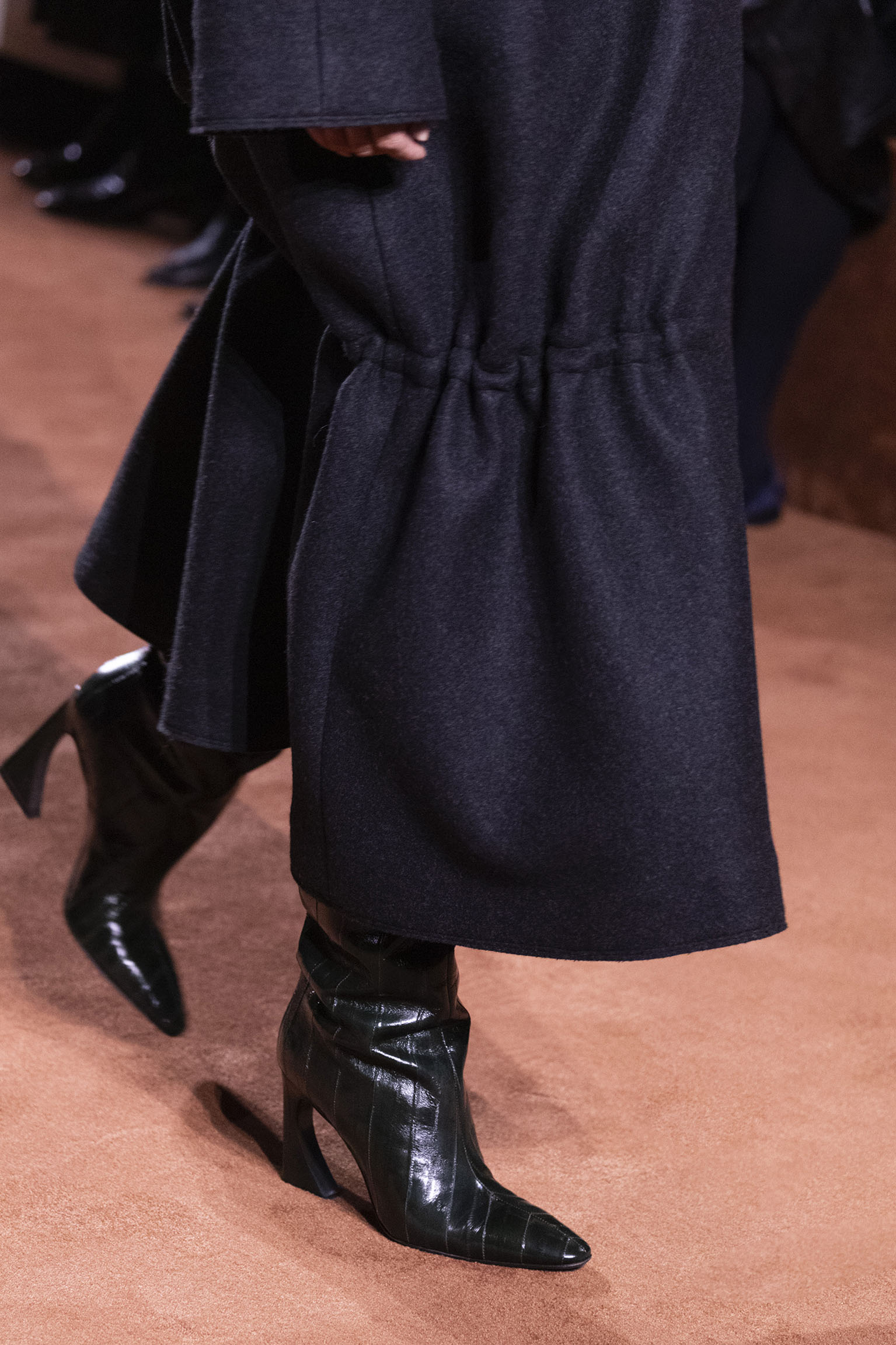 La dimension sensorielle de la collection s’exprime aussi à travers l’harmonie des contrastes – le jeu subtil entre mat et brillant, entre textures rugueuses et soyeuses, qui confère à chaque pièce une profondeur presque théâtrale. Ainsi, des robes en plissé marbré se dissolvent dans des volants de corolle, tandis que des vestes en cuir se parent d’intarsias géométriques qui évoquent l’Op-Art, transformant le vêtement en œuvre d’art. L’ambition est de proposer une mode qui ne se contente pas de vêtir, mais qui raconte une histoire, celle d’une Maison qui a su traverser les époques sans jamais perdre son âme, tout en se réinventant sans cesse au gré des influences contemporaines.