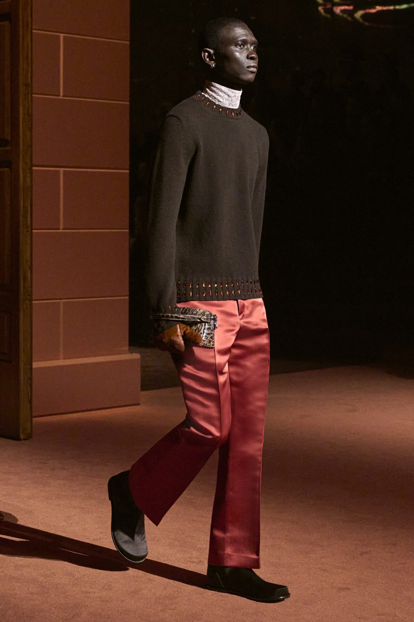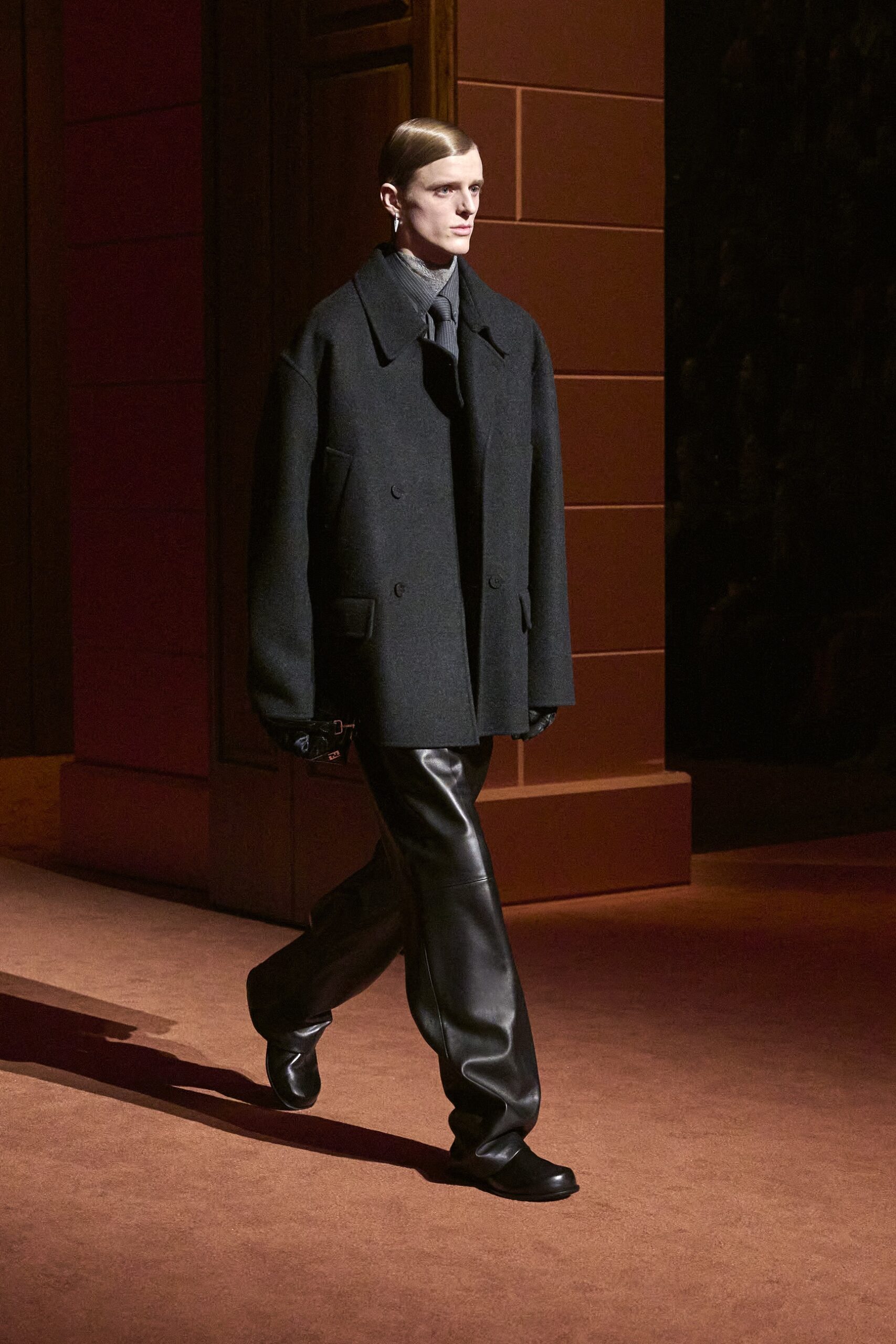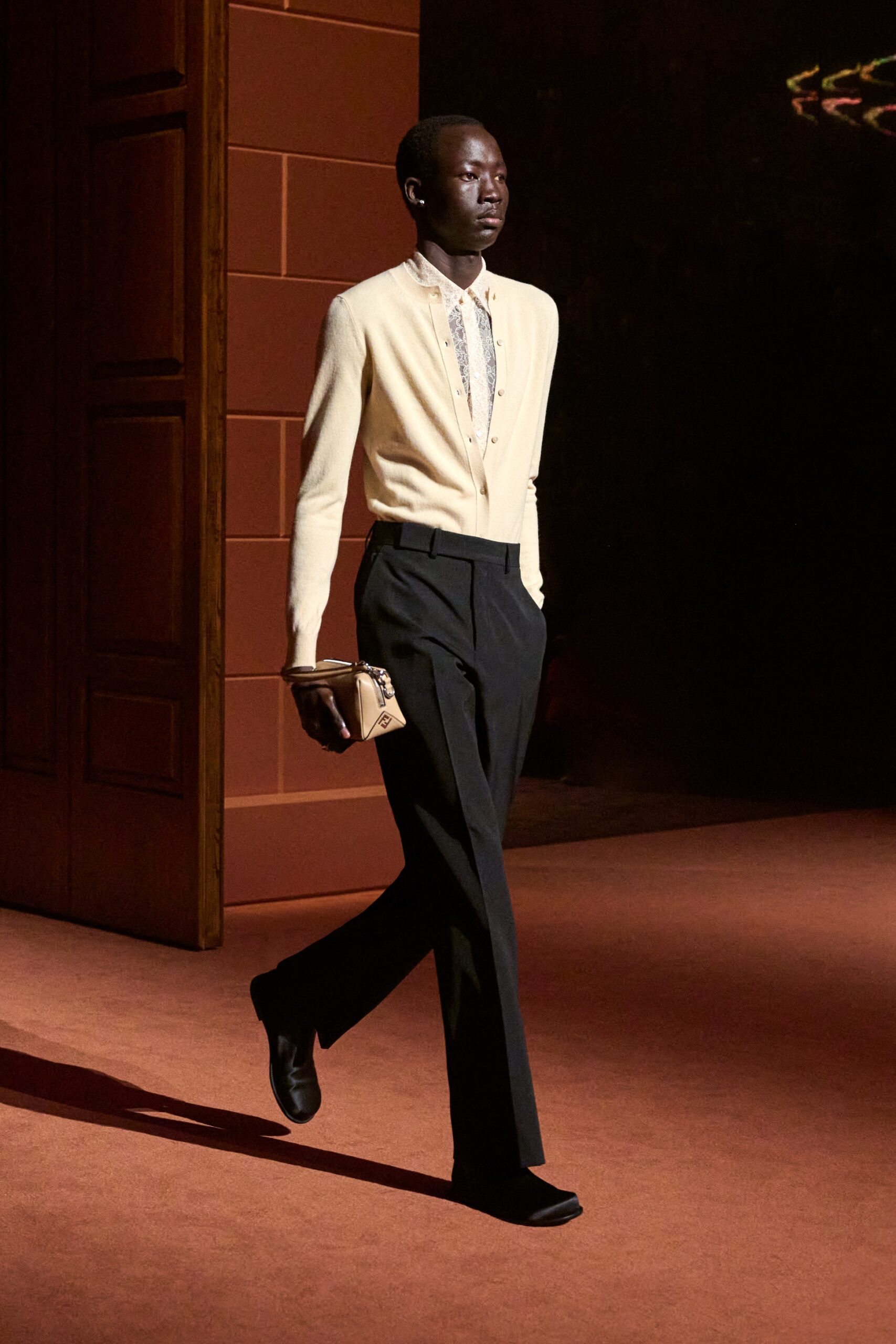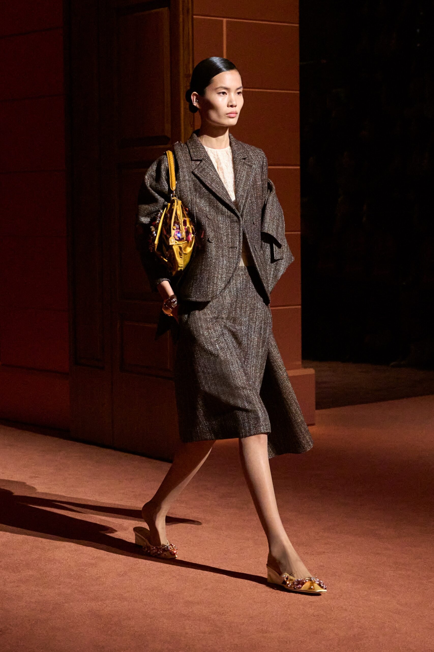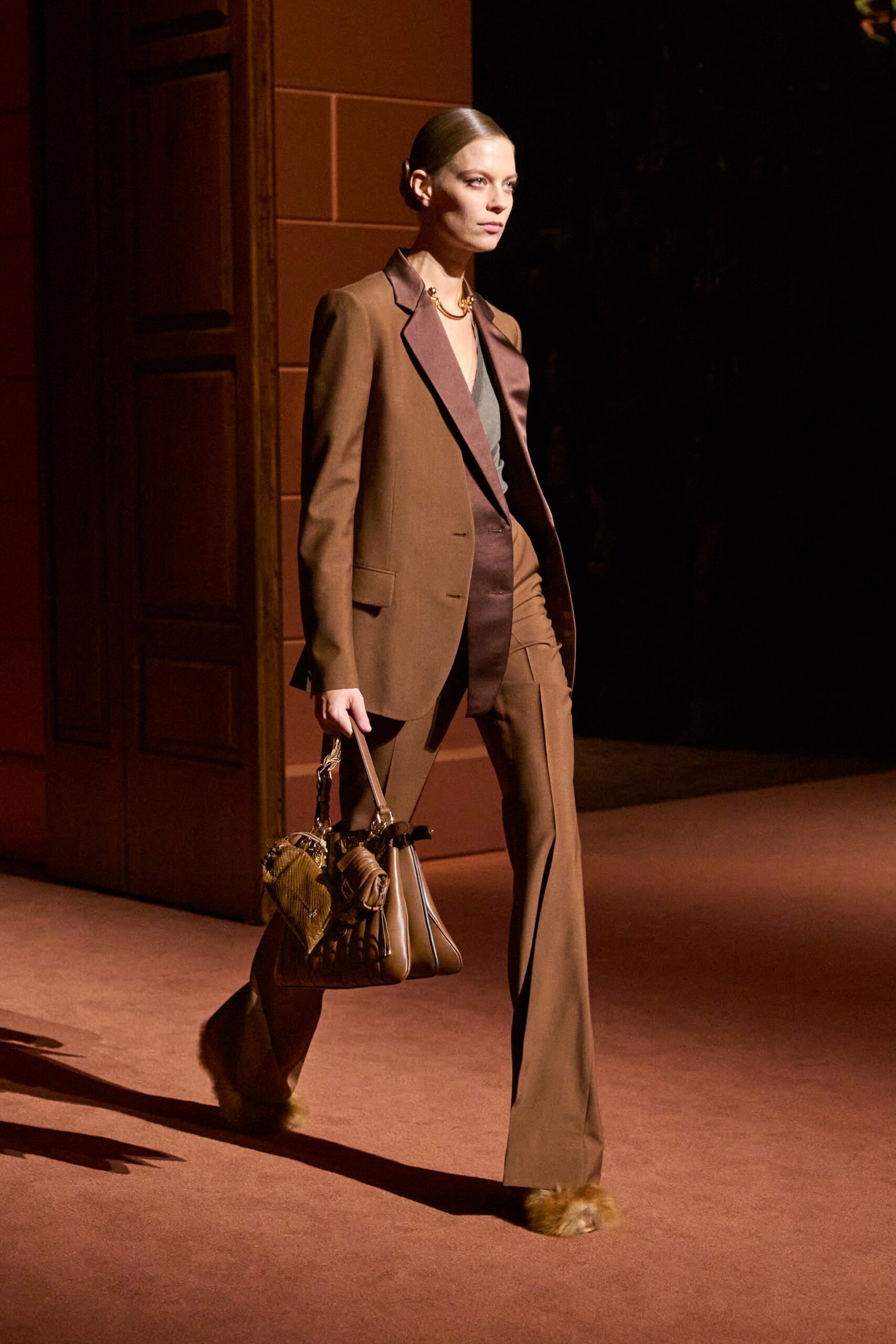 Les jeux de volume et de forme se métamorphosent en une véritable déclaration d’intemporalité et de modernité. Les coupes, à la fois structurées et fluides, invitent à une redéfinition du silhouette traditionnelle. Un manteau retravaillé, par exemple, se déploie en une cape majestueuse, tandis que des vestes se parent d’un revers satinés et de finitions de haute précision. À cela s’ajoute la signature Fendi, toujours présente à travers des motifs graphiques qui réinterprètent l’iconographie du passé – le bracelet-sleeve blazer ou encore le trench revisité – et se déclinent dans une palette de couleurs inspirée des nuances d’un Rome au crépuscule. De la douceur d’un champagne effervescent aux teintes plus robustes telles que le graphite ou le chocolat, chaque couleur évoque une facette de la capitale italienne, tantôt mystérieuse, tantôt éclatante, reflétant la complexité et la richesse d’un héritage millénaire.
