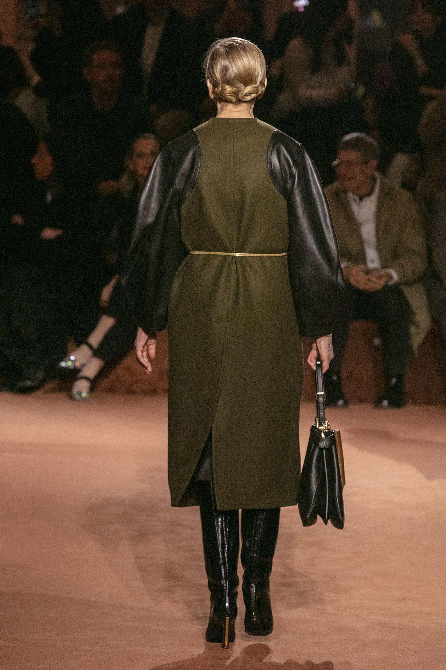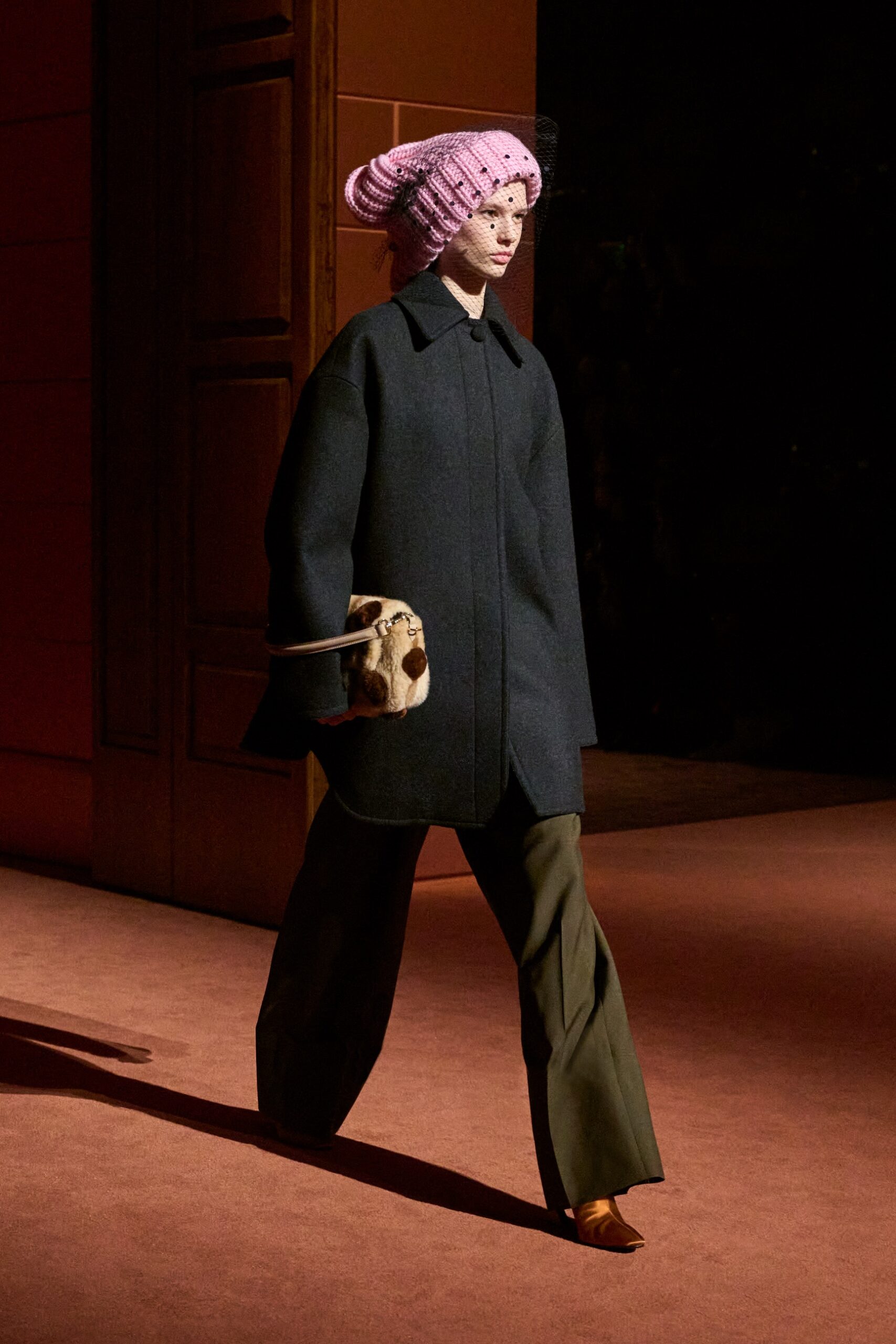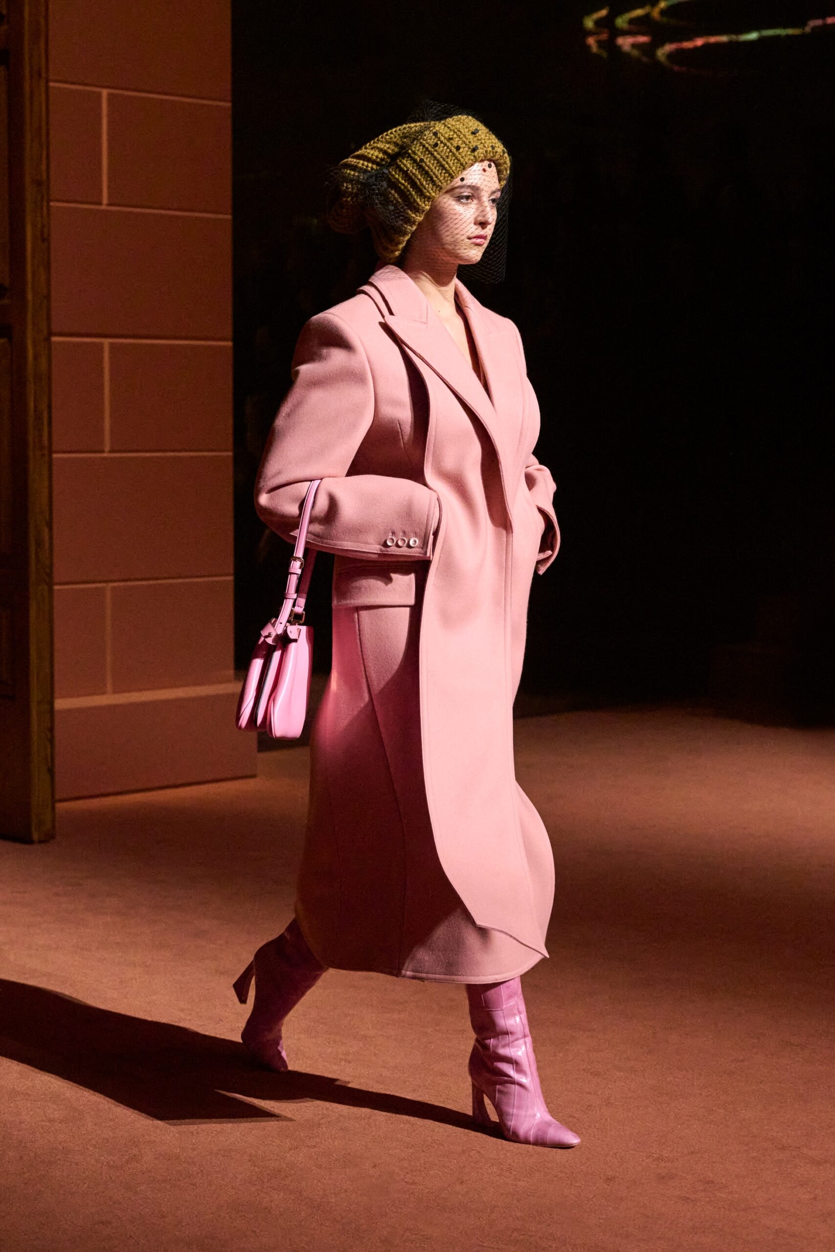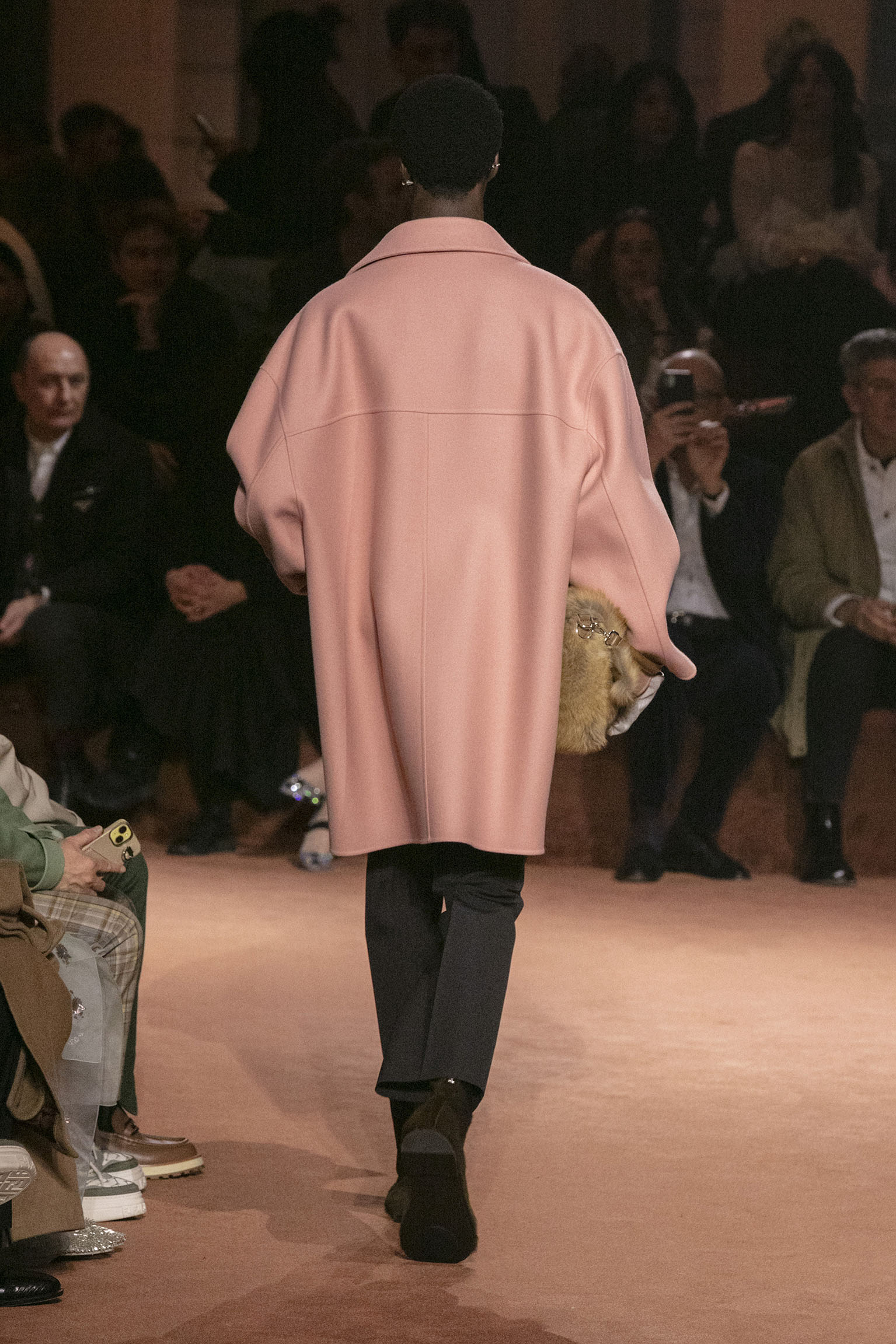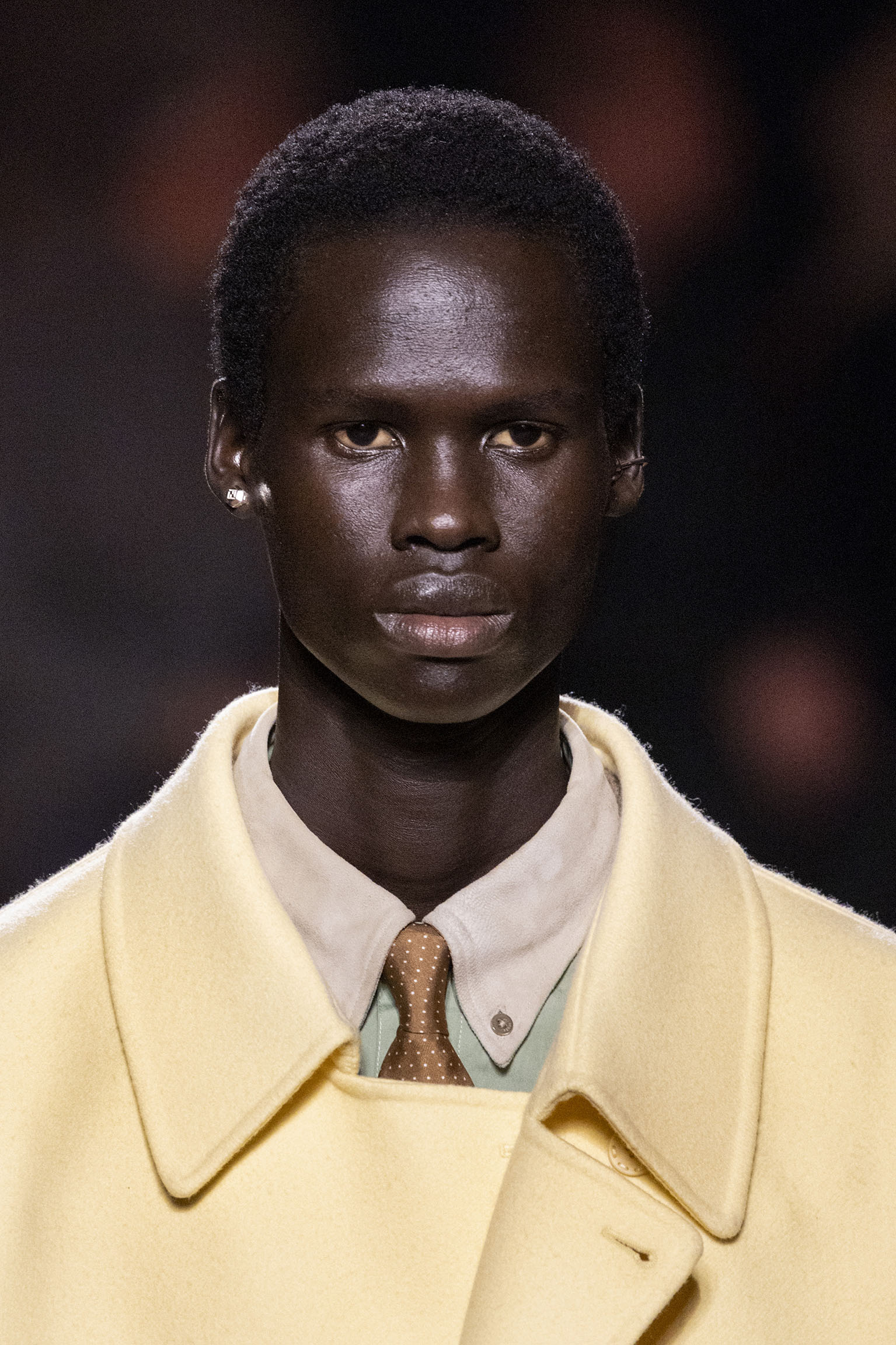 Les jeux de volume et de forme se métamorphosent en une véritable déclaration d’intemporalité et de modernité. Les coupes, à la fois structurées et fluides, invitent à une redéfinition du silhouette traditionnelle. Un manteau retravaillé, par exemple, se déploie en une cape majestueuse, tandis que des vestes se parent d’un revers satinés et de finitions de haute précision. À cela s’ajoute la signature Fendi, toujours présente à travers des motifs graphiques qui réinterprètent l’iconographie du passé – le bracelet-sleeve blazer ou encore le trench revisité – et se déclinent dans une palette de couleurs inspirée des nuances d’un Rome au crépuscule. De la douceur d’un champagne effervescent aux teintes plus robustes telles que le graphite ou le chocolat, chaque couleur évoque une facette de la capitale italienne, tantôt mystérieuse, tantôt éclatante, reflétant la complexité et la richesse d’un héritage millénaire.