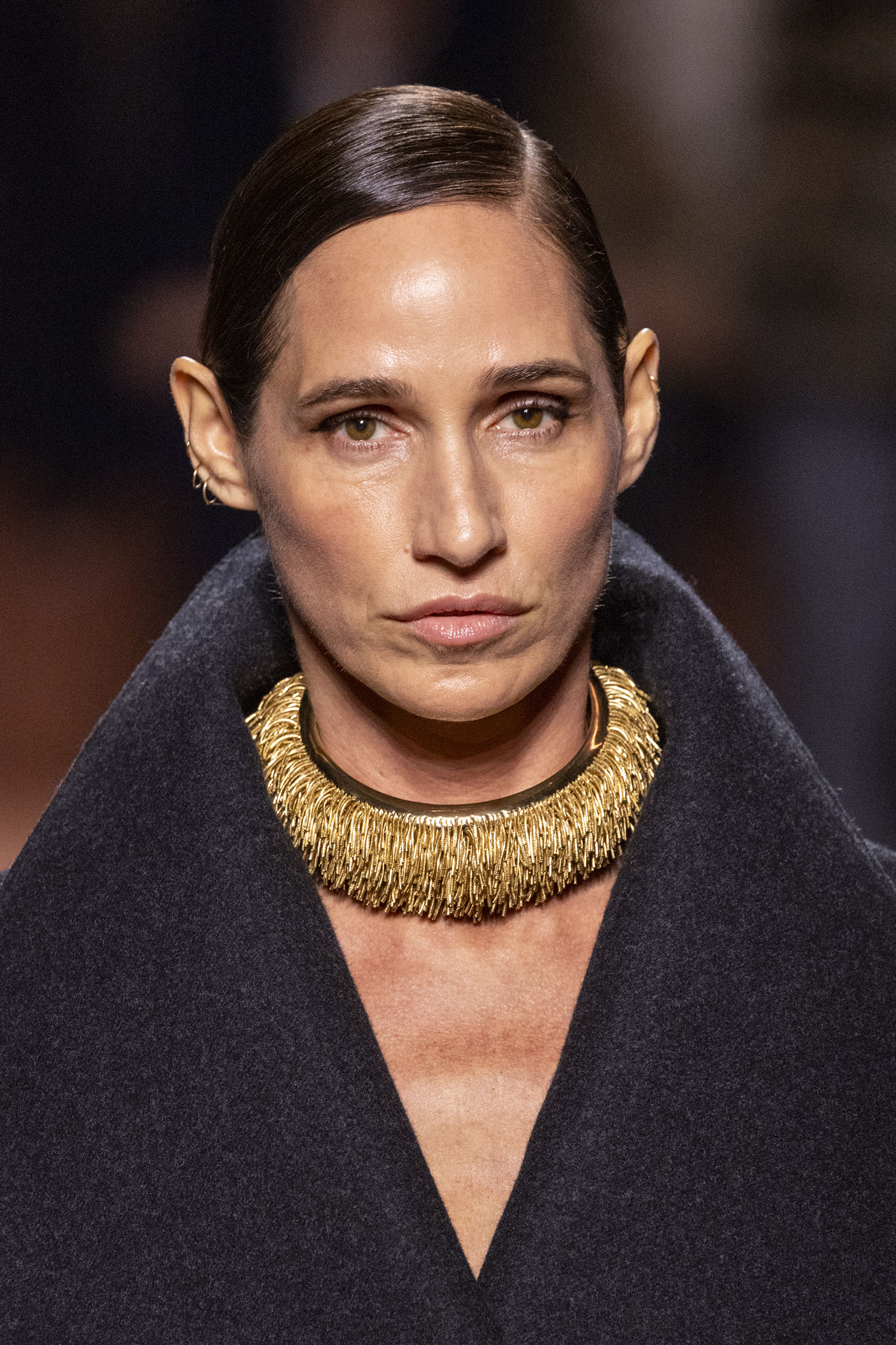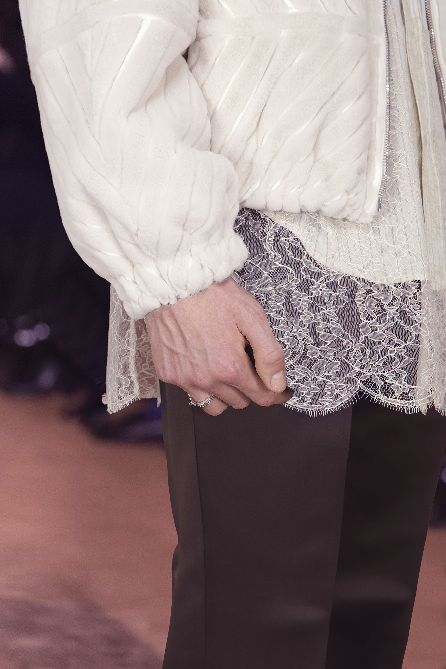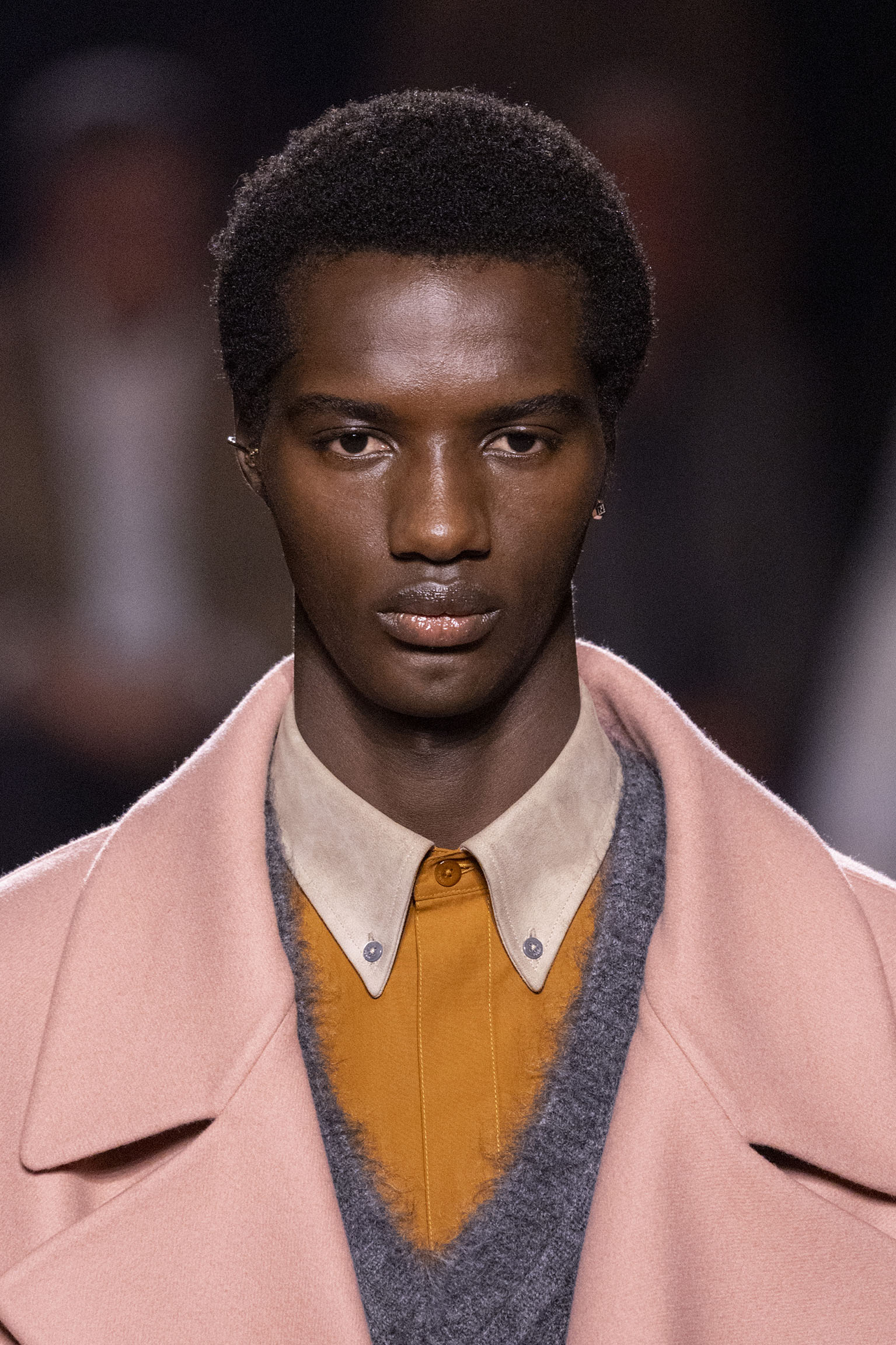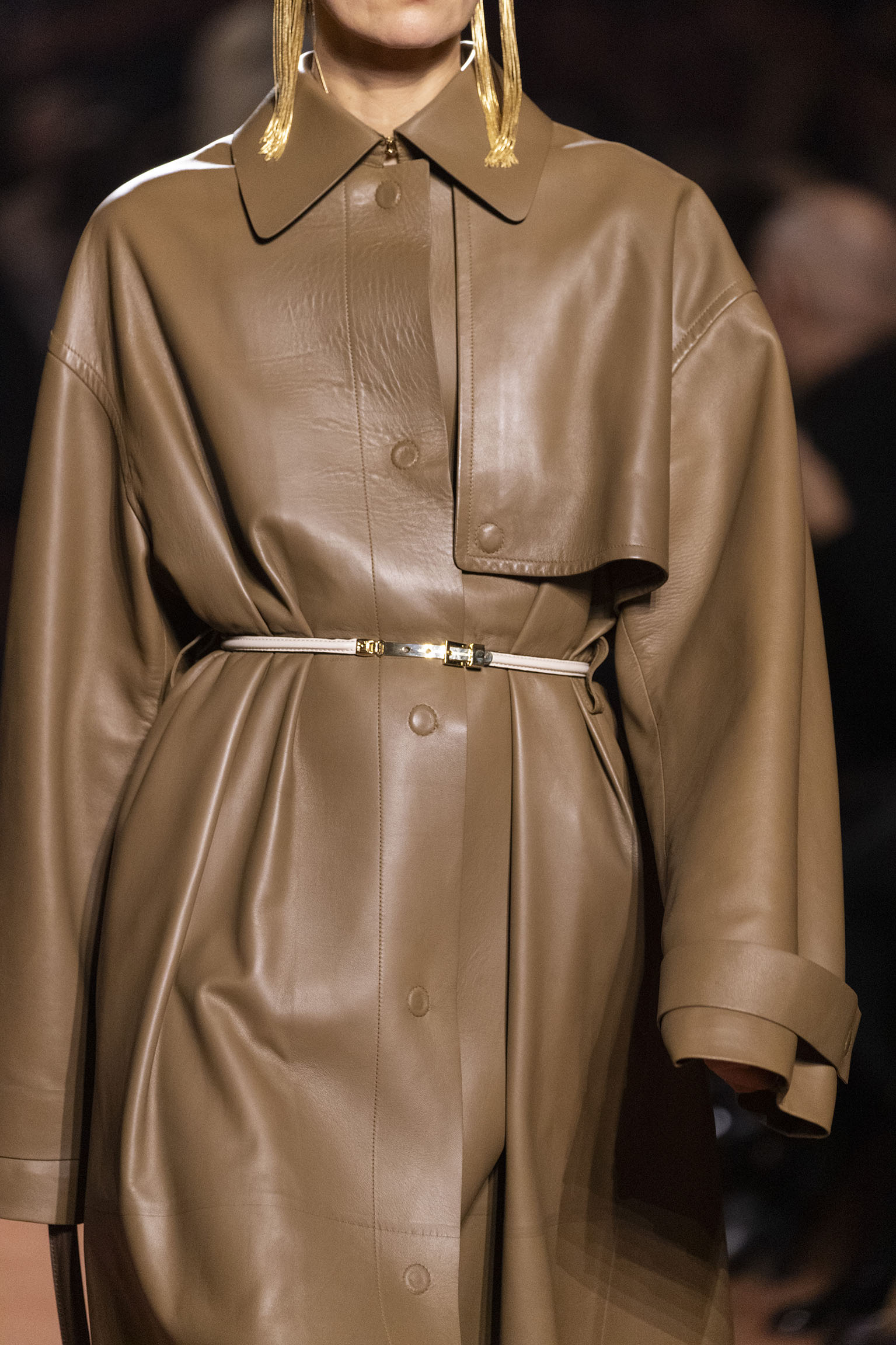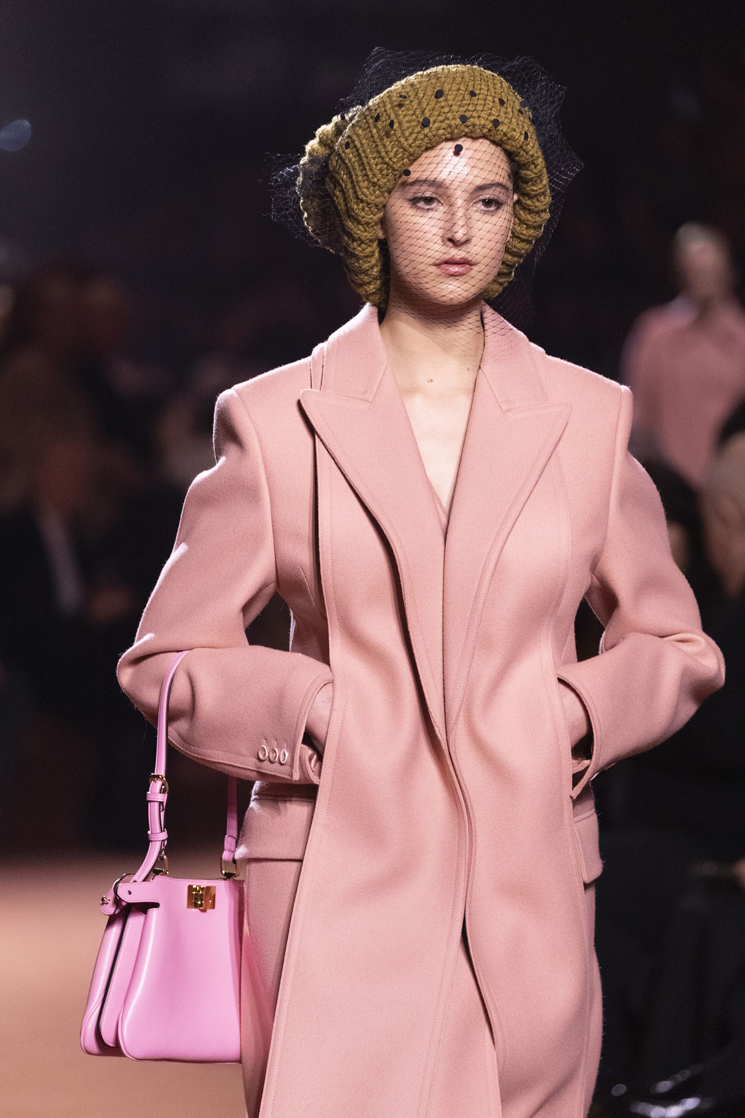 Les jeux de volume et de forme se métamorphosent en une véritable déclaration d’intemporalité et de modernité. Les coupes, à la fois structurées et fluides, invitent à une redéfinition du silhouette traditionnelle. Un manteau retravaillé, par exemple, se déploie en une cape majestueuse, tandis que des vestes se parent d’un revers satinés et de finitions de haute précision. À cela s’ajoute la signature Fendi, toujours présente à travers des motifs graphiques qui réinterprètent l’iconographie du passé – le bracelet-sleeve blazer ou encore le trench revisité – et se déclinent dans une palette de couleurs inspirée des nuances d’un Rome au crépuscule. De la douceur d’un champagne effervescent aux teintes plus robustes telles que le graphite ou le chocolat, chaque couleur évoque une facette de la capitale italienne, tantôt mystérieuse, tantôt éclatante, reflétant la complexité et la richesse d’un héritage millénaire.