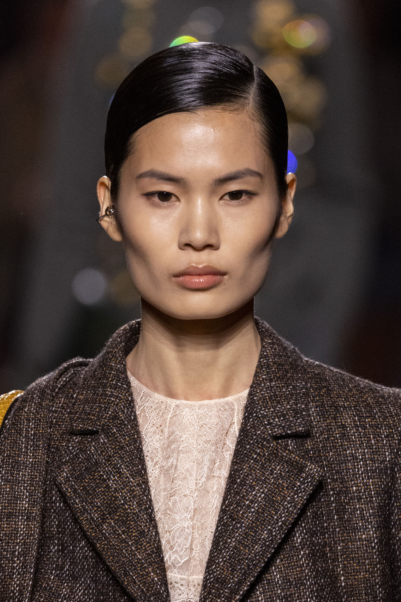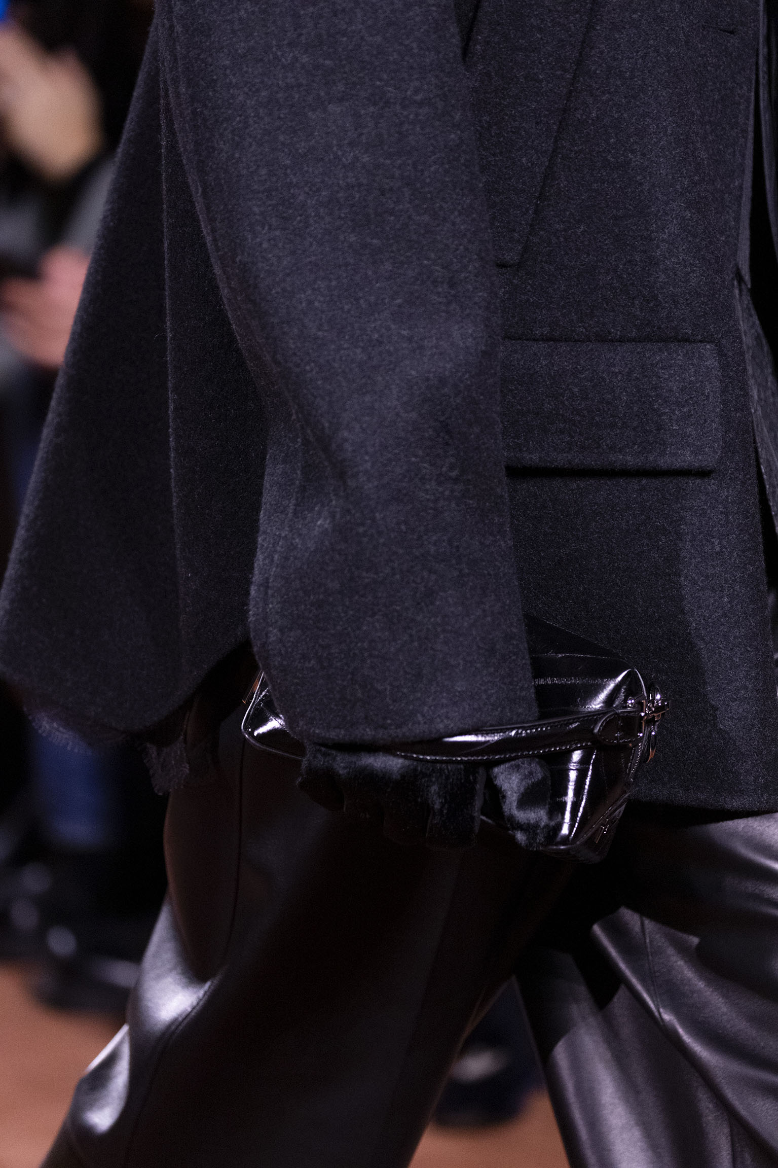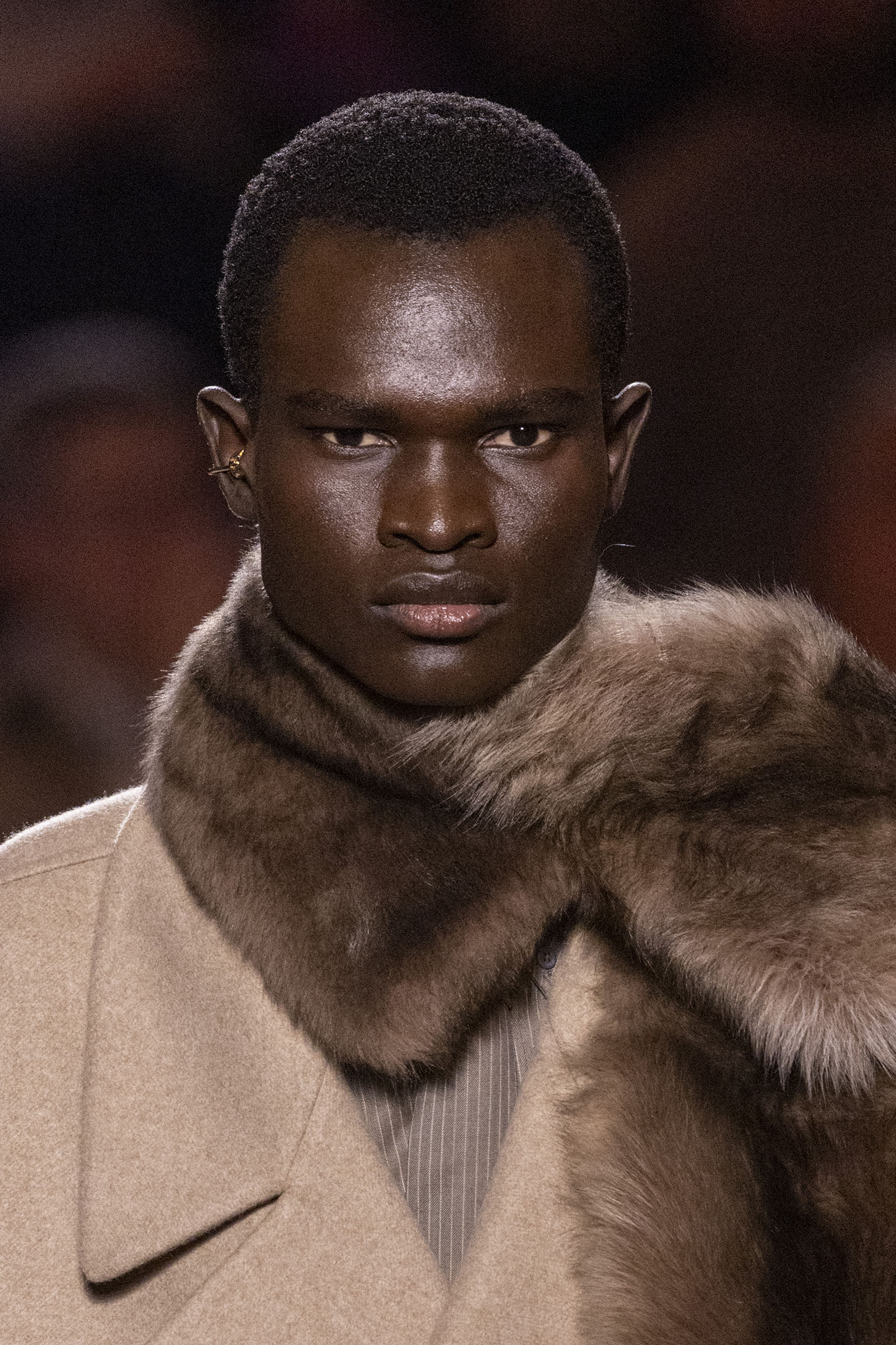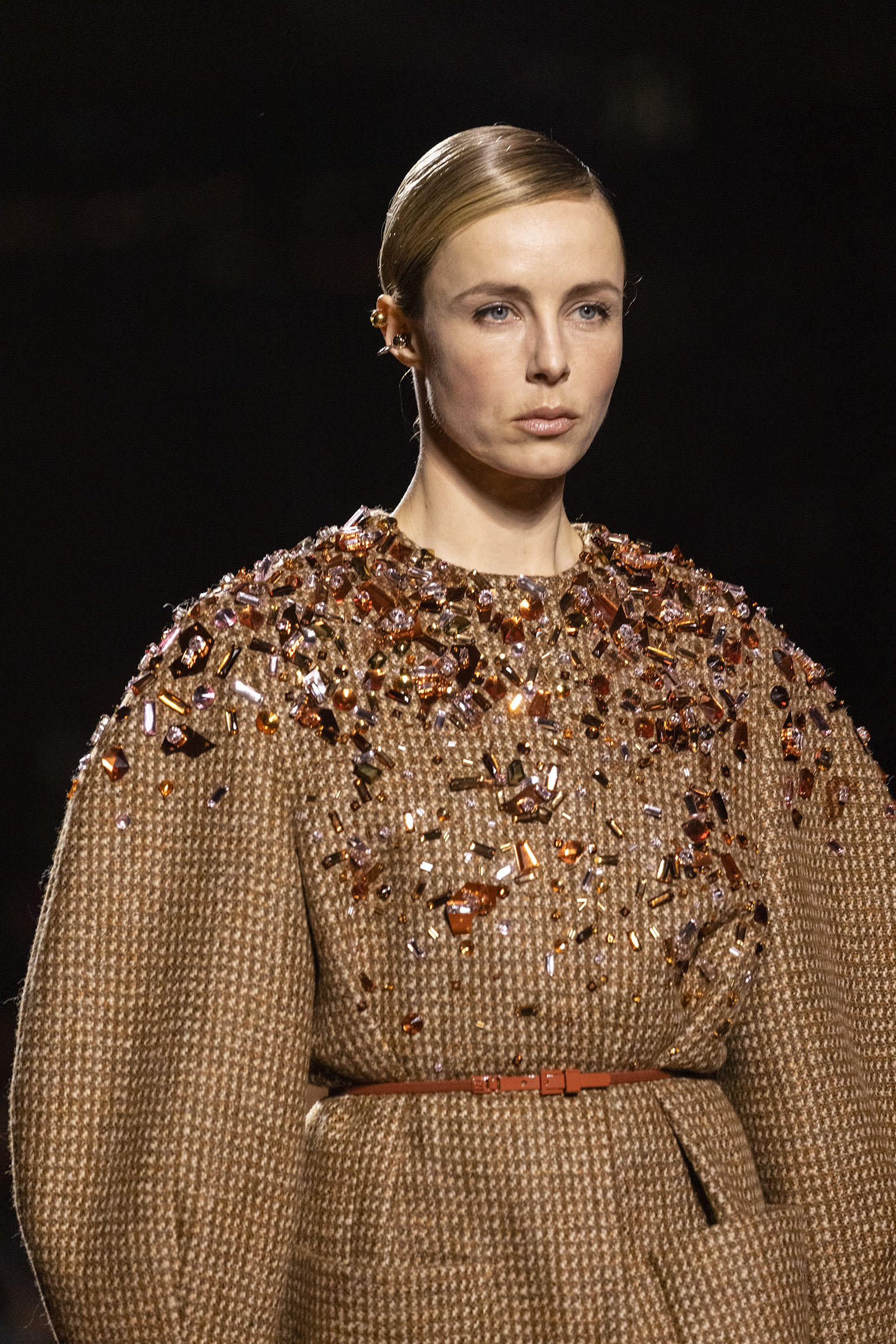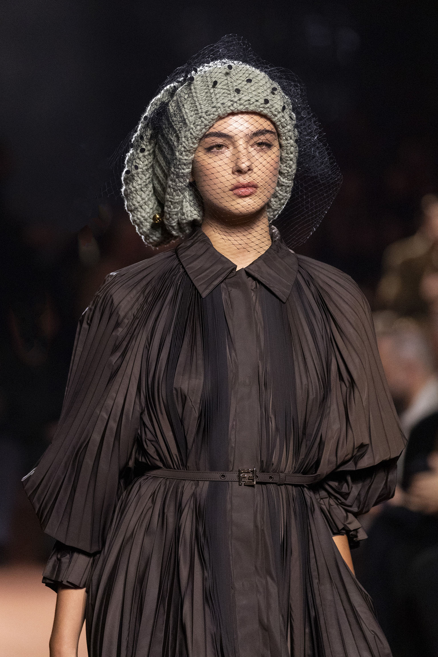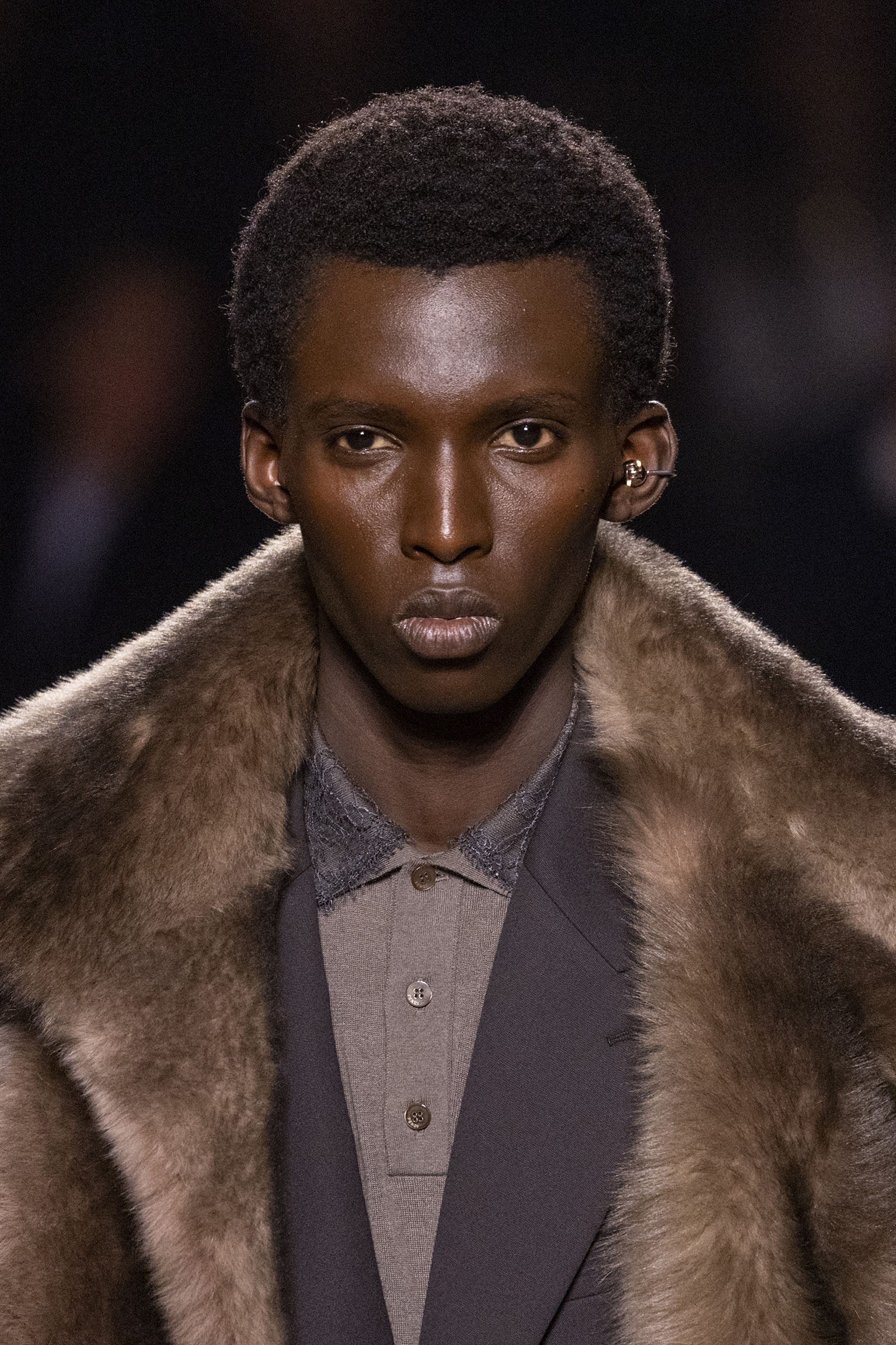 Les jeux de volume et de forme se métamorphosent en une véritable déclaration d’intemporalité et de modernité. Les coupes, à la fois structurées et fluides, invitent à une redéfinition du silhouette traditionnelle. Un manteau retravaillé, par exemple, se déploie en une cape majestueuse, tandis que des vestes se parent d’un revers satinés et de finitions de haute précision. À cela s’ajoute la signature Fendi, toujours présente à travers des motifs graphiques qui réinterprètent l’iconographie du passé – le bracelet-sleeve blazer ou encore le trench revisité – et se déclinent dans une palette de couleurs inspirée des nuances d’un Rome au crépuscule. De la douceur d’un champagne effervescent aux teintes plus robustes telles que le graphite ou le chocolat, chaque couleur évoque une facette de la capitale italienne, tantôt mystérieuse, tantôt éclatante, reflétant la complexité et la richesse d’un héritage millénaire.