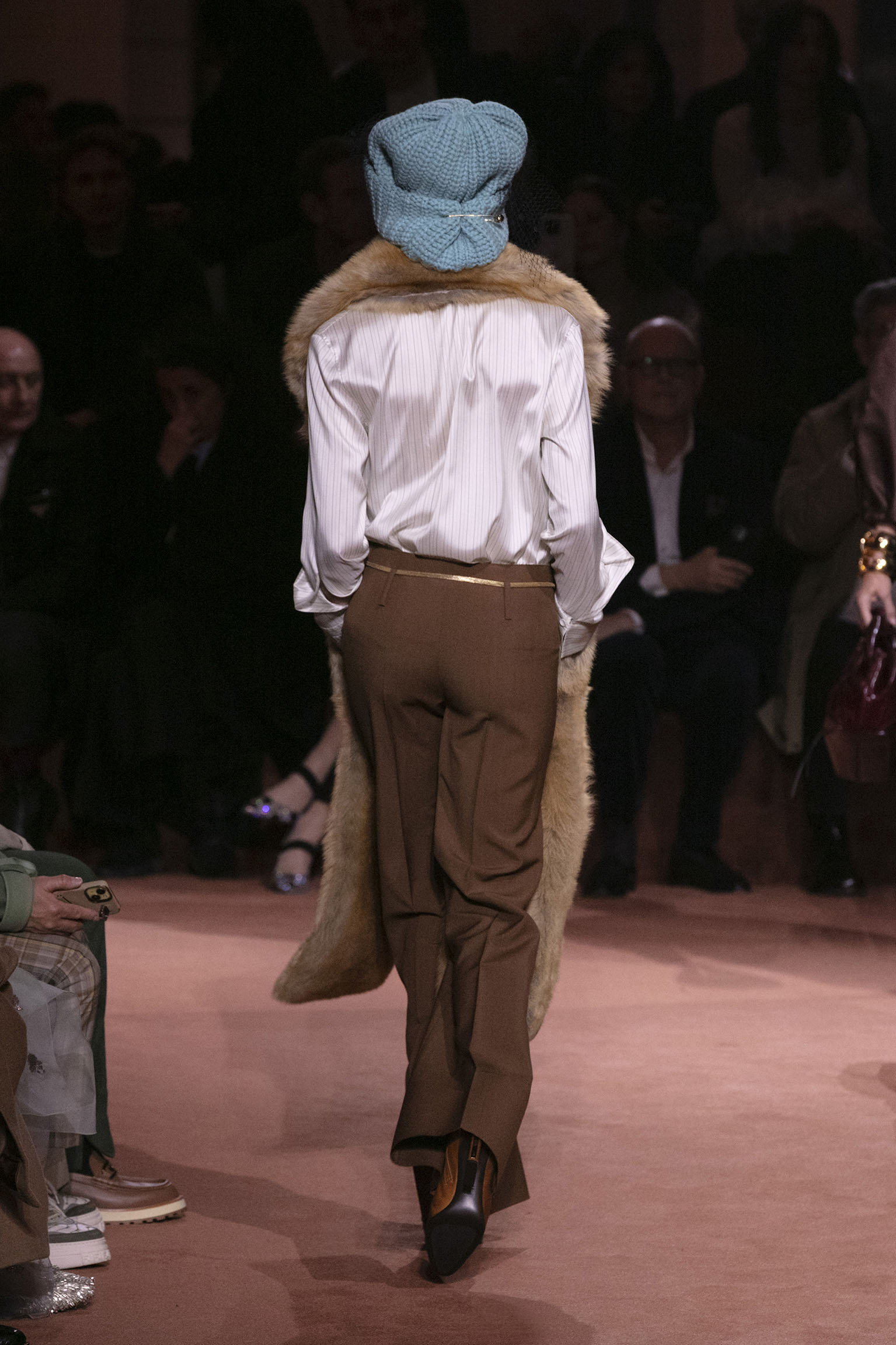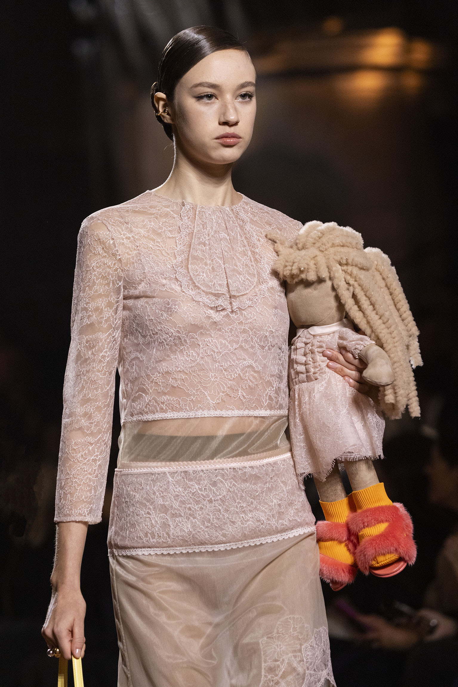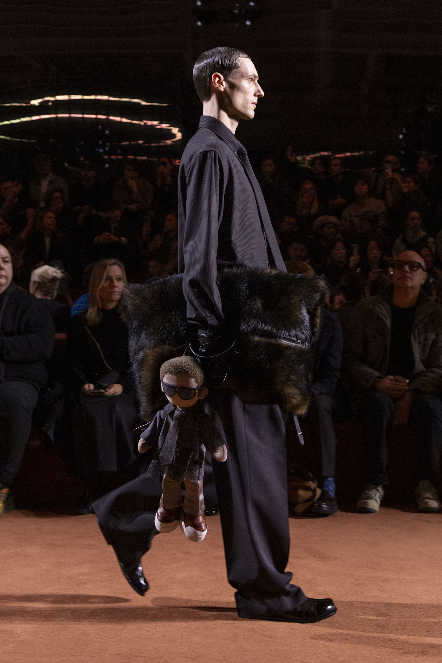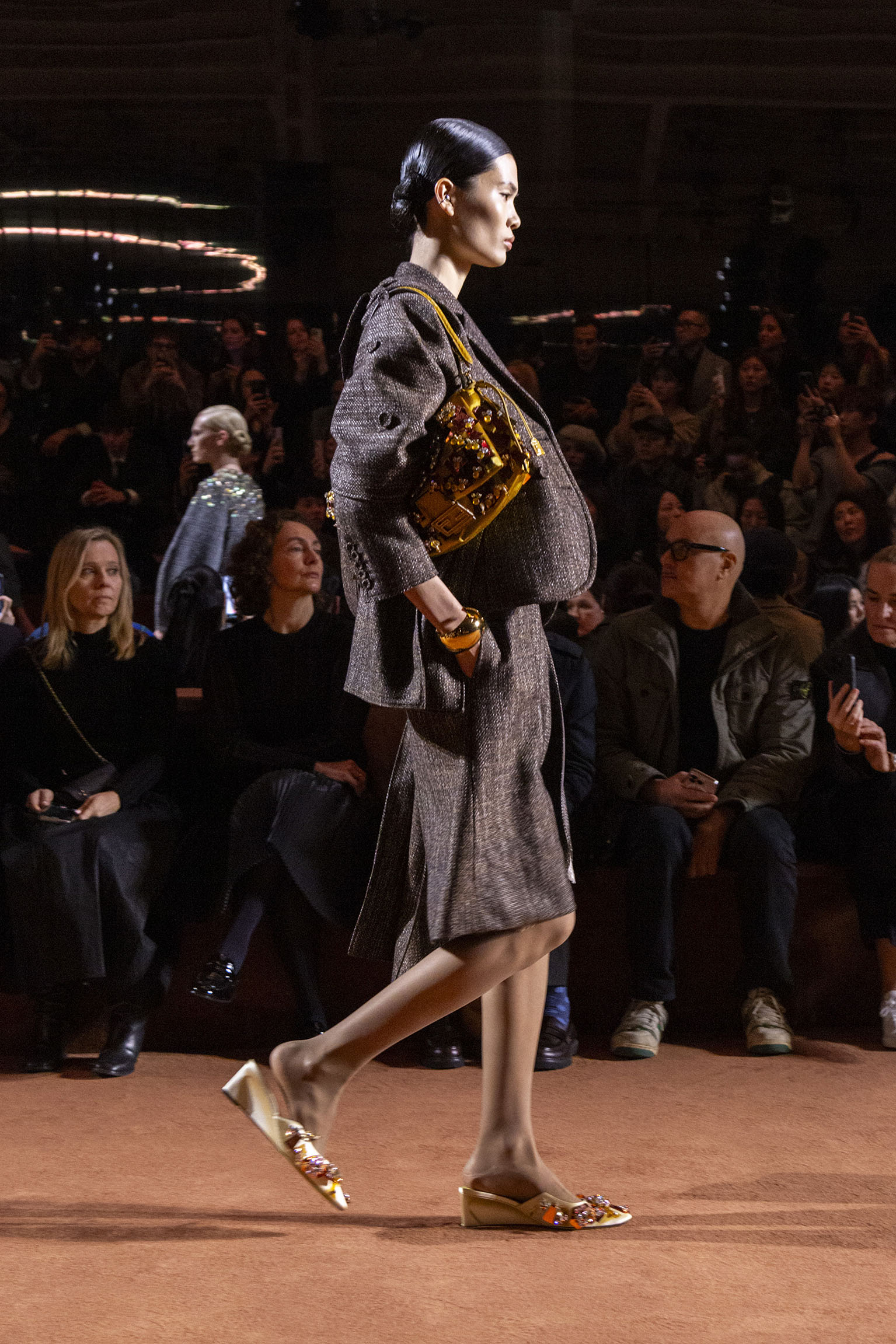 L’art du storytelling se conjugue avec la virtuosité des performances scéniques, dès l’ouverture du spectacle. Dardo et Tazio, les jumeaux de 7 ans issus de l’union entre Delfina Delettrez Fendi et Nico Vascellari, incarnent à la fois la continuité et la fraîcheur du leg Fendi. Par leur gestuelle, ils ouvrent les portes d’un univers où l’héritage familial se fait écho à une créativité sans limites. Vêtus de répliques d’un ensemble équestre porté jadis par une jeune Silvia Venturini Fendi, ces jeunes icônes rappellent que l’essence de la Maison se transmet au fil des générations, sans jamais se démoder.
