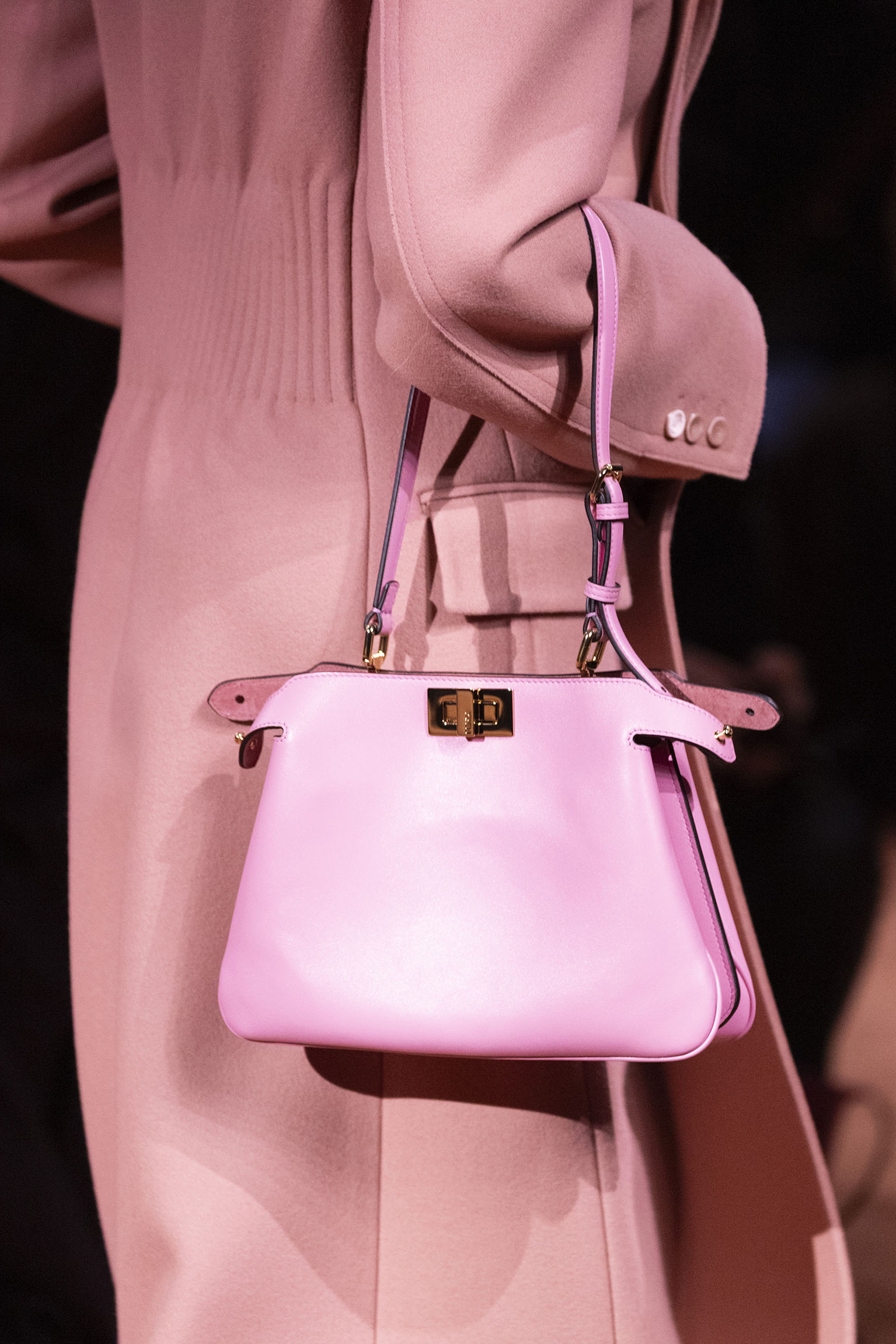 La créativité opère également sur les accessoires, véritable prolongement de l’excellence artisanale et de l’esprit innovant de Fendi. Le nouveau Fendi Giano, par exemple, se présente comme une merveille moderniste : un sac en forme de lune, capable de se transformer d’un clutch discret en une pièce d’épaule sophistiquée, orné du fameux écusson Fendi et d’un portrait symbolique rappelant la dualité du temps. La réinvention du Fendi Spy Bag, avec ses poignées torsadées en shearling et ses tons sorbet, témoigne quant à elle d’une volonté de conjuguer tradition et audace dans des créations qui transcendent les modes passagères. D’autres modèles, comme le Fendi Mamma Baguette ou le Fendi Peekaboo Soft, se démarquent par leur design épuré et leur sophistication tactile, réaffirmant la maîtrise technique des ateliers Fendi qui, depuis un siècle, savent allier innovation et respect des matériaux nobles.