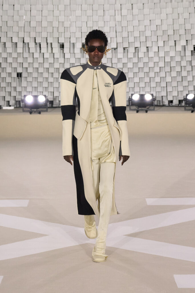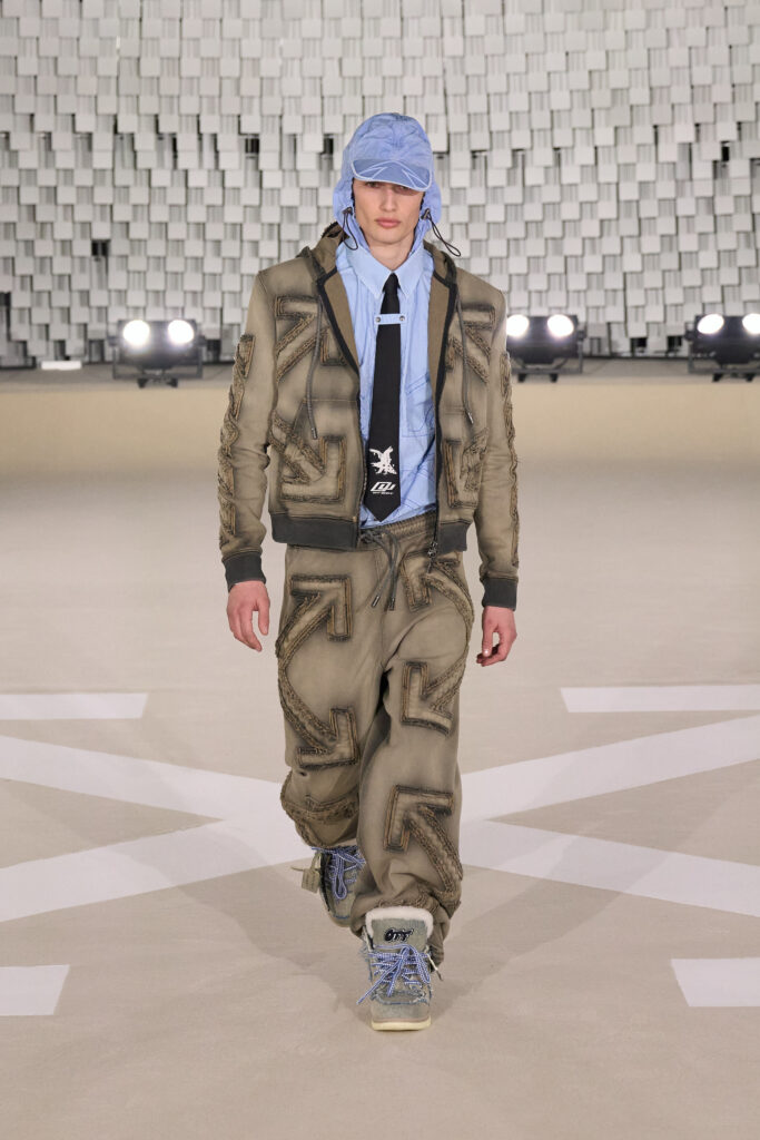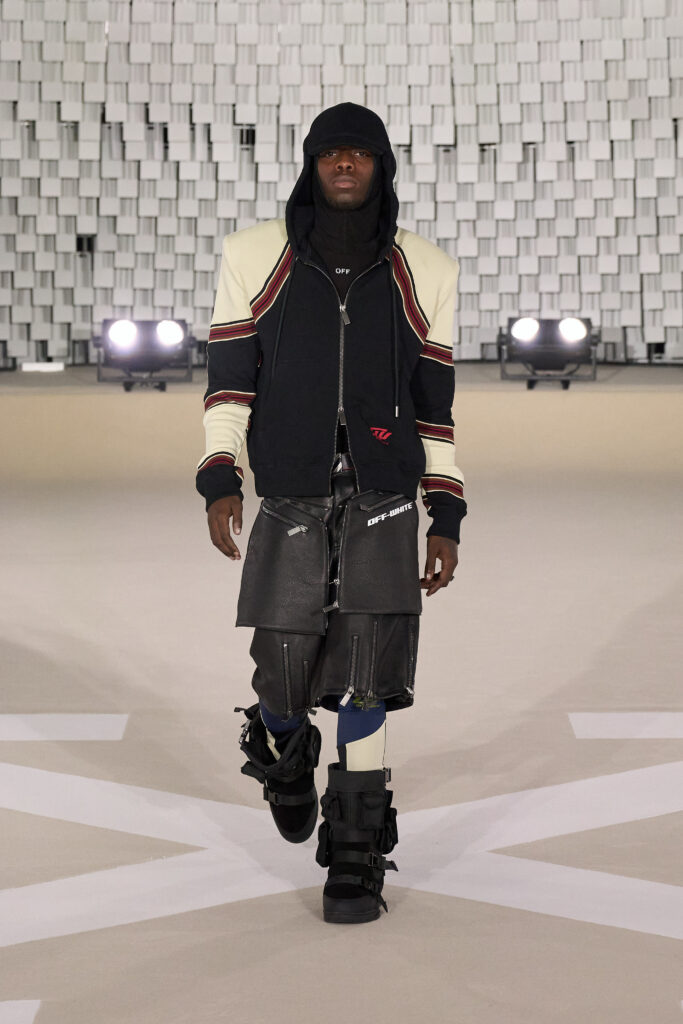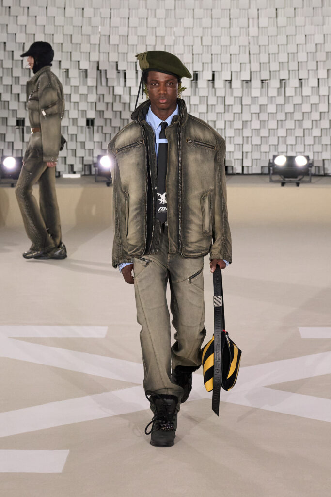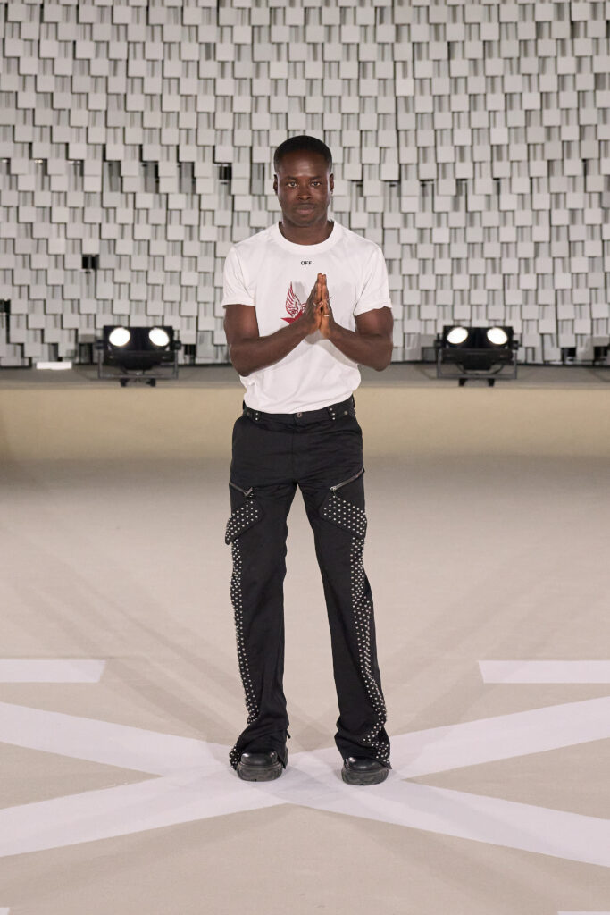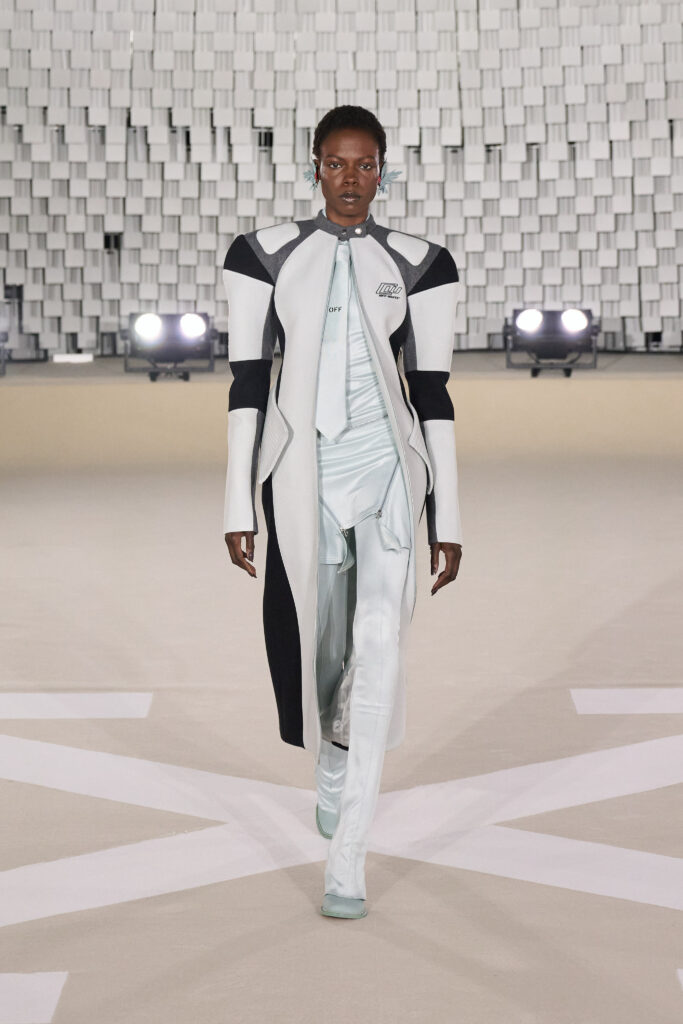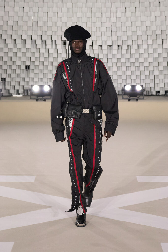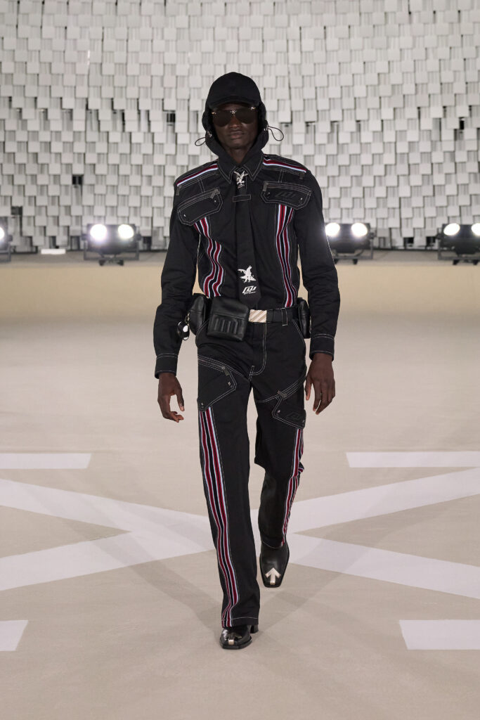 Kamara définit Off-White™ comme une société d’individus divers, unis par une quête authentique d’expression personnelle, soulignant ainsi l’importance d’une communauté inclusive et résistante. Chaque pièce de la collection exprime ce message, évoquant à la fois l’uniformité apparente des tenues professionnelles et sportives, et la singularité puissante de chaque individu qui les porte.