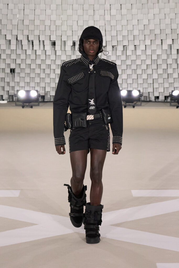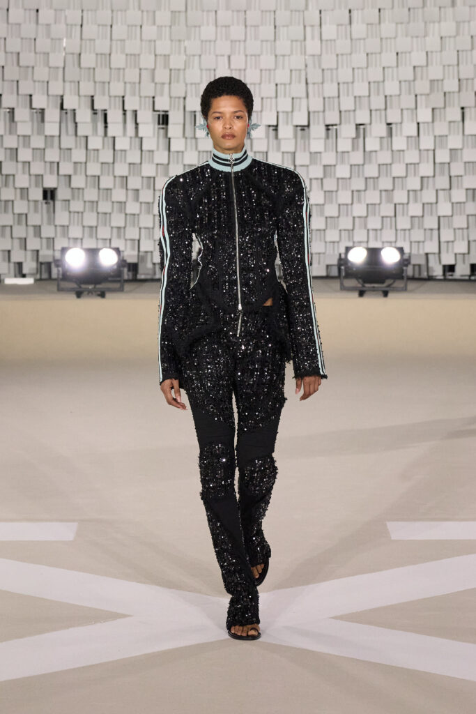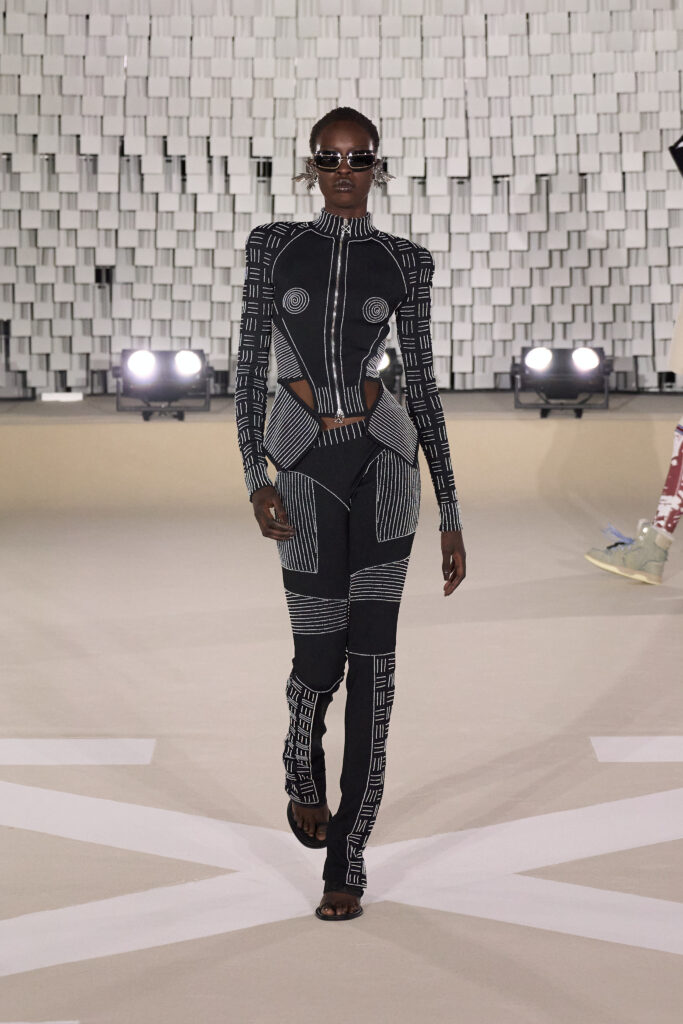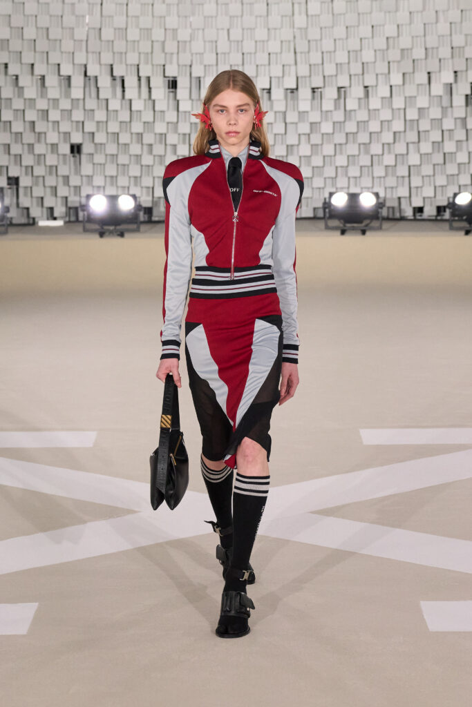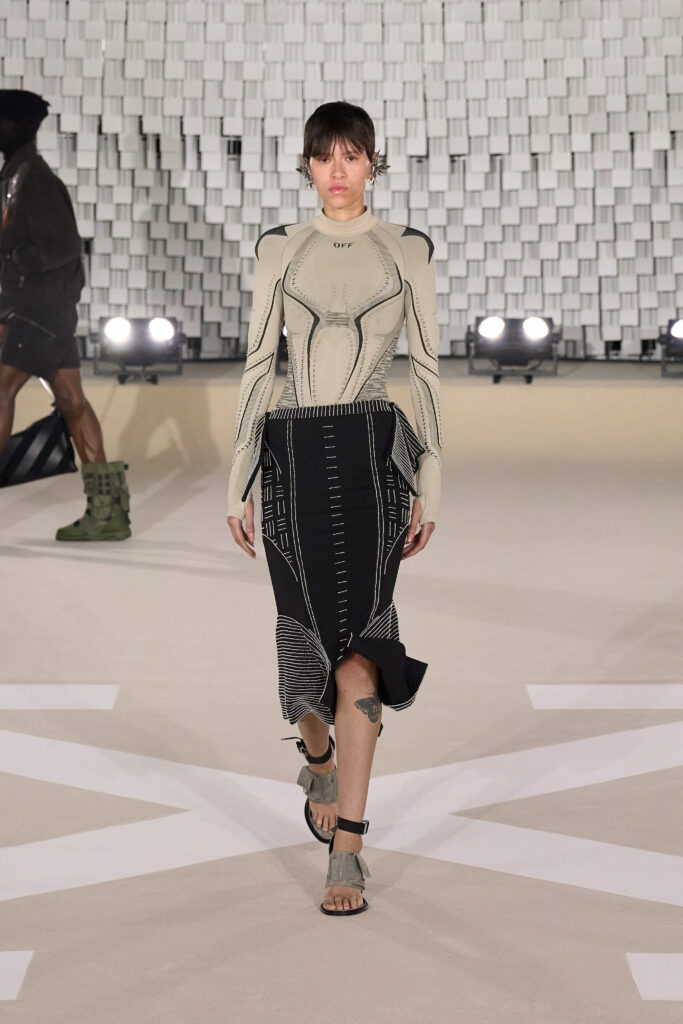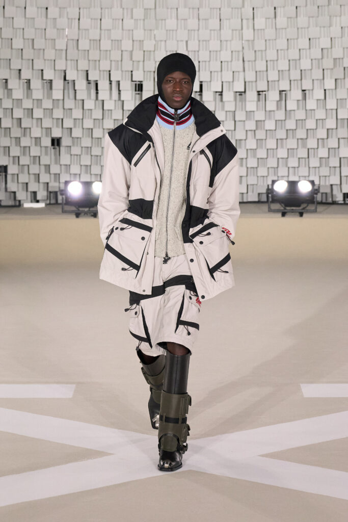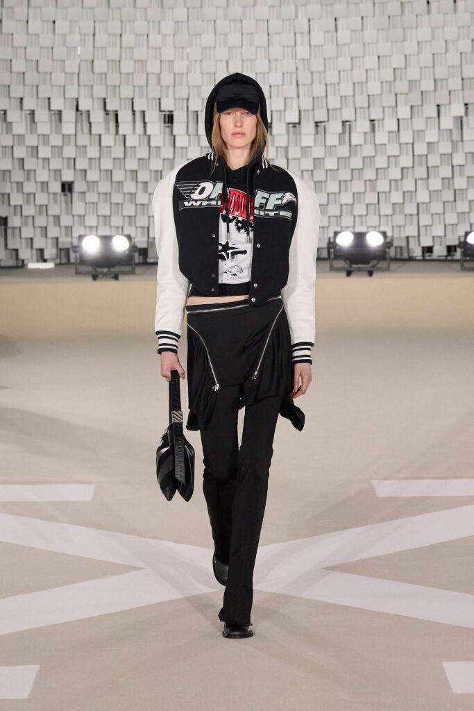 Kamara définit Off-White™ comme une société d’individus divers, unis par une quête authentique d’expression personnelle, soulignant ainsi l’importance d’une communauté inclusive et résistante. Chaque pièce de la collection exprime ce message, évoquant à la fois l’uniformité apparente des tenues professionnelles et sportives, et la singularité puissante de chaque individu qui les porte.