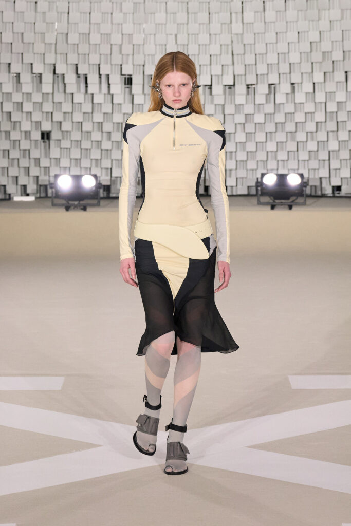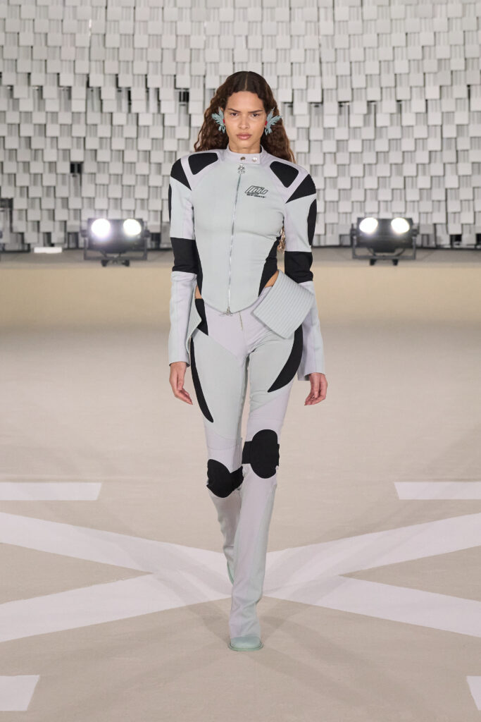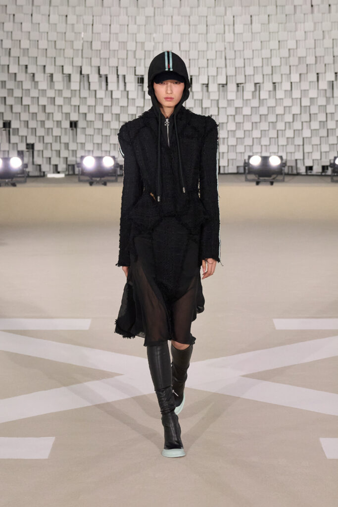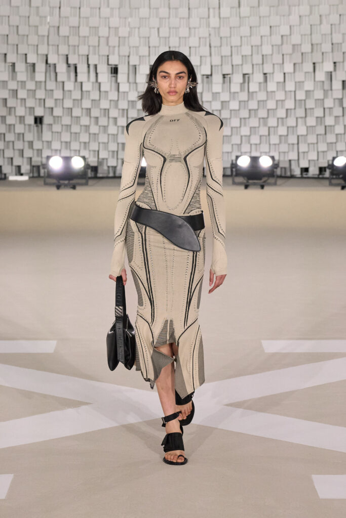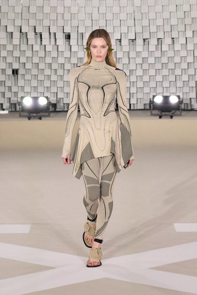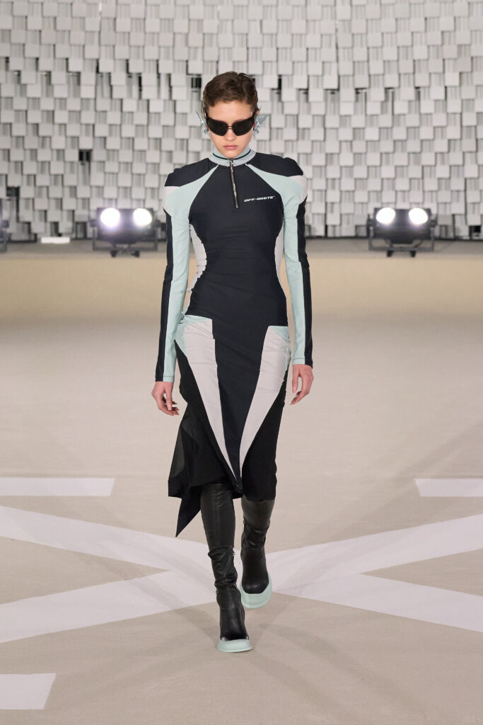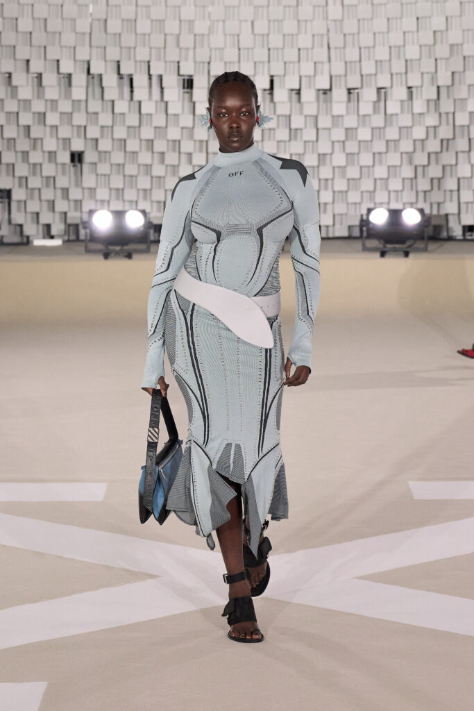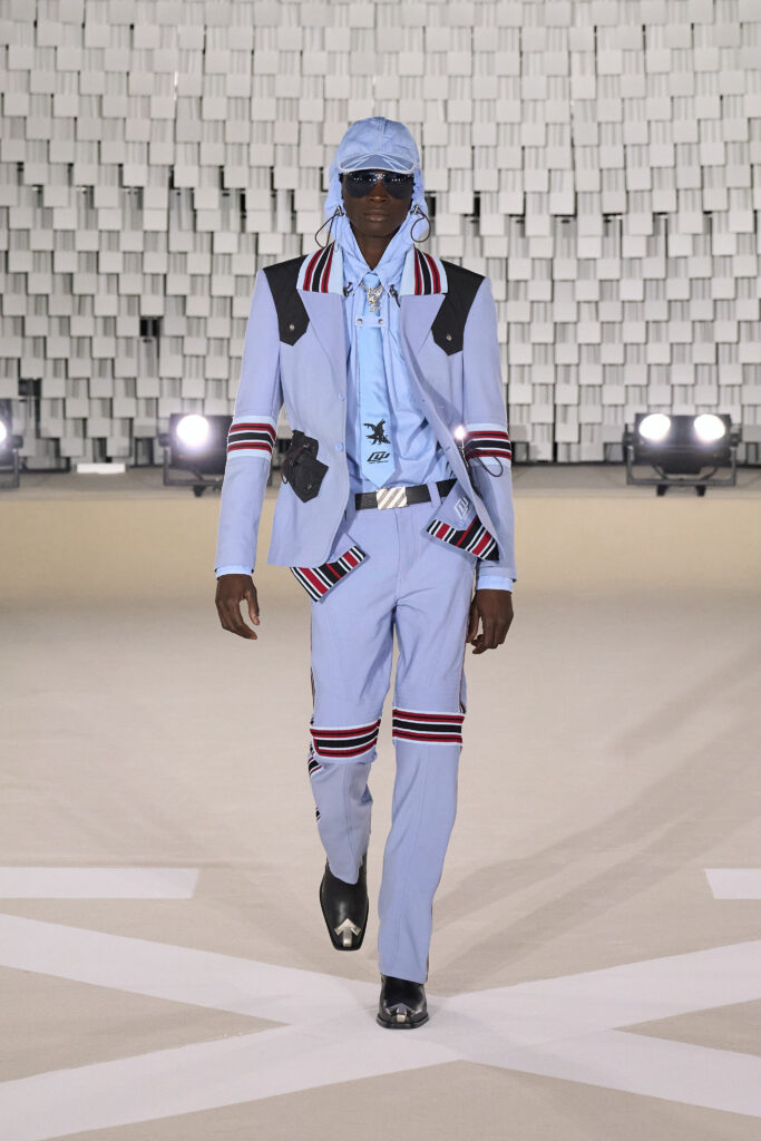 Kamara définit Off-White™ comme une société d’individus divers, unis par une quête authentique d’expression personnelle, soulignant ainsi l’importance d’une communauté inclusive et résistante. Chaque pièce de la collection exprime ce message, évoquant à la fois l’uniformité apparente des tenues professionnelles et sportives, et la singularité puissante de chaque individu qui les porte.