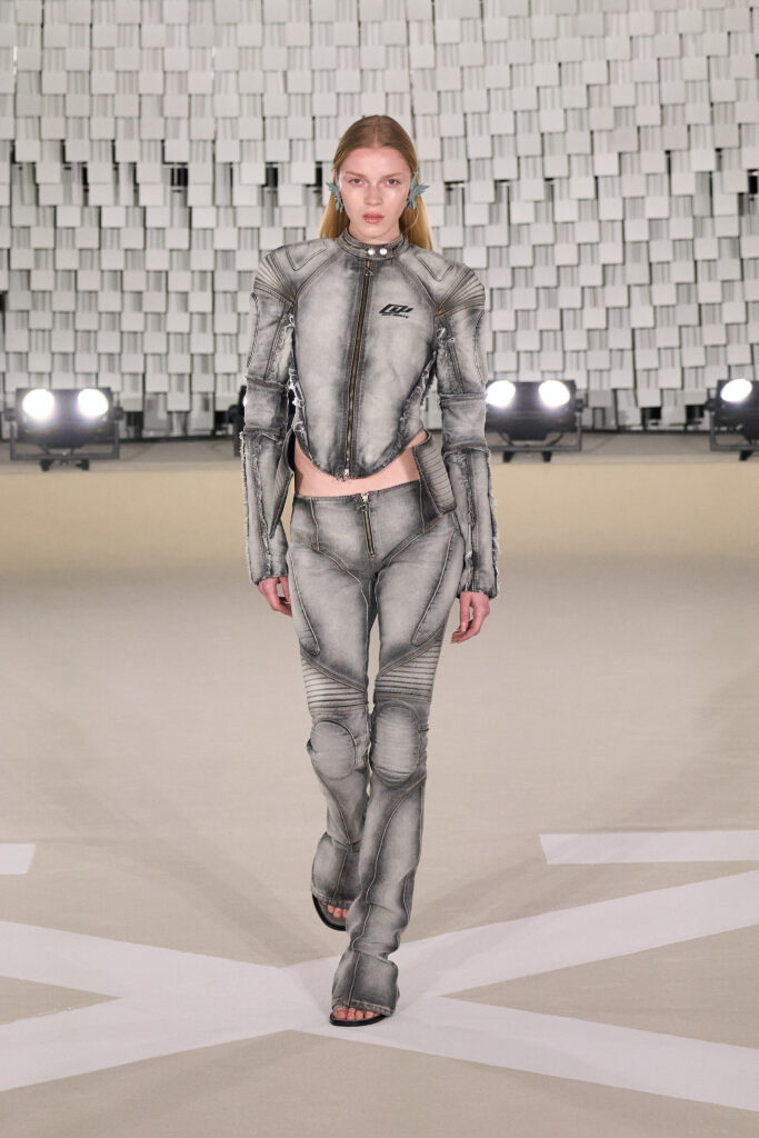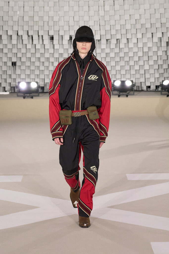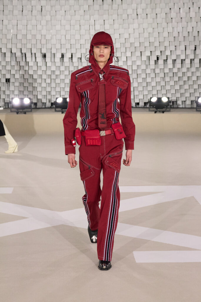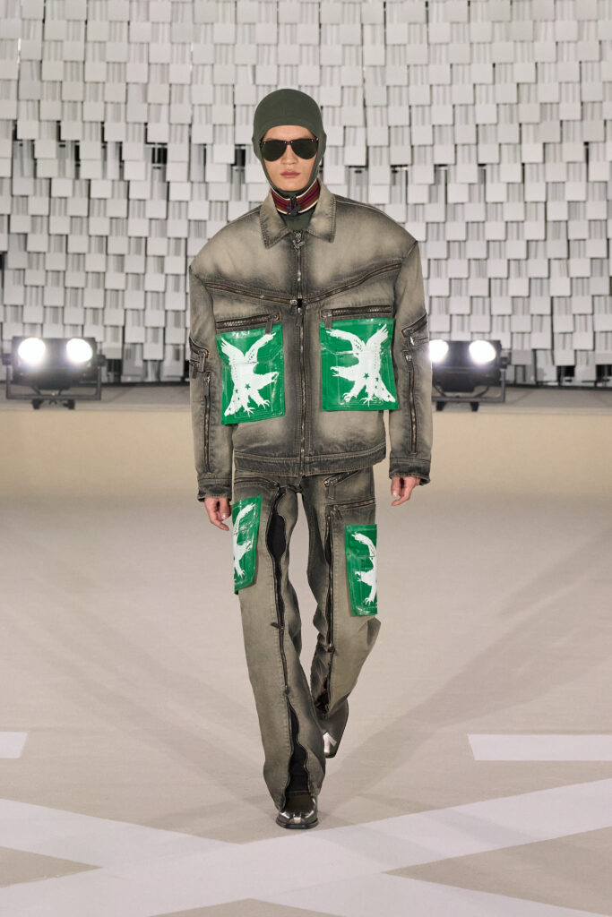 Les silhouettes des collections homme et femme partagent une férocité commune, ponctuée par des touches audacieuses de couleurs aqua, pourpre et rouge sur une base neutre. Les matières privilégiées, telles que le jersey et le denim, sont transformées en véritables terrains d’expérimentation, accueillant divers traitements, lavages et formes architecturales innovantes.