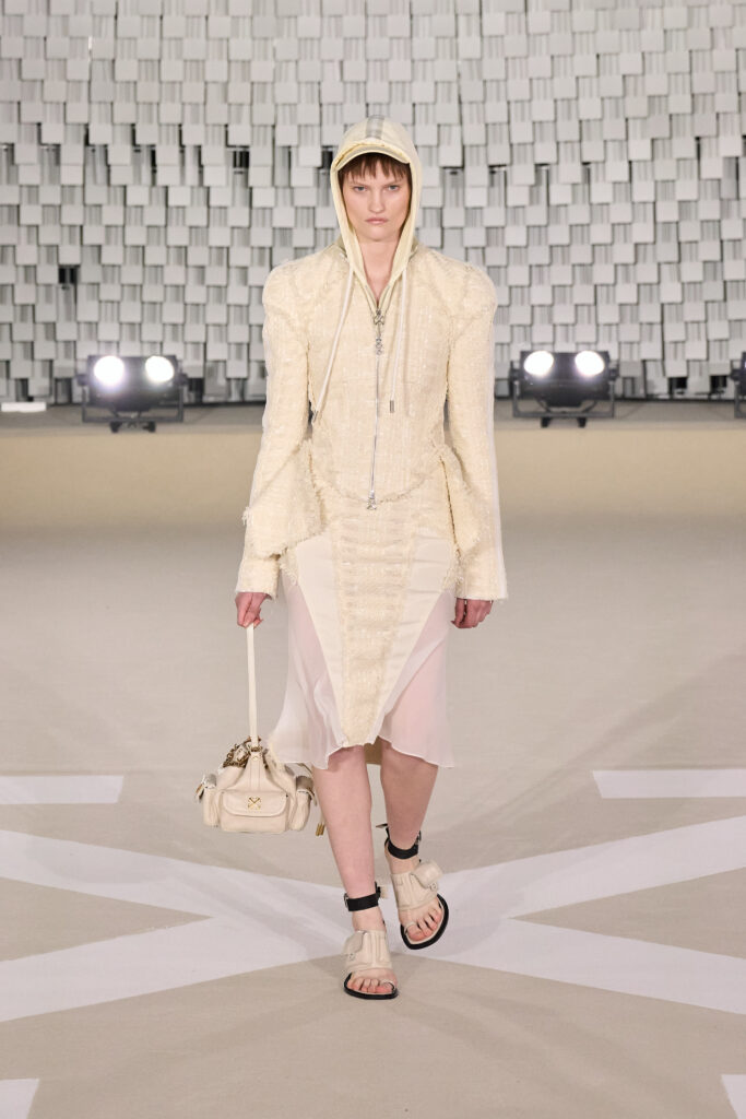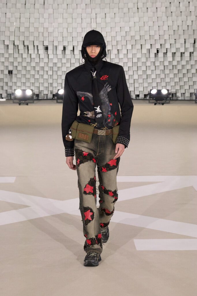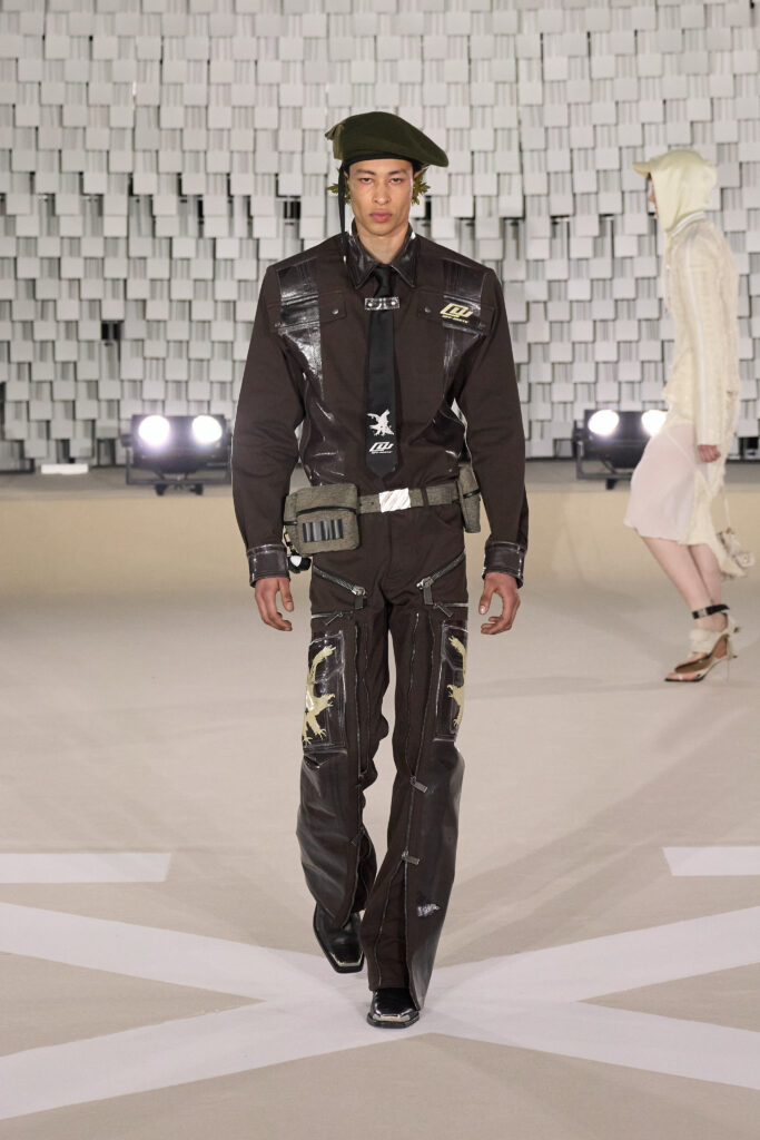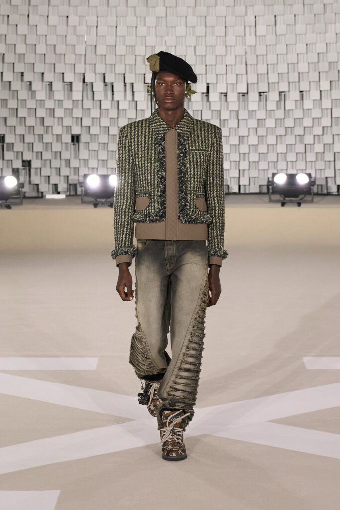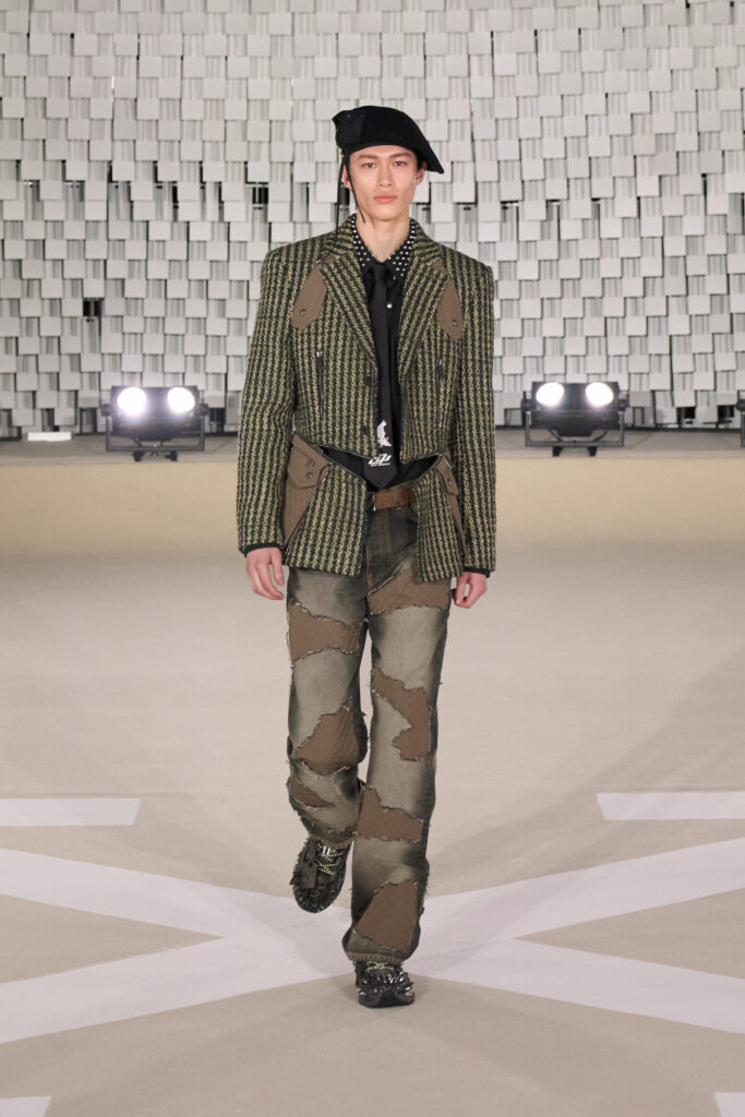Dans les créations masculines, la force réside dans la fonctionnalité audacieuse des coupes. Les détails tels que les fermetures éclair visibles, les hybrides de vêtements, ainsi que les textures contrastées telles que le tweed et le plastique, créent une dynamique riche et audacieuse. Le denim déchiré, les épaules rembourrées et les manteaux longs intégrant des hoodies évoquent une rencontre riche entre diverses influences culturelles et stylistiques.