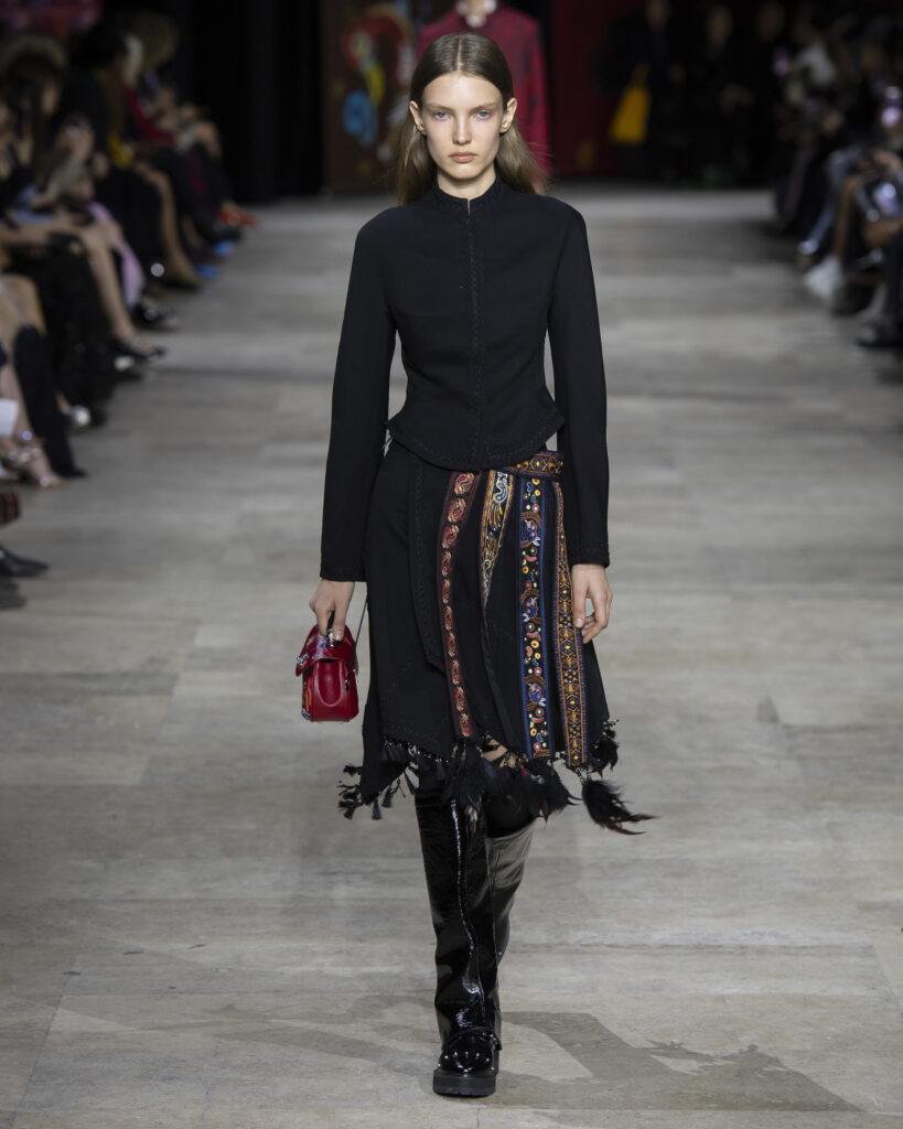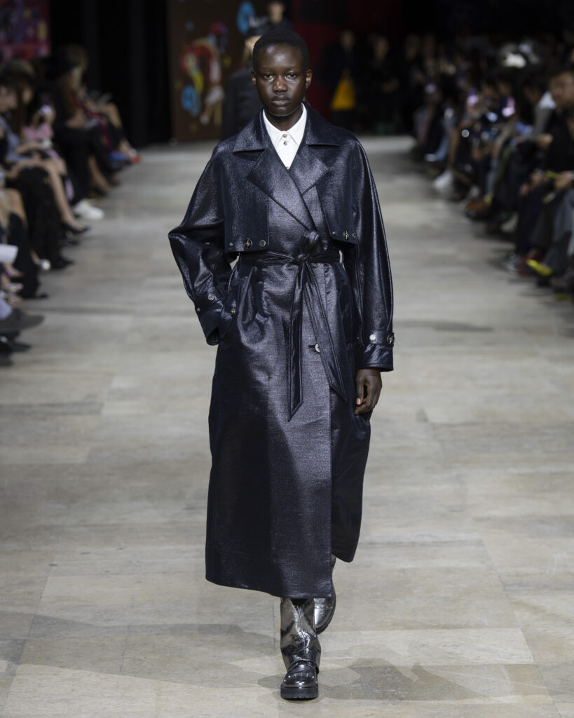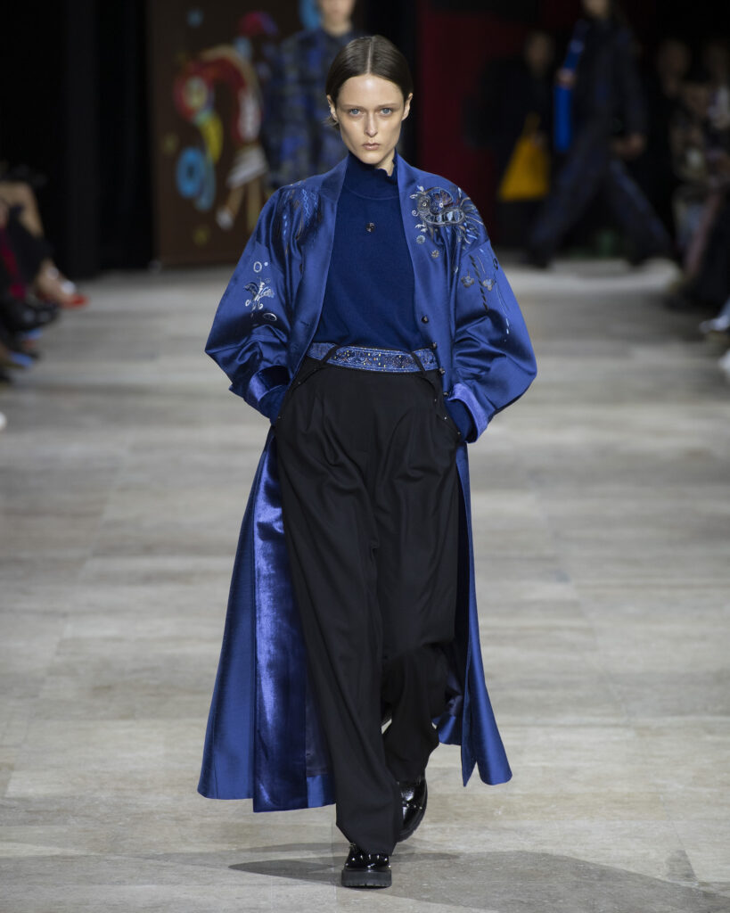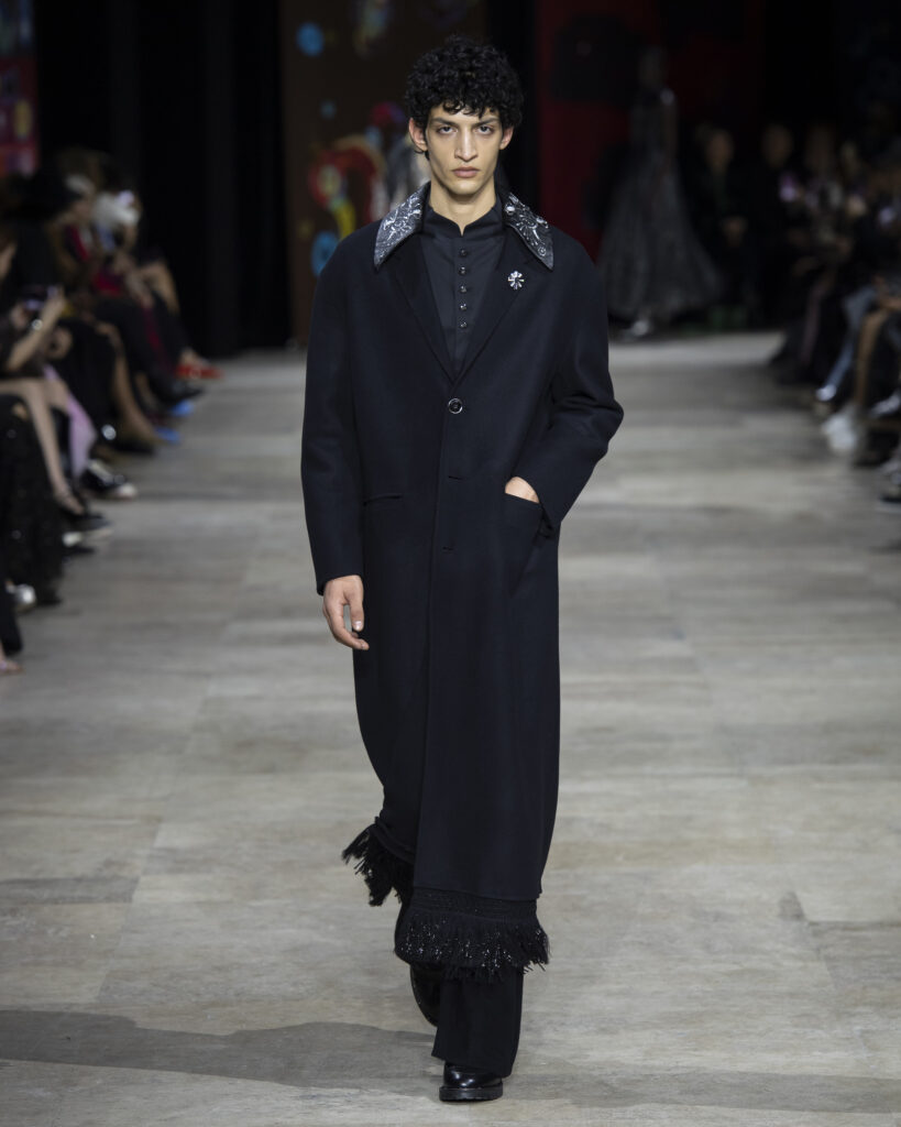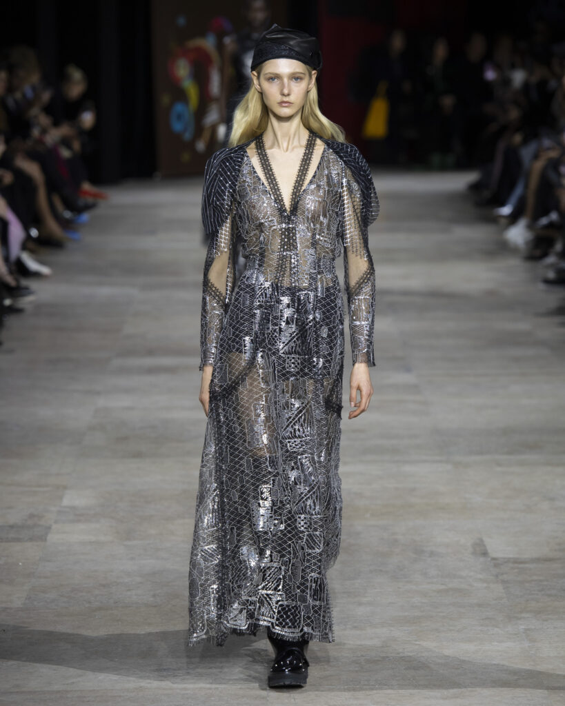 La collection automne-hiver 2025/26 de Shiatzy Chen est une réinterprétation poétique de la migration et des échanges culturels, exprimée à travers une broderie exquise. L’inspiration provient des « Dix types de broderie Miao », un ensemble de techniques traditionnelles du peuple du Guizhou, chacune portant en elle une histoire séculaire. Les motifs, évoquant d’anciennes légendes, prennent vie sur les tissus, transformant les vêtements en récits brodés de fils d’argent, véritables témoins du passé.