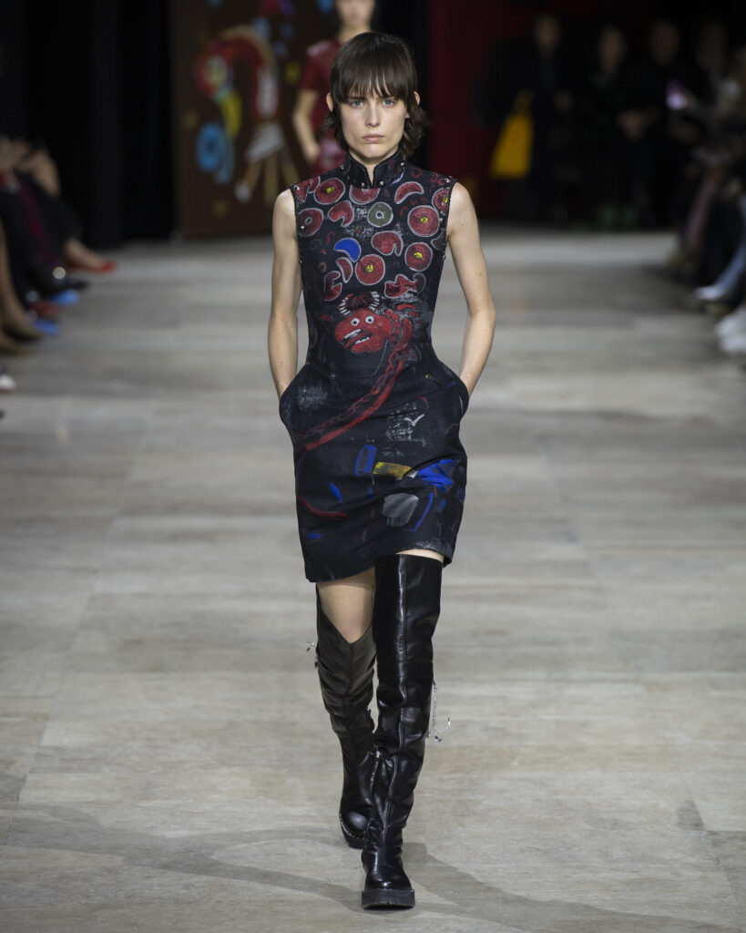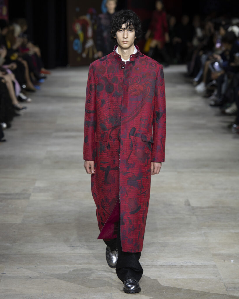 La palette chromatique rend hommage aux cinq communautés Miao, mêlant blanc, rouge, noir, bleu et teintes florales, rehaussées d’accents platine et rose. Les structures varient entre inserts en cuir plissé et superpositions aériennes, rappelant les silhouettes traditionnelles des costumes folkloriques. Manteaux aux lignes allongées, capes fluides et drapés confèrent un sentiment de mouvement, à l’image d’images migrantes traversant les siècles.