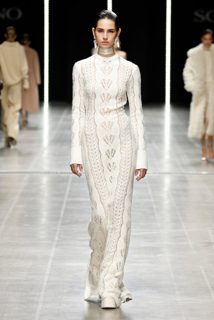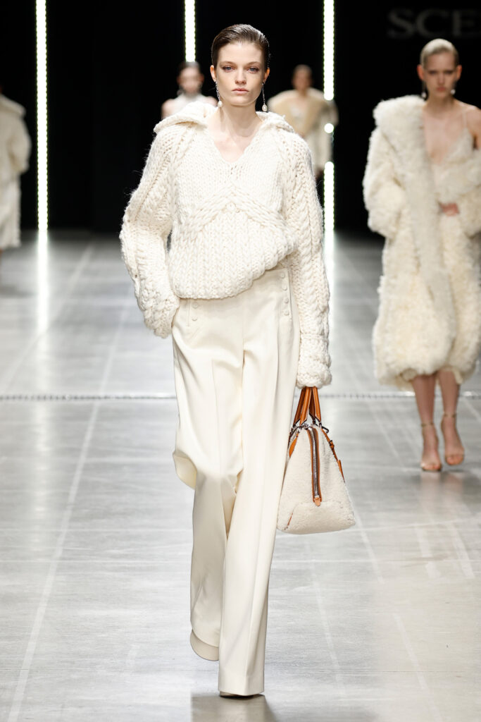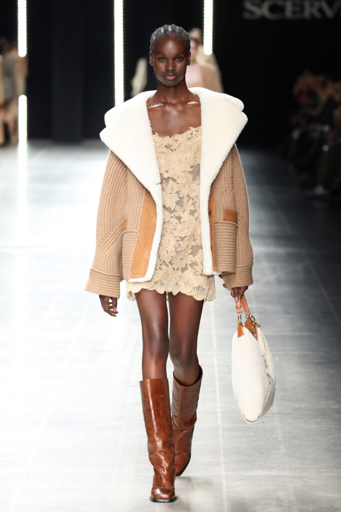 - Les mailles épaisses et tricotées à la main deviennent des vestes en shearling, enveloppant des robes en mousseline de soie aérienne.
