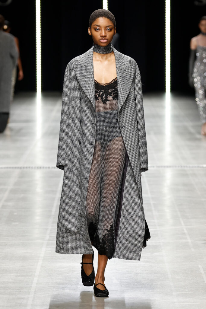 - Les tissus masculins (chevrons, pied-de-poule) sculptent des blazers cintrés et des manteaux dramatiques, créant une silhouette structurée et puissante.
