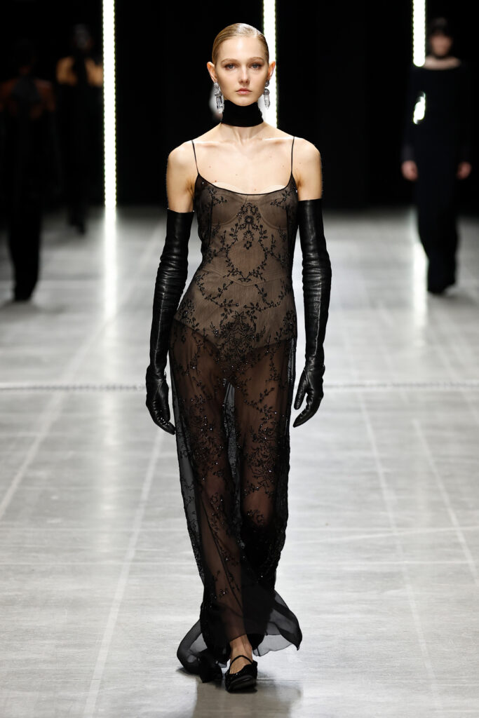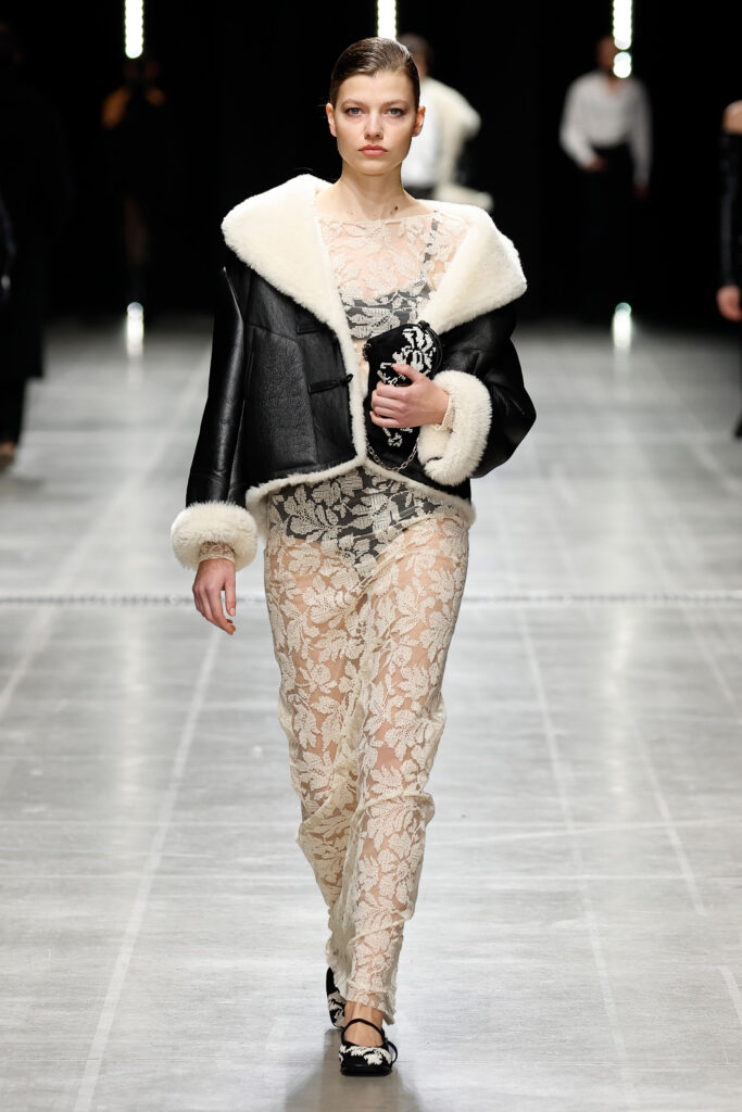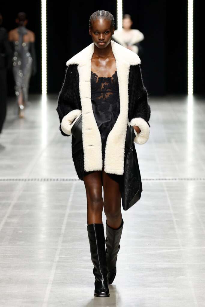 - Les manteaux en shearling enveloppent des slip dresses brodées de cristaux, mêlant opulence et minimalisme.