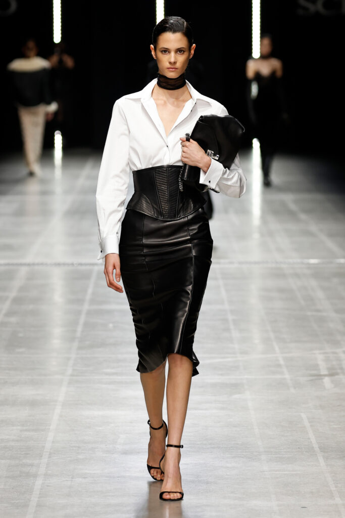 - Les ceintures corsetées encadrent des robes tubes brodées en « punto sollevato », une technique artisanale novatrice, accentuant l’allure sculpturale de la collection.
