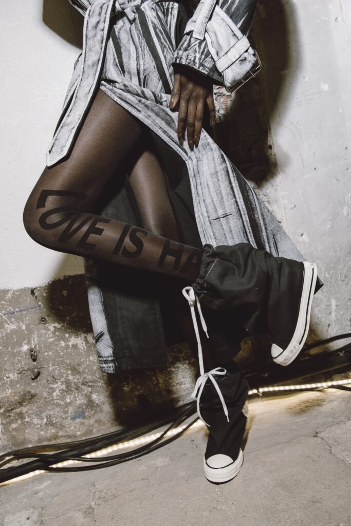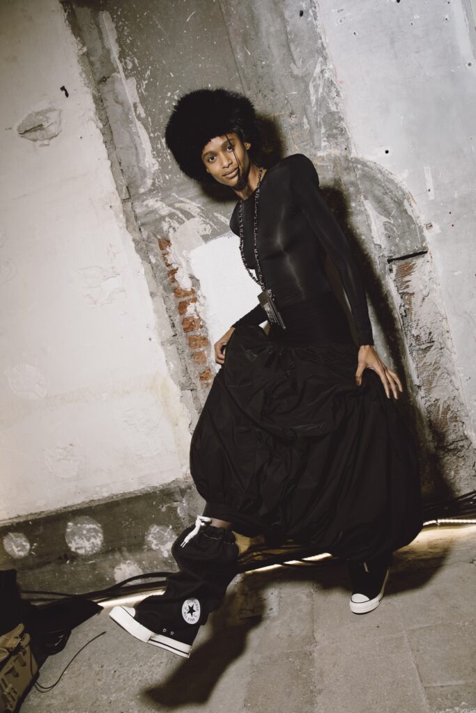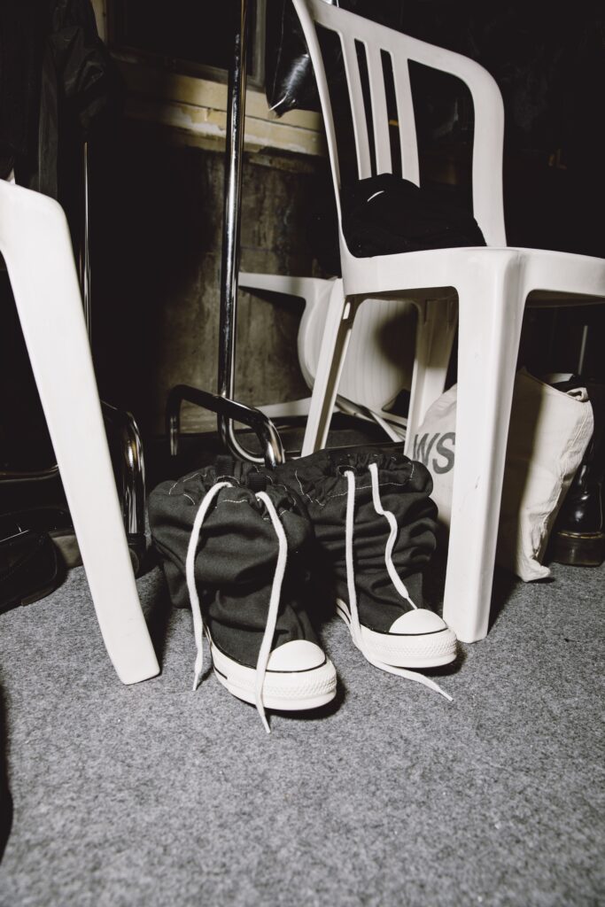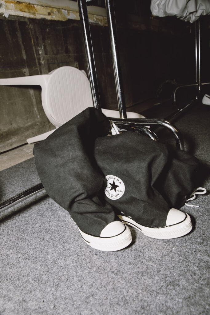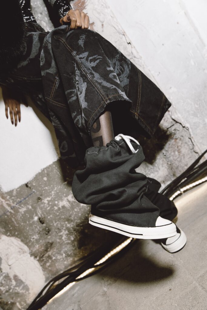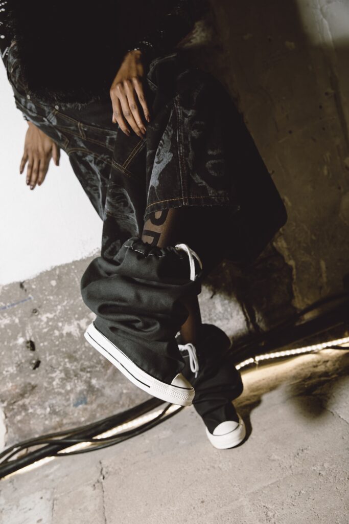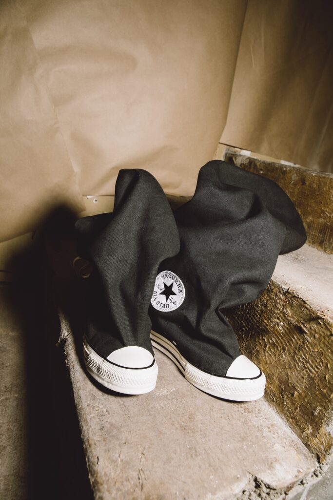 Si l’on devait retenir une pièce emblématique, ce serait sans conteste la transformation radicale de la Converse Chuck Taylor. Pour cette collaboration, Vaquera la métamorphose en botte ample montant jusqu’au genou, dissimulant un talon compensé secret. Cette silhouette, à la croisée du punk, du cabaret et du streetwear, inscrit définitivement cette collaboration dans une esthétique provocante et avant-gardiste.