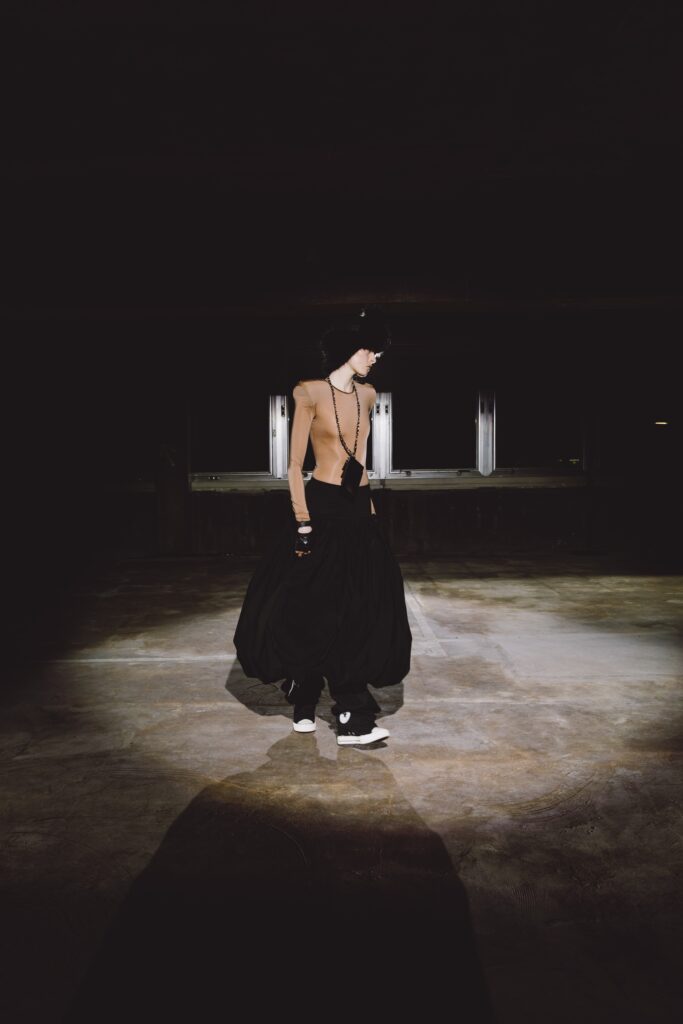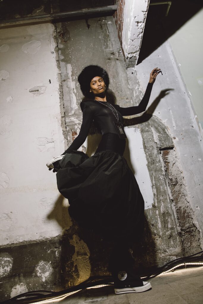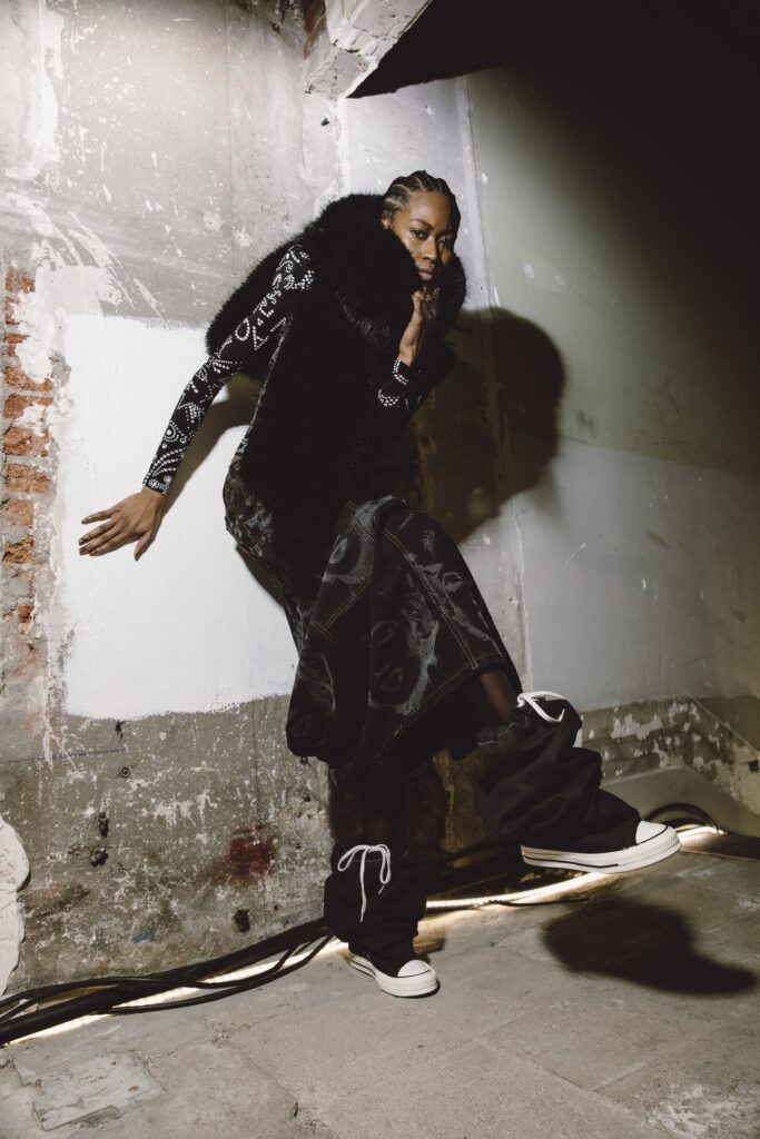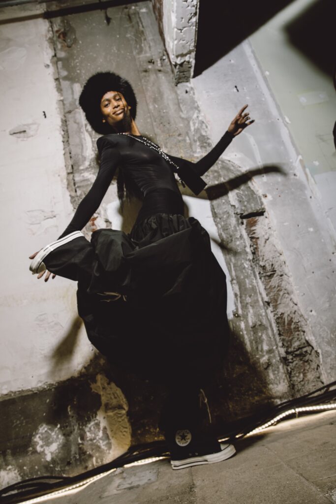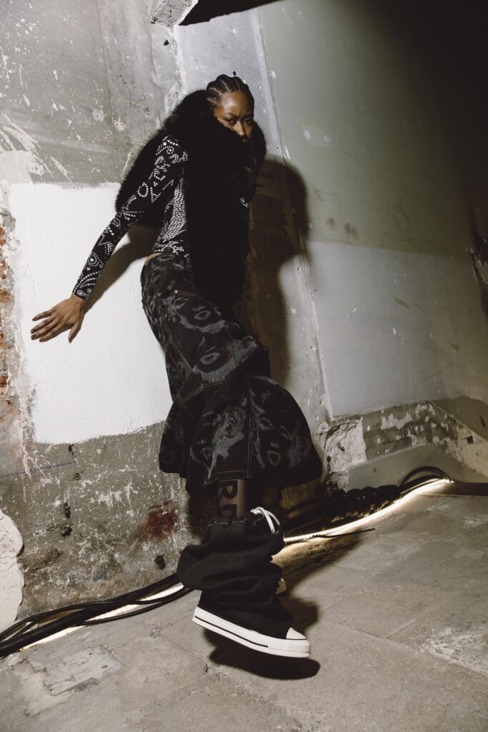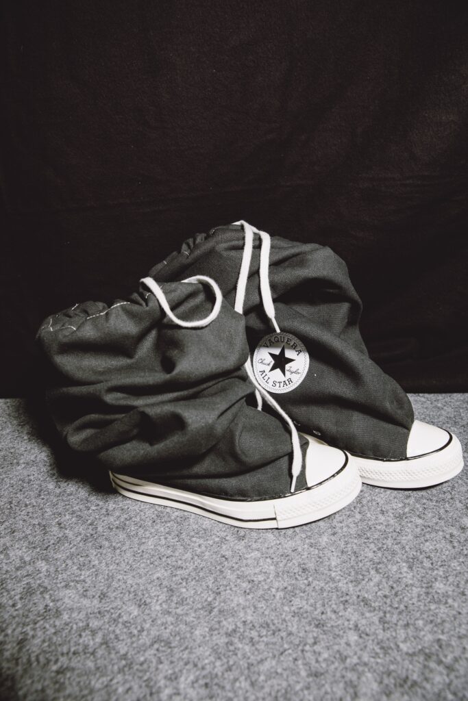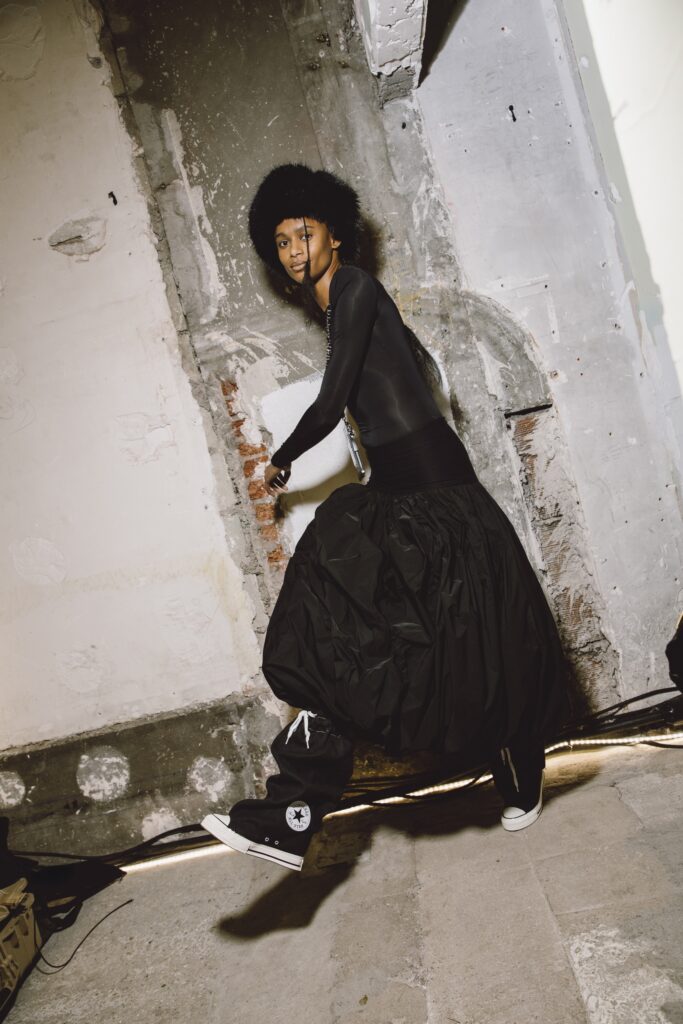 Si l’on devait retenir une pièce emblématique, ce serait sans conteste la transformation radicale de la Converse Chuck Taylor. Pour cette collaboration, Vaquera la métamorphose en botte ample montant jusqu’au genou, dissimulant un talon compensé secret. Cette silhouette, à la croisée du punk, du cabaret et du streetwear, inscrit définitivement cette collaboration dans une esthétique provocante et avant-gardiste.