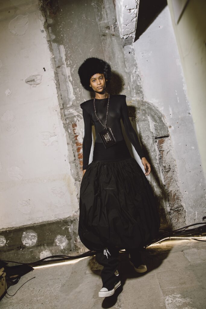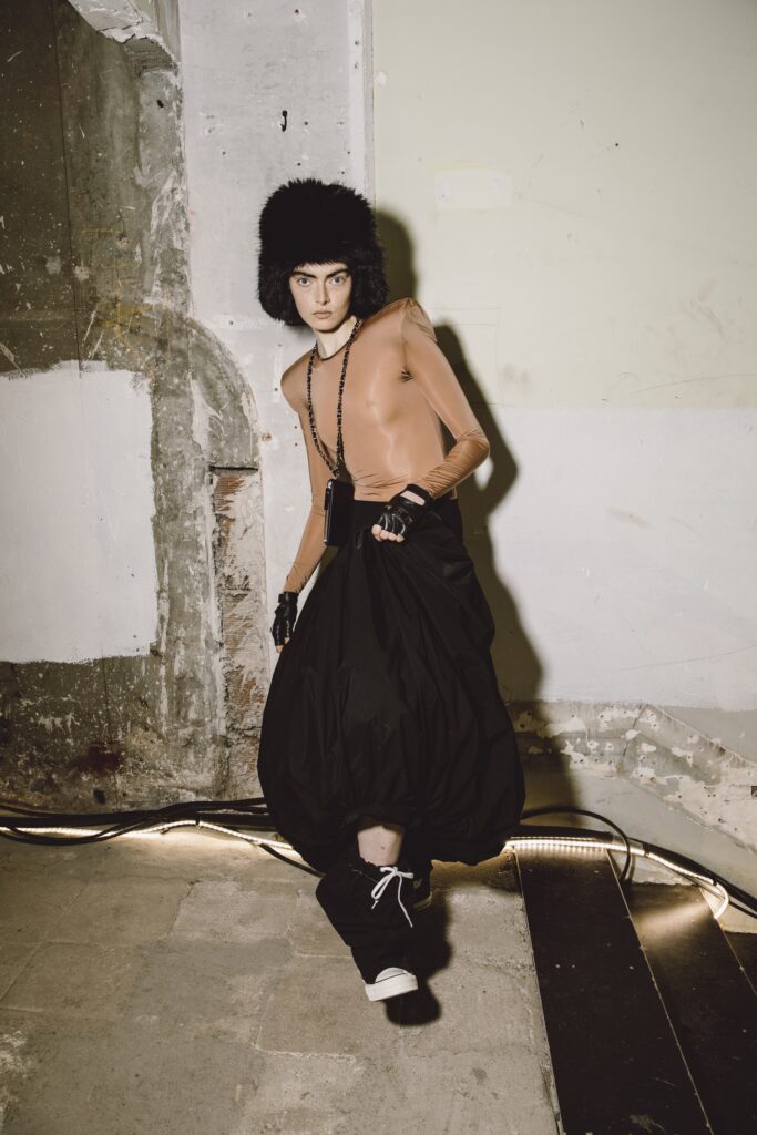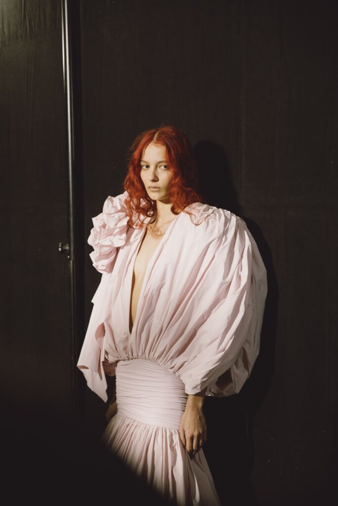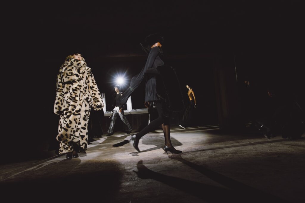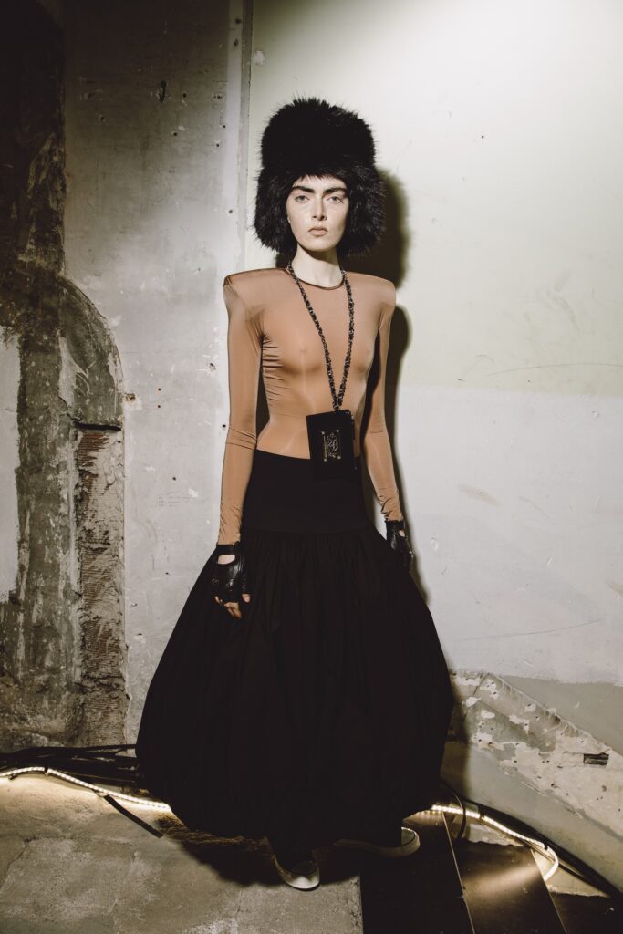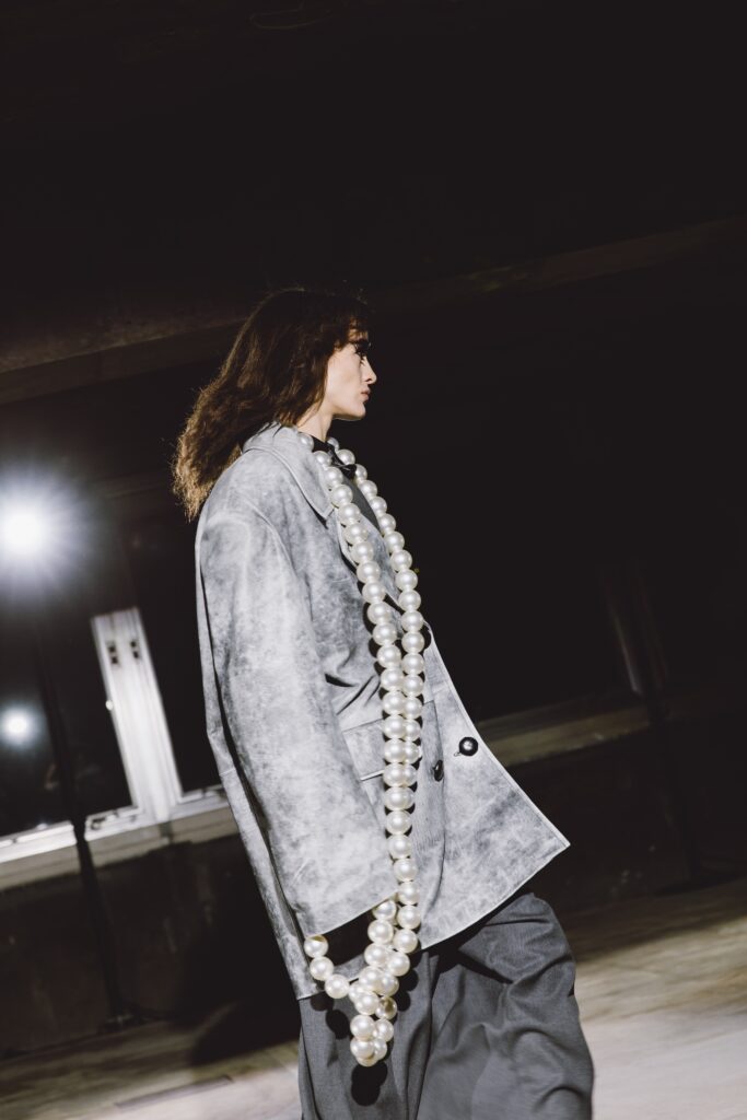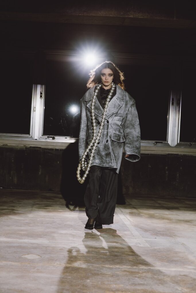 Les looks du défilé étaient dominés par une palette monochrome atténuée, ponctuée de touches rose pâle et d’imprimés léopard, mêlant corsages oversize, colliers de perles et volumes exagérés.