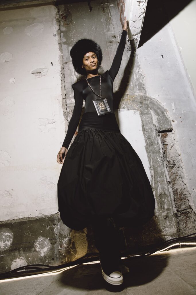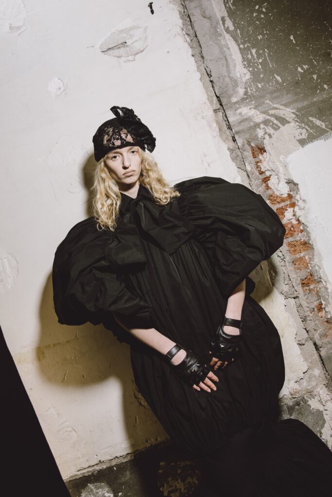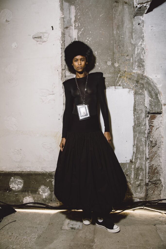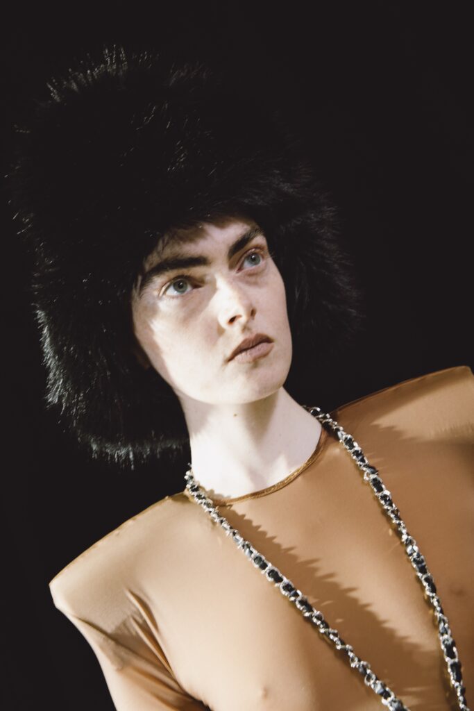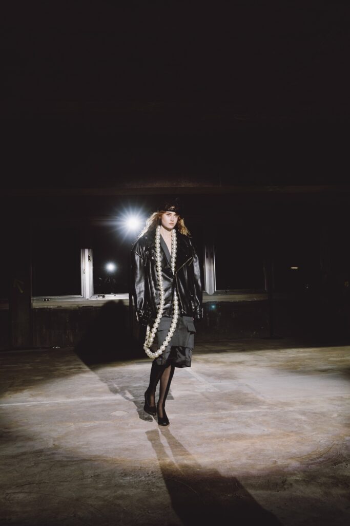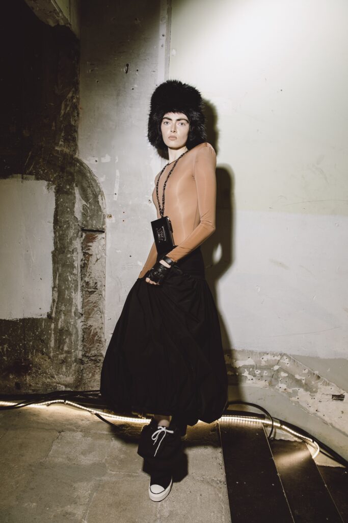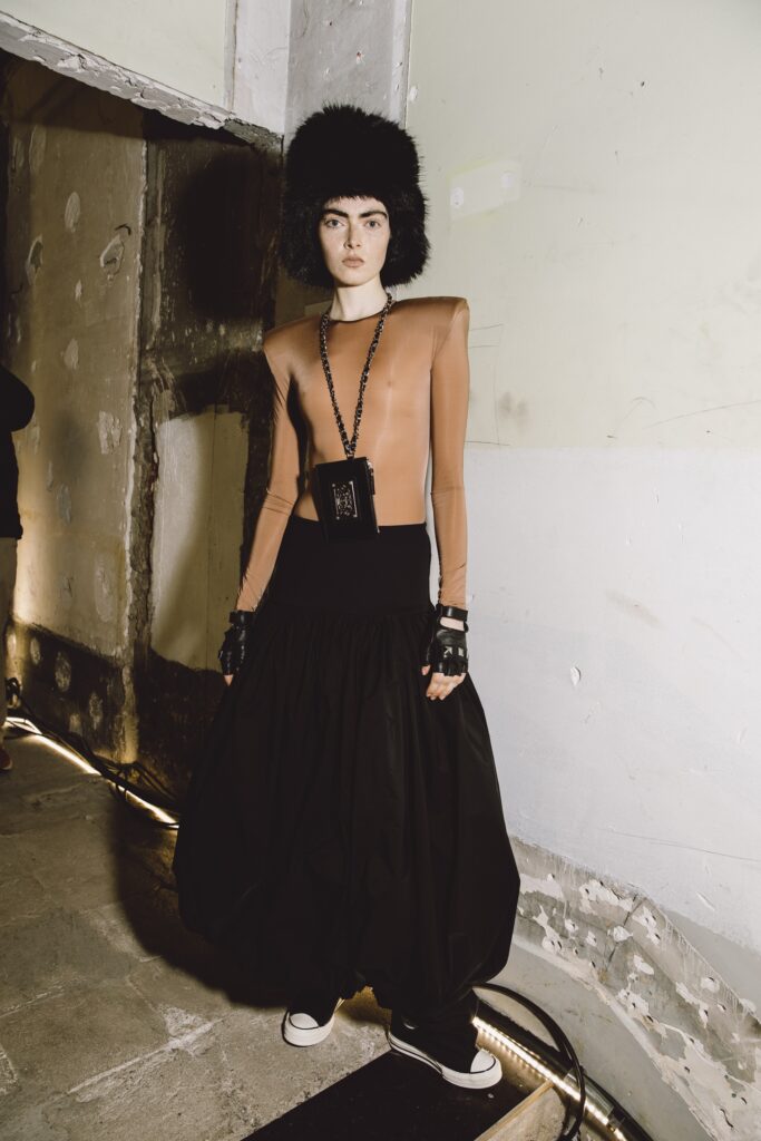Les looks du défilé étaient dominés par une palette monochrome atténuée, ponctuée de touches rose pâle et d’imprimés léopard, mêlant corsages oversize, colliers de perles et volumes exagérés.