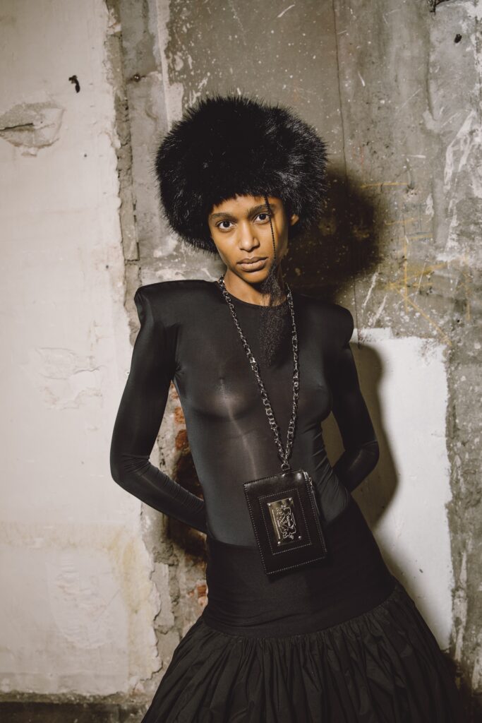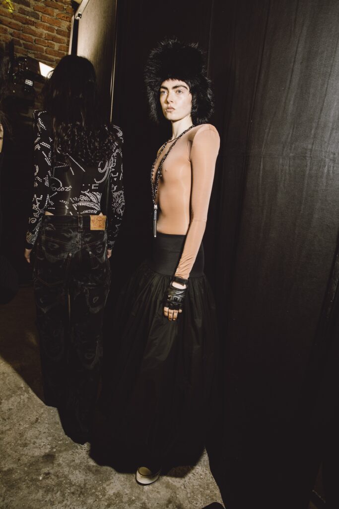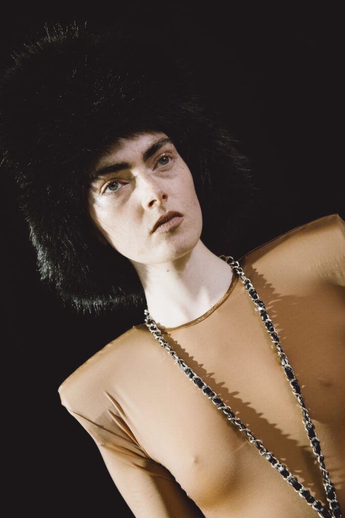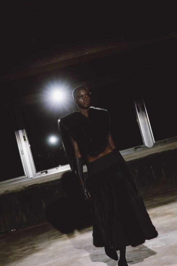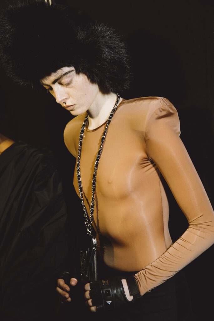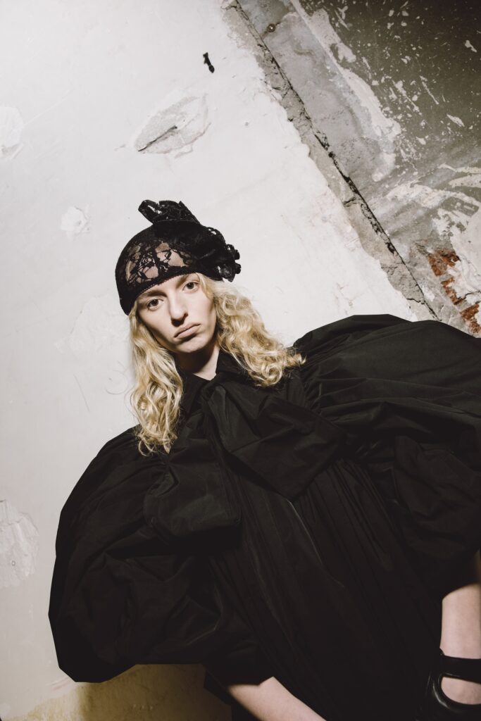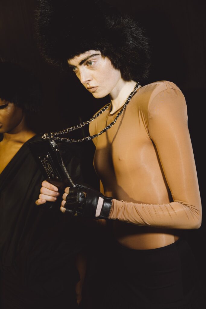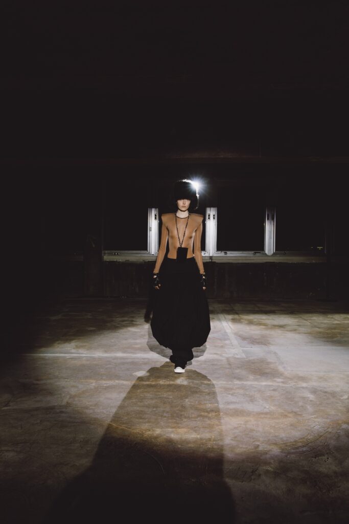 Les looks du défilé étaient dominés par une palette monochrome atténuée, ponctuée de touches rose pâle et d’imprimés léopard, mêlant corsages oversize, colliers de perles et volumes exagérés.