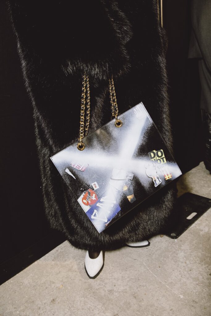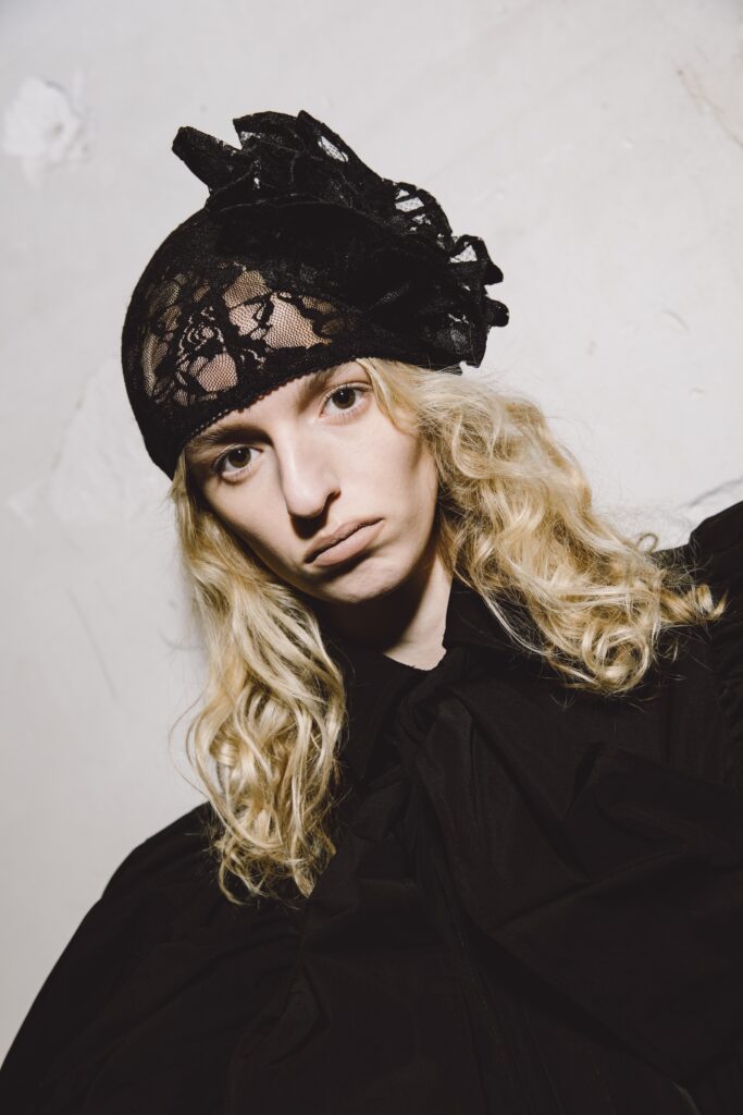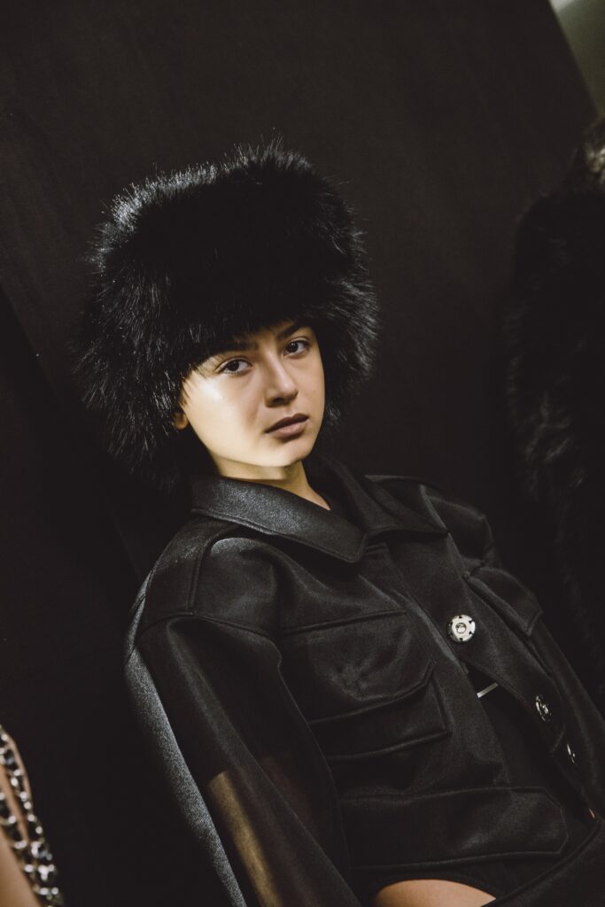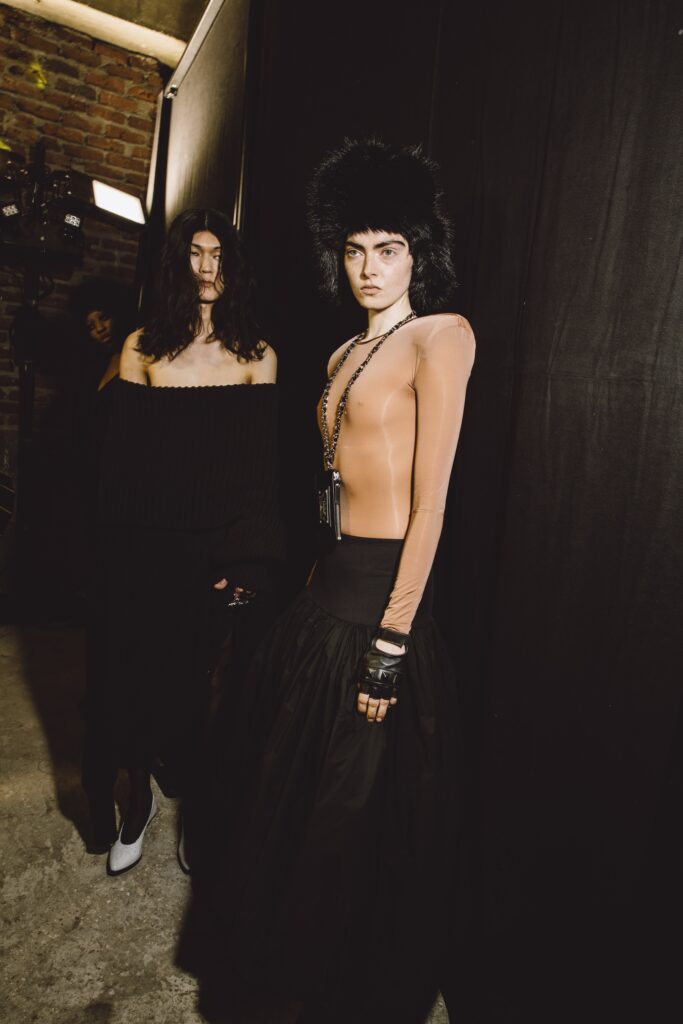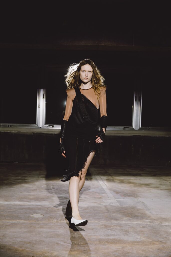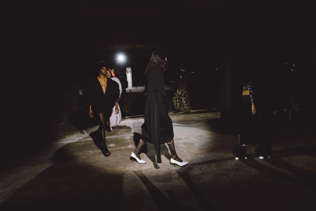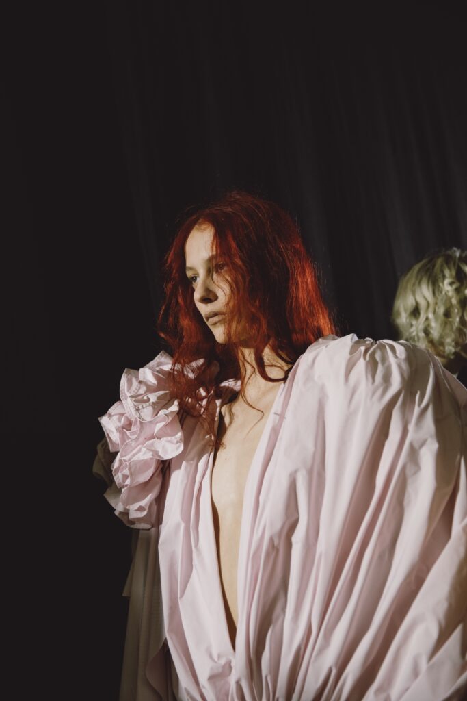 Les looks du défilé étaient dominés par une palette monochrome atténuée, ponctuée de touches rose pâle et d’imprimés léopard, mêlant corsages oversize, colliers de perles et volumes exagérés.