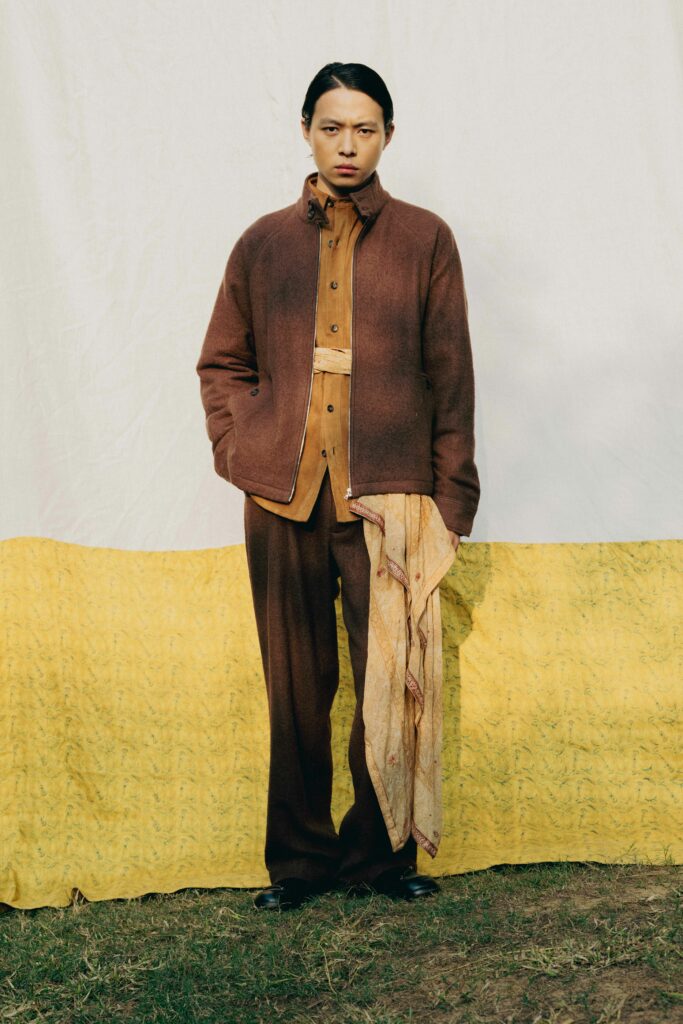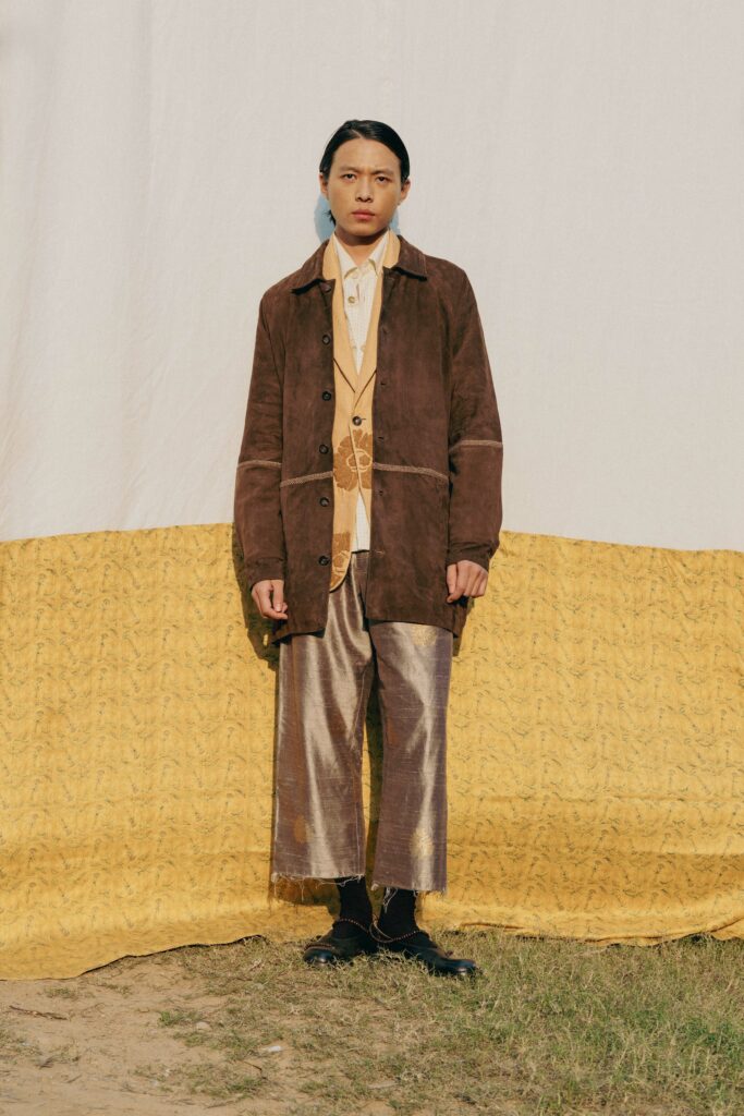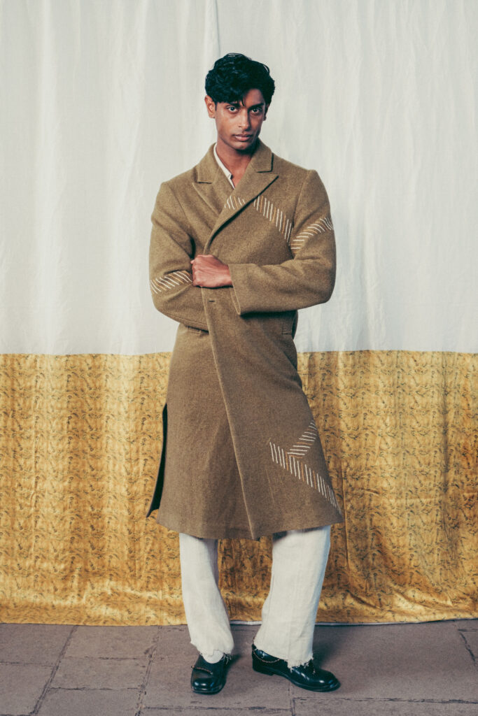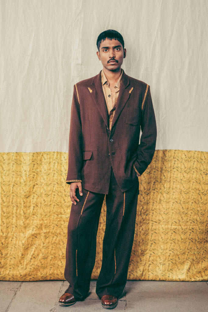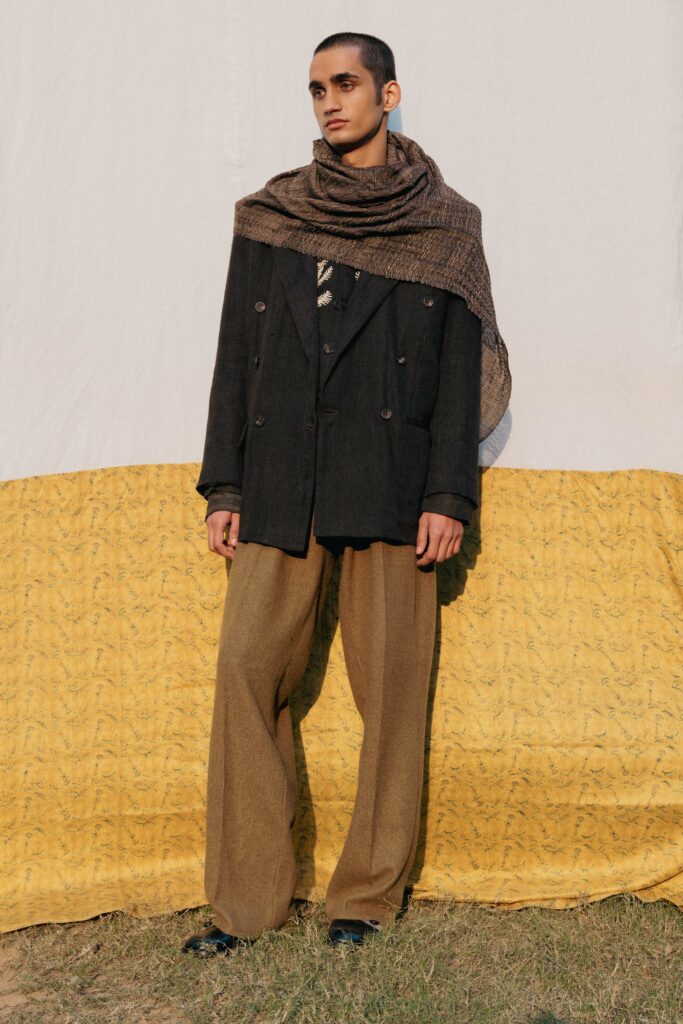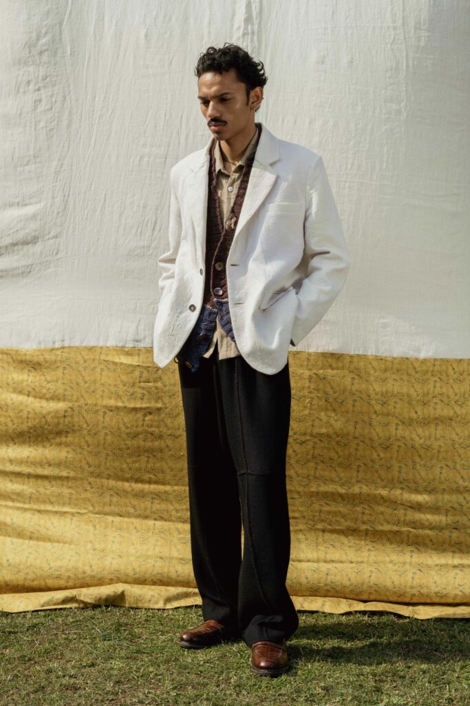 Cette saison, les silhouettes s’inspirent des archives vintage, combinant des références au Yohji Yamamoto des années 90 et au Comme des Garçons des années 2000. Kartik Kumra signe sa version du « weird suit », où l’esthétique prime sur la fonction, sublimée par une palette terreuse et plus de 80 % de teintures naturelles.
