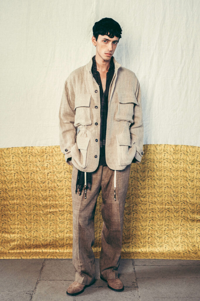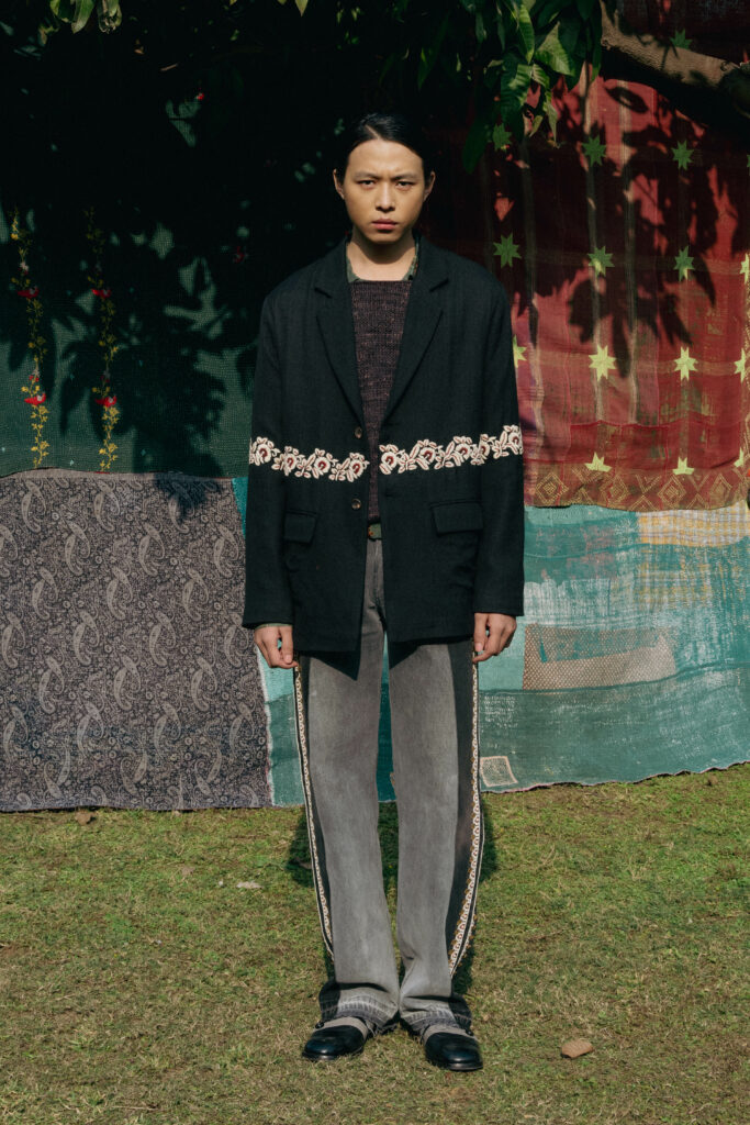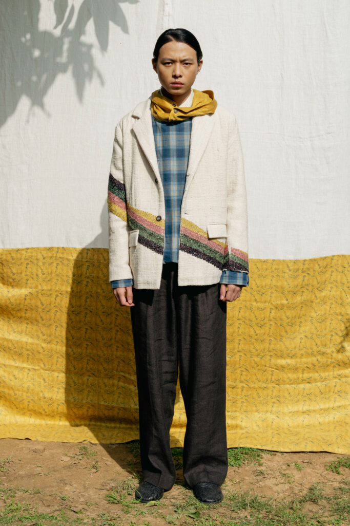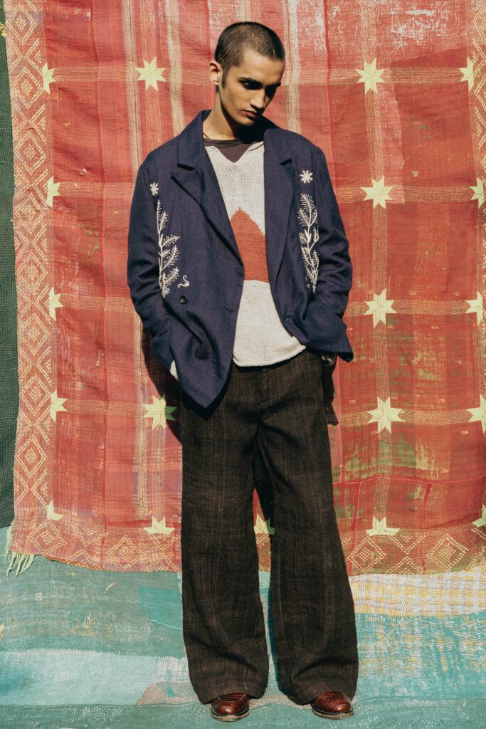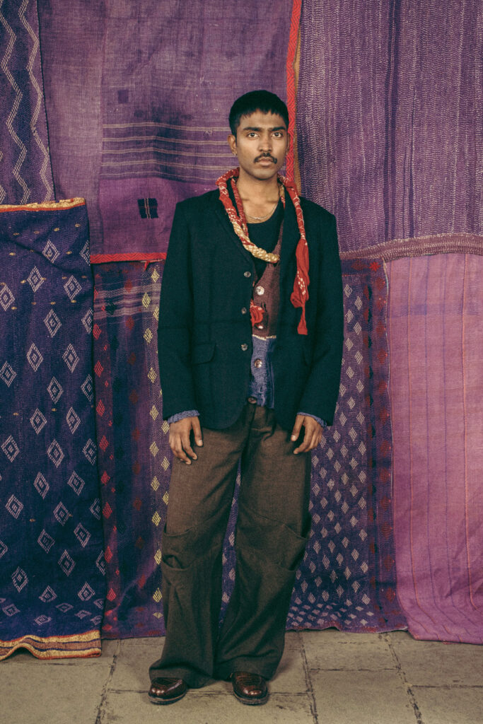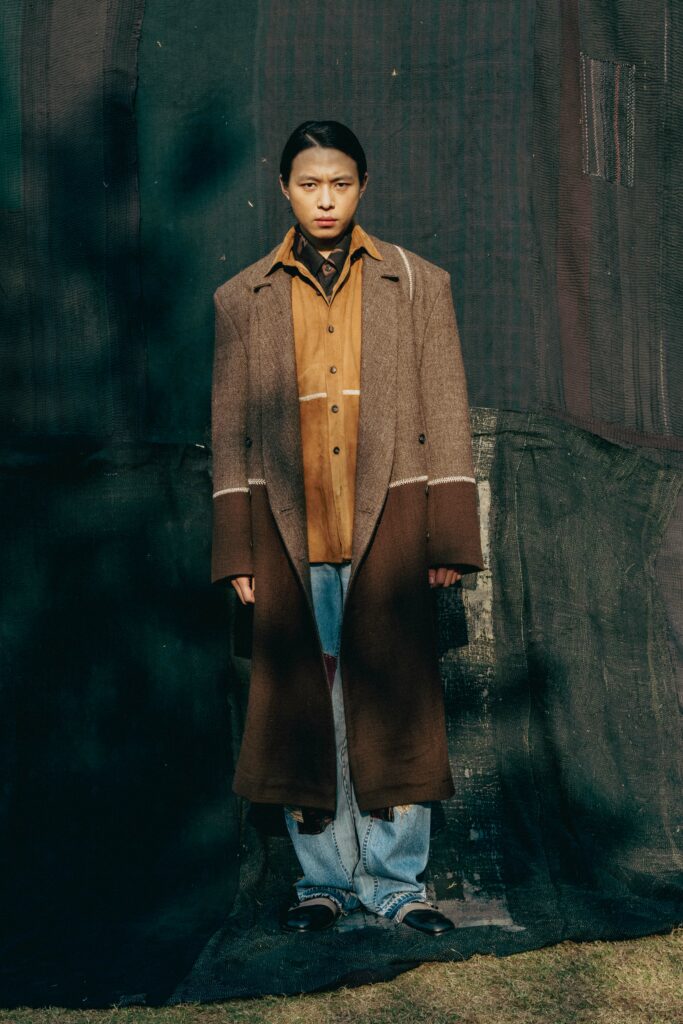 Cette saison, les silhouettes s’inspirent des archives vintage, combinant des références au Yohji Yamamoto des années 90 et au Comme des Garçons des années 2000. Kartik Kumra signe sa version du « weird suit », où l’esthétique prime sur la fonction, sublimée par une palette terreuse et plus de 80 % de teintures naturelles.