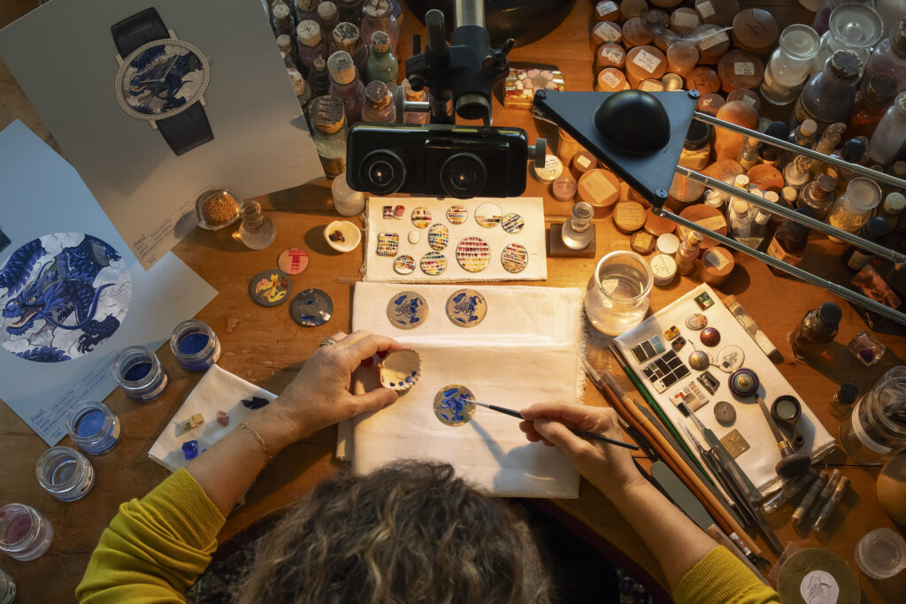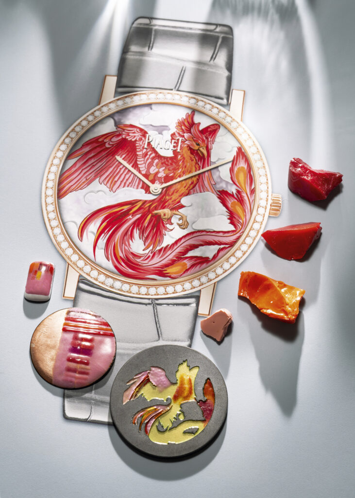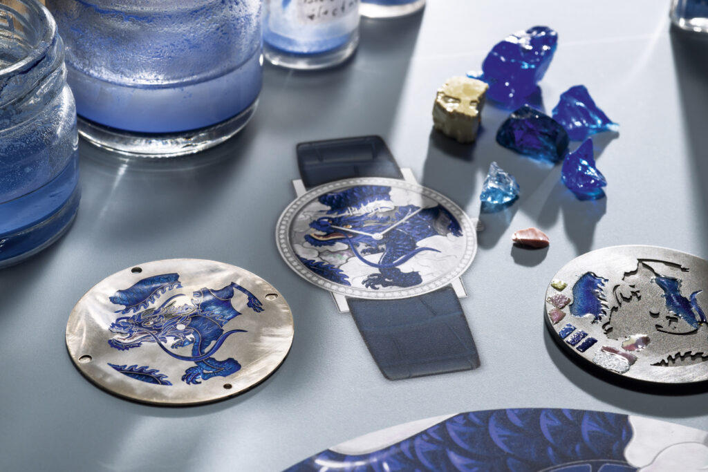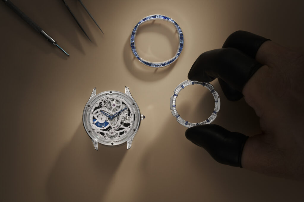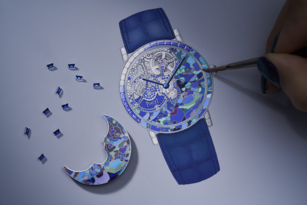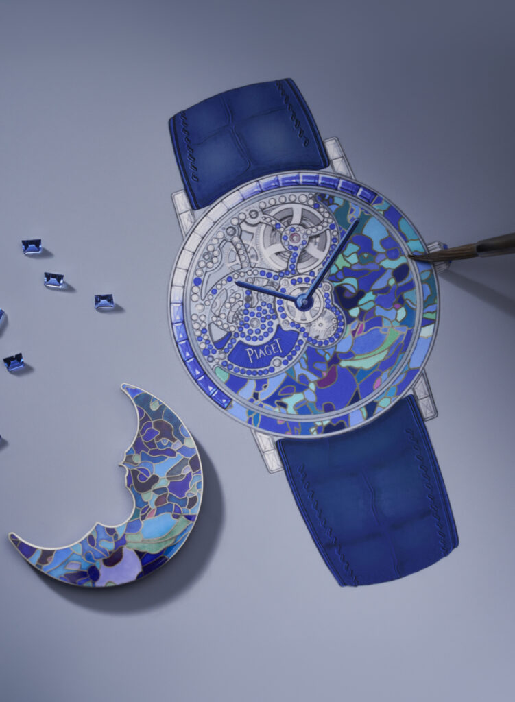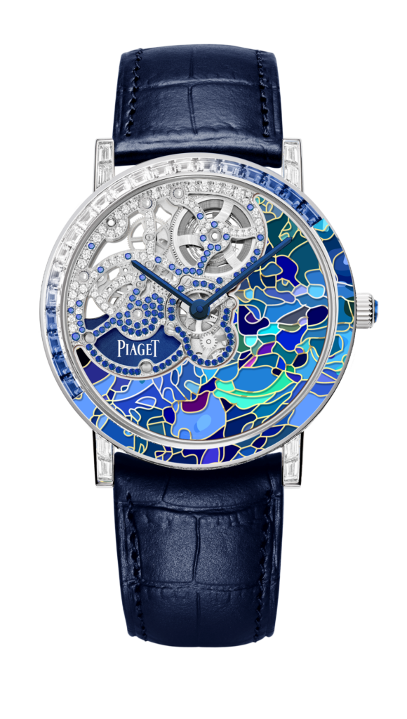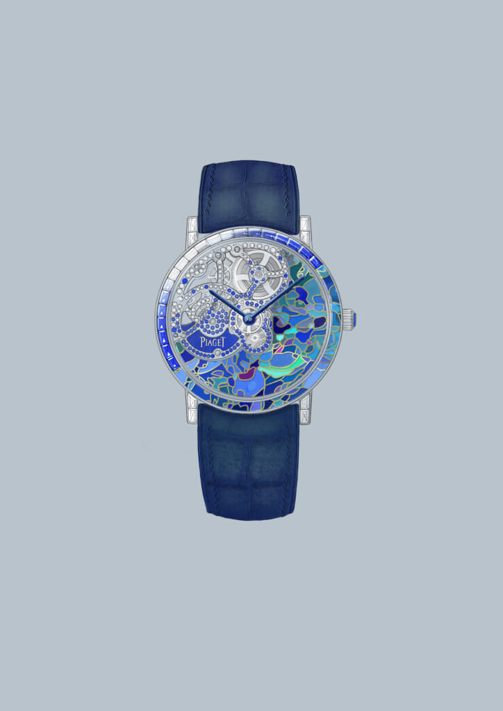 Mais l’innovation ne s’arrête pas là : cette création est sublimée par l’artiste émailleuse Anita Porchet, collaboratrice fidèle de Piaget depuis 2006. Elle signe un dégradé de tons bleus, verts et violets en émail Grand Feu cloisonné, une prouesse technique qui épouse non seulement le cadran mais aussi les contours de la lunette, offrant une continuité visuelle inédite.