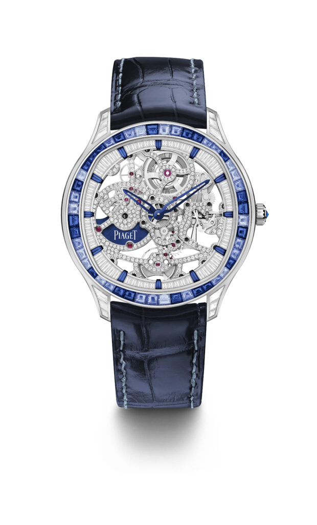 L’Altiplano Skeleton High Jewellery incarne le mariage parfait entre minimalisme horloger et extravagance joaillière. Équipée du mouvement manufacture 1201D1, elle repousse les limites de l’extra-plat tout en arborant un sertissage hypnotique de diamants et de saphirs bleus.