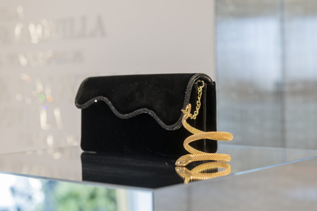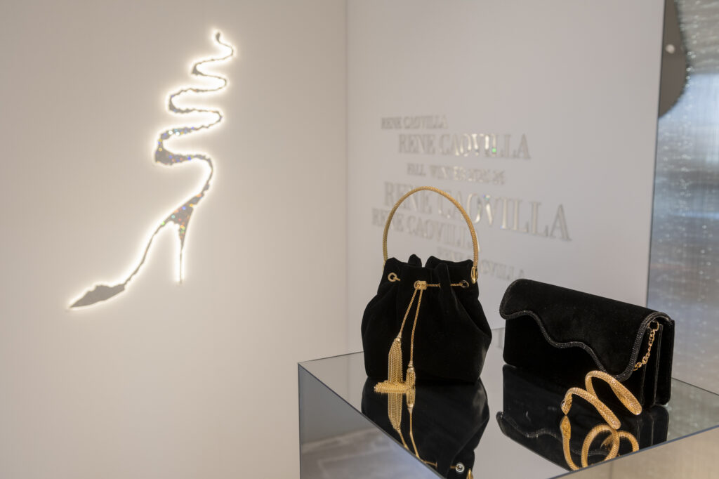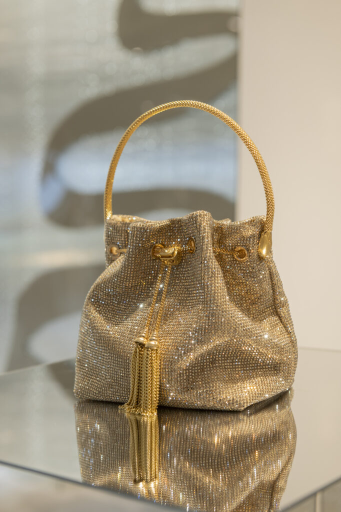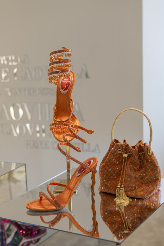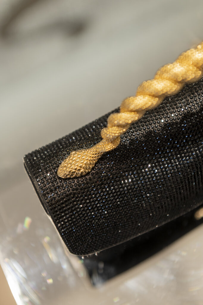 La collection ne s’arrête pas aux chaussures. Rene Caovilla enrichit également sa gamme avec une capsule de mini-sacs destinée à compléter chaque tenue. Le petit Bucket bag, entièrement strassé et décliné en teintes orangées et dorées évoquant les couchers de soleil hivernaux – également disponible en velours noir – se joint à la pochette Wave, en satin poudré sertie de strass noirs totaux, et au sac à main Wave en version satin et velours, agrémenté d’un liseré de strass noir de jais. Pour les occasions glamour, le sac cocktail BauleKo, tout en strass noir et doté d’une anse serpent bijou, vient parfaire cette offre d’accessoires luxueux.