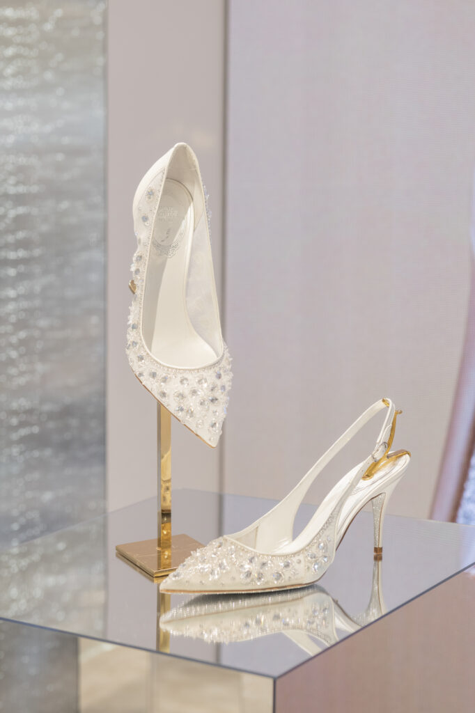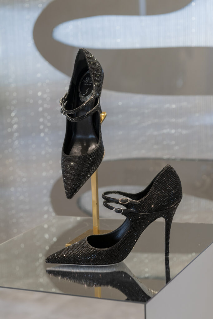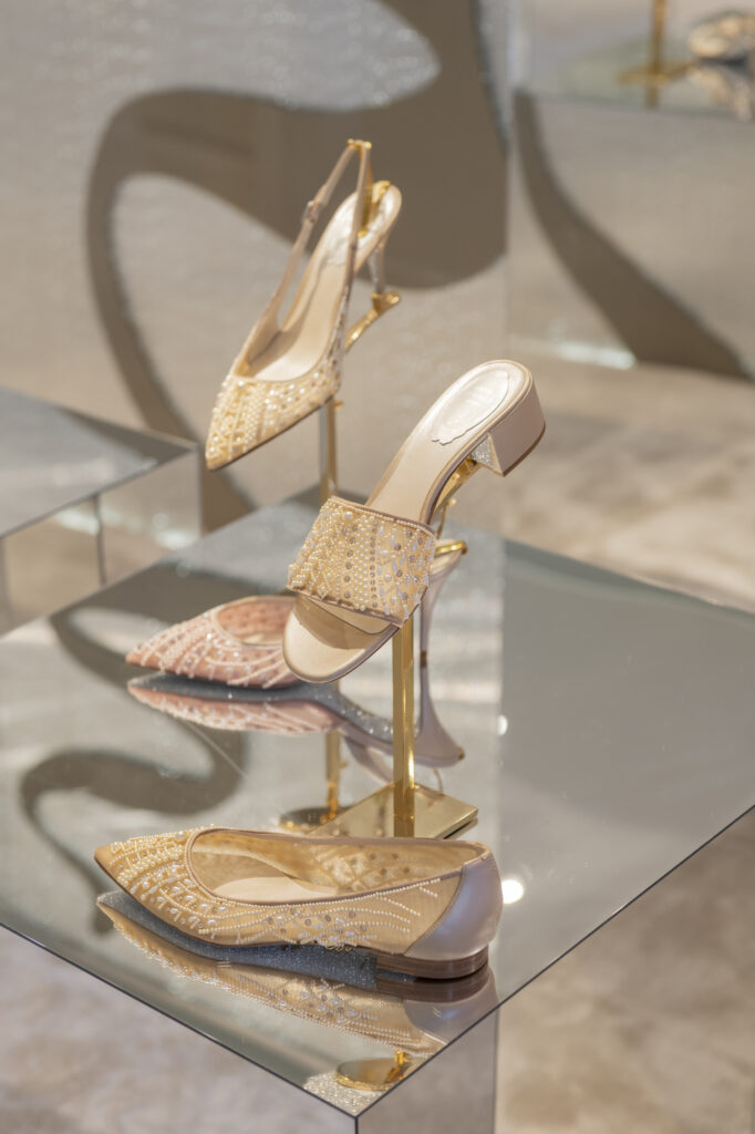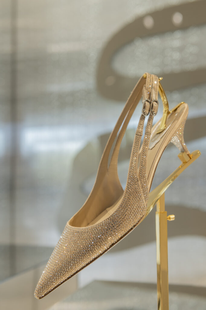 La broderie, évoquant l’ambiance feutrée des ateliers de couture, vient sublimer le modèle iconique Cleo, tout en enrichissant deux nouveaux modèles plats : la mule et le slingback. Ces pièces, ornées de cristaux incrustés, révèlent un motif qui évoque des rêves d’exotisme et transporte l’esprit vers des destinations lointaines et ensorcelantes. La sophistication se décline également à travers les modèles Full Crystal, où escarpins, Mary Janes, bottes, ballerines et talons stilettos scintillent sous une cascade de minuscules cristaux, apportant une touche d’éclat irrésistible.