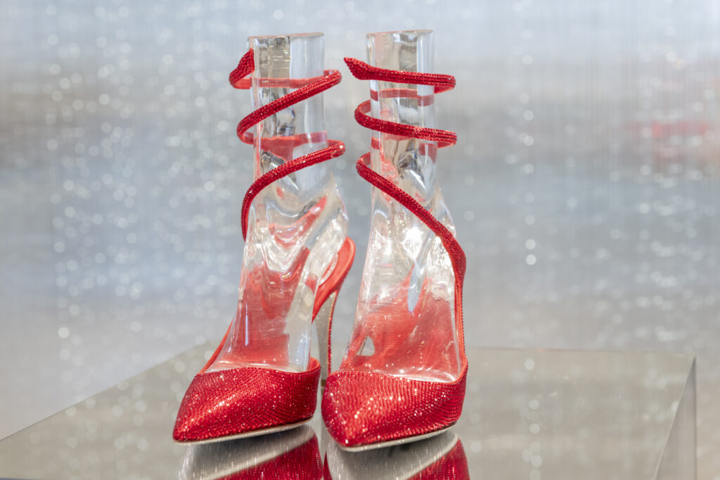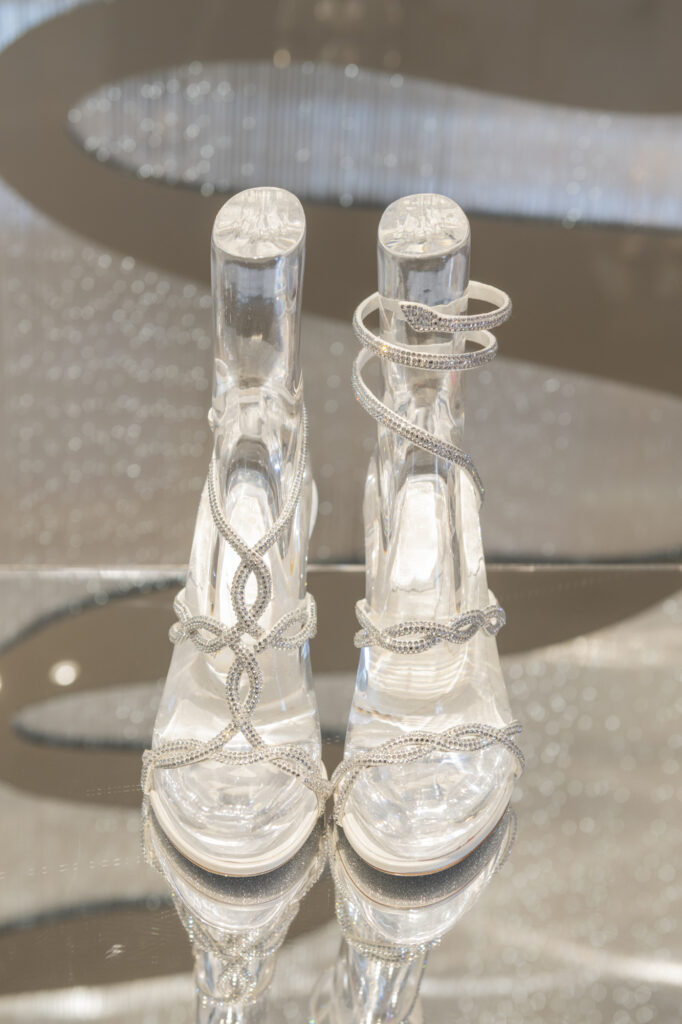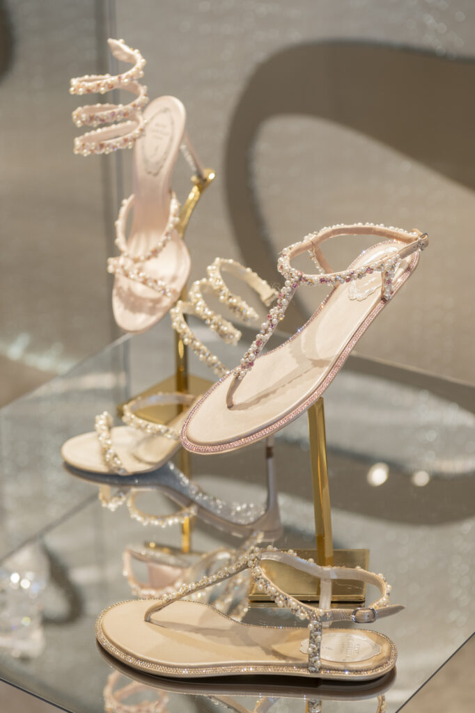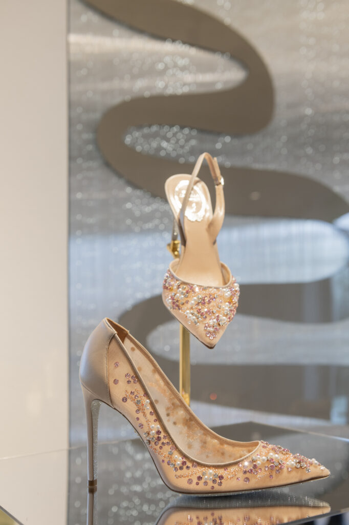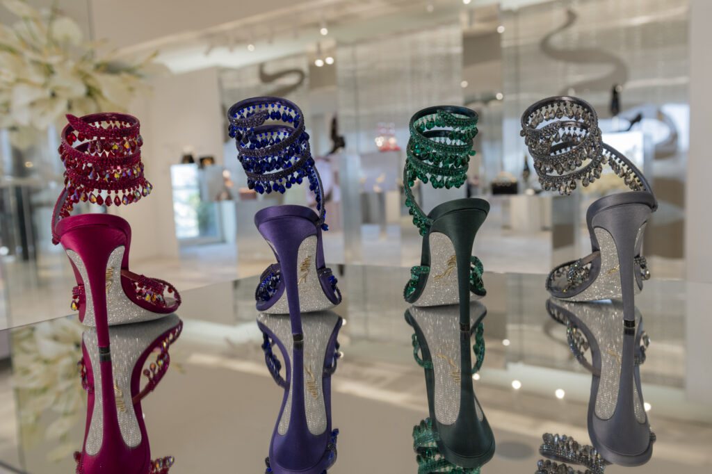 La broderie, évoquant l’ambiance feutrée des ateliers de couture, vient sublimer le modèle iconique Cleo, tout en enrichissant deux nouveaux modèles plats : la mule et le slingback. Ces pièces, ornées de cristaux incrustés, révèlent un motif qui évoque des rêves d’exotisme et transporte l’esprit vers des destinations lointaines et ensorcelantes. La sophistication se décline également à travers les modèles Full Crystal, où escarpins, Mary Janes, bottes, ballerines et talons stilettos scintillent sous une cascade de minuscules cristaux, apportant une touche d’éclat irrésistible.