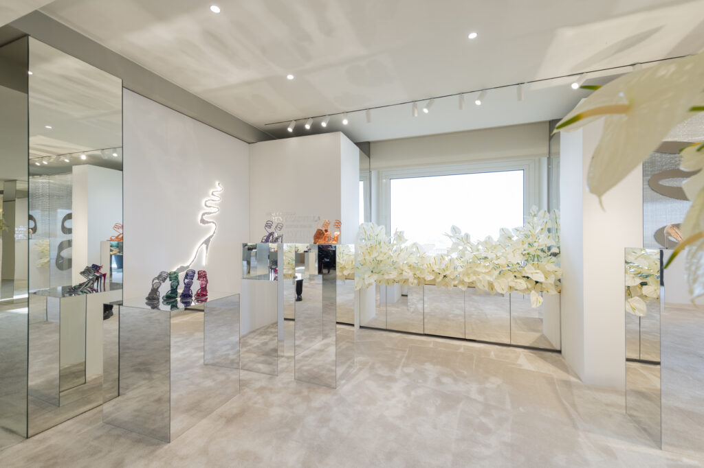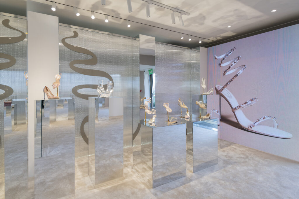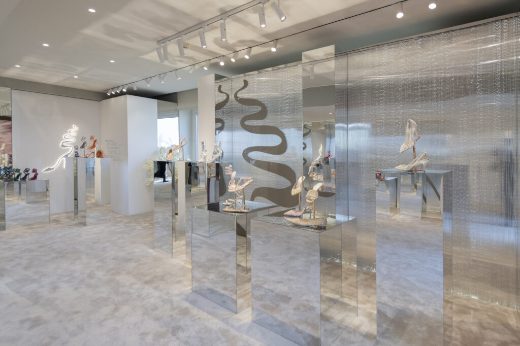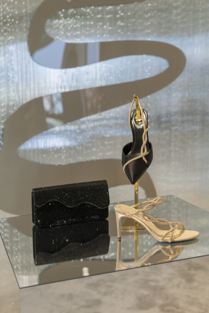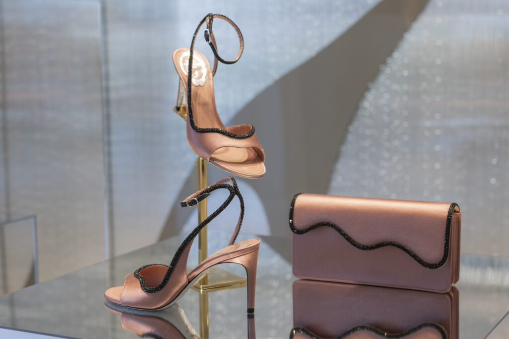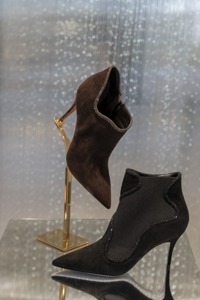Parmi les innovations phares de cette collection, le modèle Wave se démarque par son design fluide et sensuel : des escarpins et bottines à talons stilettos, en teintes douces et poudrées, dont la forme rappelle la progression sinueuse des vagues de la mer, soulignée par une rangée de cristaux noirs qui apporte une touche graphique et moderne.