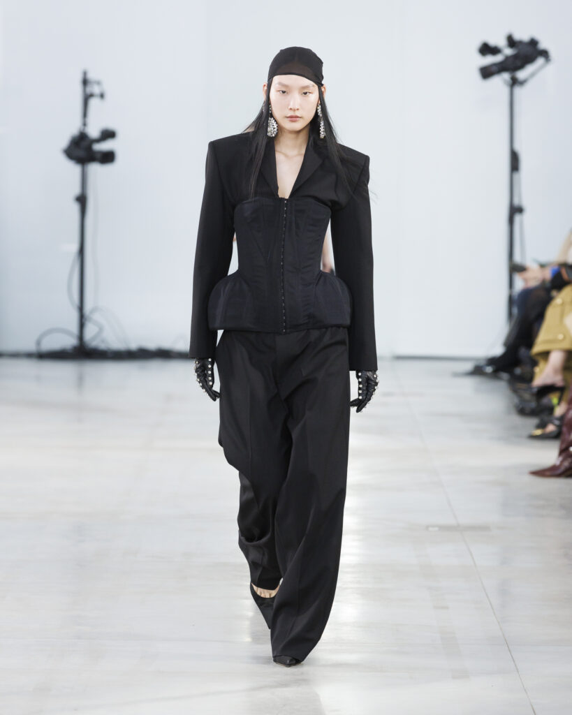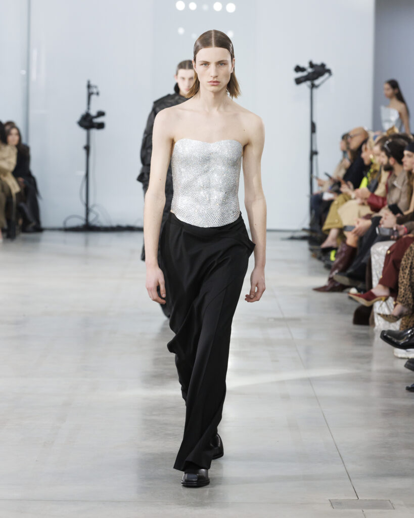 Le tailoring se fait sculptural, chaque pièce semblant taillée dans la matière avec une précision quasi architecturale. L’influence du XVIIᵉ et du XVIIIᵉ siècle est palpable : des crinolines revisitées se déclinent en mini-robes structurées, jouant avec les volumes et la sensualité du corps féminin. Les corsets, élément clé de la silhouette historique, sont ici déconstruits et réinterprétés, ornés de gouttes de cristal transparent qui capturent la lumière et l’ombre dans un même éclat.