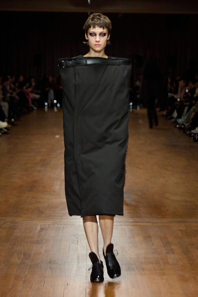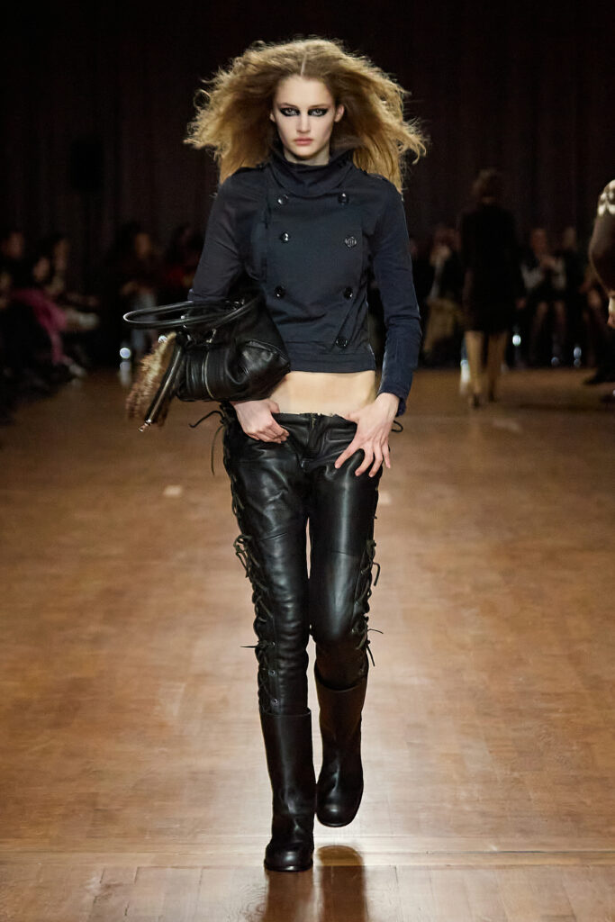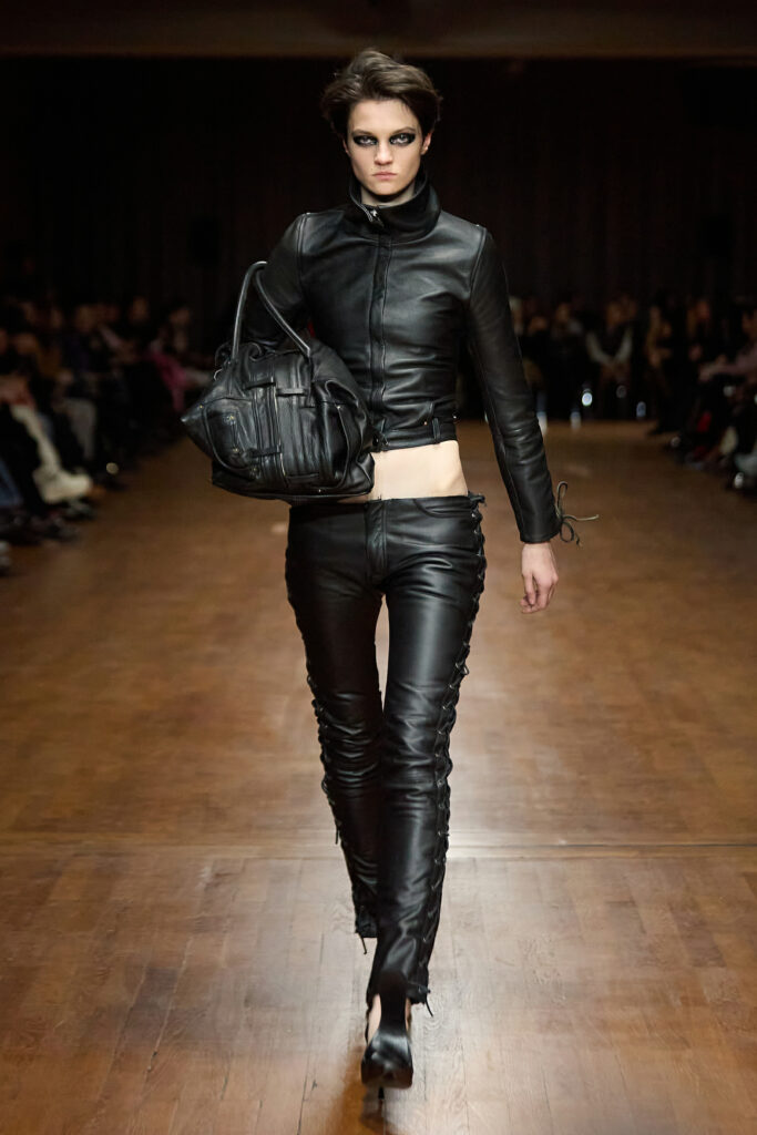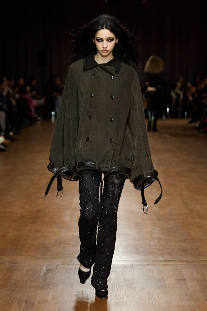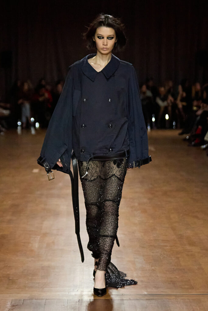 Dès les premiers instants, la collection impose son caractère affirmé : ensembles en cuir noir lacés, manteaux marins réinventés à partir de pantalons masculins et silhouettes enveloppantes confrontées aux vents orchestrés sur le podium. Des tissus semi-transparents révèlent des doublures de jeans, accentuant l’effet dramatique d’une collection qui célèbre la beauté dans l’imperfection et la déconstruction.
