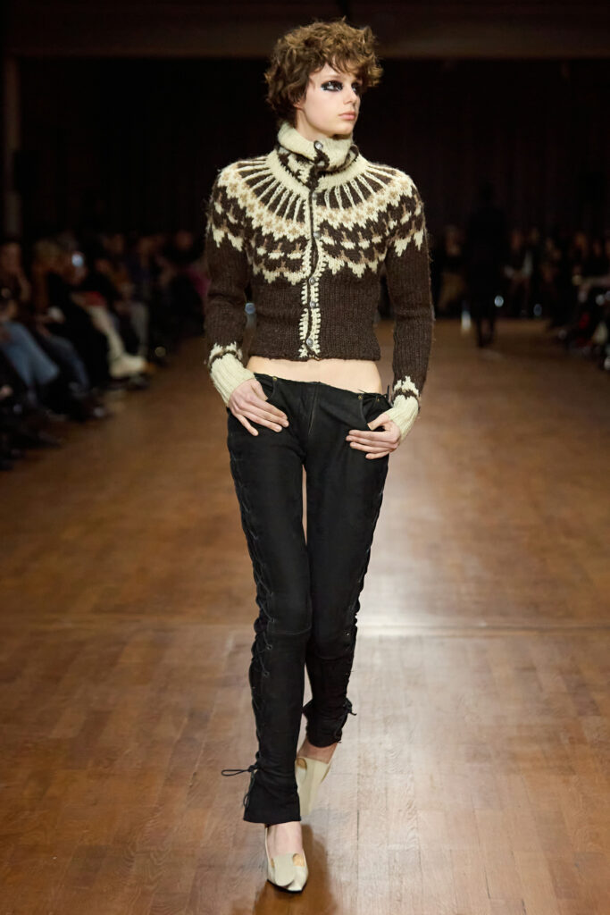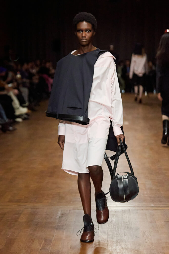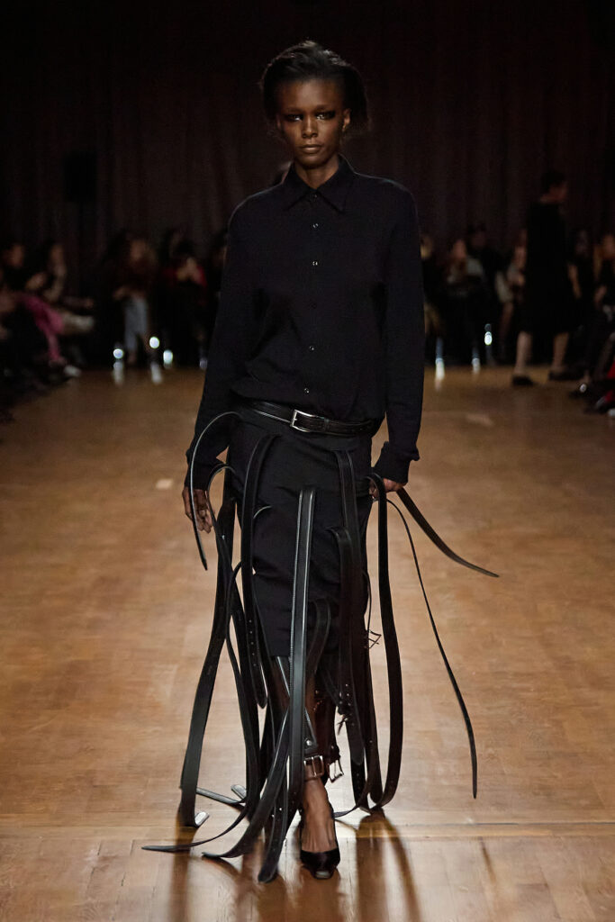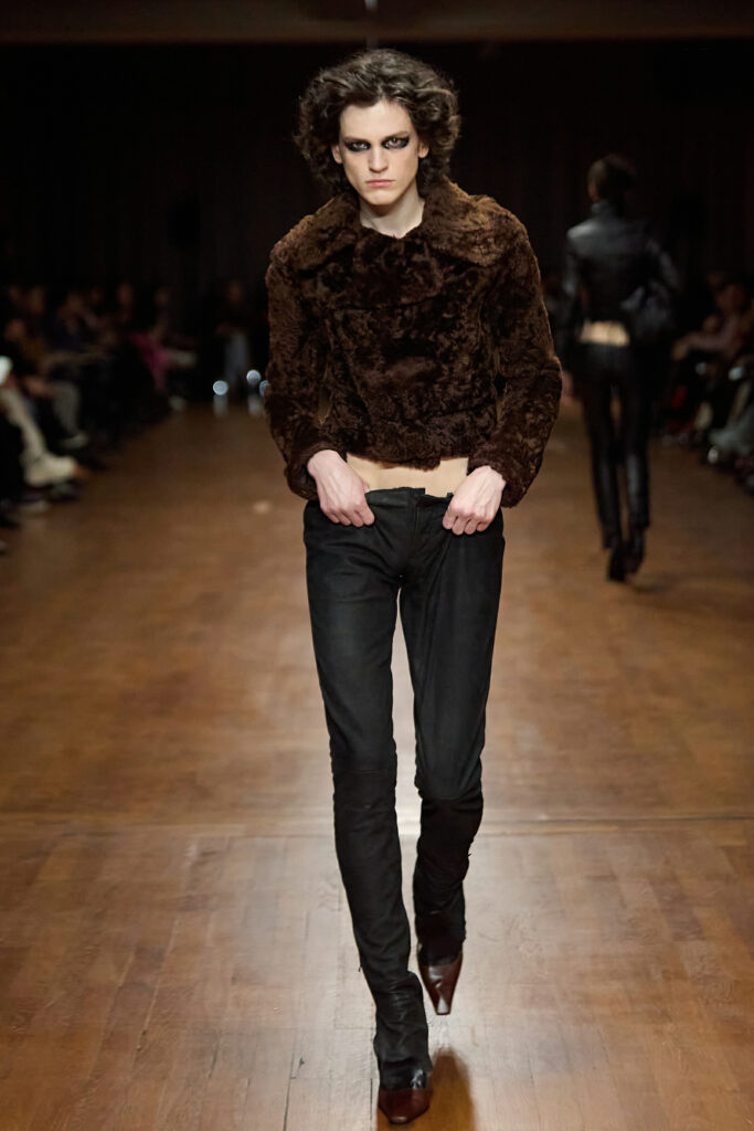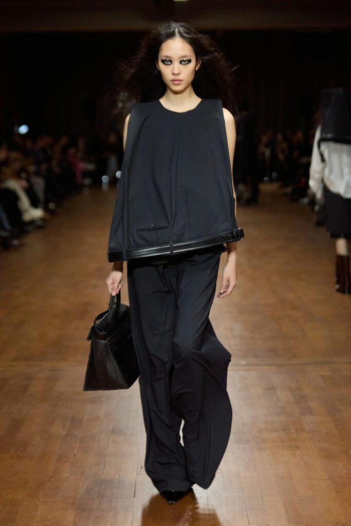 Dès les premiers instants, la collection impose son caractère affirmé : ensembles en cuir noir lacés, manteaux marins réinventés à partir de pantalons masculins et silhouettes enveloppantes confrontées aux vents orchestrés sur le podium. Des tissus semi-transparents révèlent des doublures de jeans, accentuant l’effet dramatique d’une collection qui célèbre la beauté dans l’imperfection et la déconstruction.