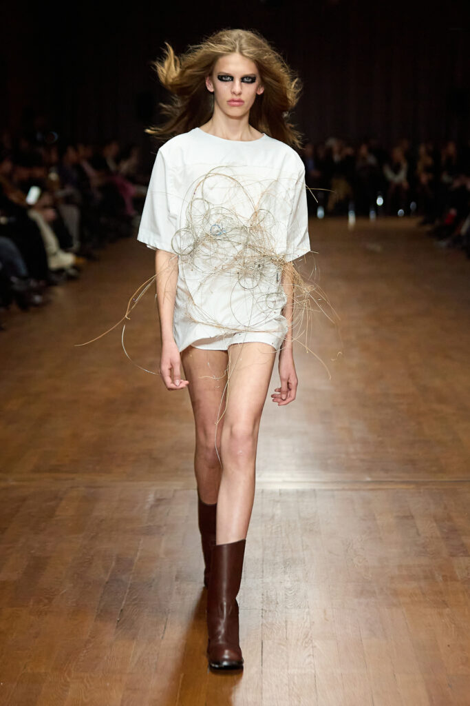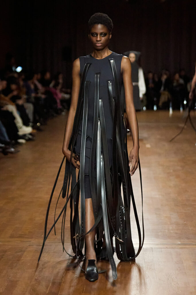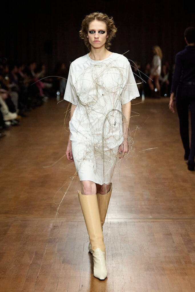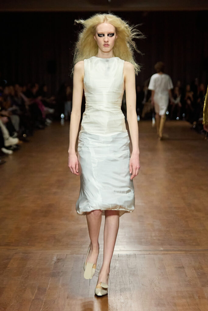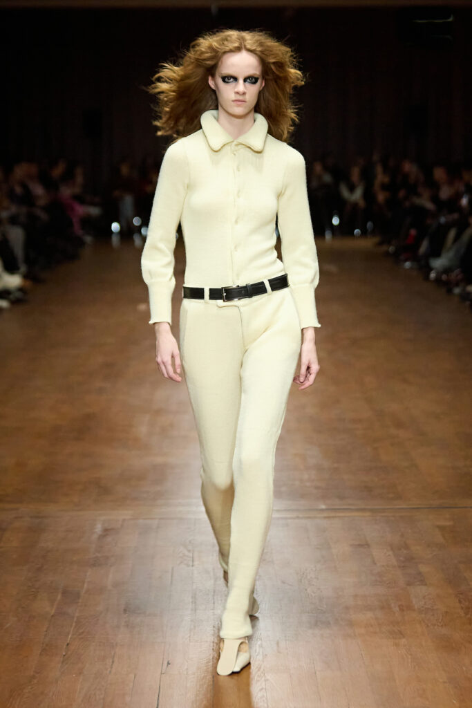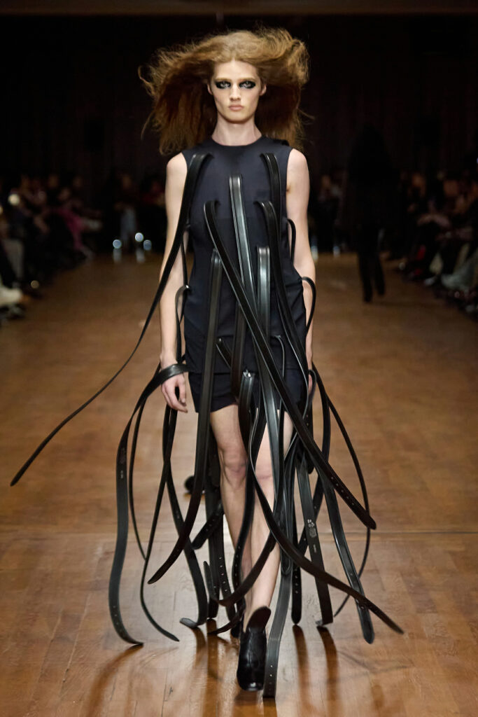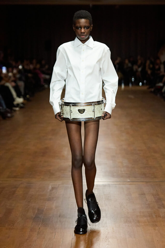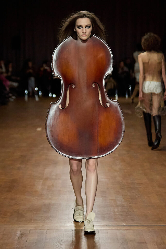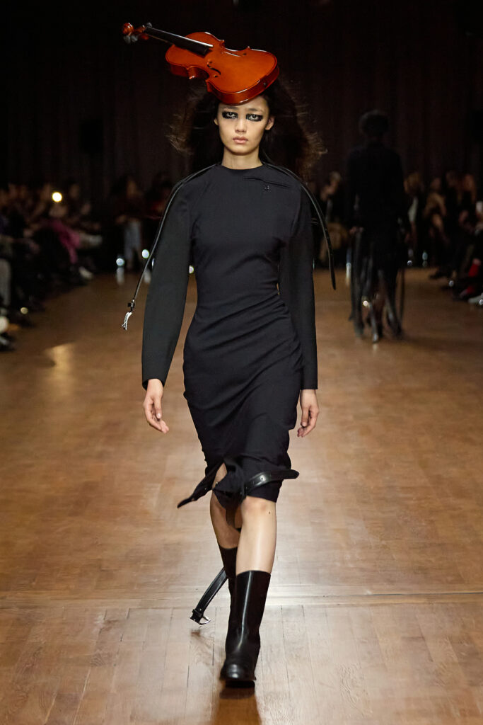 Le final magistral dévoile une robe sculpturale inspirée par un contrebasse, couronnant une collection où chaque pièce raconte une histoire, chaque vêtement devient une mélodie visuelle et tactile. Le maquillage signé Byredo, les coiffures amplifiées par Kevin Murphy et le stylisme irréprochable de Lotta Volkova complètent cet univers complexe et fascinant.