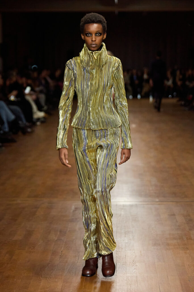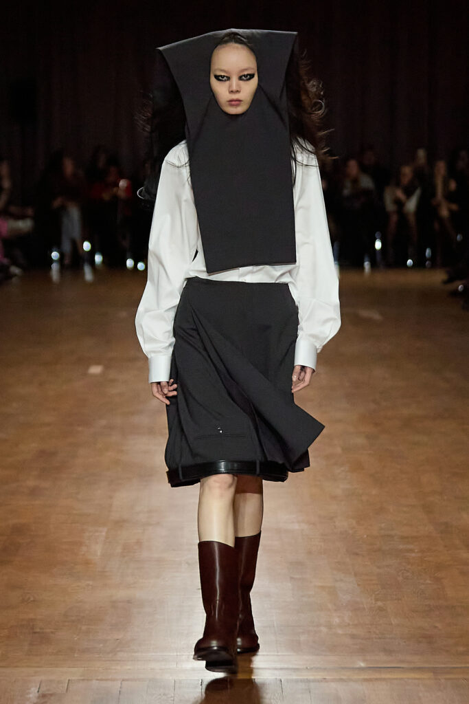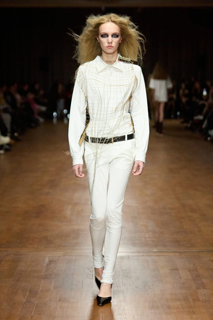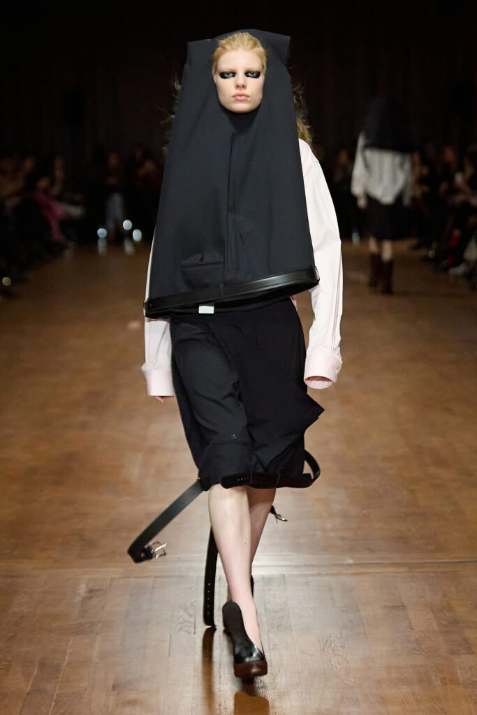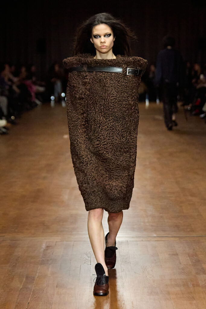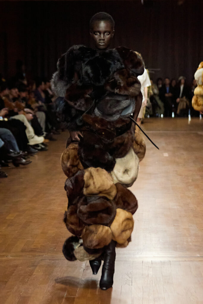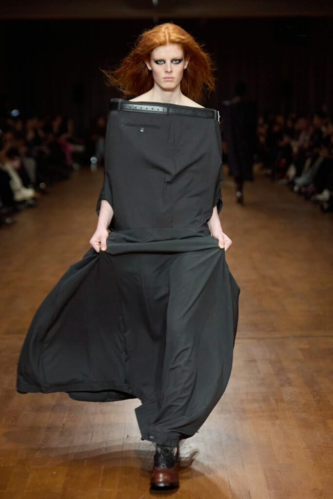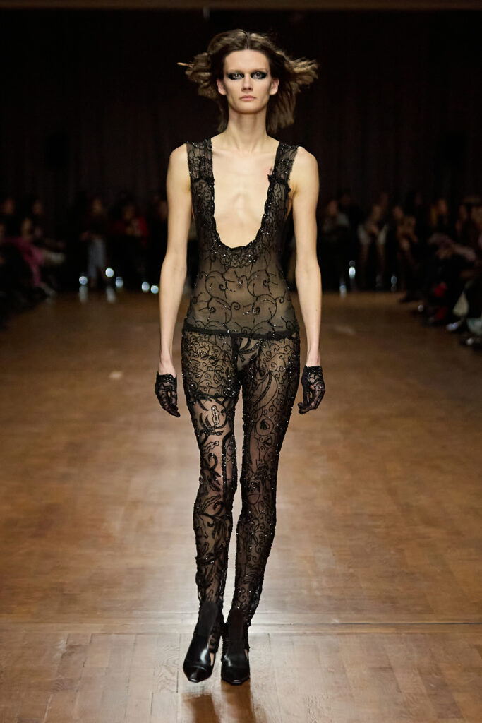 Le final magistral dévoile une robe sculpturale inspirée par un contrebasse, couronnant une collection où chaque pièce raconte une histoire, chaque vêtement devient une mélodie visuelle et tactile. Le maquillage signé Byredo, les coiffures amplifiées par Kevin Murphy et le stylisme irréprochable de Lotta Volkova complètent cet univers complexe et fascinant.