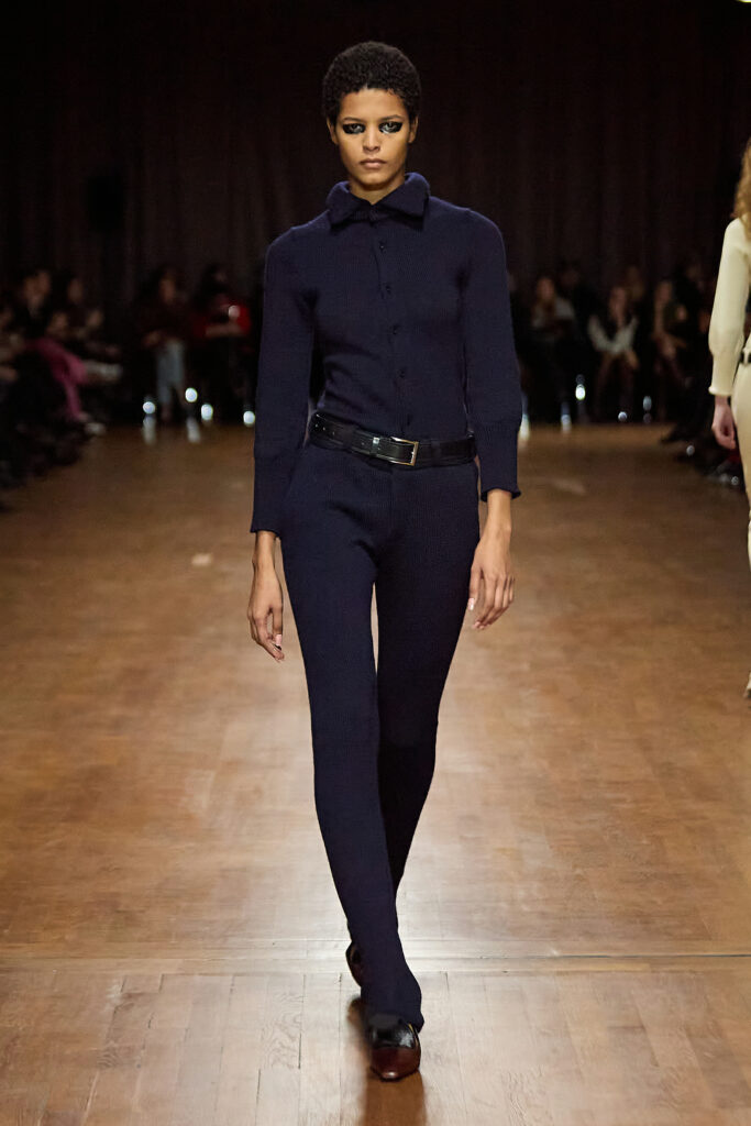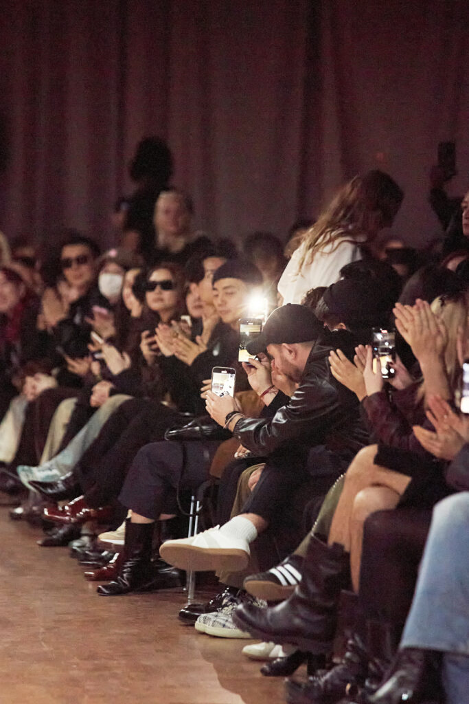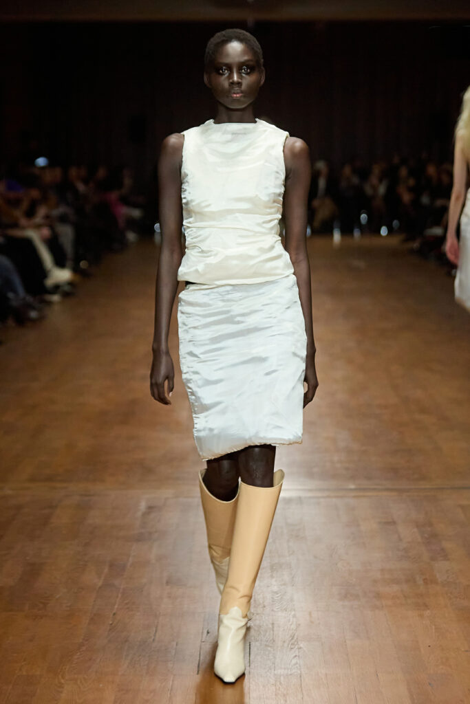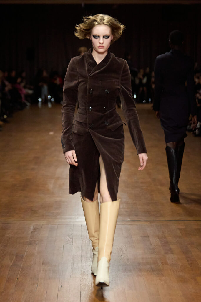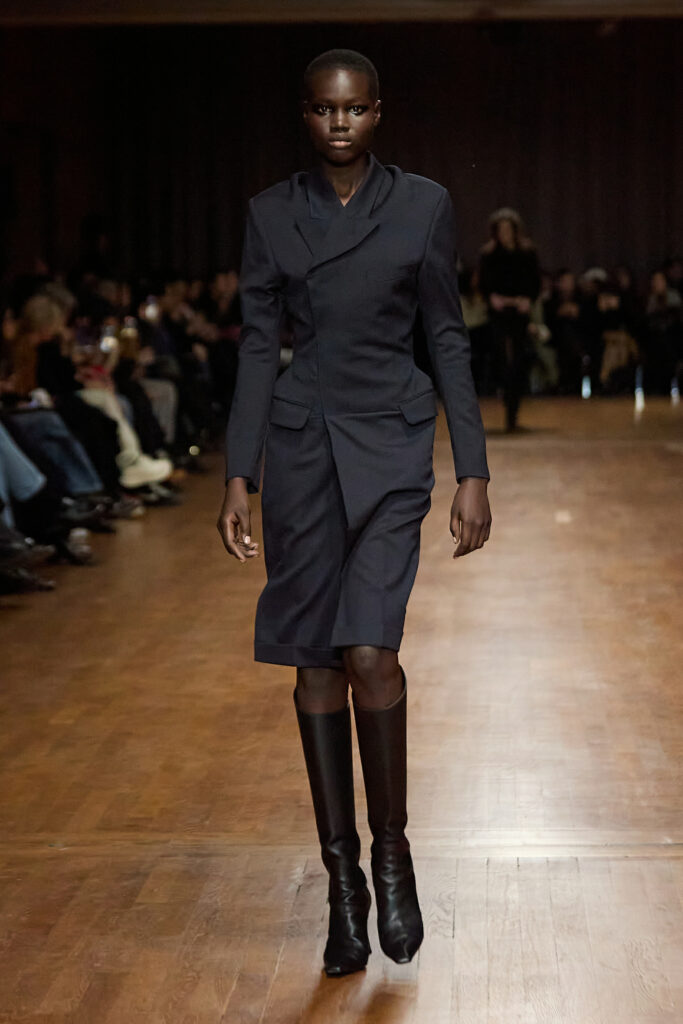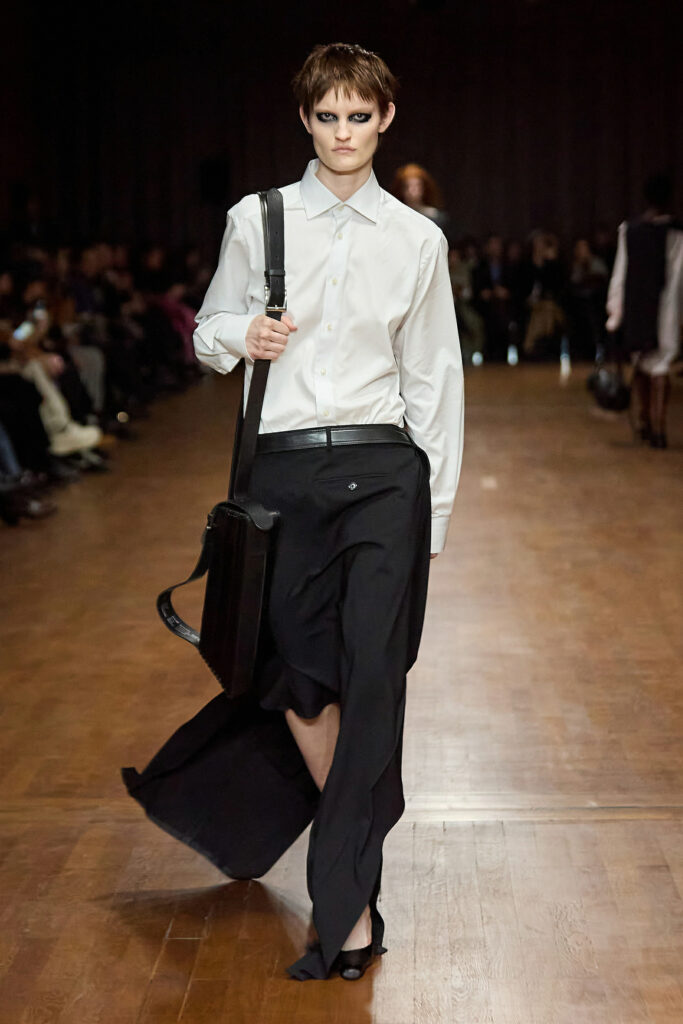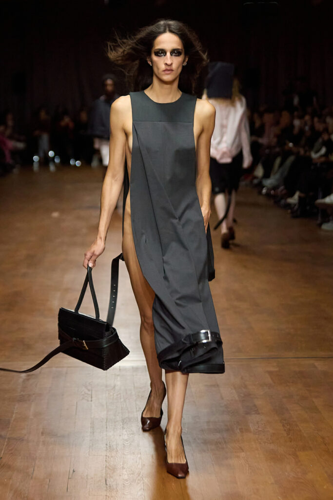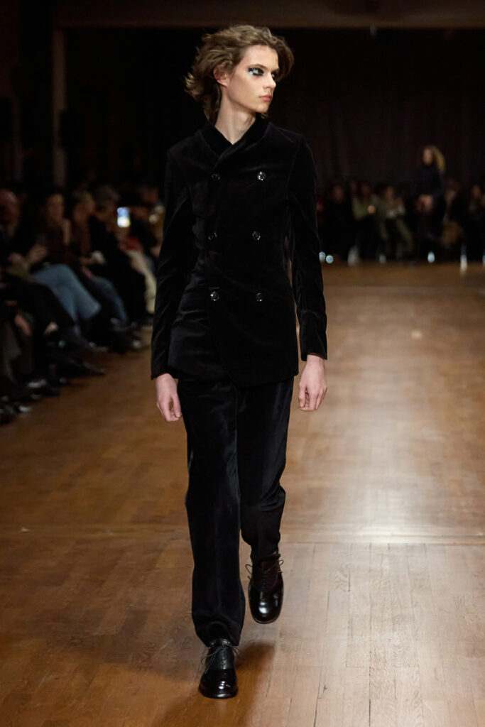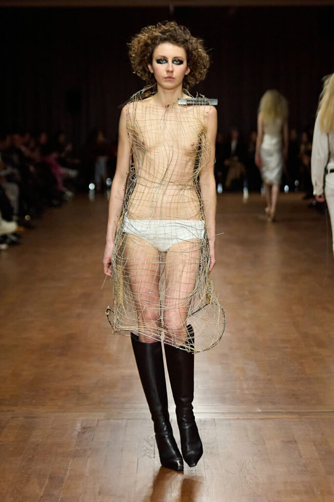 Le final magistral dévoile une robe sculpturale inspirée par un contrebasse, couronnant une collection où chaque pièce raconte une histoire, chaque vêtement devient une mélodie visuelle et tactile. Le maquillage signé Byredo, les coiffures amplifiées par Kevin Murphy et le stylisme irréprochable de Lotta Volkova complètent cet univers complexe et fascinant.